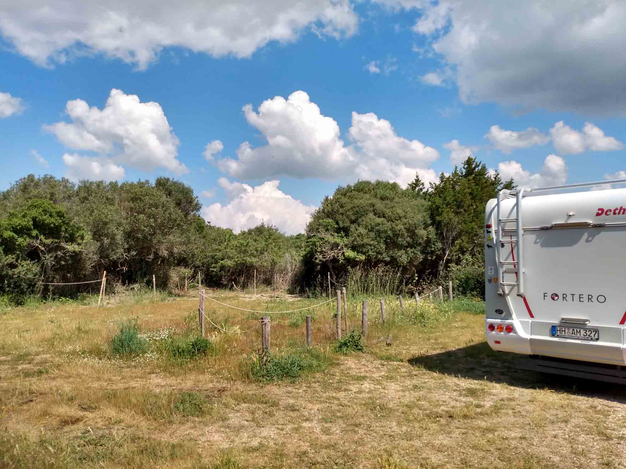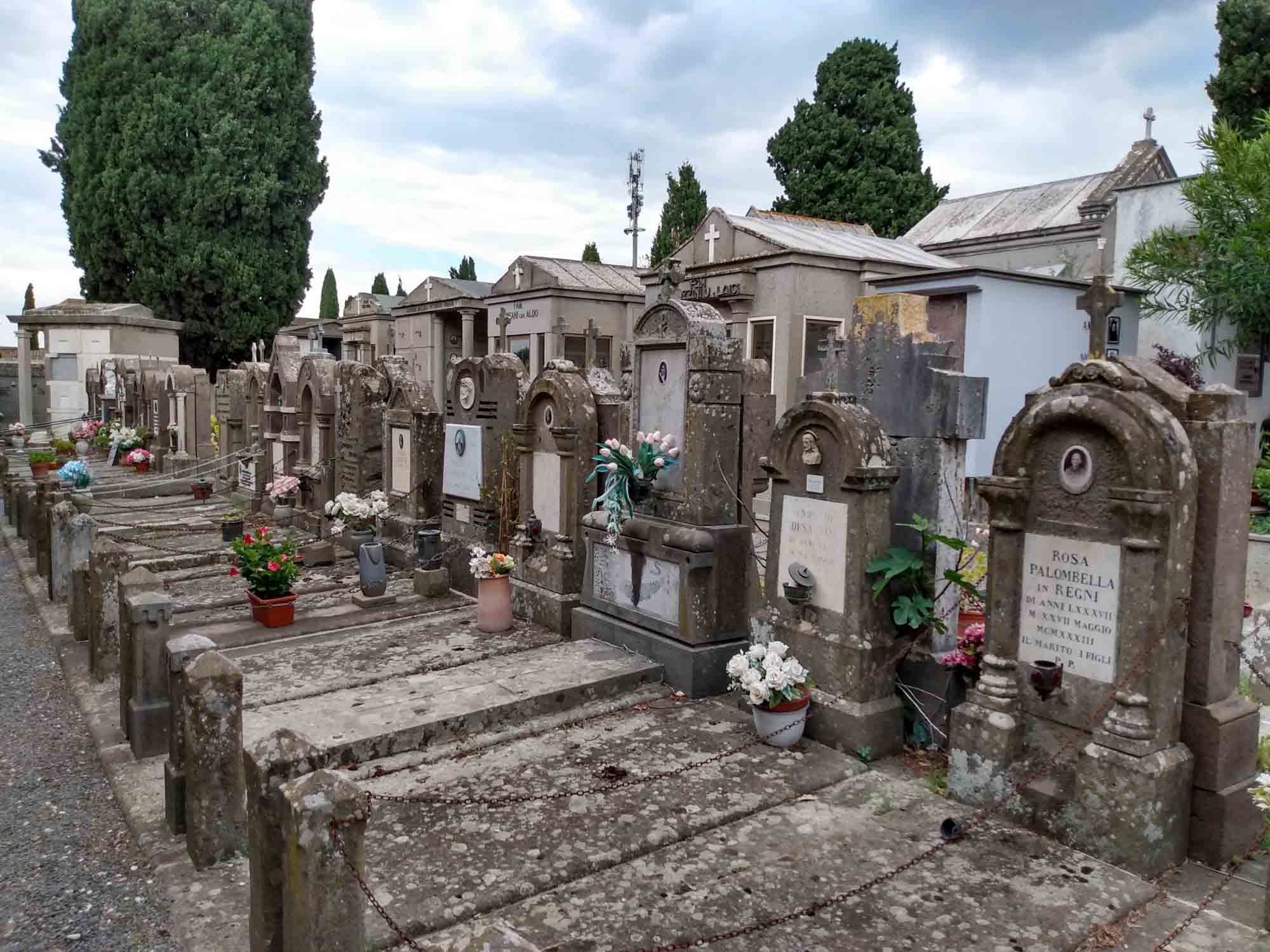 Beim Frühstück hörten wir, dass der Traktor, der den Eingang zu dem Parkplatz versperrt hatte, auf dem wir standen, angelassen wurde und sich dann näherte. Hinter dem laut tuckernden Trecker folgte ein Lieferwagen. Ohne ein Wort zu sagen oder unseren Gruß zu erwidern, spannten sie den Anhänger an, der vermutlich die Lücke in den Pfosten versperren sollte und taten dass, was wir befürchten: Sie sperrten uns ein. Nein, natürlich nicht. Sie tuckerten mit dem Anhänger genauso schnell wieder davon, wie sie gekommen waren. Vermutlich brauchten sie den Anhänger, um das in den letzten Tagen am Strand zusammengesammelte Treibgut abzufahren. Wir beeilten uns dennoch, den Platz zu verlassen, bekamen die Besitzer aber nicht mehr zu sehen. Die Lagune von Orbetello wollten wir uns dennoch ansehen und fuhren daher noch einmal gen Norden, über den Damm bei Orbetello auf die Halbinsel, die aus einem großen bewaldeten Berg besteht. Nachdem wir über den nördlichen Damm wieder zurück aufs Festland gefahren waren, hatten wir die Lagune von Orbetello umrundet. Besonders beeindruckt hat uns diese Lagune, die ein im WWF registriertes Naturschutzgebiet ist, eigentlich nicht. In Albinia kauften wir noch ein und fuhren dann eine knappe Stunde bis nach Tusciana. Diesen Ort hatte und eine polnische Camperin empfohlen, die wir auf unserem Platz am Strand getroffen hatten. Direkt am Friedhof gab es einen kostenlosen Wohnmobilstellplatz, wo wir das in den letzten Tagen verbrauchte Wasser ablassen und frisches aufnehmen konnten. Der Friedhof war sehr hübsch und hatte einige, mehre hundert Jahre alte Gräber. Danach gingen wir durch die Altstadt, die von einer mehr oder weniger gut erhaltenen Stadtmauer umgeben ist. Hier war so überhaupt nichts los. Aber es war schön ruhig. Danach gingen wir noch in das einzige Eiscaffee der Stadt und gönnten uns das beste Eis, dass sie hier zu bieten hatten. Es war gerade erst 16 Uhr, als wir wieder beim Wohnmobil waren und so entschlossen wir uns einen weiteren Stellplatz anzufahren, der laut Google gerade einmal 31 Minuten weg sein sollte. Ein Fehler, wie sich schon recht bald herausstellen sollte. Die Straßen, über die uns Google zu dem Stellplatz bei einem Angelsee lotste wurden immer kleiner. Auf einem inzwischen sehr engen Feldweg kam uns eine Herde Schafe entgegen, die sich nur noch zu Zweit an unserem Wagen vorbeidrängen konnten. Ein Stück weiter kamen wir dann nicht mehr weiter, weil der Weg so uneben wurde, dass wir aufgesetzt hätten. Also durften wir den Weg rückwärts wieder zurück. Wir versuchten unser Glück ein Stück weiter noch einmal, aber weder der Weg über den Bauernhof, den Google vorschlug, noch der Weg über einen Privatweg war machbar. Also fuhren wir in die andere Richtung und versuchten es dort noch einmal, nur um wieder an einer Stelle zu landen, wo es nicht mehr weiterging. Dort hatten wir jedoch das Glück, eine junge Frau zu treffen, die sofort sehr hilfsbereit und mit mehr italienisch als englisch erklärte, dass der Ort wo wir hinwollten zwar nicht weit weg sei, aber das wir auf diesen Wegen mit unserem Wagen dort nicht hinkommen würden. Wir müssten die Straßen über Vetralla nehmen. Anstelle von 1,3 km, die wir unserem Ziel bereits nahegekommen waren, waren es jetzt noch einmal 20 km. Aber immerhin wurden die Straßen zwar nicht besser, aber wieder breiter. Und so erreichten wir den Platz am Ende doch noch gegen 18 Uhr und standen dort vor einem verschlossenen Tor. Am Montag ist an diesem Angelplatz ein Ruhetag. Also durften wir uns noch einmal neu orientieren, die knapp 15 km wieder bis Vetralla zurückholpern und dann noch eine knappe Stunde weiterfahren, bis wir um kurz nach 19 Uhr am Lago di Bracciano auf einem Parkplatz zwischen See und Straße zumindest einen Platz für die Nacht gefunden haben.