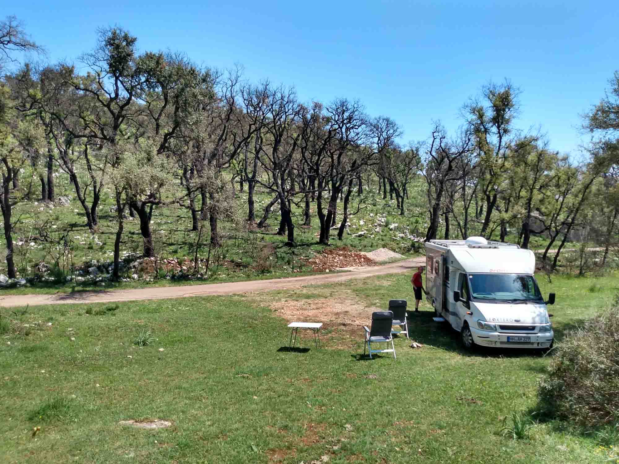 Der Platz war schön, aber letztlich kamen doch zu viele Besucher vorbei, als dass wir hier hätten Tisch und Stühle aufbauen wollen. Daher fuhren wir weiter und nach zwei Stunden standen wir vor einem sehr steilen und ziemlich engen Weg. 2 km danach sollte eine schöne Wiese sein, auf der wir stehen wollten. Wir gingen die Straße ein Stük zu Fuß nach oben bevor wir uns mit dem Wagen trauten. Rechts der Felsen und links ein Stück Mauer passten wir gerade so hindurch. Danach wurde es aber sofort wieder breiter und der Rest des Weges war dann auch völlig problemlos. Auf dem Platz waren wir leider nicht alleine. Ein französisches Pärchen war bereits seit gestern hier. Wir begrüßten uns kurz und suchten uns dann einen Platz etwas unterhalb, packten unseren Tisch und die Stühle aus und verbrachten den Nachmittag in der Sonne.