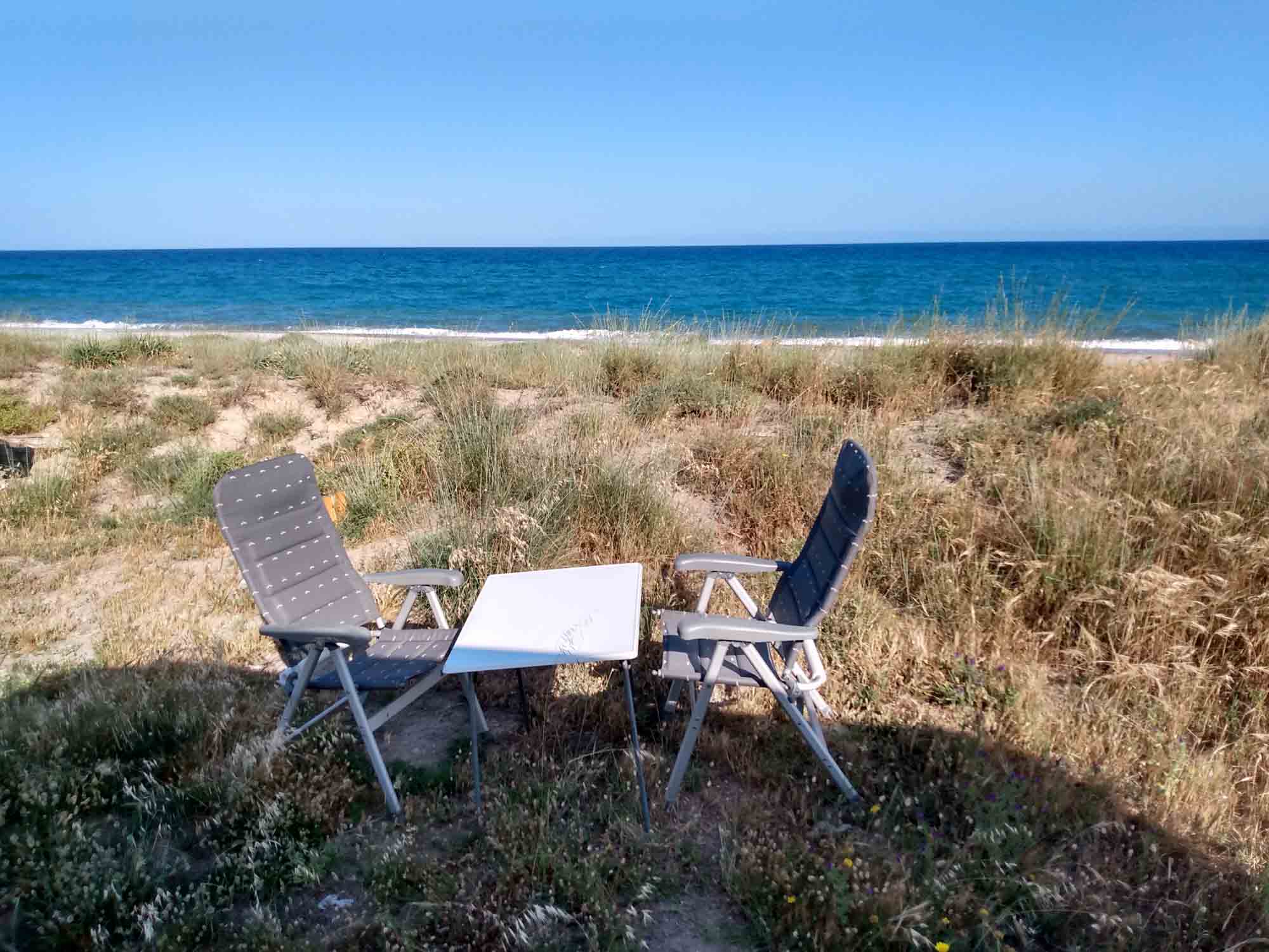 Ganze drei Tage blieben wir an diesem wunderschönen Strand. Wir standen direkt an der kleinen Düne und hatten auf unseren Stühlen freien Blick auf das Meer. Die Entsorgung war fußläufig, Abwaschwasser konnten wir direkt versickern lassen und Frischwasser war 20 m weit weg. Strom hatten wir dank Solaranlage ebenfalls mehr als genug. So könnten wir es hier beinahe unendlich lange aushalten. Zumindest solange, wie die Lebensmittel hielten, bzw. dem Kühlschrank das Gas ausgehen würde. Also ca. 4 - 5 Wochen. Wir genossen die Zeit, Berta brauchte nicht ein einziges Mal an die Leine und blieb sowieso den ganzen Tag im Schatten beim Wagen. Zum Herumlaufen war es ihr viel zu heiß. Nach den Spaziergängen trank sie kurz ein wenig Wasser und legte sich dann gleich wieder hin. Die anderen Wohnmobile störten überhaupt nicht. Im Gegenteil: Unsere Nachbarn aus Pfaffenhofen waren sehr nett und brachten uns sogar eine Wassermelone vom Supermarkt mit. Und auch mit einem netten Mann aus Bayern, der einen sehr schönen Setter hatte, unterhielten wir uns einige Male. So vergingen die drei Tage am Strand völlig unbeschwert.