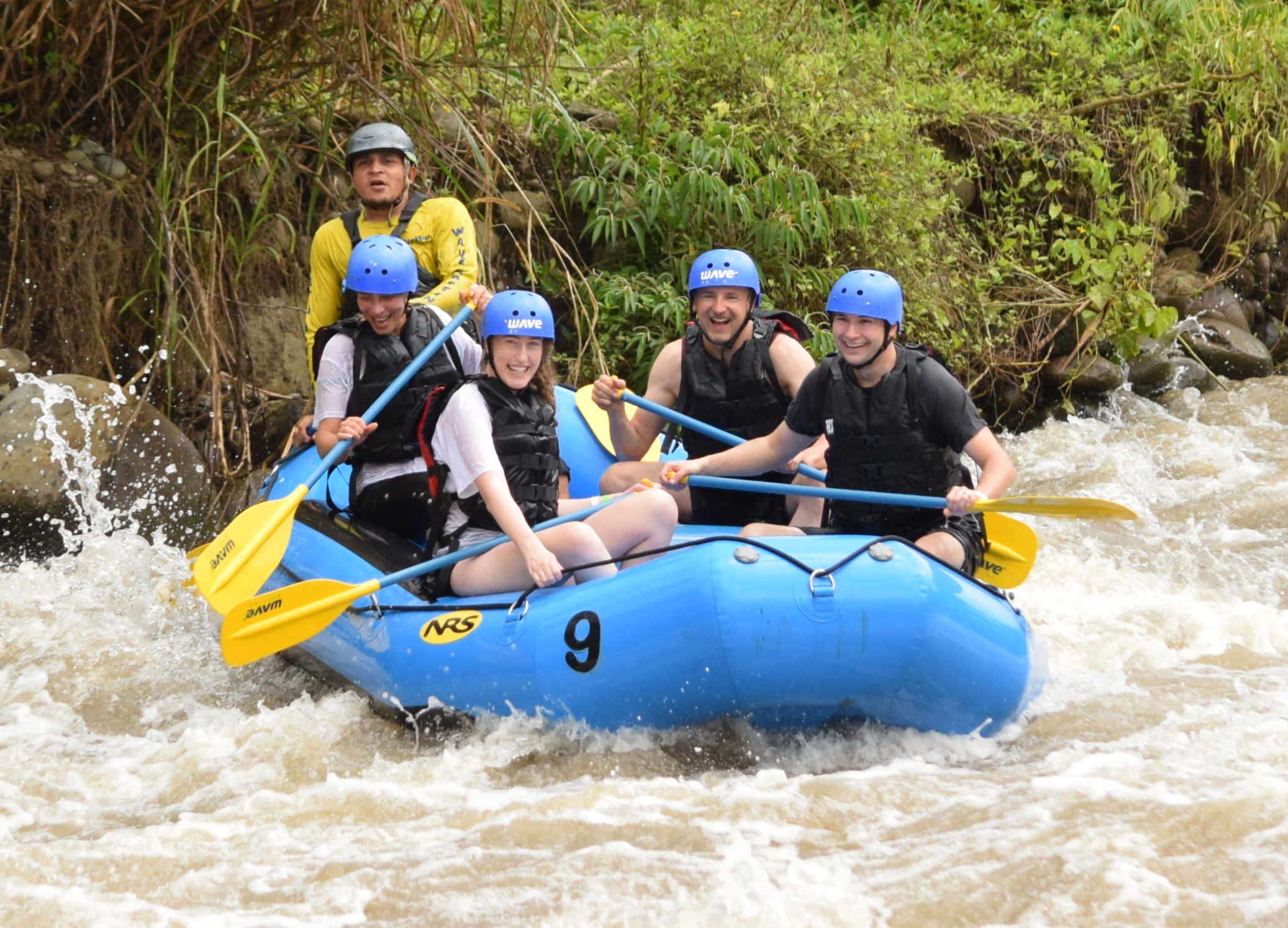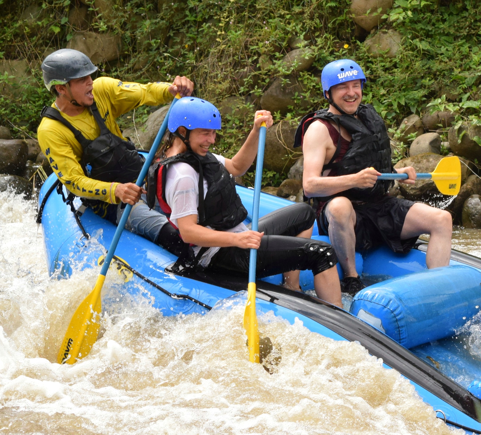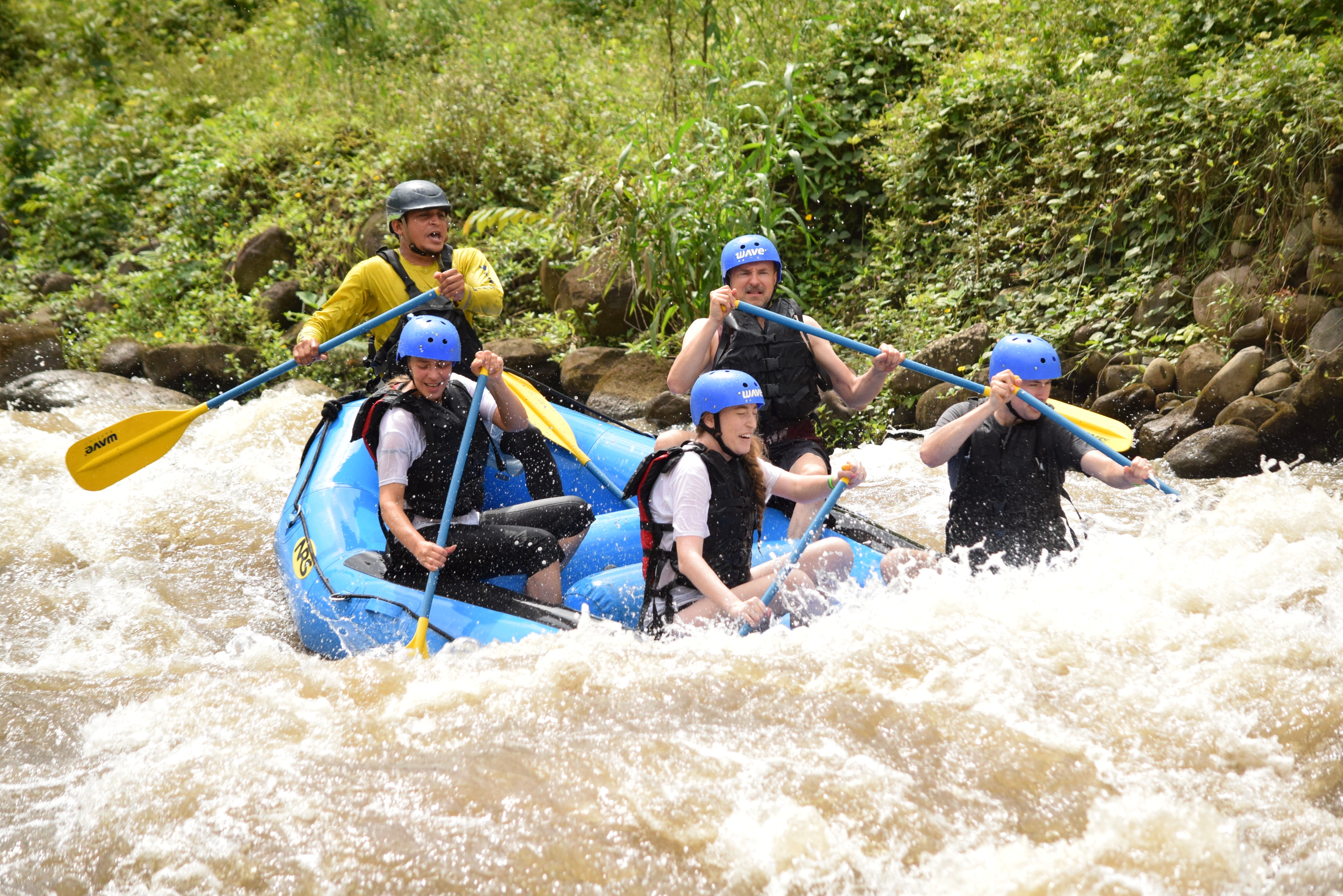 Nach dem Frühstück, wir hatten uns gestern Teilchen gekauft, fuhren wir um viertel nach zehn nach La Fortuna zu dem Anbieter unserer Rafting-Tour. Die Zeit bis zur Abfahrt des Busses, der uns zum Fluss bringen würde, überbrückten wir mit dem angebotenen costaricanischen Café. Dann ging es los. Einer der Guides, es waren insgesamt drei, für jedes Boot einer, machte während der Fahrt die Einweisung und erzählte etwas über die angebauten Pflanzen, an denen wir vorbeikamen: Yucca, Ananas und Plantain, eine spezielle Bananenart. Am Einstiegsplatz angekommen, stiegen wir aus, wurden mit Rettungsweste, Helm und Paddel ausgerüstet. Am Fluss mussten wir einen Moment warten. Dann kamen auch schon die Guides mit den Schlauchbooten. Unser Guide hieß Mario. Außer uns war nur ein amerikanisches Pärchen im Boot. Die anderen waren zu fünft bzw. mit sechs Gästen an Bord. Nachdem Mario uns ein paar Kommandos beigebracht und eingeübt hat, ging es los. Der Fluss hatte Stromschnellen der Klassen 2 und 3. Los ging es gleich mit 3 und nach der zweiten Welle waren wir bereits völlig durchnässt. Aber es war warm, die Sonne schien und nach ein paar Minuten hatten wir uns an das Wasser gewöhnt. Mario gab seine Kommandos. „One, two“, zählte er. Wir paddelten im Takt und kamen recht gut durch die Stromschnellen. Auf „Down“ duckten wir uns und schon brach eine Welle über uns hinweg. Dann durften wir wieder paddeln. Es hat unglaublich viel Spaß gemacht, so wild durchgeschaukelt zu werden. Nach knapp einer Stunde wurde es geruhsamer und wir hatten Zeit, uns die Umgebung des Flusses anzusehen, während wir hinuntertrieben. Wir sahen verschiedene Vögel, z.B. Tucane und Kormorane aber auch einige große Leguane. Da Paarungszeit war, leuchteten die Männchen in einem kräftigen rot, wodurch sie in den Bäumen noch einfacher zu finden waren. Mario erzählte uns noch, dass die wilden Bananen, die hier wuchsen, nicht genießbar sind. Sie haben giftige schwarze Kerne im Fruchtfleisch. An einer seichten Stelle legten wir mit den Booten an und es gab frisch aufgeschnittene Ananas und Wassermelone. Die Kühe, die uns dort besuchten war ganz zahm und liebten vor allem die Viertel der Ananasschale, die sie im Ganzen verschlungen. Danach ging es noch ein paar Minuten weiter bis zum Ausstiegsplatz. Wir hatten Glück. Kaum waren wir ausgestiegen und hatten Weste, Helm und Paddel abgegeben, fing es kräftig an zu regnen. Wir zogen uns um und dann fuhren wir mit dem Bus zu einem kleinen Restaurant, wo es Cascado zu essen und einen selbstgerösteten Café zu trinken gab. Nach einer kleinen Vorführung, wie Zuckerrohr gepresst wird und natürlich den entsprechenden Verkostung von Zuckerrohrsaft und dem daraus hergestellten Rum, wurden wir mit dem Bus wieder nach La Fortuna gebracht. Vor dem Geschäft unterhielten wir uns dann noch eine Weile mit zwei deutschen Frauen, die auch auf der Tour waren. Sie gaben uns für unsere weitere Reise in Costa Rica noch ein paar tolle Tipps, was wir vielleicht noch machen könnten. Dann fuhren wir nach Tabacon, wo es einen Fluss mit heißen Quellen gibt, die frei zugänglich sind. Lediglich die überall gegenwärtigen selbsternannten Parkplatzwächter wollen ein kleines Trinkgeld haben. Wir fanden den Zugang sofort, wanderten durch den Fluss, der unter der Straße hindurchfließt nach oben und legten uns in eines der natürlichen Becken in das warme Wasser. Dort blieben wir bis nach Sonnenuntergang und entspannten uns bei dem wunderbaren Geräusch des fließenden Baches im warmen Wasser. Danach fuhren wir wieder nach Hause, duschten ausgiebig und ruhten uns ein wenig aus. Mit einem leckeren Abendessen in La Fortuna bei einem Chinesen ließen wir diesen perfekten Tag ausklingen.