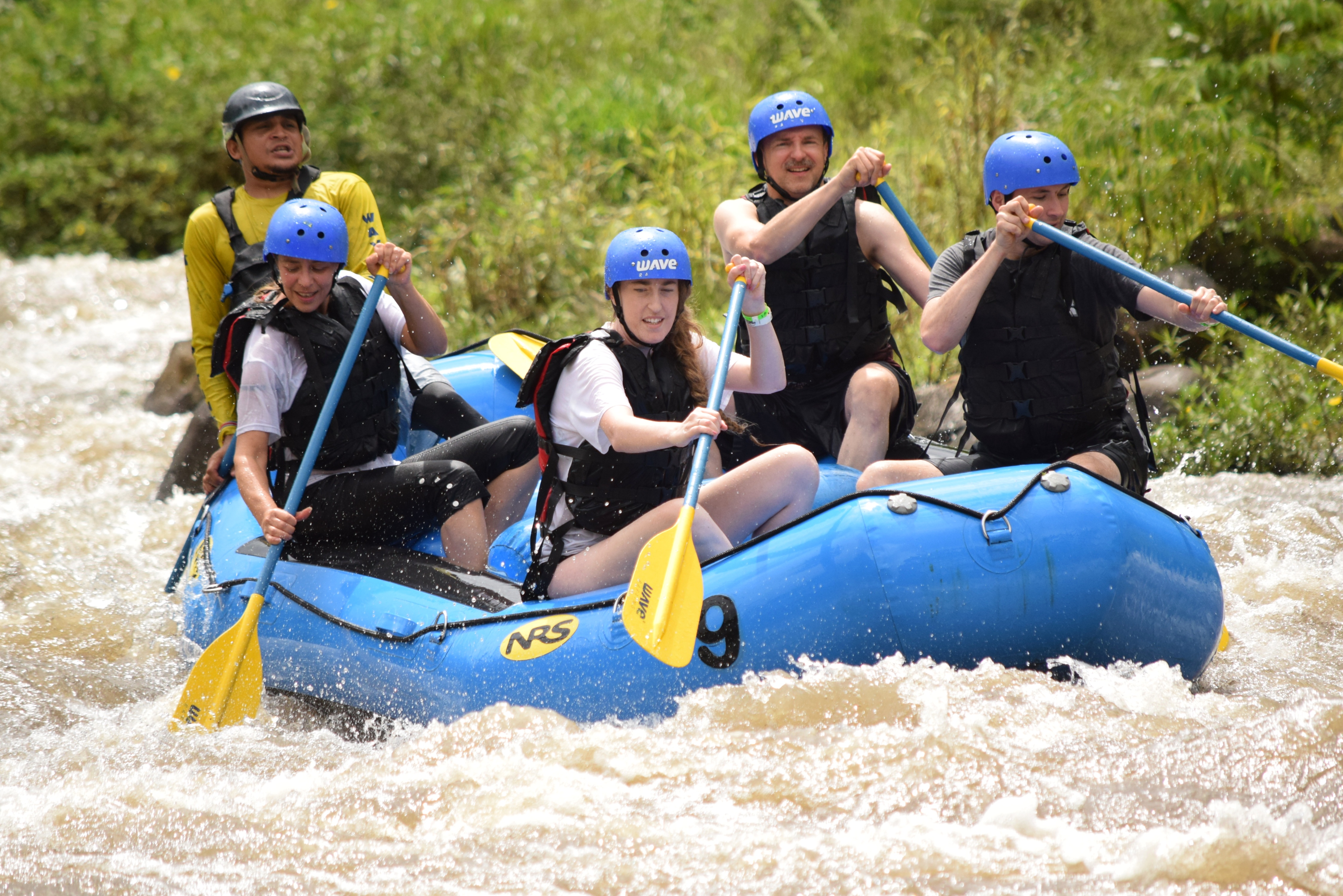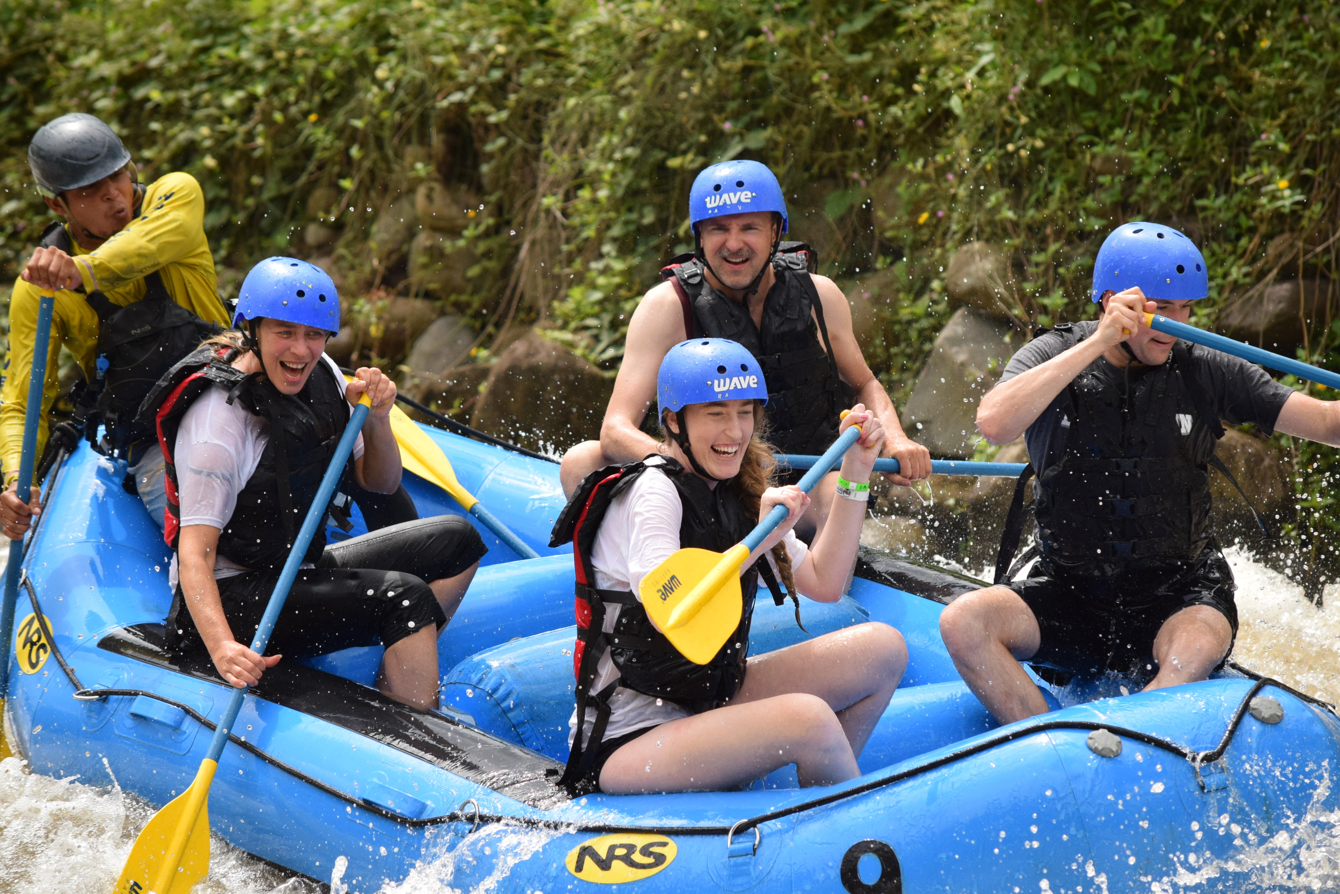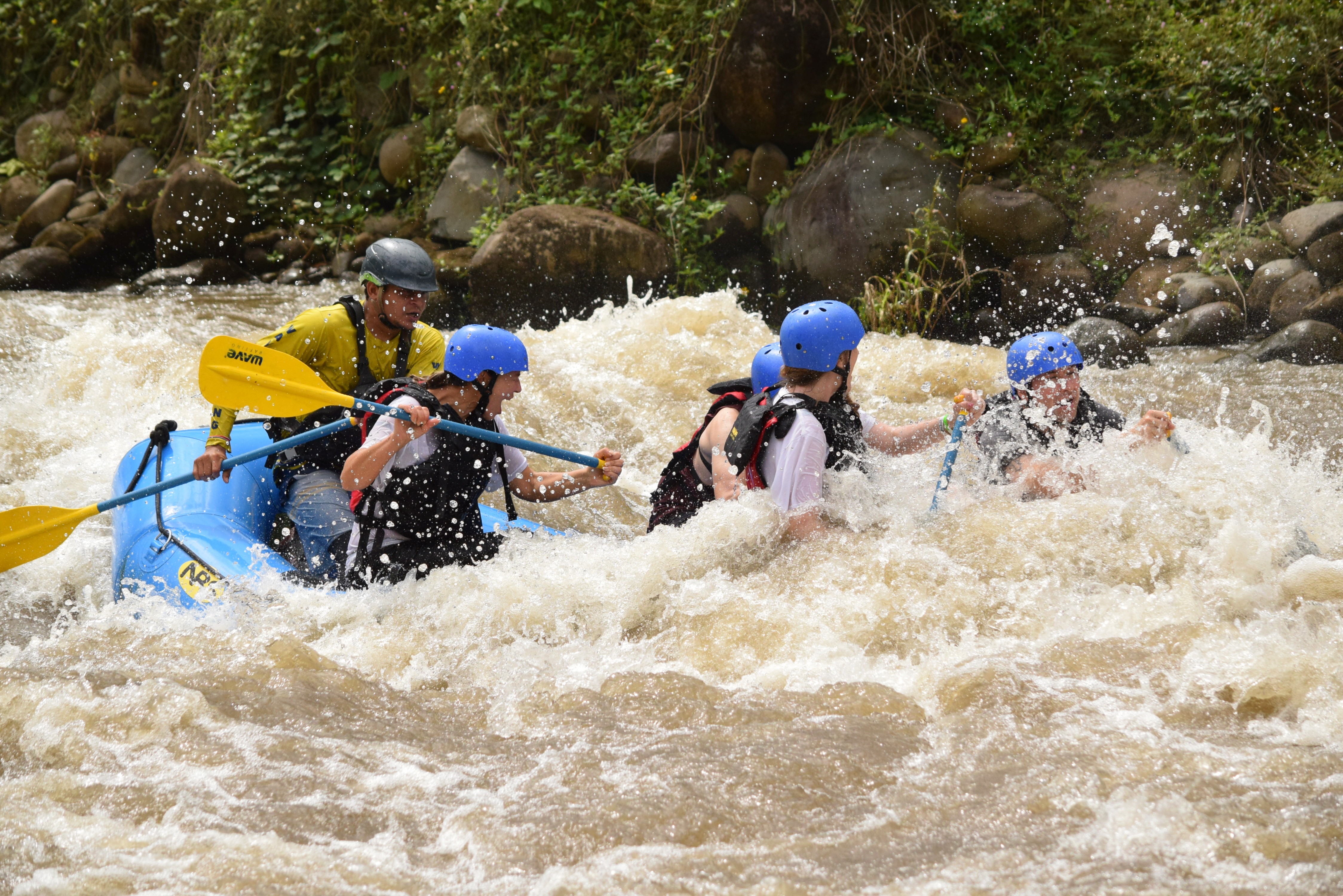 Nach dem Frühstück, wir hatten uns gestern Teilchen gekauft, fuhren wir um viertel nach zehn nach La Fortuna zu dem Anbieter unserer Rafting-Tour. Die Zeit bis zur Abfahrt des Busses, der uns zum Fluss bringen würde, überbrückten wir mit dem angebotenen costaricanischen Café. Dann ging es los. Einer der Guides, es waren insgesamt drei, für jedes Boot einer, machte während der Fahrt die Einweisung und erzählte etwas über die angebauten Pflanzen, an denen wir vorbeikamen: Yucca, Ananas und Plantain, eine spezielle Bananenart. Am Einstiegsplatz angekommen, stiegen wir aus, wurden mit Rettungsweste, Helm und Paddel ausgerüstet. Am Fluss mussten wir einen Moment warten. Dann kamen auch schon die Guides mit den Schlauchbooten. Unser Guide hieß Mario. Außer uns war nur ein amerikanisches Pärchen im Boot. Die anderen waren zu fünft bzw. mit sechs Gästen an Bord. Nachdem Mario uns ein paar Kommandos beigebracht und eingeübt hat, ging es los. Der Fluss hatte Stromschnellen der Klassen 2 und 3. Los ging es gleich mit 3 und nach der zweiten Welle waren wir bereits völlig durchnässt. Aber es war warm, die Sonne schien und nach ein paar Minuten hatten wir uns an das Wasser gewöhnt. Mario gab seine Kommandos. „One, two“, zählte er. Wir paddelten im Takt und kamen recht gut durch die Stromschnellen. Auf „Down“ duckten wir uns und schon brach eine Welle über uns hinweg. Dann durften wir wieder paddeln. Es hat unglaublich viel Spaß gemacht, so wild durchgeschaukelt zu werden. Nach knapp einer Stunde wurde es geruhsamer und wir hatten Zeit, uns die Umgebung des Flusses anzusehen, während wir hinuntertrieben. Wir sahen verschiedene Vögel, z.B. Tucane und Kormorane aber auch einige große Leguane. Da Paarungszeit war, leuchteten die Männchen in einem kräftigen rot, wodurch sie in den Bäumen noch einfacher zu finden waren. Mario erzählte uns noch, dass die wilden Bananen, die hier wuchsen, nicht genießbar sind. Sie haben giftige schwarze Kerne im Fruchtfleisch. An einer seichten Stelle legten wir mit den Booten an und es gab frisch aufgeschnittene Ananas und Wassermelone. Die Kühe, die uns dort besuchten war ganz zahm und liebten vor allem die Viertel der Ananasschale, die sie im Ganzen verschlungen. Danach ging es noch ein paar Minuten weiter bis zum Ausstiegsplatz. Wir hatten Glück. Kaum waren wir ausgestiegen und hatten Weste, Helm und Paddel abgegeben, fing es kräftig an zu regnen. Wir zogen uns um und dann fuhren wir mit dem Bus zu einem kleinen Restaurant, wo es Cascado zu essen und einen selbstgerösteten Café zu trinken gab. Nach einer kleinen Vorführung, wie Zuckerrohr gepresst wird und natürlich den entsprechenden Verkostung von Zuckerrohrsaft und dem daraus hergestellten Rum, wurden wir mit dem Bus wieder nach La Fortuna gebracht. Vor dem Geschäft unterhielten wir uns dann noch eine Weile mit zwei deutschen Frauen, die auch auf der Tour waren. Sie gaben uns für unsere weitere Reise in Costa Rica noch ein paar tolle Tipps, was wir vielleicht noch machen könnten. Dann fuhren wir nach Tabacon, wo es einen Fluss mit heißen Quellen gibt, die frei zugänglich sind. Lediglich die überall gegenwärtigen selbsternannten Parkplatzwächter wollen ein kleines Trinkgeld haben. Wir fanden den Zugang sofort, wanderten durch den Fluss, der unter der Straße hindurchfließt nach oben und legten uns in eines der natürlichen Becken in das warme Wasser. Dort blieben wir bis nach Sonnenuntergang und entspannten uns bei dem wunderbaren Geräusch des fließenden Baches im warmen Wasser. Danach fuhren wir wieder nach Hause, duschten ausgiebig und ruhten uns ein wenig aus. Mit einem leckeren Abendessen in La Fortuna bei einem Chinesen ließen wir diesen perfekten Tag ausklingen.