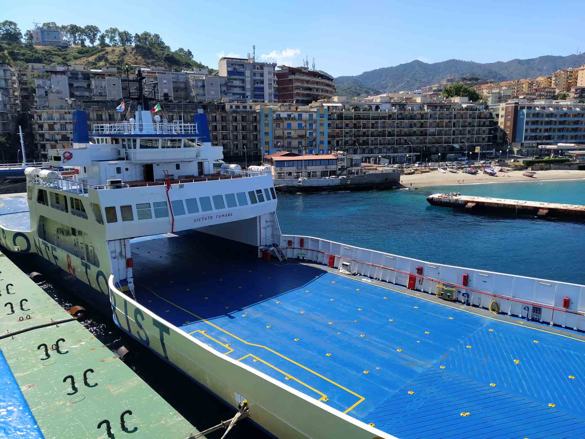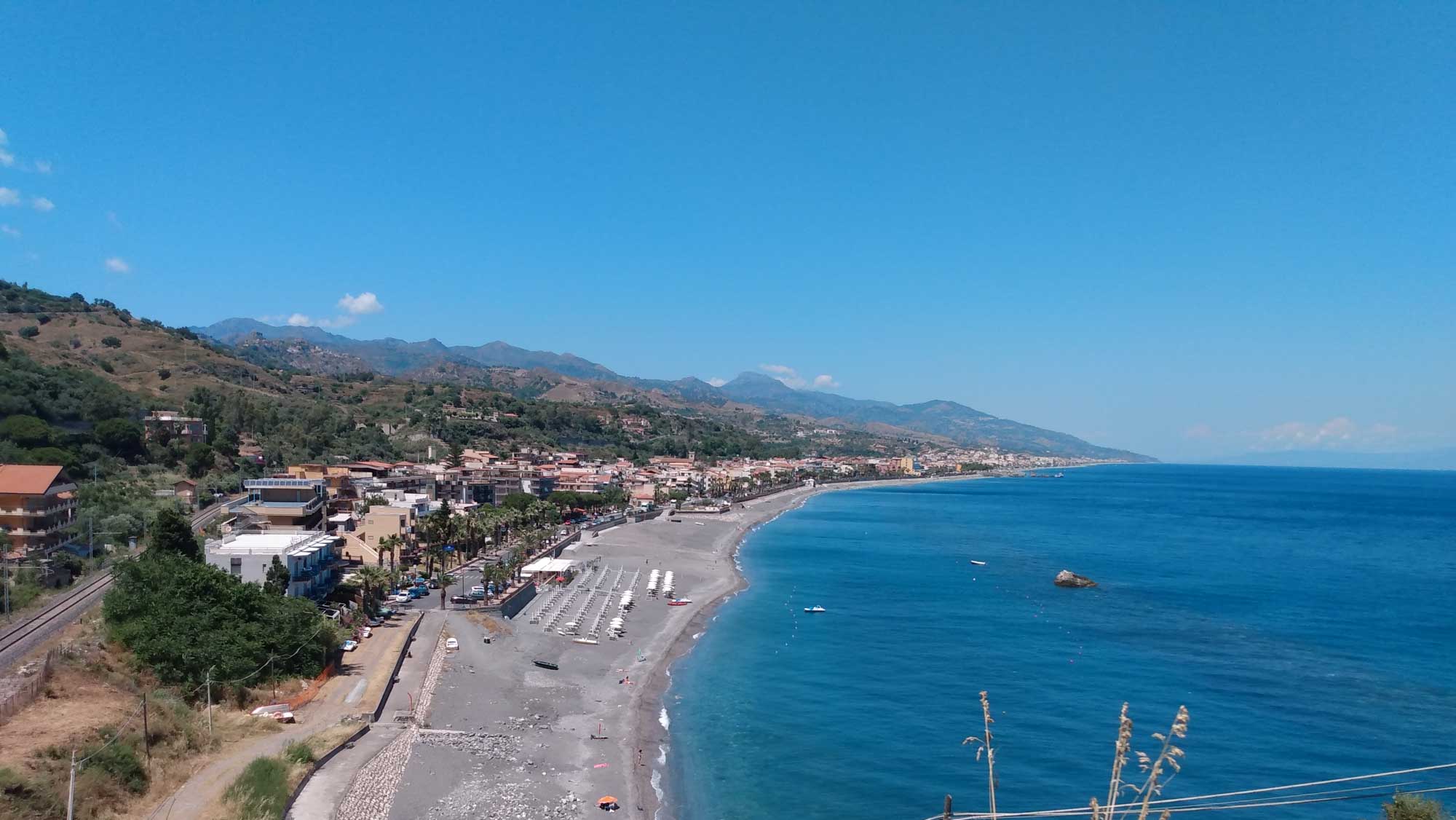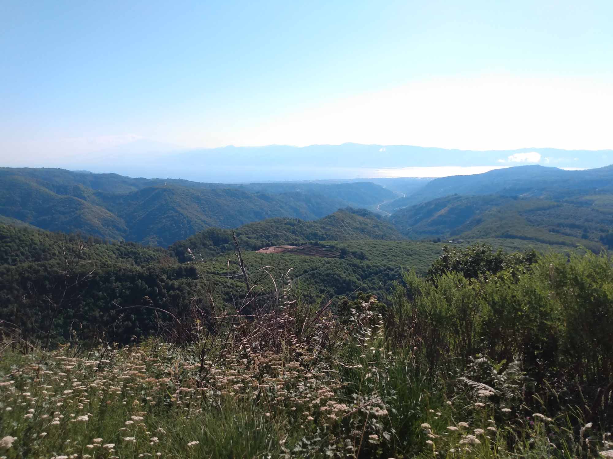 Heute sollte es weitergehen. Aber erst nach dem Frühstück und nach dem Spaziergang. Ein letztes Mal die schöne Runde gehen, die wir seit einer Woche kannten. Diesmal links herum. Aber wir waren kaum an dem Haus mit dem bellenden Hunden vorbei, als wieder einmal Kanonenschläge zu hören waren. Und noch dazu ziemlich nah. Im Haus hätte sich Berta sofort in die hinterste Ecke verkrochen, so wie sie es in den letzten Tagen immer gemacht hatte. Aber hier? Würde sie vermutlich instinktiv einfach loslaufen, wie sie es bei dem Feuerwerk in Bianco gemacht hatte. Aber sie war in Griffnähe und Michael hielt sie erstmal fest. Dann kam der nächste Kanonenschlag und Bertas Zittern war deutlich zu spüren und auch ihr Impuls, sich freizumachen und loszulaufen. Kurzerhand nahm Michael sie auf den Arm und sie war schlagartig ruhiger. Auf dem Arm tragend ging es wieder in Richtung Haus. Dann kam wieder ein Donnerschlag, Berta zappelte kurz, beruhigte sich dann aber sofort wieder. Kurz danach durfte sie auch schon wieder herunter und lief munter - fast als sei nichts gewesen - wieder zur Gittertür. Sie reagierte sogar auf das Wartesignal, als mal wieder ein Auto vorbeikam. So waren wir dann etwas früher als erwartet wieder zurück und frühstückten noch kurz, bevor wir uns daran machten, die letzten Sachen ins Auto zu laden und dann die 100 m die Auffahrt hinunter bis zum Wohnmobil zu fahren. Nach einer guten Stunde war alles verstaut. Dann noch ein kurzes erfrischendes Abschiedsbad im Pool und dann war es soweit, dass wir uns verabschieden mussten. Es waren wunderbare drei Wochen im Ferienhaus von Jutta und Manfred. Ach, wie haben sie uns verwöhnt mit leckerem Essen, gemütlichen Unterhaltungen und das allabendliche Spielen nicht zu vergessen. Es war eine tolle Zeit, aber jetzt wollten wir doch wieder langsam weiter. Das Ausrangieren war bei Tageslicht deutlich leichter als das letzte Mal bei Dunkelheit und auch die kurze Passage mit den zu engen Serpentinen hatten wir schnell hinter uns gebracht. Hinter uns fuhren Jutta und Manfred. Allerdings trennten sich unsere Wege in Lentini. Sie fuhren rechts nach Lentini zum Einkaufen, während wir nach links auf die Umgehungstraße fuhren und dann in Richtung Autobahn, um Catania zu umfahren. Kurz vor Taomina machten wir noch einen Halt, um unseren Frischwassertank mit allerbesten Quellwasser vom Ätna zu befüllen. In Taomina war sehr viel mehr los, als bei unserer Herfahrt. Ein sehr schöner Ort, um Strandurlaub zu machen. Die vielen Restaurants und die schmalen Gassen sahen sehr einladend aus. Und auch das antike Theater ist sicher einen Besuch wert. Wir beließen es beim Vorbeifahren. Mit Ausnahme von einem kurzen Halt am Strand, der Berta allerdings viel zu heiß war, fuhren wir ebenso an den zahlreichen langen Kiesstränden mit ihren weniger ansehlichen Unterkünften hinter der Straße vorbei. Einer davon hieß "Nizza von Sizilien". Aber das echte Nizza ist dann doch etwas hübscher. In Messina fuhren wir direkt bis zum Wartebereich der Fähre durch. Unser Ticket hatten wir ja schon. Die Fähre war bereits eingelaufen und als nach 5 Minuten alles entladen war, konnte wir auch schon rauf. 20 Minuten später waren wir auf der anderen Seite. Dort ging es geradewegs hinauf in die Berge des Parco National deli Aspromonte. Merklich ging die Temperatur herunter. Auf der Fähre hatten wir noch bei knapp 35 Grad geschwitzt und als wir 30 Minuten später auf dem kleinen Wanderparkplatz angekommen waren, auf dem wir übernachten wollten, waren es nur noch 21 Grad. Eine Wonne für Berta, die es gar nicht erwarten konnte, durch den Wald zu rennen. Dies ging allerdings ziemlich steil bergauf. Es wurde eine richtige kleine Wanderung, bei der wir zwischenzeitlich einem kleinen Bachlauf folgenden ziemlich am klettern waren. Die Füße blieben halbwegs trocken und glücklicherweise auch heil. Das nächste Mal sollten wir wirklich unsere Wanderschuhe anziehen. Danach freuten wir uns auf ein leckeres Abendbrot und eine kühle Nacht, in der wir bestimmt wieder gut schlafen werden.