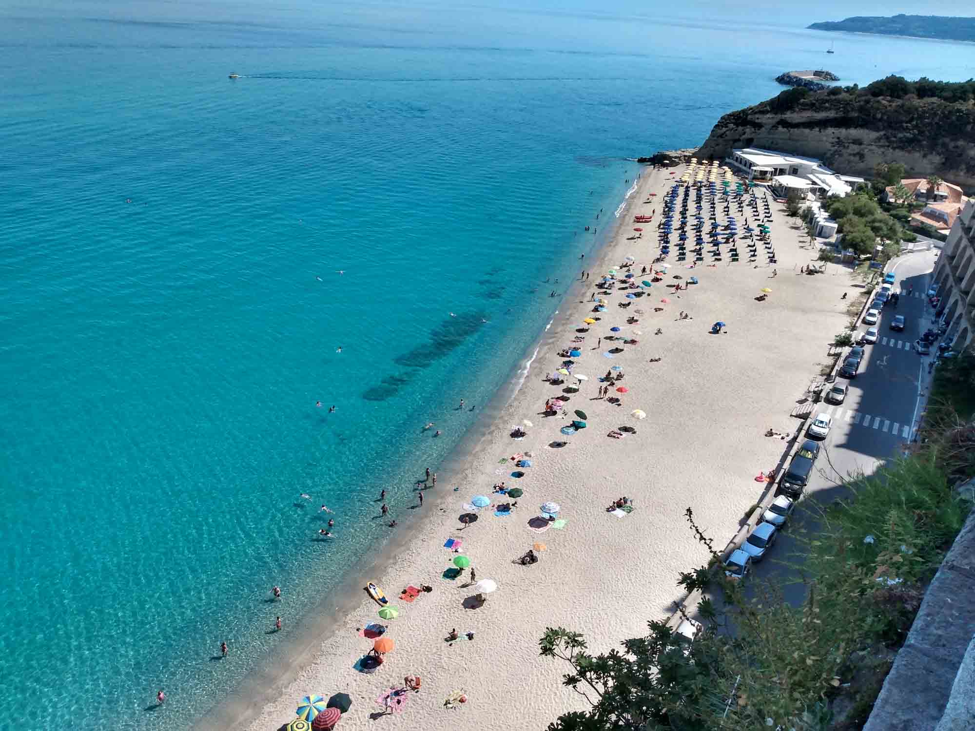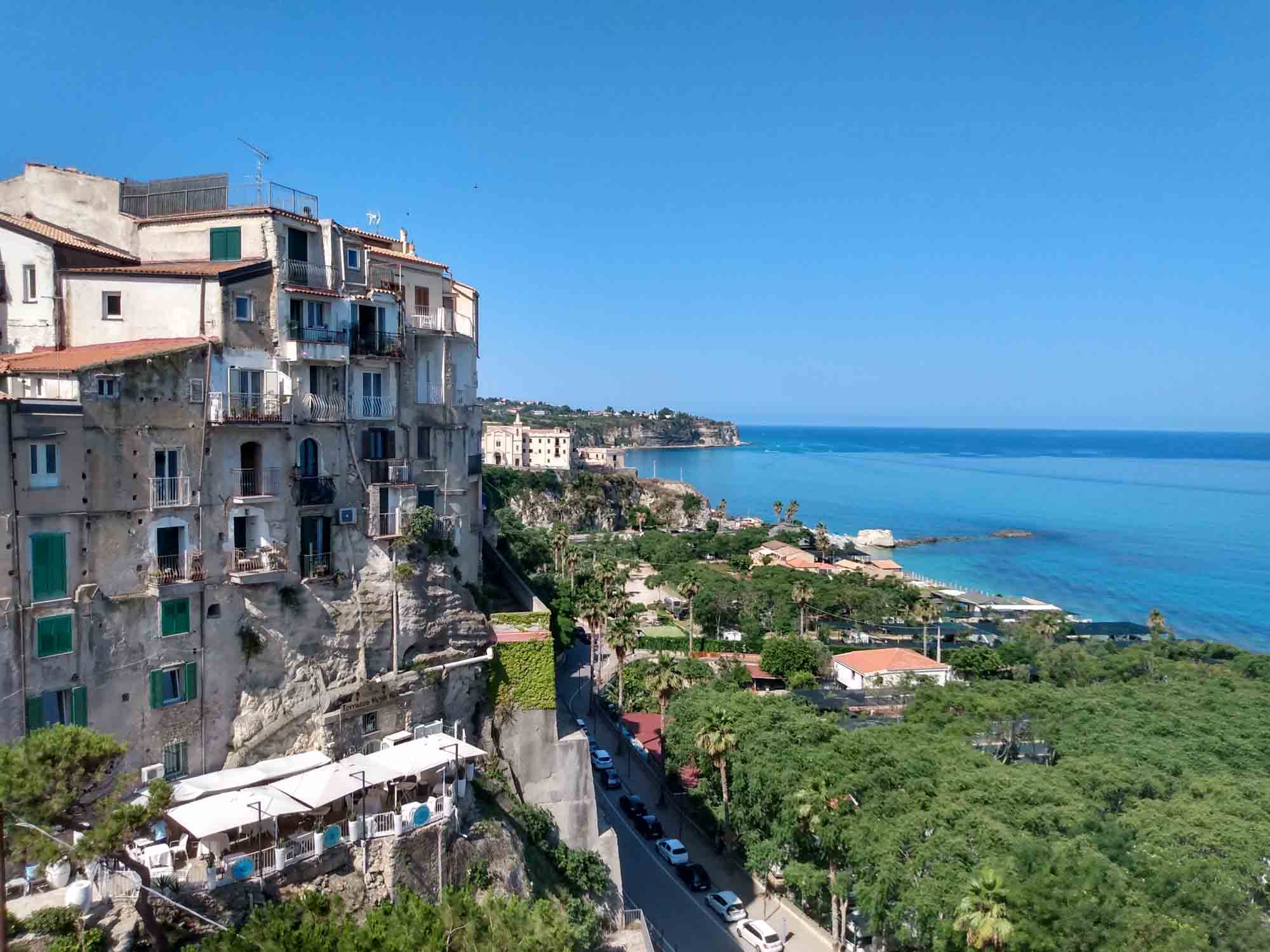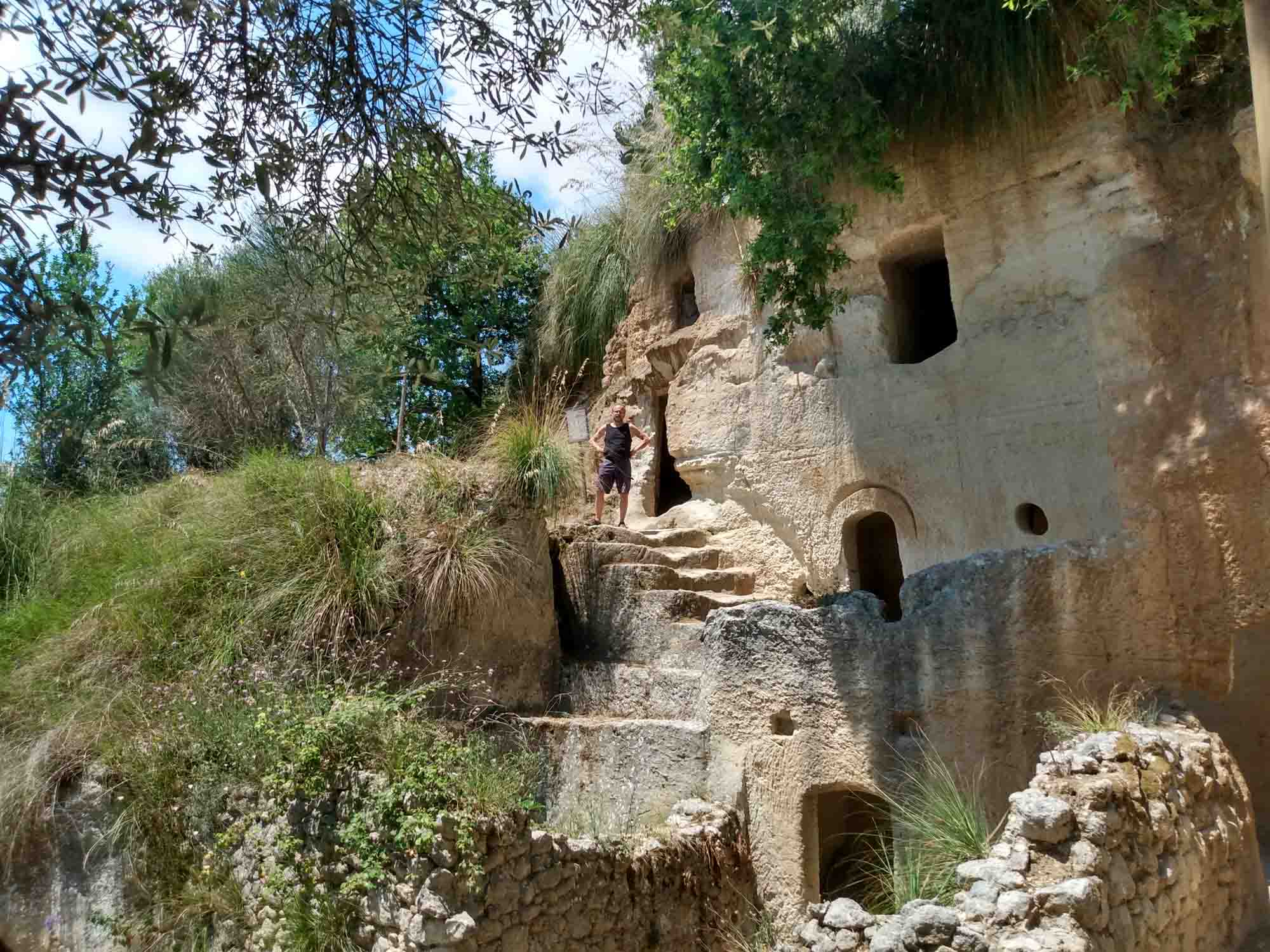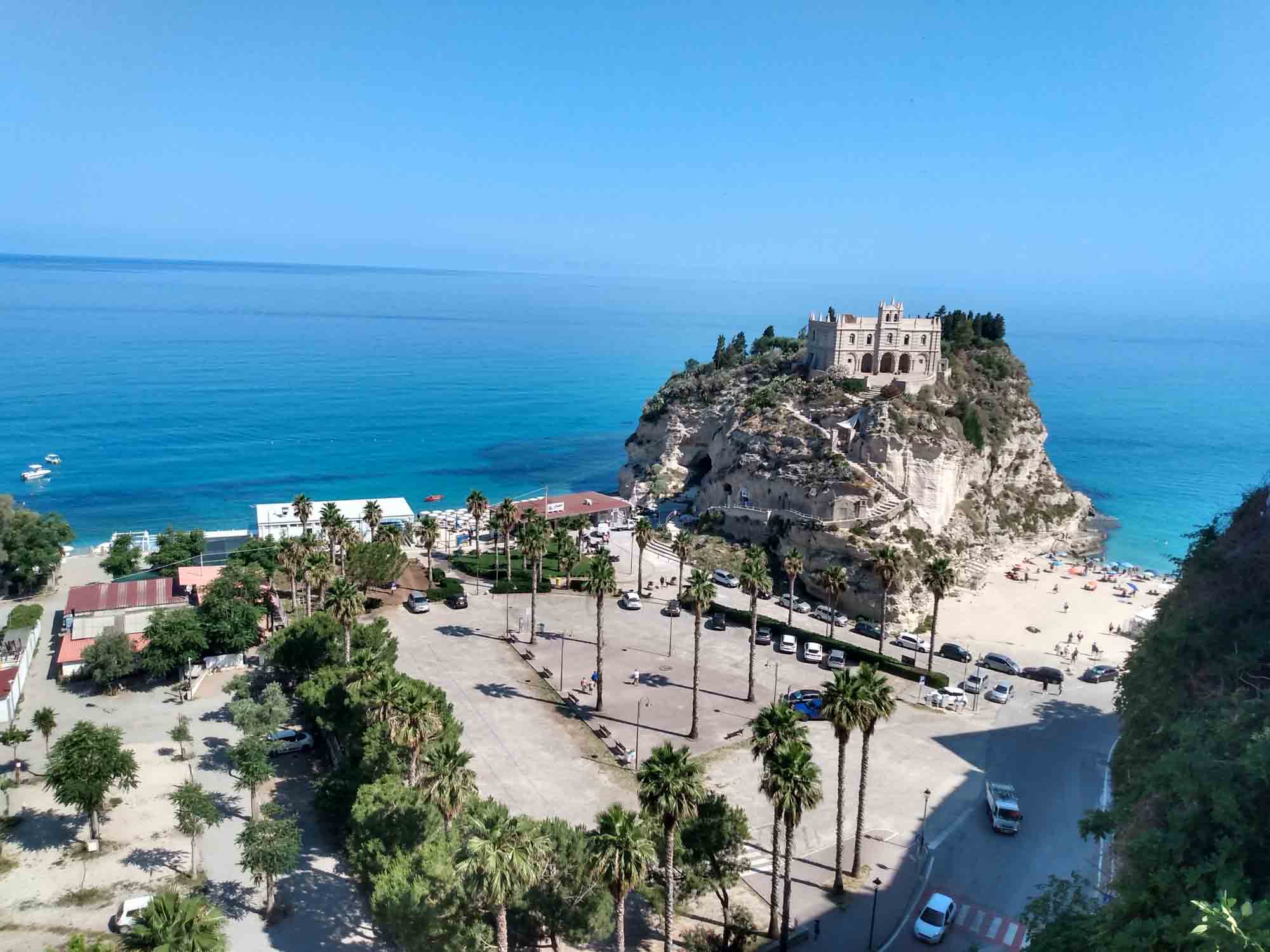 Vor dem Losfahren machten wir noch einen Drohnenflug von der Ruine des Turmes, wo wir übernachtet hatten. Dann ging es nach Tropea. Mal wieder ein kleines Örtchen mit überschaubar breiten Straßen. Ein entgegenkommendes Wohnmobil hielt kurz an, um uns mittzuteilen, dass es hier kein Weiterkommen gab. Eine Brücke sei mit 2,80 m zu niedrig und die andere Strecke gesperrt. Wir versuchten es trotzdem und bekamen kurz vor besagter Brücke sogar einen kostenlosen Parkplatz. Bei unserem Spaziergang in die Altstadt war es schon wieder ziemlich warm geworden. Und so verzichten wir auf den Abstieg zum Strand und die Besichtigung der Kirche am Strand und machten nur von oben einige Fotos. Die Altstadt erinnerte uns ein wenig an die von Cefalù, obwohl sie deutlich kleiner war. Für ein Eis war es uns noch zu früh und so fuhren wir weiter. Natürlich unter der Brücke durch, auf der sehr deutlich ein Schild mit 2,80 m angebracht war. Über unserem Wohnmobil (Höhe 2,85 m) war bestimmt noch 1 m Platz. Sie hatten wohl gerade dieses Schild gehabt und es passt auch irgendwie ganz hübsch dorthin. Danach führte uns der Weg in die Berge oberhalb von Tropea zu dem kleinen Örtchen Zungri. Dort genehmigten wir uns erst einmal einen Espresso und einen Cappuchino bevor wir gemütlich durch das niedliche Örtchen zu den Grotten von Zungri spazierten. Berta durfte mit hinein und die zahlreichen Felsenbehausungen bewundern, die irgendein Völkchen vor tausend Jahren hier in den Kalkstein gehauen hat. Auch das zugehörige Museum, in dem Alltagsgegenstände aus dem 18. Jahrhundert ausgestellt waren, war durchaus sehenswert, zumal es angenehm gekühlt war. Weiter ging es wieder zum Meer, wo wir uns mit einer Wassermelone erfrischten und Berta sich im Meer abkühlte. Nach dieser kleinen Pause fuhren wir nach Pizzo, wo wir auch diesmal kein Tartuffo kauften, sondern die Chiesa die Piedigrotta besichtigten. Dies ist eine Felsenhöhle am Strand, in der unterschiedliche Künstler zahlreiche Skulpturen aus dem Fels gehauen haben. Einige der Figuren hatten schon ziemlich unter dem Zahn der Zeit zu leiden gehabt, waren aber noch immer unbedingt bewundernswert. Als wir aus der Kühle der Höhle wieder herauskamen, waren wir von der Hitze draußen regelrecht erschlagen. Danach ging es wieder in die Berge. Allerdings wollten wir vorher noch einkaufen, da es in der Abgeschiedenheit des Nationalparks Sila keine Einkaufsmöglichkeiten mehr geben würde. Dies stellte sich jedoch komplizierter dar als erwartet. Insgesamt mussten wir drei Conads anfahren, um zumindest halbwegs mit Brot und Wasser versorgt zu sein. Anstelle der geplanten Wachteln wird es Kaninchen geben. Und das wird auch nicht gegrillt werden, sondern natürlich geschmort. Aber dazu morgen mehr. Wir fuhren noch eine weitere Stunde immer höher in die Berge und allmählich wurde es auch wieder angenehm kühler. Um zu unserem Stellplatz auf einer Wiese am Lago Avro zu kommen mussten wir ein Tor aus Stacheldraht öffnen (und natürlich hinter uns wieder schließen) und danach einem ziemlich schlechten Feldweg in den bereits etliche Büsche hineingewachsen waren bis zum Wasser des Sees folgen. Aber am Ende wurden wir mit einem fantastischen Platz mit Blick auf den See, an dessen Ufer gelb blühende Ginsterbüsche standen belohnt. Im See sprangen die Fische und wollten geangelt werden. Aber heute nicht mehr. Im Kühlschrank war kein Platz. Nach einer kleinen Erkundungstour über die Wiese und am Seeufer entlang gab es Abendbrot und unsere Kleine legte sich müde von dem heißen Tag und der anstrengenden Fahrt hin und schlief sofort ein.