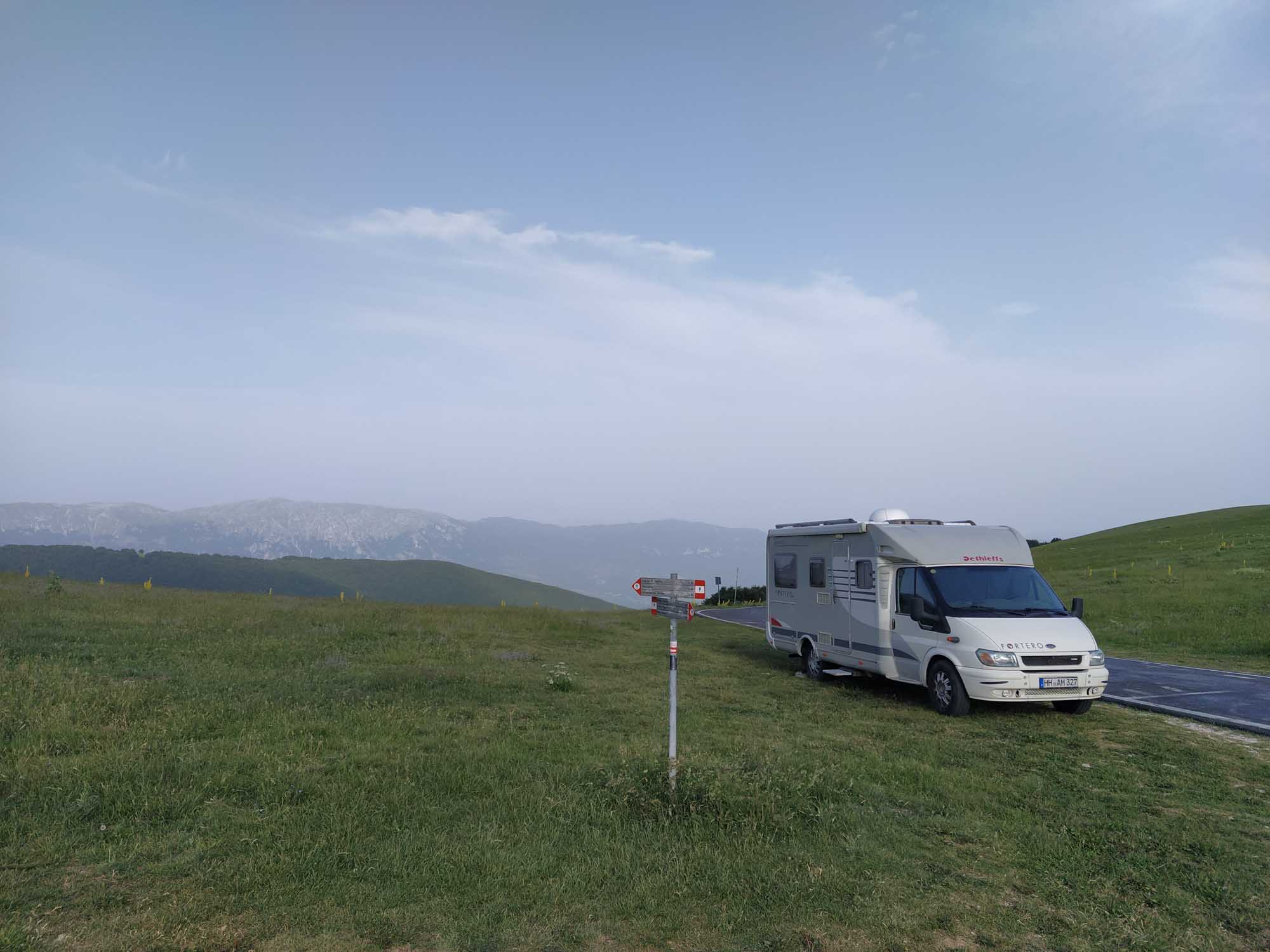 Wieder einmal hatten wir eine ruhige kühle Nacht, auch wenn es auf dem Pass in der Nacht ziemlich windig wurde. Der morgendliche Spaziergang führte uns auf einem schmalen Pfad entlang der Hangkante auf den Berg. Auf dem Rückweg sahen wir am Waldrand ein Reh, dass uns neugierig anblickte. Obwohl Berta frei lief, blieb sie auf dem Weg, schaute einen Moment gemeinsam mit Michael nach dem Tier und lief anschließend weiter entlang des Weges. Wenn es nur immer so gut laufen würde. Nach dem Frühstück fuhren wir los. Eine zeitlang war die Straße so schmal, dass noch nicht einmal zwei normale Fahrzeuge aneinander vorbeigepasst hätten, geschweige denn irgendein Fahrzeug an unserem Wohnmobil. Zudem ging es ziemlich steil bergab. Aber zum Glück kam wieder einmal kein Wagen entgegen. Nach knapp 9 km Talfahrt zeigten die Bremsen plötzlich kaum noch Wirkung. Der starke Geruch bestätigte dann die schnelle Diagnose: Sie waren heißgelaufen. Also warteten wir am Straßenrand eine Viertelstunde und fuhren anschließend langsam unter vollem Einsatz der Motorbremse weiter bis zur Tankstelle, die wir ebenfalls dringend brauchten. 3 Liter waren noch im Tank gewesen. Das hätte locker noch für weitere 20 km gereicht. Unser nächstes Zwischenziel war Aquila. Dort wollten wir unsere Toilette und den Abwassertank entsorgen. Allerdings hatte Google mal wieder andere Pläne mit uns. Sie hatte die Idee, dass wir von Castiglione a Casauria quer durch die Berge nach Bussi sul Tinno fahren sollten. Das klang anfangs nach einer recht guten Idee. Die Landschaft war sehr schön, die Straße asphaltiert und glatt, wenn auch ein wenig kurvig. So schlängelten wir uns knapp 25 km quer durch die Berge bis fast auf den Gipfel. Fast. Denn plötzlich hörte der Asphalt auf und die für vielleicht 300 m gute Schotterpiste wechselte schlagartig in "Hier-geht-es-nur-mit-Allrad-weiter". Also durften wir zunächst 300 m rückwärts fahren und anschließend die 25 km zurückkurven um dann in Torre de Passen an der richtigen Stelle rechts abzubiegen, die kurze Verbindungsstraße bis zur SR5 zu nehmen und anschließend in kaum 45 Minuten auf der perfekt ausgebauten Bundesstraße bis nach Aquila fahren. Dort entledigten wir uns des schmutzigen Wassers und hielten noch einmal an einer Eisdiele, um das wohl schlechteste und teuerste Eis zu kaufen, dass es in Italien gab. Danach wollten wir eigentlich zu einem schönen Platz im Parco Nazionale del Monti Sibillini fahren. Aber dieses mal stimmte leider eine Breitenbeschränkung, die wir am letzten Abzweig 5 km zurück gesehen hatten. Denn wir standen vor einer Ortsdurchfahrt, an der das gleiche Schild mit der Angabe 2 m 20 hing. Es war auf einen Blick ersichtlich, dass der schmale Spalt zwischen den Häuserwänden für unser Wohnmobil zu eng war. Also erneut gedreht und umgeplant. Bevor wir jedoch den avisierten Picknickplatz kurz vor Assisi erreichten, sahen wir auf der linken Seite eine Einfahrt zu einem Friedhof. Hier standen wir vollkommen ruhig und konnten sogar noch einen tollen Abendspaziergang in Richtung der nahen Berge machen. Und Berta konnte noch einmal ihrem Jagdtrieb frönen. Es großes laut grunzendes Tier lief neben uns durch den Wald. Berta schaute kurz und schon hüpfte sie wie ein junges Reh durch das hohe Gras in den Wald, dem Tier hinterher. Erst war ein kurzes Bellen dann ein Grunzen zu hören. Danach war Ruhe. 30 Sekunden später tauchte Berta wieder aus dem Wald auf und wir konnten gemütlich unseren Spaziergang beenden.