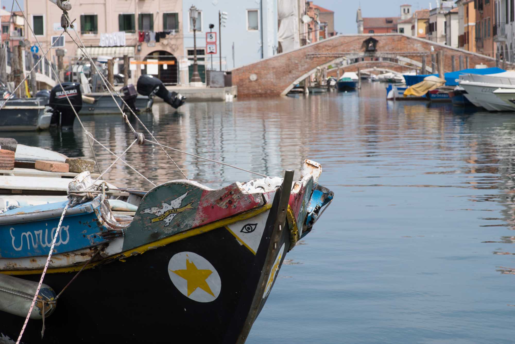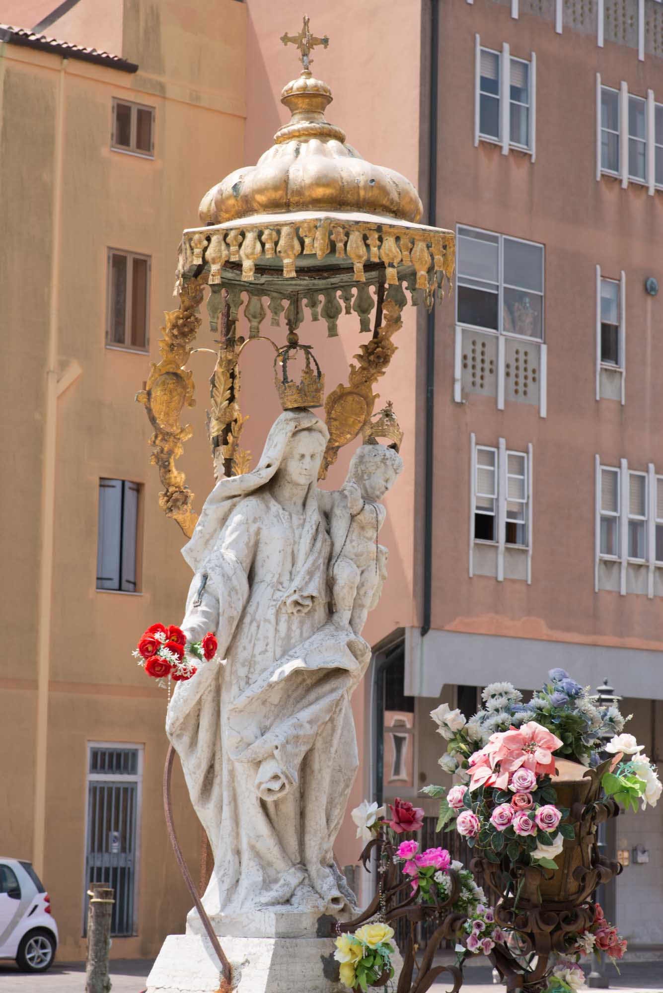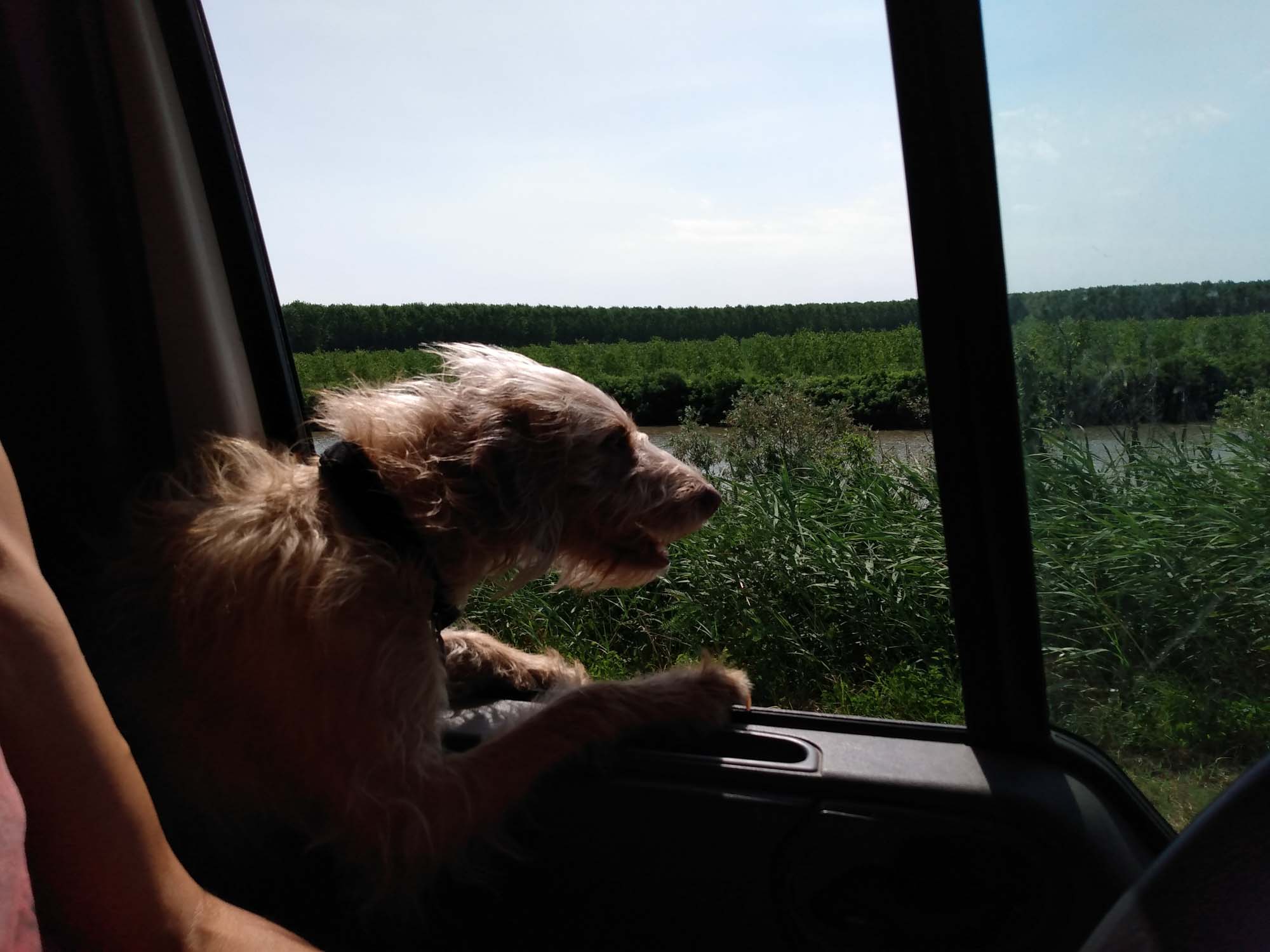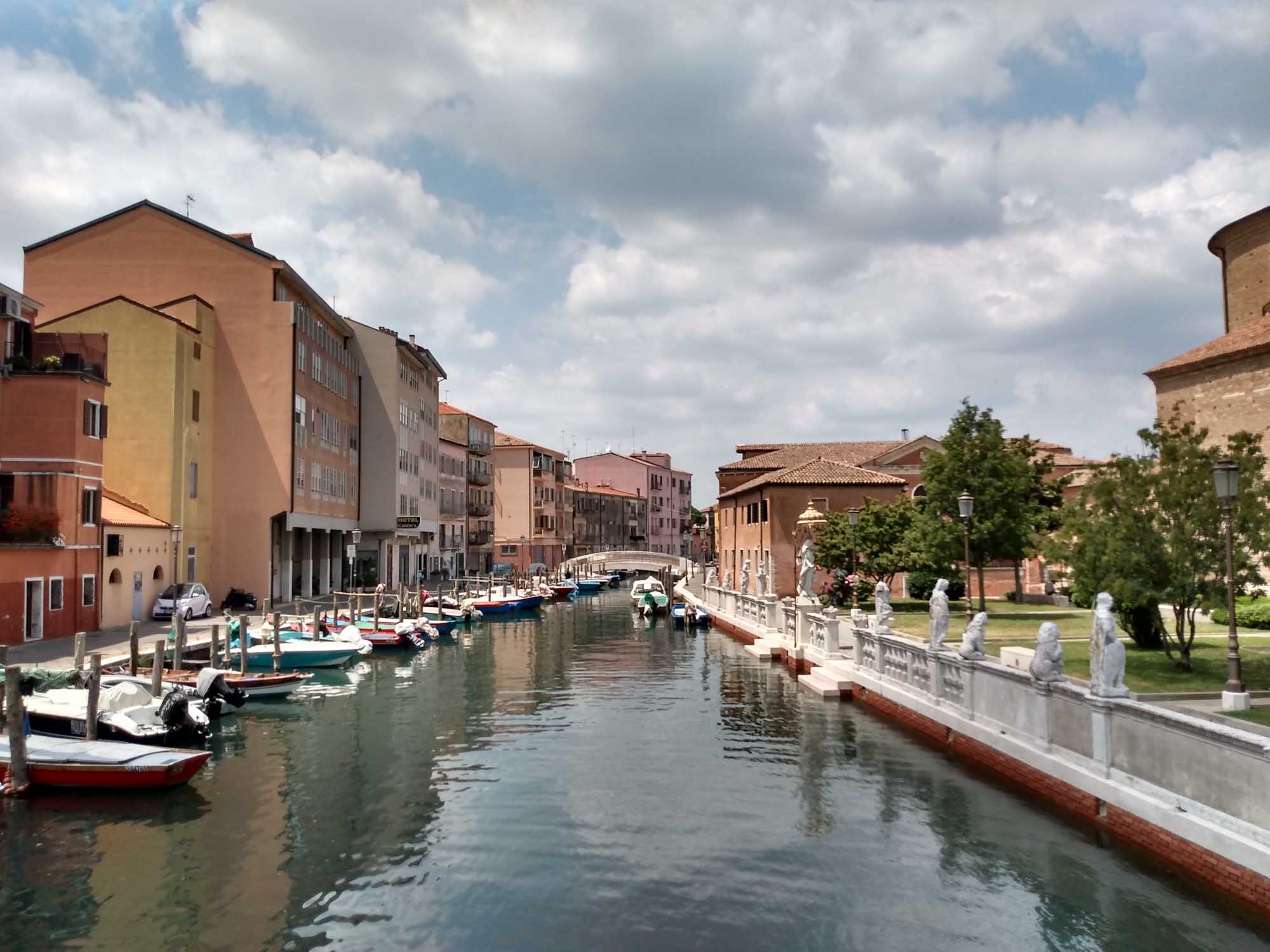 Morgens spazierten wir mit Berta ausnahmsweise an der Leine. Das Risiko noch einmal stundenlang Kletten aus ihr herauspulen zu müssen, wollten wir nicht eingehen. Auch so brauchten wir noch einmal eine halbe Stunde, bis sie endlich halbwegs wieder sauber war. Gegen halb 10 fuhren wir los und wären auch noch recht zeitig in Chioggia angekommen, wenn uns nicht ein längerer Stau an einer Baustelle aufgehalten hätte. So war es dann schon 11:30 Uhr als wir dort ankamen und von unserem Parkplatz in die Altstadt spazierten. Auf dem Hinweig gab es noch ein paar Schatten und wir versuchten so gut wie möglich im Schatten zu laufen. In Chioggia gibt es (fast) wie in Venig kleine Kanäle mit Brücken, an denen zahlreiche Boote liegen. Ein niedliches kleines Örtchen und eine echte Alternative, wenn man dem Troubel in Vendig entgehen will. Hier konnten wir ungestört laufen, ein Eis genießen, Berta beim Baden in einer Vogeltränke zusehen, die Sonne auf uns herniederbrennen lassen, den Ausblick genießen und jede Menge schwitzen. Auf dem Rückweg stand die Sonne im Zenit und auch das letzte bisschen Schatten war verschwunden. Michael ging daher das Auto alleine holen, während Aneta mit Berta unter einem Baum wartete. Dann fuhren wir weiter die Küste entlang. Bei Vendig schüttete es plötzlich wie aus Kübeln. Und da hieß es doch, dass derzeit in Norditalien Dürre herrsche. Dies betrifft aber nur den westlichen Teil von Norditalien. Im Veneto war alles sehr grün, nur der Po führte deutlich weniger Wasser als sonst üblich, wie wir an den freiliegenden und mit toten Muscheln besetzten Uferbänken erkennen konnten. Nach knapp 2 Stunden hielten wir bei Palmanova an, um die Drohne über der Stadt fliegen zu lassen. Palmanova ist eine kleine Stadt, die im Zentrum einer alten Zitadelle errichtet worden ist. Und das kann man natürlich am besten aus der Luft sehen. Also Drohne hoch und noch ein bisschen höher, einmal über den zentralen Platz geflogen und wieder zurück. Danach fuhren wir in die Stadt und nahmen von dort eine Pizza mit. Als wir zu Fuß durch die Stadt gingen, bemerkten wir außer dass wir durch ein altes Festungstor hineingefahren waren, nichts von der besonderen Anlage der Stadt. Die Pizza aßen wir dann an unserem Stellplatz, der heute am Fluß Torre lag. Berta legte sich nach dem Abendessen gleich draußen hin und schlief selig, bis wir sie wieder hereinholten, als auch wir zu Bett gingen.