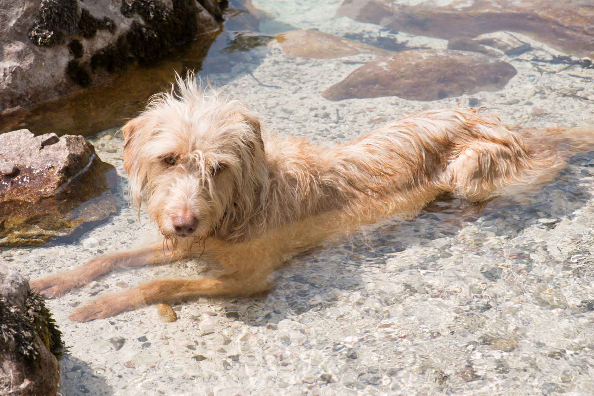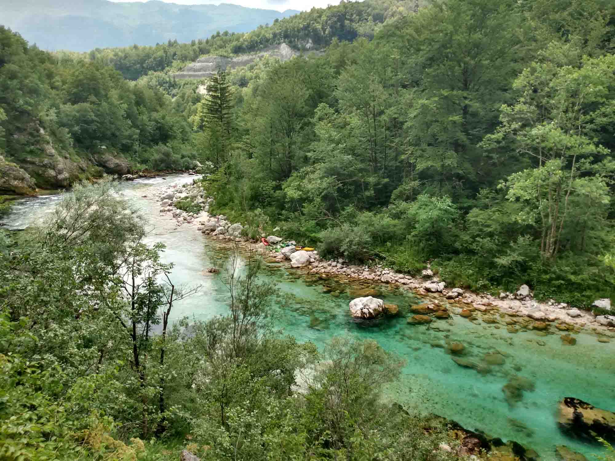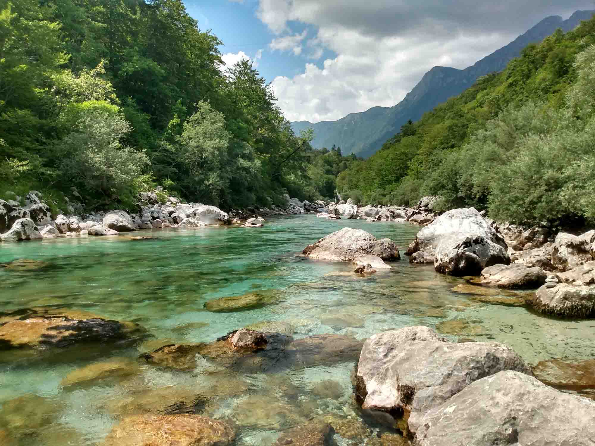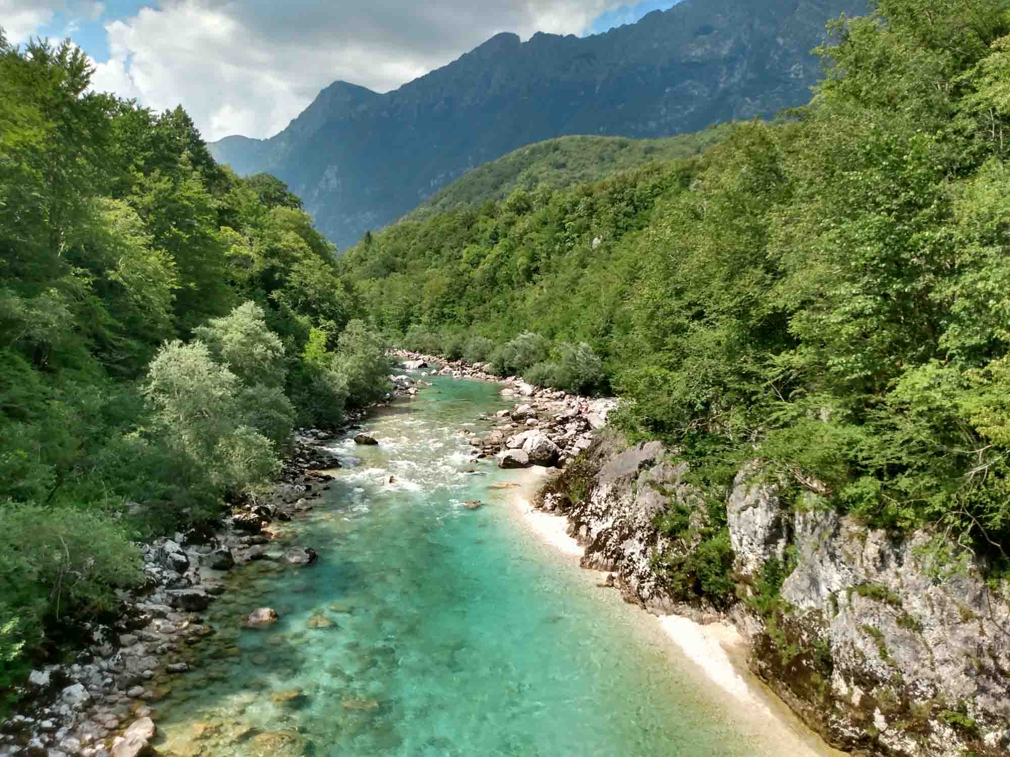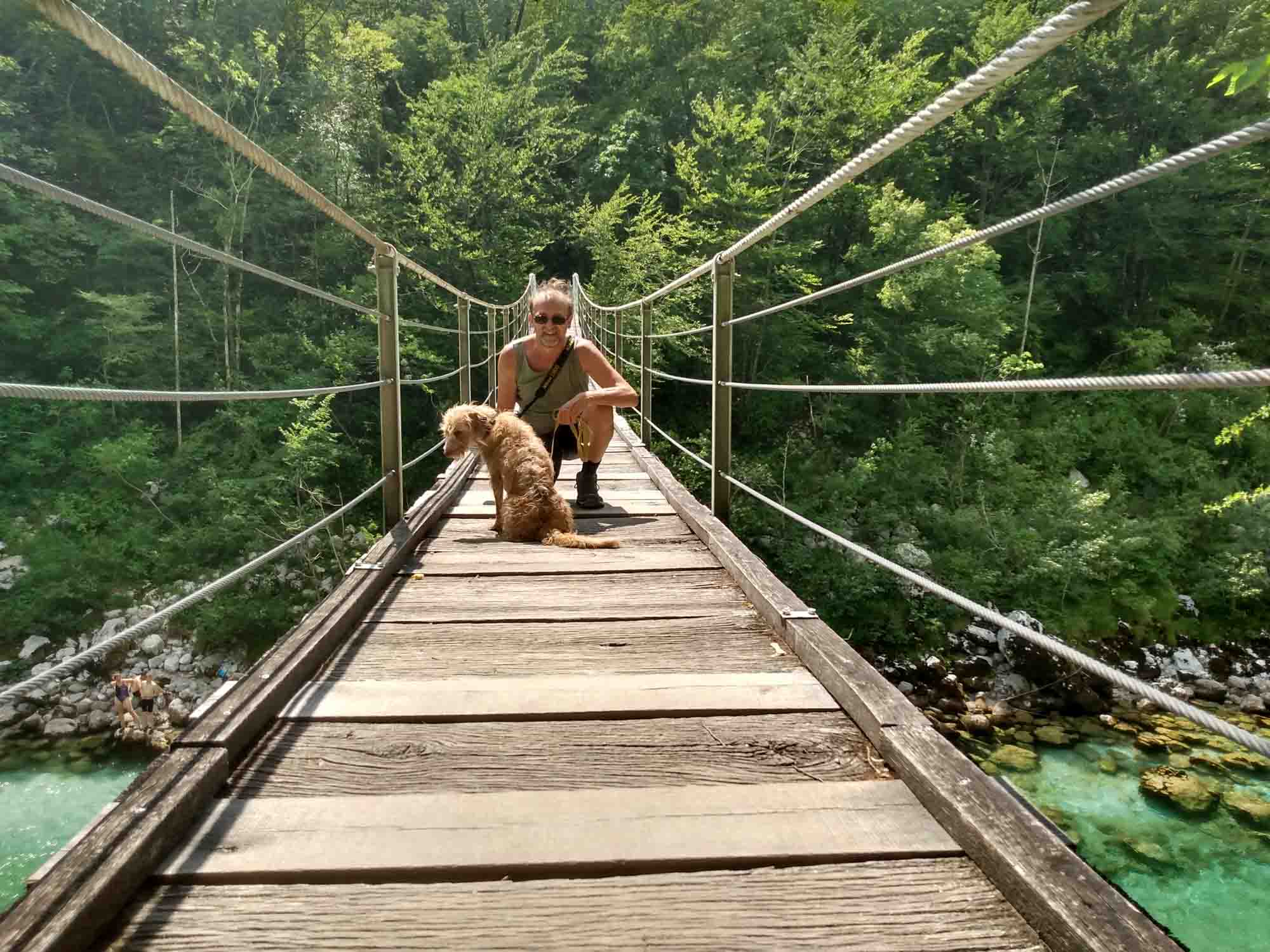 Morgens spazierten wir zum Fluß Torre, in dessen Nähe wir geschlafen hatten. Etwas überrascht waren wir schon, als wir trockenen Fußes auf der anderen Seite ankamen und feststellten, dass diese trockene Steinlandschaft einmal ein großer breiter Fluß gewesen sein soll. Überall nur Steine und dazwischen einiges Grün, das darauf hindeutete, dass hier bereits länger kein Wasser mehr entlanggeflossen ist. Die Trockenheit ist auch im Nordosten Italiens allgegenwärtig. Wir fuhren nach Udine, weil es dort einen Markt geben sollte. Dieser sollte jedoch in der Altstadt sein und war mit unserem Wohnmobil nicht erreichbar. Stattdessen fuhren wir einfach zu einem Supermarkt und deckten uns dort mit allem ein, was wir in den nächsten Tagen brauchen würden. Dann ging es weiter in Richtung der Berge und schon nach einer halben Stunden waren wir in Slowenien. Was uns sofort auffiel war das völlig normale rücksichtsvolle Verhalten der Slovenischen Autofahrer, die an Engstellen einfach anhielten, uns passieren ließen und dann in aller Ruhe weiterfuhren. Daran mussten wir uns erstmal wieder gewöhnen und kamen uns mit der zuletzt angewöhnten Fahrweise beinahe rüpelhaft vor. Kurz hinter Kobarid suchten wir uns einen Parkplatz und wanderten zum Wasserfall Kozjak. Zumindest wollten wir das. Aber wir waren nicht bereit, für die kurze Besichtigung und ein Foto Eintritt zu bezahlen und gingen stattdessen zur Soka hinunter und ließen Berta im eiskalten Bergwasser des kleinen Flusses abkühlen. Sie aalte sich geradezu im kalten Wasser. Danach fuhren wir unseren Stellplatz für die nächsten Tage an, einen kleinen privaten Campingplatz bei Plužna. In Slowenien soll die Polizei sehr viel strenger gegen freistehende Camper vorgehen und auf einen solchen Kontakt konnten wir gerne verzichten. Unser Gastgeber war ungemein freundlich und half uns dabei, einen schönen Platz auf seinem Grundstück zu finden. Dann machten wir es uns dort gemütlich und warteten darauf, dass es gegen Abend etwas kühler wurde. Dann warfen wir den Grill an und ließen uns anschließend Hähnchenkeulen mit Kräuterbaguette schmecken.