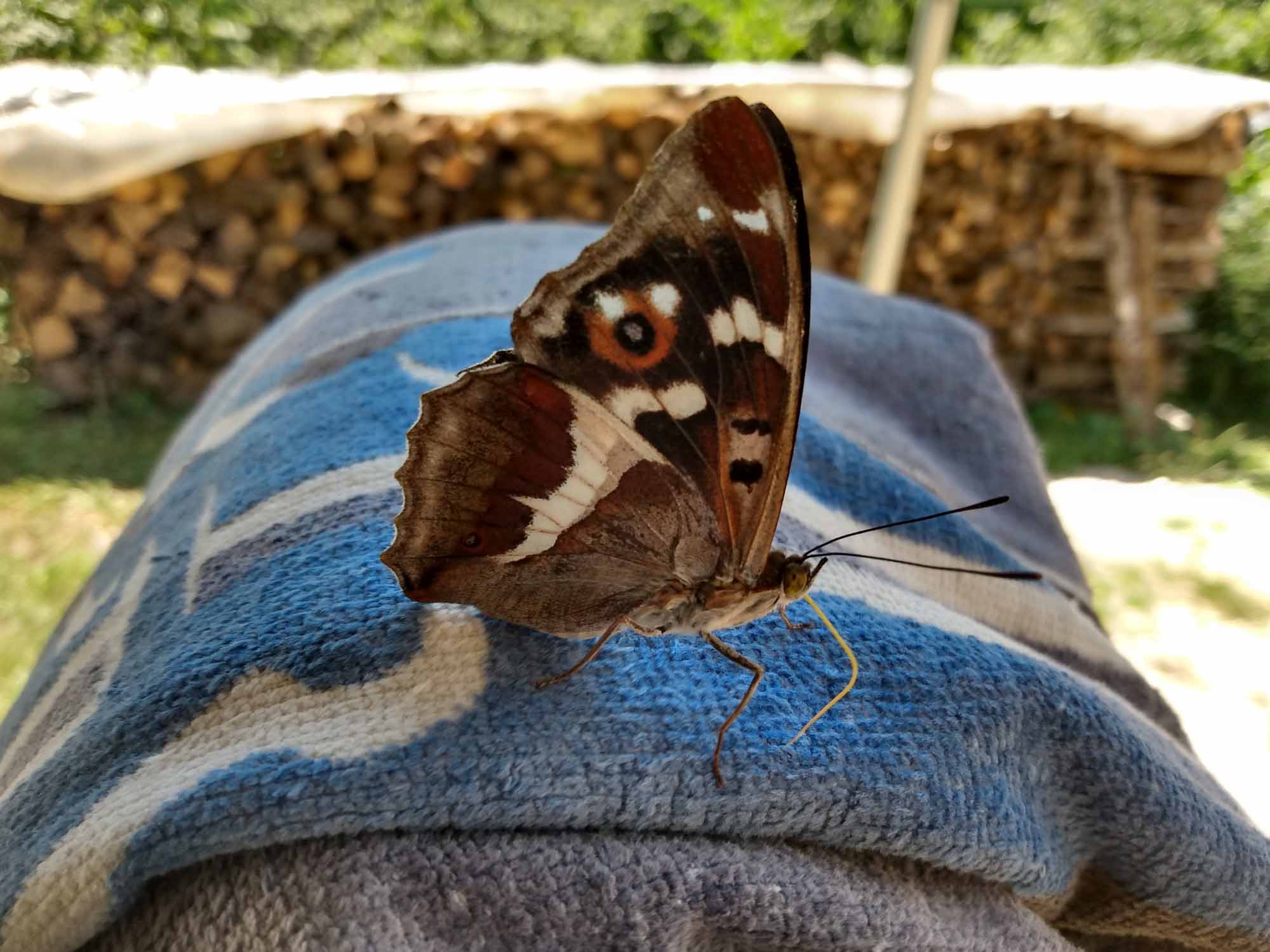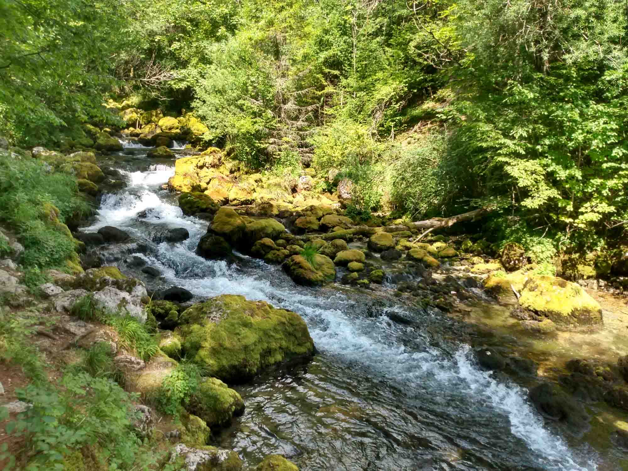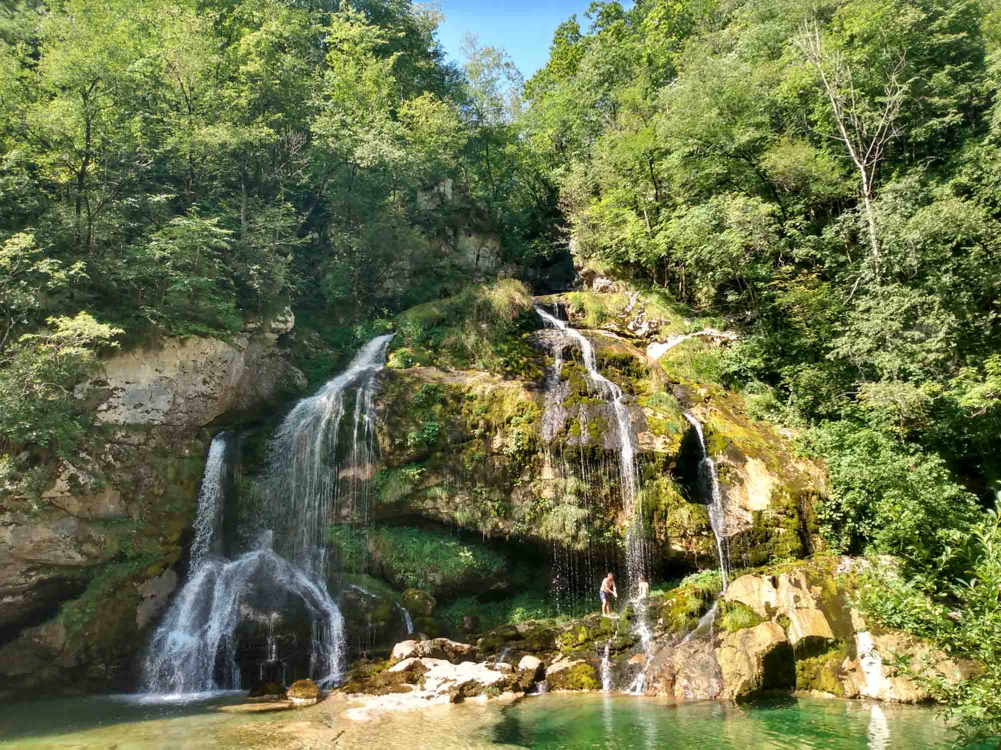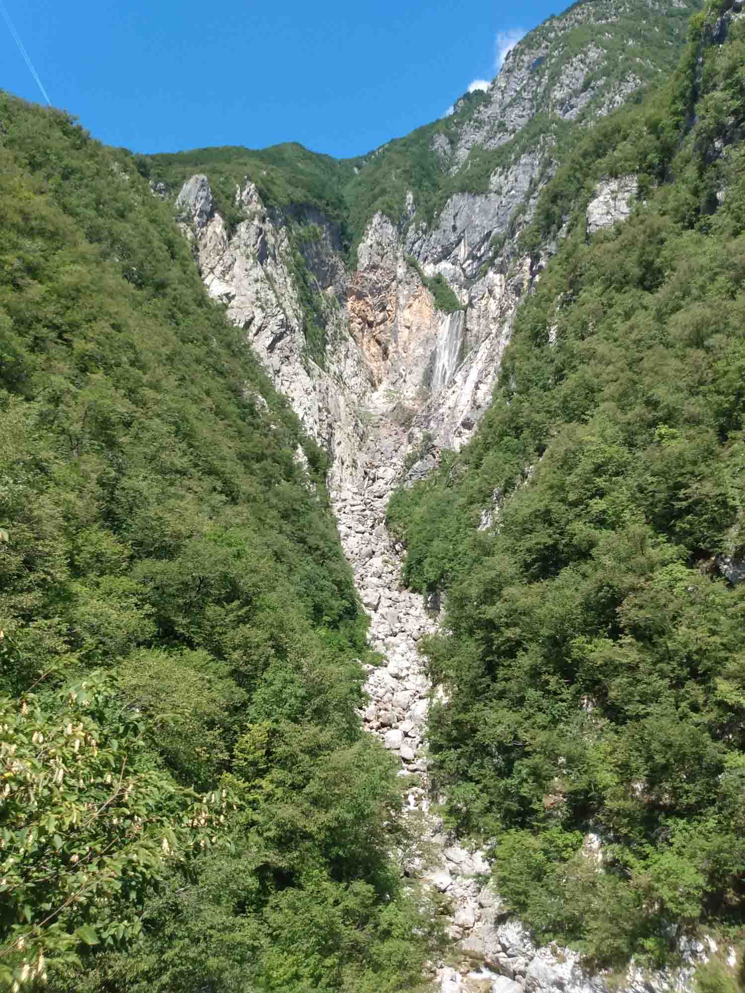 Der Platz war ideal für eine Wandertour zu zwei sehr schönen Wasserfällen. Den Slap Virje erwanderten wir uns am ersten Tag. Am zweiten ging es zum Slap Blok. Während wir beim ersten die Füße in das kalte Becken unterhalb des Wasserfalls stecken konnten (Berta übernahm das freundlicherweise für uns) konnten wir den Slap Blok nur vom Aussichtspunkt aus bewundern. Aber bereits von dort sah es spaktakulär aus, wie das Wasser über fast 100 m in die Tiefe rauscht. Am dritten Tag wiederholten wir die Wanderung zum Slap Virja und diesmal kam uns der Weg viel kürzer vor. Nachmittags blieben wir im Schatten der Markise. Die Hitze war auch in Slowenien angekommen. Tagsüber waren es 35 Grad. Aber immerhin: nachts kühlte es bis auf 18 Grad ab, so dass wir wenigstens gut schlafen konnten. Unser Gastgeber David war super nett und am Abend vor der Abreise hatten wir noch ein längeres Gespräch mit ihm. Er erzählte uns, wie viel Glück er gehabt hatte, dieses Grundstück kaufen zu können und freut sich noch heute darüber, dieses Glück mit seinen Gästen teilen zu können. Es waren einige Deutsche auf dem Platz. Mit einem Paar, das mit zwei Kindern, zwei Hunden sowie einem Chamäleon unterwegs war, verstanden wir uns auf Anhieb und verbrachten einige Zeit mit klönen. Es ist schon schön zu Reisen und immer wieder nette Menschen zu treffen.