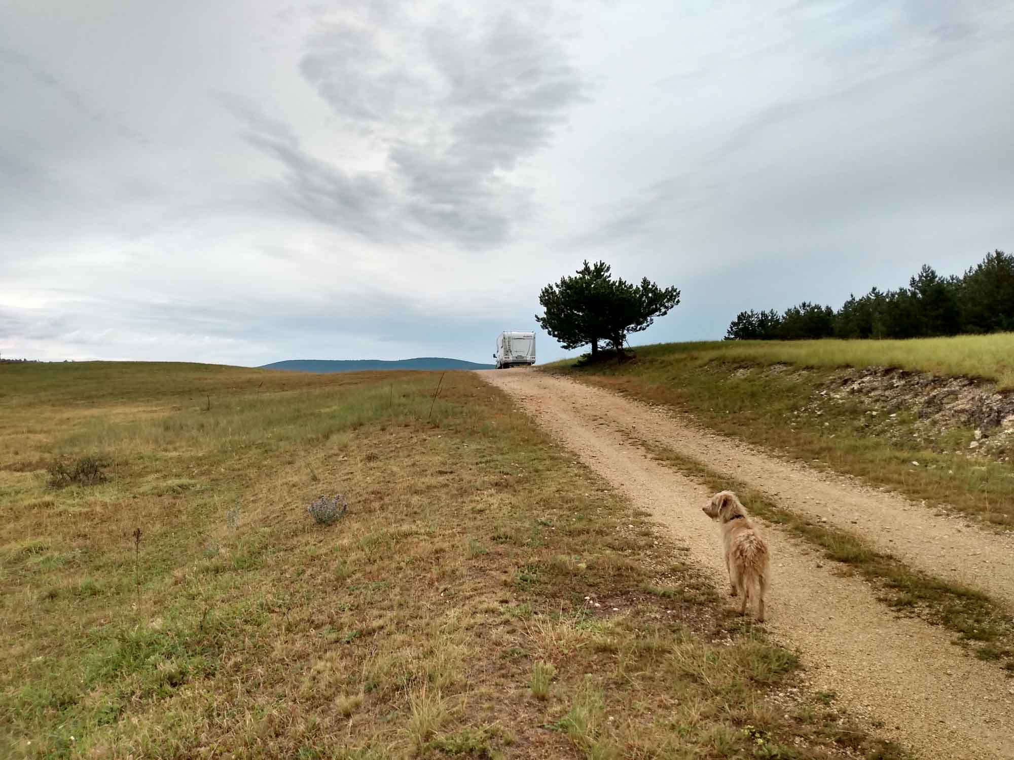 Morgens füllte sich der Platz sehr schnell mit Wanderen. Also wurde es Zeit, wieder aufzubrechen. Mit einem kleinen Zwischenstopp, um das nötigste Einzukaufen, fuhren wir einen möglichen Stellplatz nördlich des Plattensees an. Leider war kurz vor dem Ziel ein brandneues Verbotsschild für Kraftfahrzeuge aller Art aufgestellt worden, so dass wir einen weiteren Platz etwas weiter östlich anfahren mussten. Hier fuhren wir über einen unbefestigten Weg bis zu einem steilen Stück, das wir zwar heruntergekommen wären, aber vermutlich nicht mehr zurück. Gleichzeitig fing es kräftig an zu schütten und die ersten Blitze eines Sommergewitters zuckten um uns herum. Wir machten aus der Not eine Tugend und es uns die nächsten beiden Stunden drinnen gemütlich. Als der Regen vorbei war, gingen wir die Strecke zu Fuß ab und stellten fest, dass es eine ausgesprochen gute Idee gewesen war, oben stehenzubleiben. Es wäre unten tatsächlich nicht weitergegangen und es wäre sehr fraglich gewesen, ob wir den Weg zurück auf dem schlammigen Pfad wieder auf den Berg geschafft hätten. Stattdessen fanden wir eine Abkürzung, die uns quer über eine Weise und durch den Wald zu unserem nächtlichen Stellplatz brachte. Hier standen wir mit Blick auf einen See etwas geschützt durch die Bäume des Waldes. Und morgen früh wird auf diesem Platz bestimmt kein Wanderer mit seinem Auto parken wollen.
