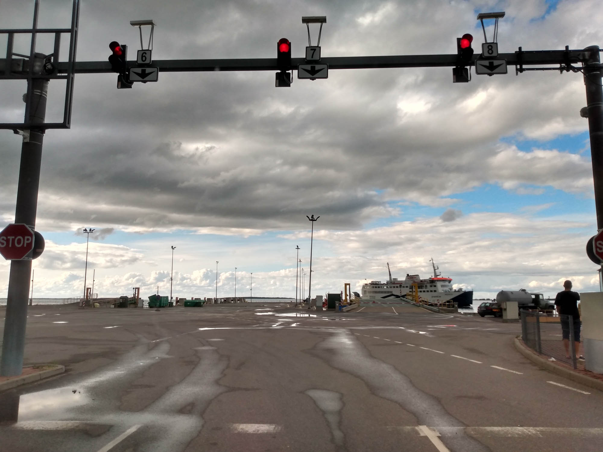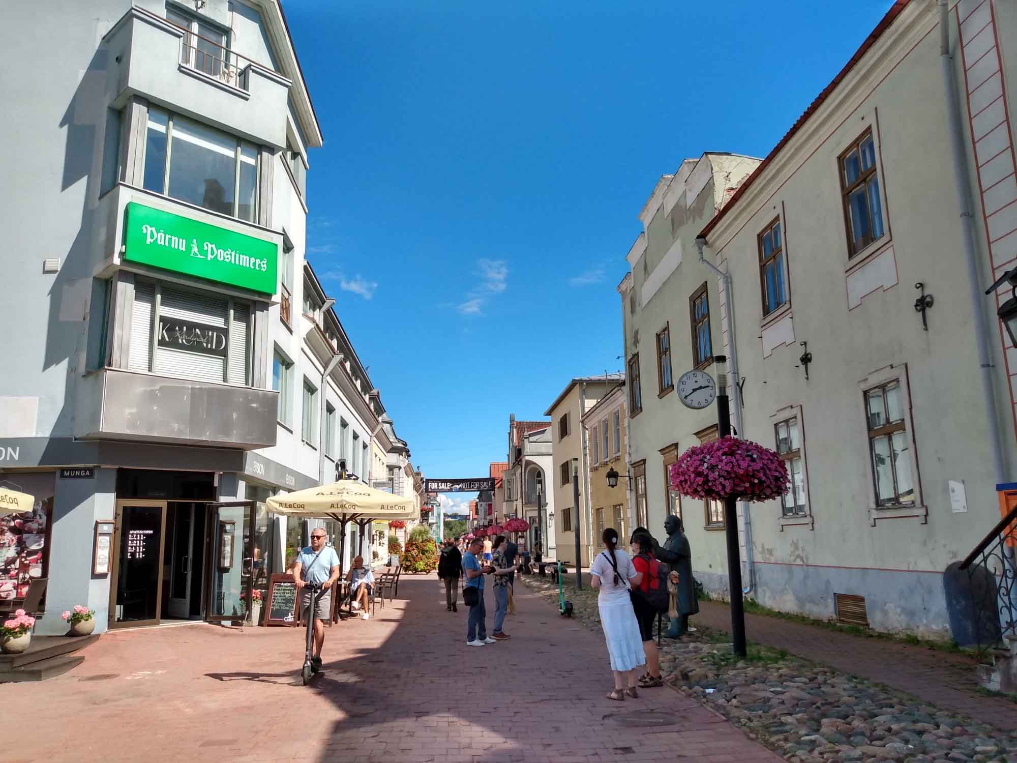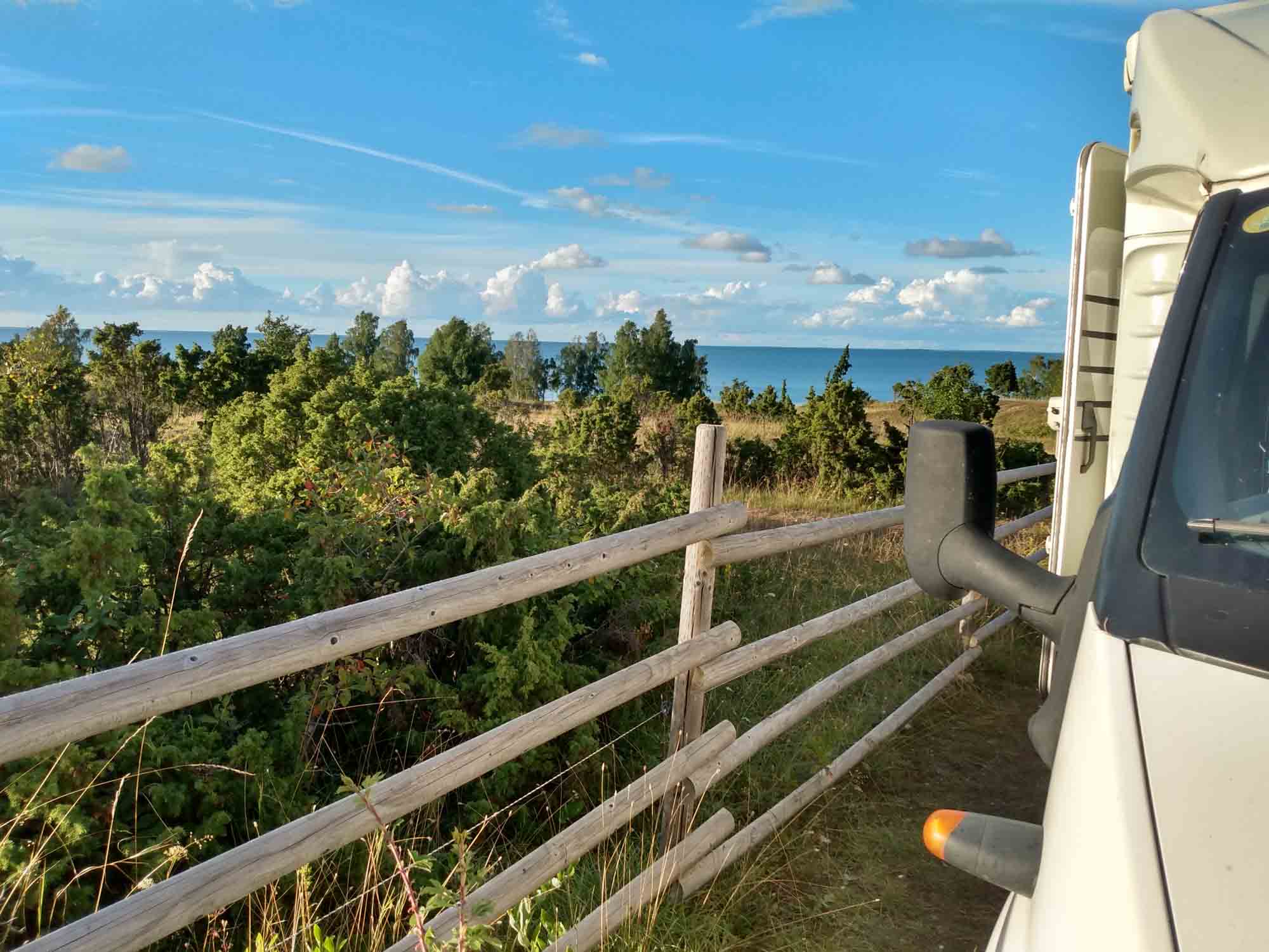 Die erste Fahrt war nur sehr kurz. Weniger als 10 Minuten brauchten wir bis zu unserer ersten kleinen Wanderung, einem Waldlehrpfad in den Dünen und am Strand der Ostsee bei Kabli. Es war zwar alles auf estnisch, aber die Wege waren kurz und so hatten wir einen wunderbaren Morgenspaziergang und bekamen von einem Aussichtpunkt aus noch einen guten Blick über die natürliche Küstenlandschaft. Weiter ging es nach Pärnu, einem hübschen kleinen Örtchen mit gut erhaltenen Holzhäusern und einer gemütlichen ruhigen Einkaufsstraße, der Rüütli. Dort schlenderten wir eine Weile, bevor wir uns auf den Weg zur Fähre in Virtsu machten, die uns zur Insel Muhu bringen sollte. Etliche entgegenkommende Fahrzeuge bedeuteten für uns, dass gerade eine Fähre angekommen war und tatsächlich war die Fähre noch am Ausladen als wir an erster Stelle in der Wartespur 7 anhielten. Dann legte die Fähre jedoch für uns unerwartet wieder ab und machte sich ohne uns auf den Weg zur Insel. Gleichzeitig legte jedoch eine weitere Fähre an. Und als auch alle Fahrzeuge raus waren, durften wir als letzte Reihe auf die Fähre fahren. 30 Minuten später waren wir auf der anderen Seite. Und wie wir immer sagen: Es kommt nicht darauf an, wer als erster auf die Fähre fährt, sondern darauf, wer als erster wieder herunterfahren darf. Und das war unsere Reihe. Wir hatten es auch nicht mehr weit. Nachdem aber leider unserer erster Stellplatz, der wunderbar einsam direkt am Strand gewesen wäre, bereits besetzt war, fuhren wir zu den Üügu-Klippen, um sie zu besichtigen und auch dort zu übernachten.