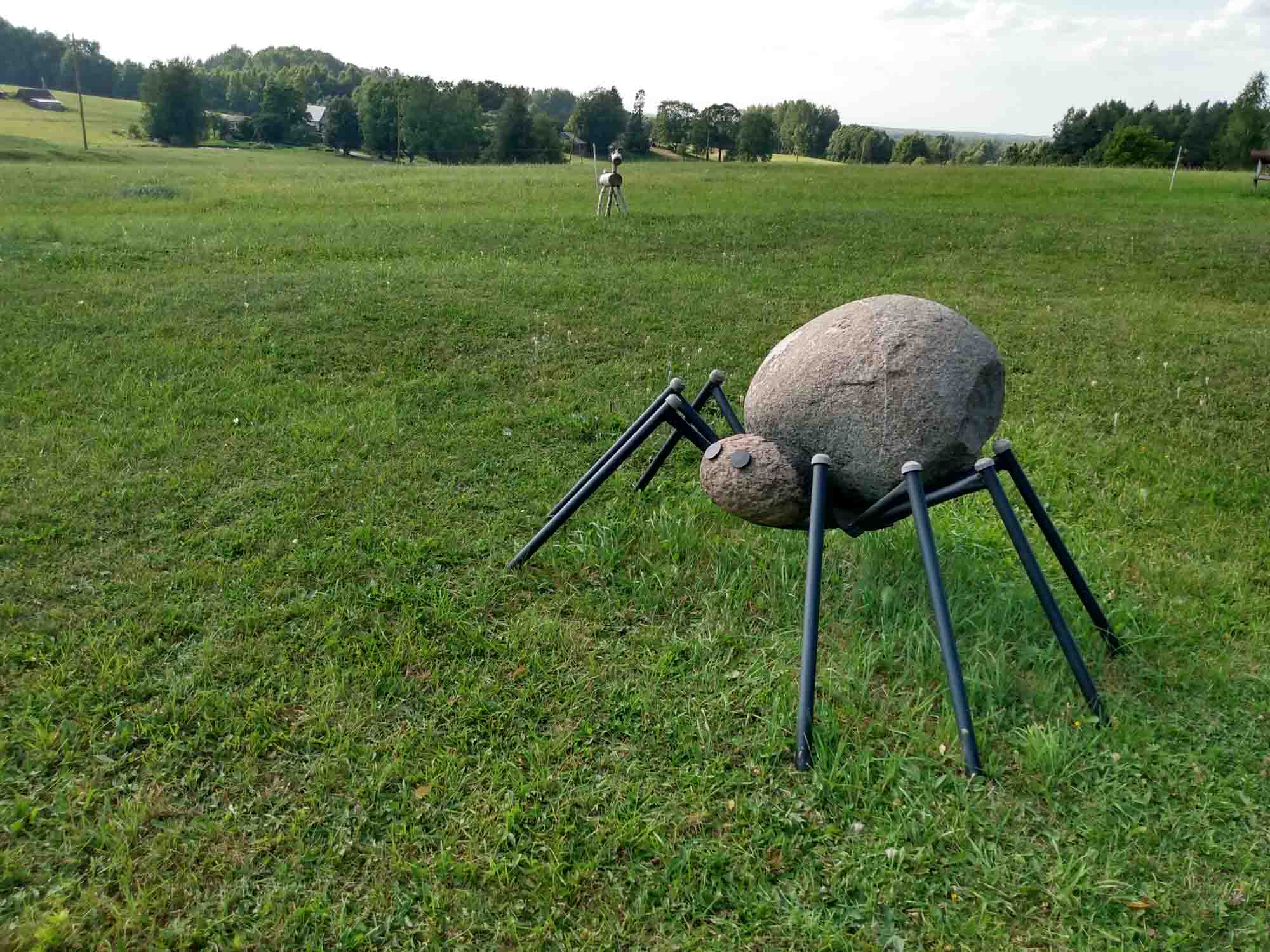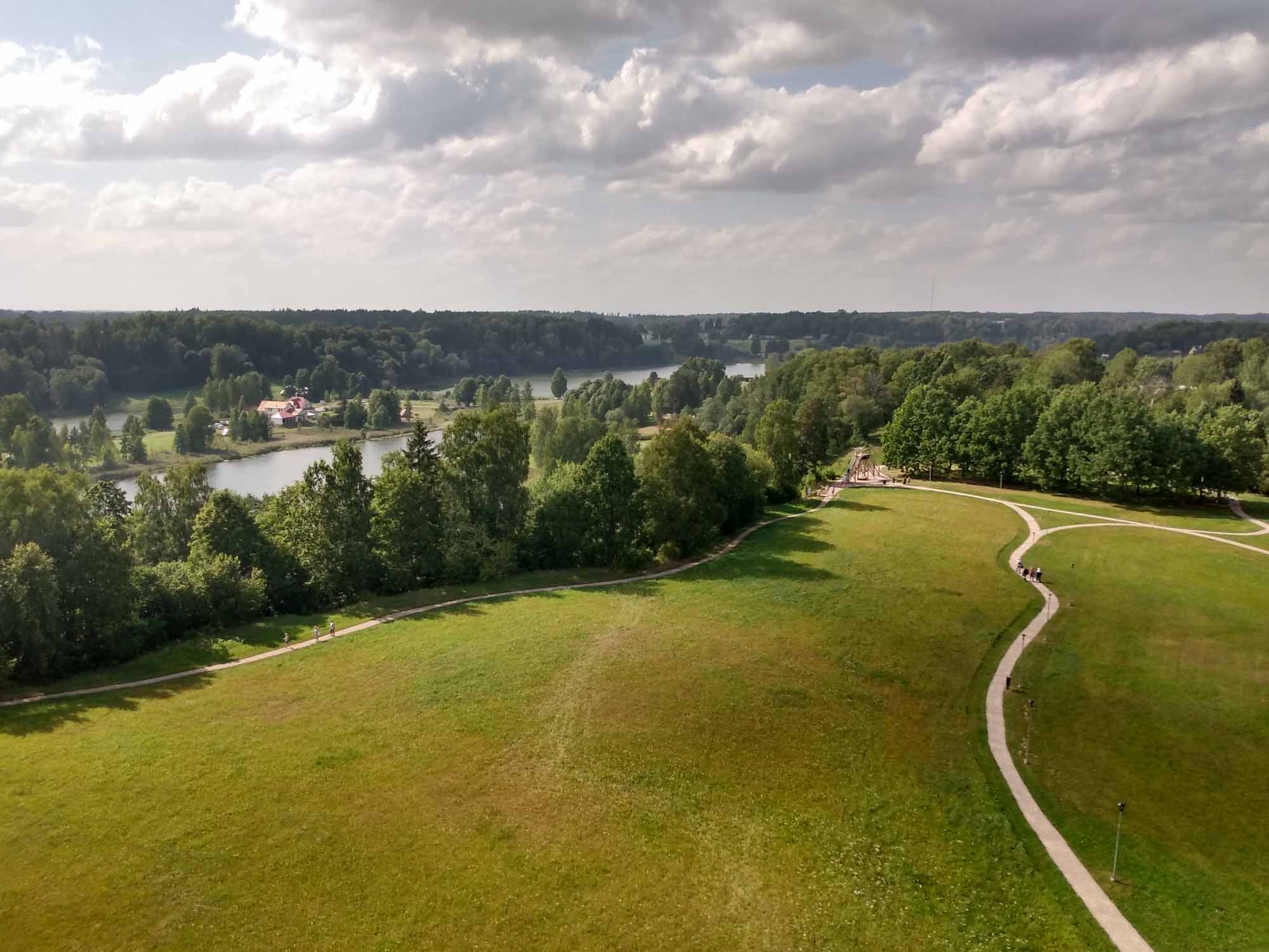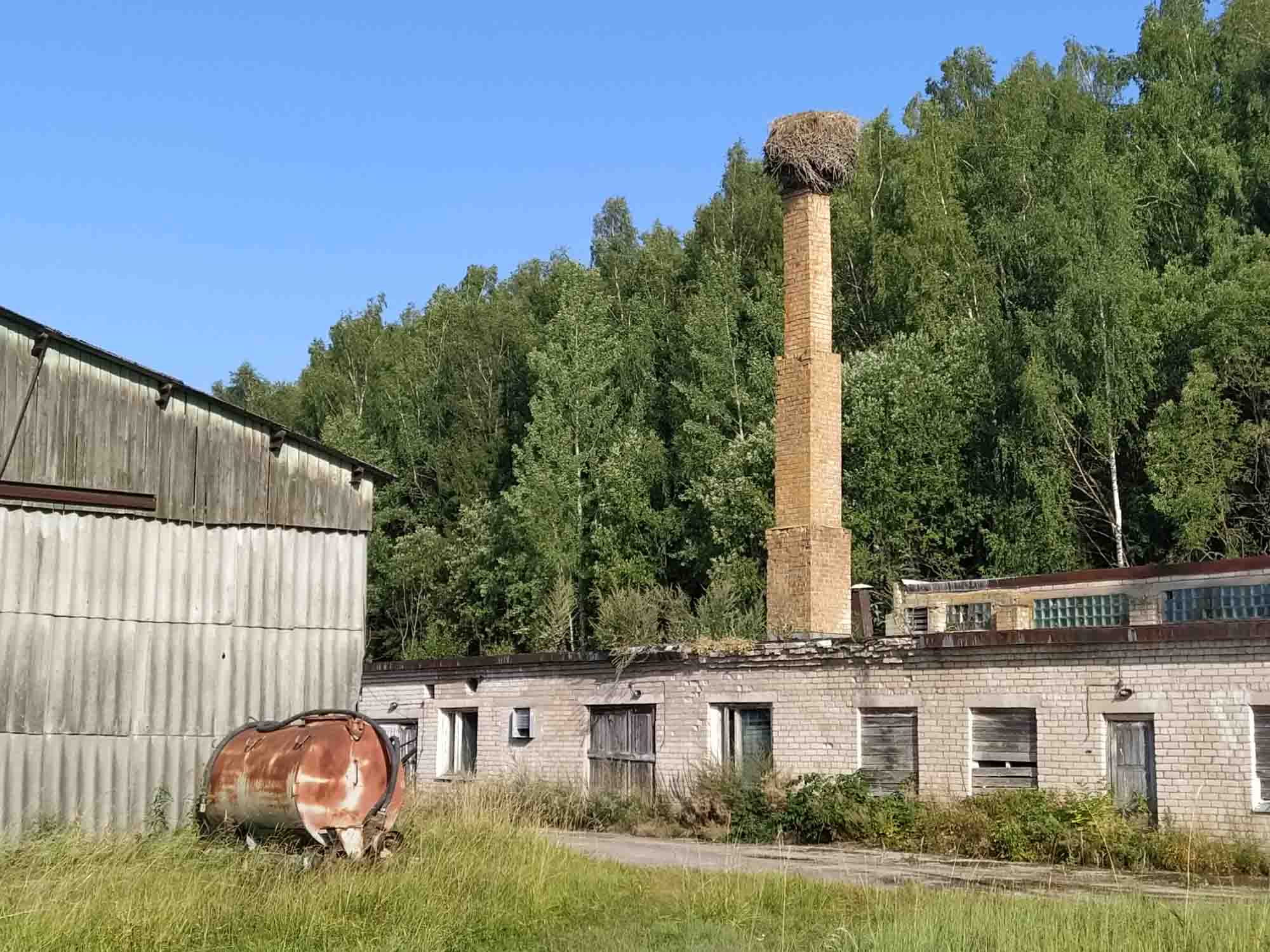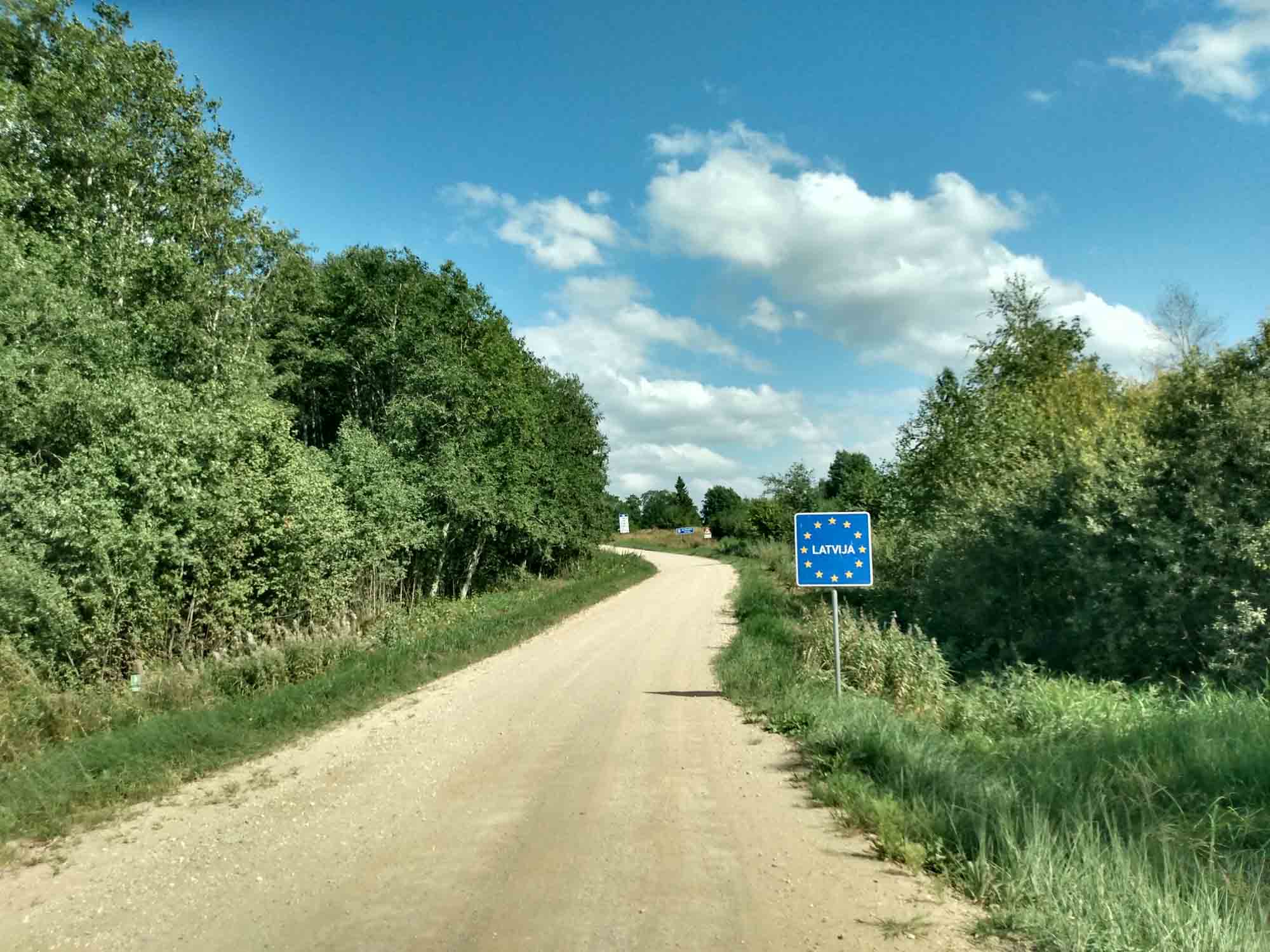 Noch ein letzter Spaziergang, dann verabschiedeten wir uns von dem Platz, der schon fast so etwas wie Heimat geworden war. Allerdings mussten wir vorher erst noch den Wagen gründlich vom feinen schwarzen Staub reinigen, der sich in den letzten Tagen auf dem Fußboden angesammelt hatte. Aber dann ging es los, zunächst nach Tartu, wo wir Frischwasser tankten und erstmal einkaufen gingen. Dann ging es weiter durch den estnischen Wald nach Rõuge zu einer Aussichtsplattform in der Form von einem Storchennest. Viel zu sehen gab es hier nicht, aber die Plattform selbst war eindrucksvoll genug. Über Krabi fuhren wir auf der 108 wieder nach Lettland. Das diese Straße eine Nummer hatte, war schon überraschend, war es doch nicht mehr als ein sandiger Feldweg. Entsprechend überschaubar stellte sich auch die Grenze dar. Zwei Schilder am rechten Sandwegrand, eines mit dem Europazeichen und dem Schriftzug "Latvia" und ein weiteres mit den Geschwindigkeitsbegrenzungen. Dann waren wir wieder in Lettland. Hinter dem nächsten Hügel wartete aber noch eine kleine Überraschung auf uns: Eine freundliche Dame vom Grenzschutz wartete vermutlich schon den ganzen Tag auf ein Auto, dass sie kontrollieren konnte und da waren wir. Freundlich bat sie uns, etwas ins Gras zu fahren und hinter ihrem Wagen anzuhalten. "Ausweis, Führerschein, Fahrzeugpapiere und Versicherungsnachweis," sagte die junge Frau. "Versicherungsnachweis?" überlegten wir, "was für ein Versicherungsnachweis?" "Die grüne Versicherungskarte," kam die Antwort bevor wir fragen konnten. Fragte sich nur, wo die war. Sie fand sich zum Glück ohne großes Suchen bei unseren restlichen Unterlagen zum Wohnmobil und dann verschwand sie mit allen Ausweisen in ihrem Van. Nach kurzer Zeit kam sie zurück, wünschte uns eine gute Fahrt und wir konnten weiter. Nach zwei Kilometern ließen wir einen Wagen passieren, wie wir es öfter mal tun, wenn die Straße schlecht ist und wir entsprechend langsam unterwegs sind. Es war die Polizistin, die jetzt wohl Feierabend gemacht hatte und sich mit der Warnblinkanlage für das Vorbeilassen bedankte. In Kometi fanden wir zufällig eine Entsorgungsstation, wo wir das verbrauchte Wasser ordnungsgemäß entsorgen konnten. Danach wanderten wir noch auf den mit 247 m MSL höchsten Hügel von Veclaicene, wie die Landschaft hier heißt, von dem aus wir bis nach Estland sehen konnten und zu einem "Burgberg", auf dem sehr vielleicht mal eine Burg gestanden haben könnte. Eigentlich war er dazu viel zu klein und irgendwelche Reste einer Burg waren auch nicht zu sehen. Aber das eigentliche Highlight kam erst noch. Auf der Herfahrt, waren wir an einem Spielplatz vorbeigekommen, dessen Parkplatz uns für eine Übernachtung geeignet erschien. Zumal er direkt am Sandweg lag, der nach Krabi in Estland führt und entsprechend ruhig dürfte es hier sein. Als wir gerade den Platz erkundeten, kam der Besitzer vorbei und fragte uns, ob wir hier übernachten wollten. Als wir das bejahten, lud er uns ein, mit dem Wohnmobil auf die große Rasenfläche des Spielplatzes zu fahren, drückte uns noch ein paar Flyer mit Sehenswürdigkeiten aus der Gegend in die Hand und verschwand dann genaus so schnell wieder, wie er gekommen war. Wir konnten unser Glück kaum fassen. Wir standen jetzt mittem im Grünen, fernab der Straße und kaum mehr zu sehen auf einem Kinderspielplatz. Naturlich ließen wir es uns nicht nehmen, einmal Karrussel zu fahren und die Wippe auszuprobieren. Berta kam bei einem Abendspaziergang durch den benachbarten leerstehenden Bauernhof auch noch auf ihre Kosten. Auf einem der Schornsteine hatte ein Stochenpaar ein großes Nest gebaut aus dem ein Storch erst auf uns herunterblickte und dann zum Abendessen ausflog.