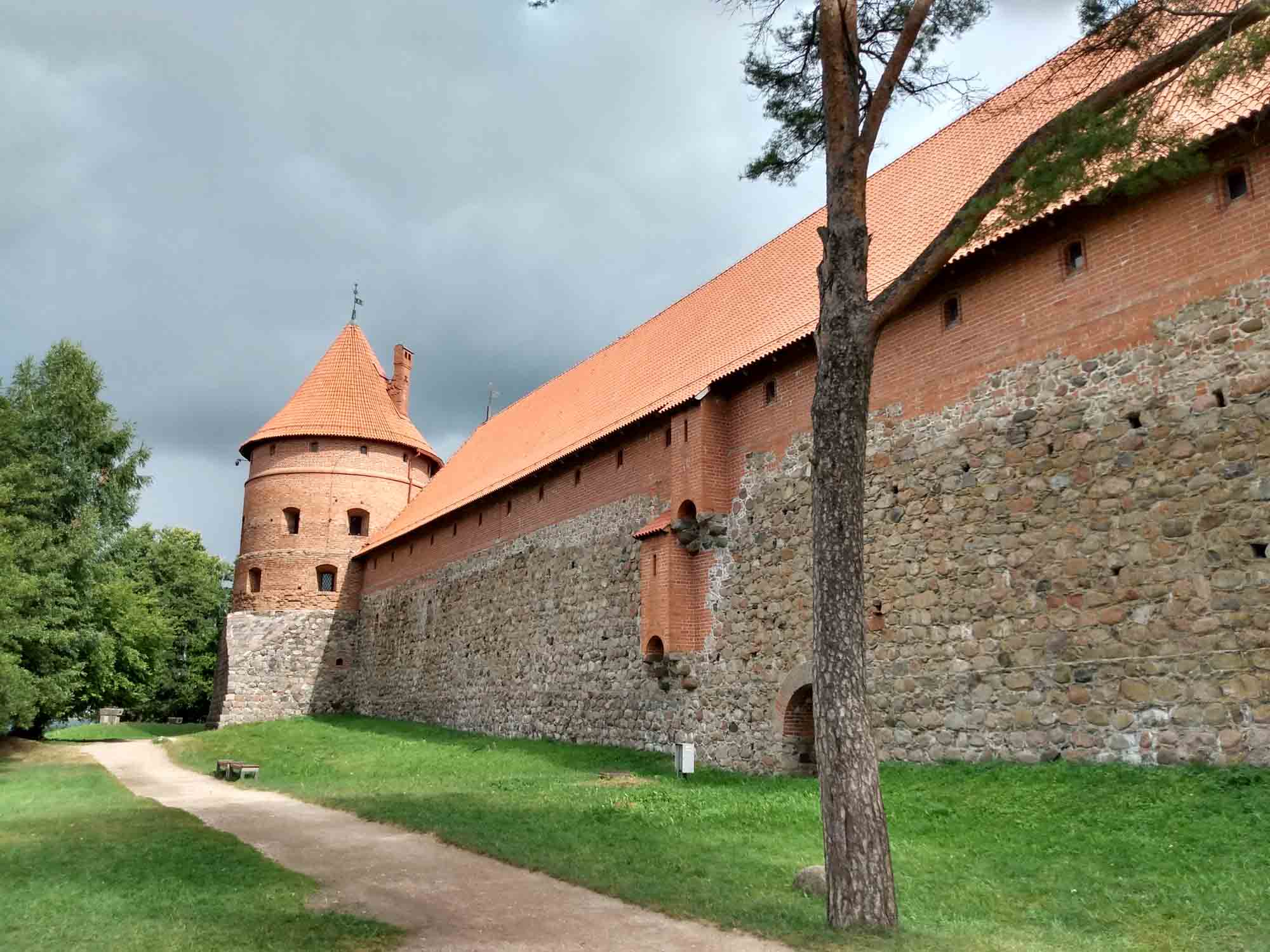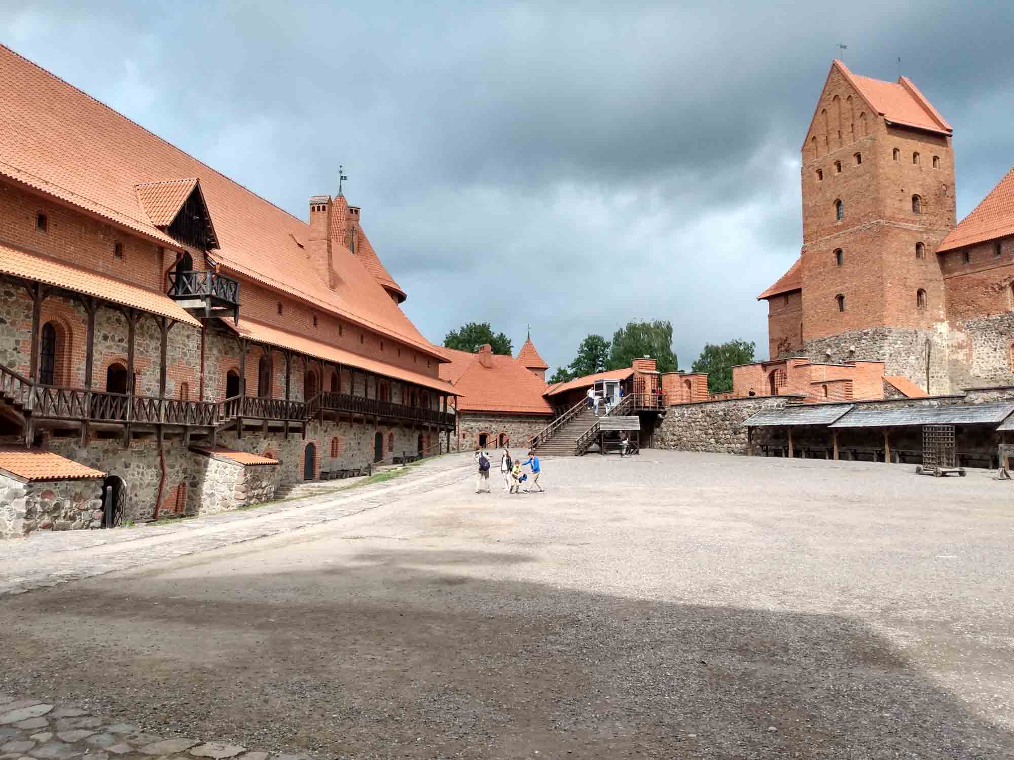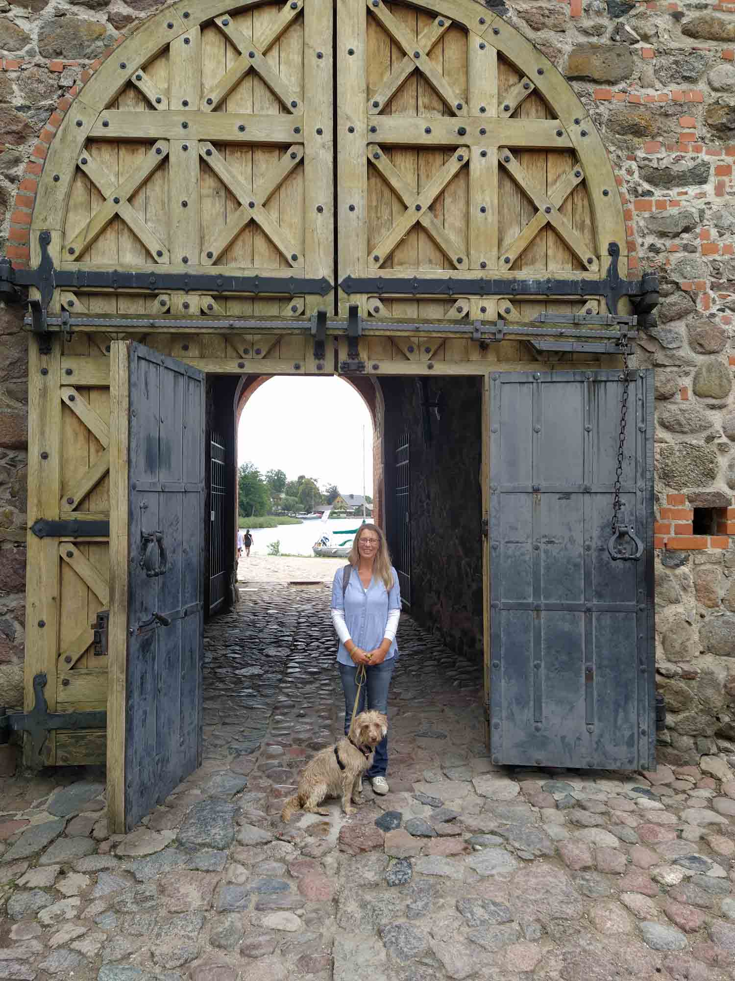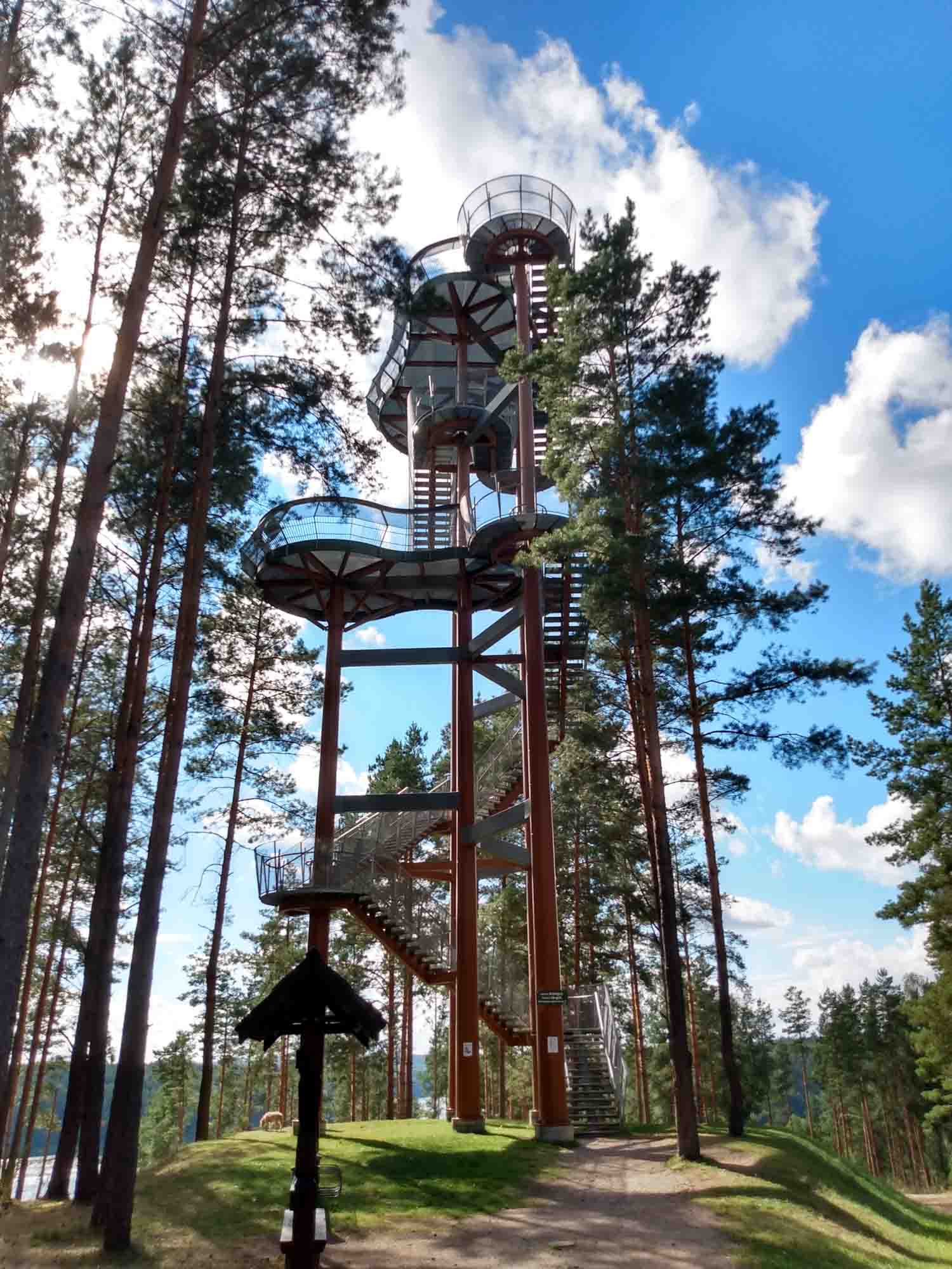 An dem Waldparkplatz, auf dem wir übernachtet hatten, ging zufällig ein 2,5 km langer Waldlehrpfad los, der die perfekte Morgenrunde war. Der Weg ging die meiste Zeit über Holzplanken und führte erst durch den dichten Kiefernwald, dann durch ein Moor und schließlich zwischen zwei Seen hindurch. Und alles noch vor dem Frühstück. Da es danach zu regnen begann, ließen wir es langsam angehen und kamen erst kurz vor Mittag los. Dafür schien dann auch schon wieder die Sonne. Unser erstes Ziel war die Wasserburg in Trakai. Im Ort bekamen wir den vermutlich einzigen kostenlosen Parkplatz, den es in dem hübschen, vorwiegend aus Holzhäusern bestehenden Ort gab. Die Wasserburg war ziemlich gut erhalten. Da Berta nicht mit hinein durfte, verzichten wir auf eine Besichtigung und gingen nur einmal um die Burg herum. Zu schade, dass es auch für die Drohne zu windig war. Danach fuhren wir nach Merkine. Unterwegs gab es mal wieder ein wenig Schotter. Aber die 18 km waren schnell vorbei. Merkine ist die älteste Siedlung in Littauen, wobei dies der Ortschaft nicht anzusehen ist. Es sind die gleichen Holzhäuser wie es sie überall im Land gibt. Aber es gibt dort einen Aussichtsturm, von dem man einen tollen Blick auf die Memel hat. Das Highlight des Tages war der Grūtas-Park. Hier sind die bereits 1991 abgebauten sowjetischen Denkmäler gesammelt worden. Zu dem Park gehören auch einige kleinere Museen sowie ein Tierpark. Obwohl Hunde im Park verboten sind, durfte Berta gegen Zahlung des Eintrittspreises für ein Kind mit hinein. Sie hatte viel Spaß mit den Tieren. Am meisten interessierte sie sich für die Emus. Aber auch die Strauße, Kängeruhs, Kaninichen, Schafe, Ziegen und Bären beäugte sie neugierig. Die Tiere waren genauso neugierig und kamen zum Zaun gelaufen, um Berta anzuschauen. Der Park war viel größer als der Memento-Park bei Budapest aber die Symbolik natürlich die gleiche. Lenin schien die Lieblingsskulptur gewesen zu sein. Aber auch Marx und Engels fehlten natürlich nicht. Nachdem alle Fotos geschossen waren fuhren wir nach Druskininkai zum Einkaufen und danach zum nächstgelegenen See. Es war spät geworden und wir freuten uns auf eine leckere Würstchenpfanne.