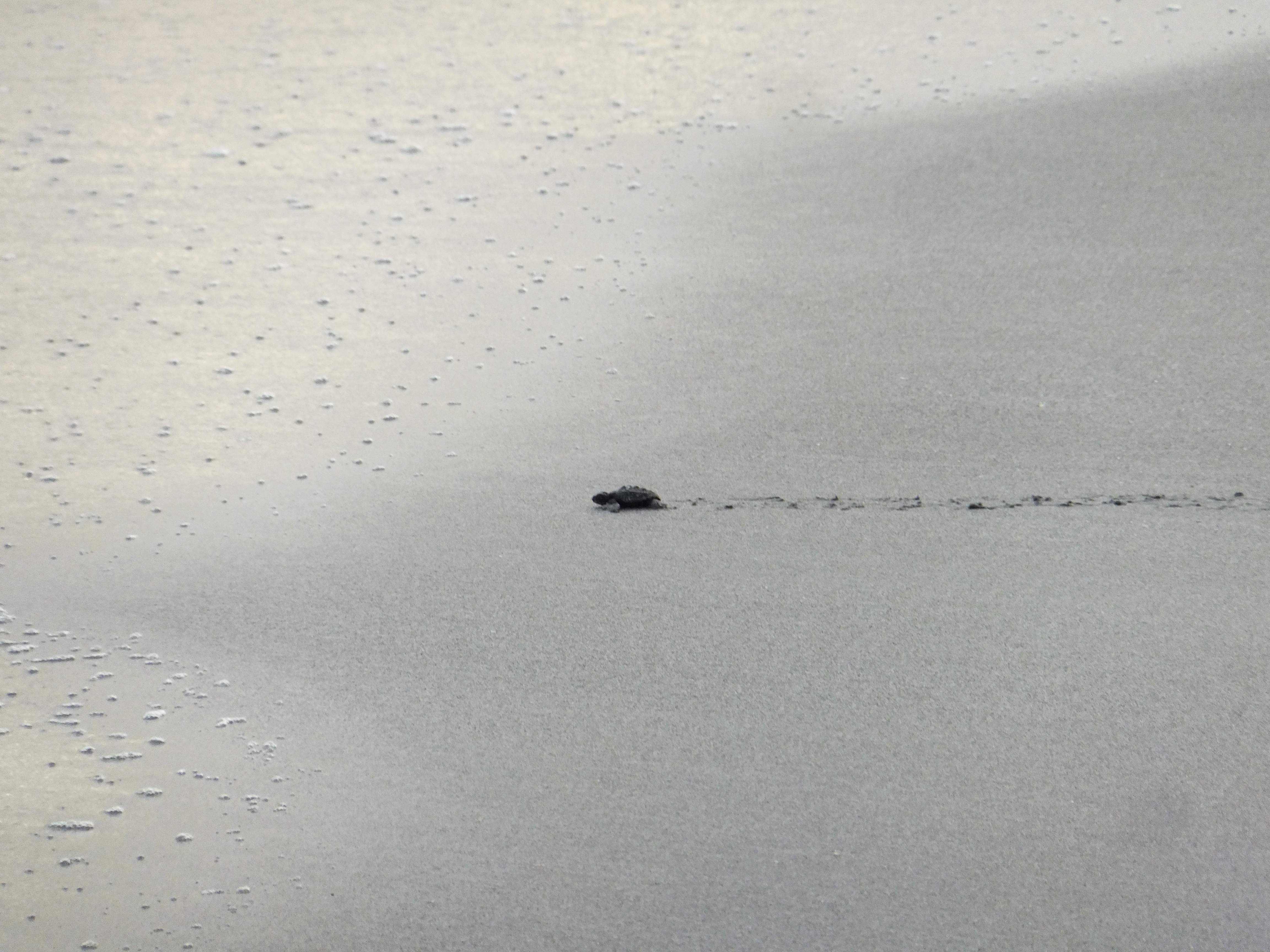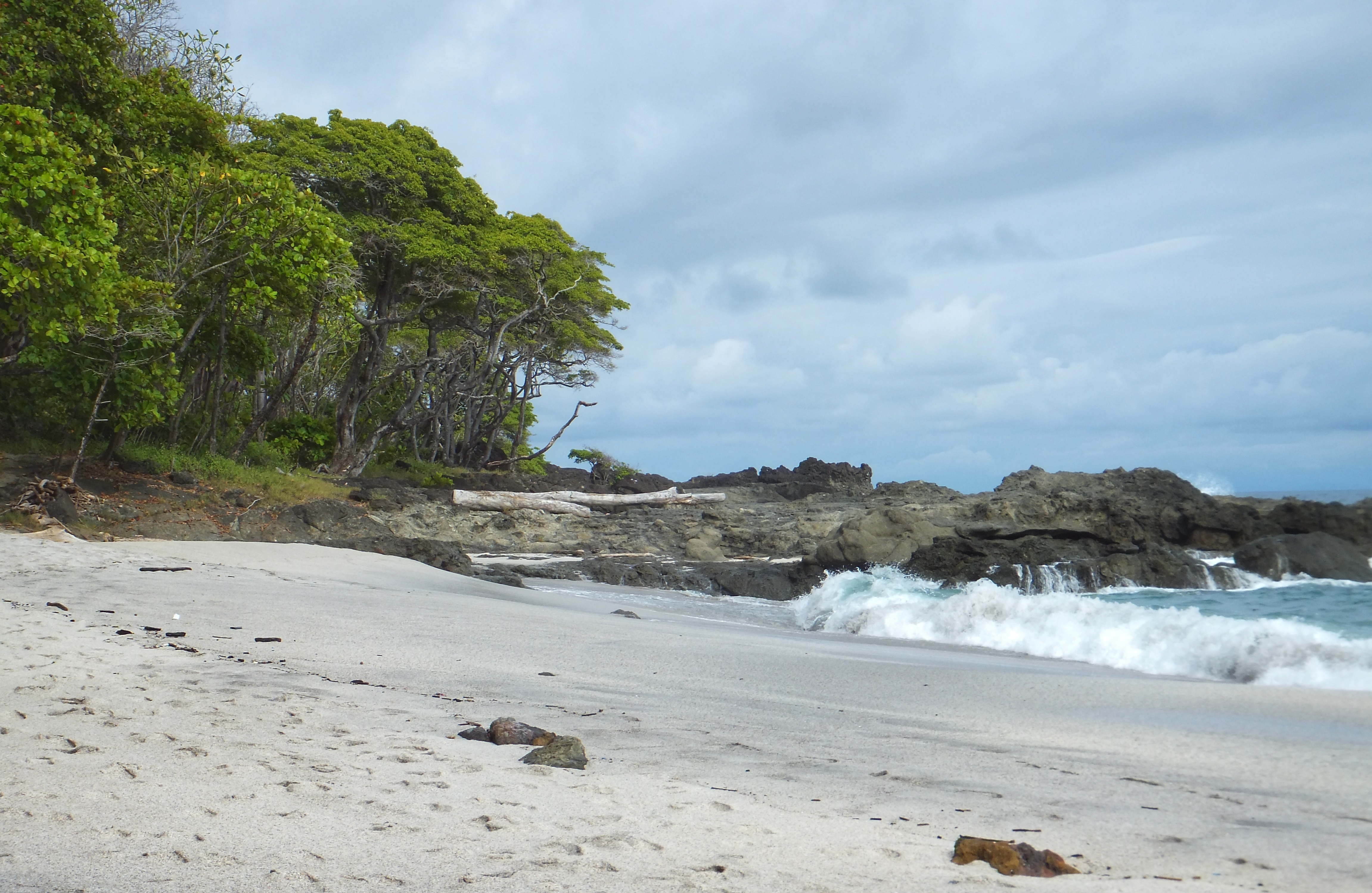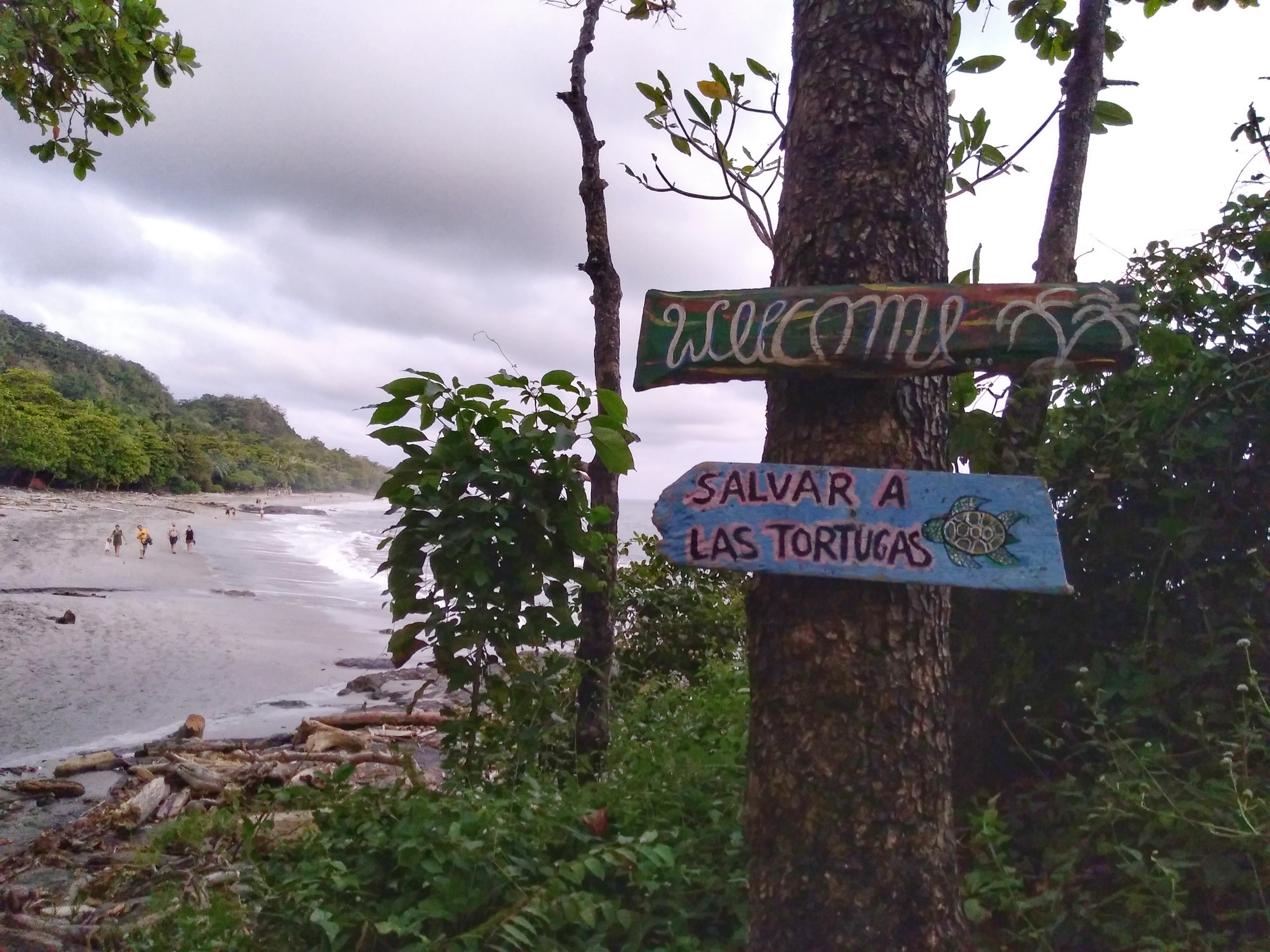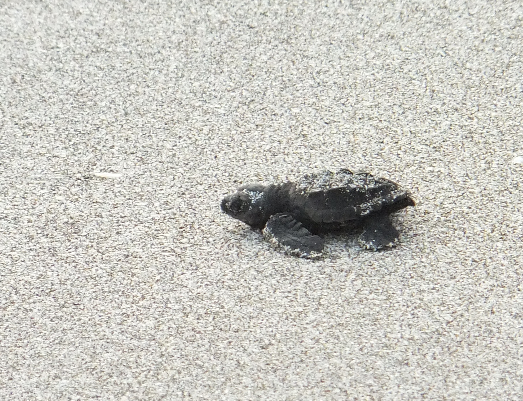 Wir ließen es heute ruhig angehen und fuhren erst um 14:00 Uhr nach Montezuma. Dort ließen wir den Wagen stehen und spazierten auf dem breiten Sandstrand Playa de Montezuma nach Norden. Nach einer Weile fanden wir ein paar Liegen, setzen uns und schauten einer Familie beim Toben in den Wellen zu. Dann endeckten wir eine Hängematte und legten uns dort hinein. Kurze Zeit später kletterte ein Leguan an dem Baum neben uns herunter und begann dann die Blätter von den Pflanzen neben unserer Hängematte zu essen. Wir blieben ganz ruhig und schauten ihm eine Weile zu. Als er satt und auf den Baum zurückgeklettert war gingen wir weiter. Immer in Strandnähe durchquerten wir einen Teil eines Nationalparks. Der Trail war auch mit unseren Flip-Flops kein Problem. Am nächsten Strand waren zahlreiche Steinfiguren aufgebaut und auf den Felsen hatten sich zahlreiche Pelikane niedergelassen. Wieder ging es durch den Park bis zum nächsten Strand. Es war schon spät geworden und die Sonne ging bald unter. Da wir nicht im Dunklen den Weg zurückgehen wollten, gingen wir nicht mehr weiter. Unser Ziel war eigentlich der Playa Grande, an dem wir mit etwas Glück hätten Schildkröten sehen können. Wir kehrten um. Als wir wieder am Playa de Montezuma ankamen, entdeckten wir eine größere Menschenansammlung. Wir gingen dorthin und kaum dass wir ankamen, krabbelten auch schon die ersten Babyschildkröten in Richtung Meer. Hier gibt es eine Schutzstation und wir hatten das Glück, frisch geschlüpfte Lederschildkröten auf ihren ersten Schritten sehen zu können. Als alle Schildkröten im Wasser waren löste sich die Versammlung auf und auch wir gingen nach Montezuma zurück, wo wir uns in einem Grillrestaurant einen großen Red Snapper und zwei Pina Coladas bestellten. Leider verunglückte die Zubereitung des Fischs: Erst war er innen noch roh und beim zweiten Versuch war er einfach nur trocken. Schade um den Fisch. Zum Ausgleich bot uns die Besitzerin des Restaurants zwei weitere Cocktails an (und natürlich mussten wir auch die Fisch nicht voll bezahlen). Ihr Mann – ein Franzose – brachte uns dann noch eine von ihm zubereite Spezialität, eine Leberpatée, die ganz ausgezeichnet war. Wir unterhielten uns noch ein Weilchen mit der Besitzerin, bevor wir uns auf den Heimweg machten.