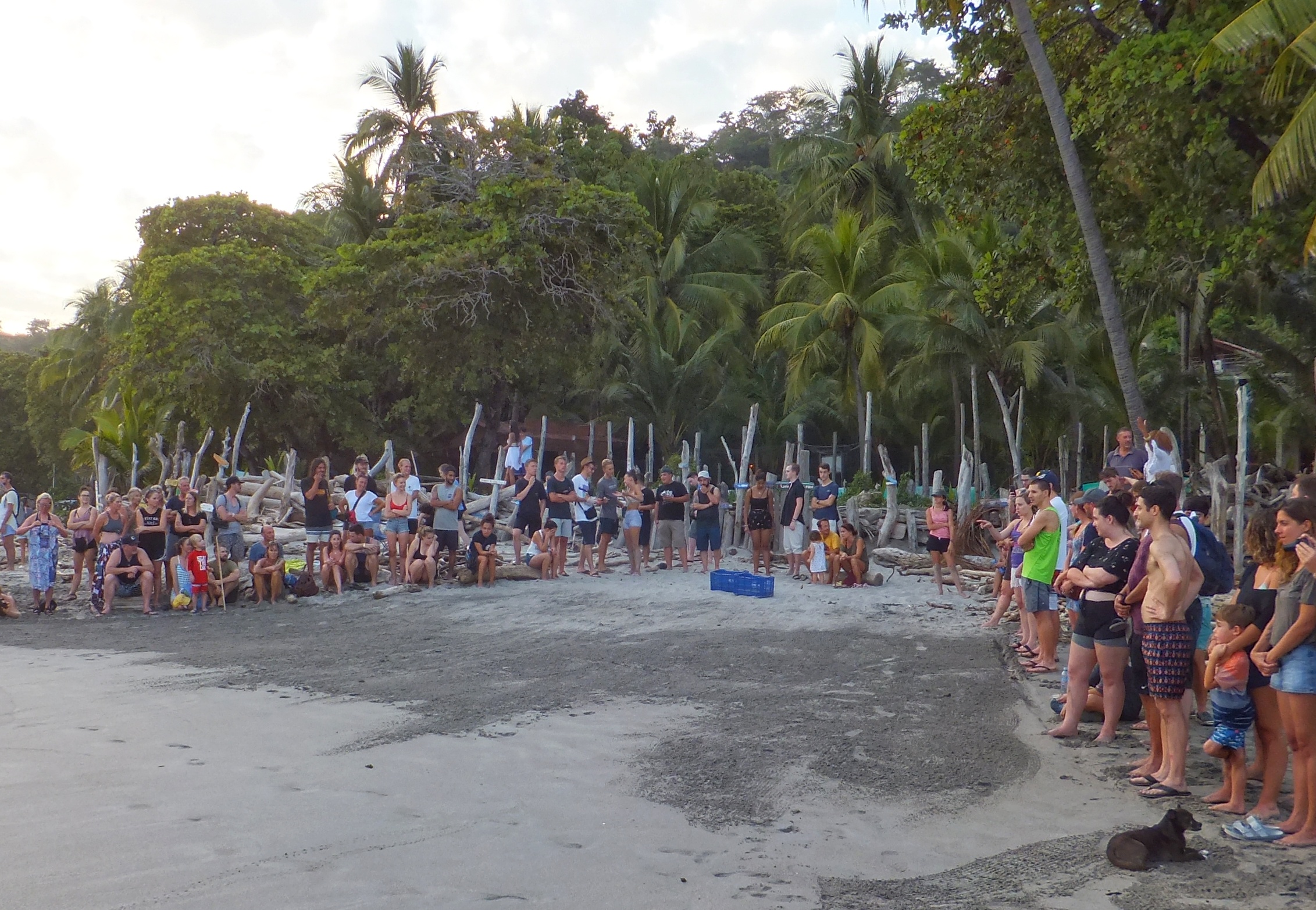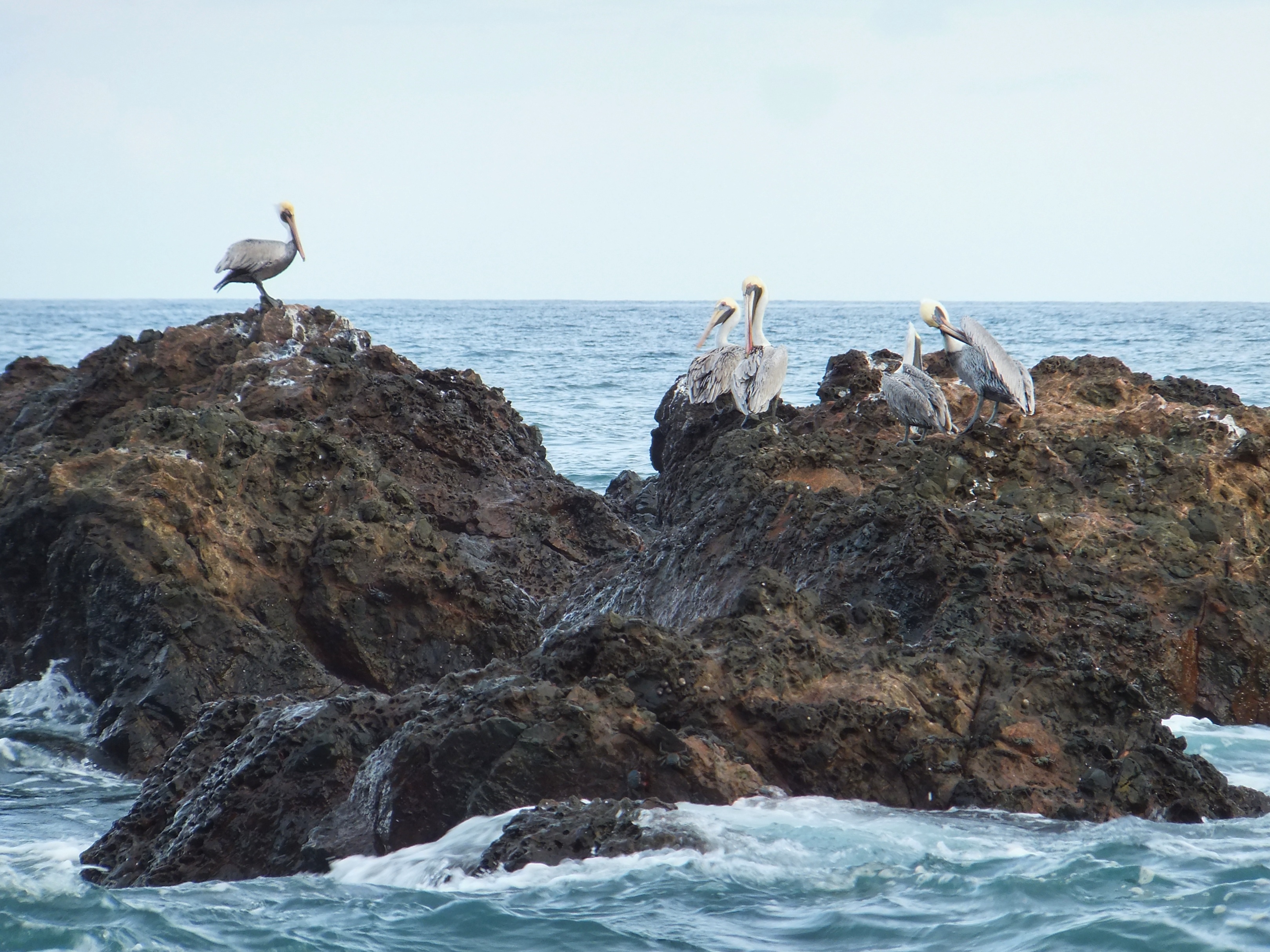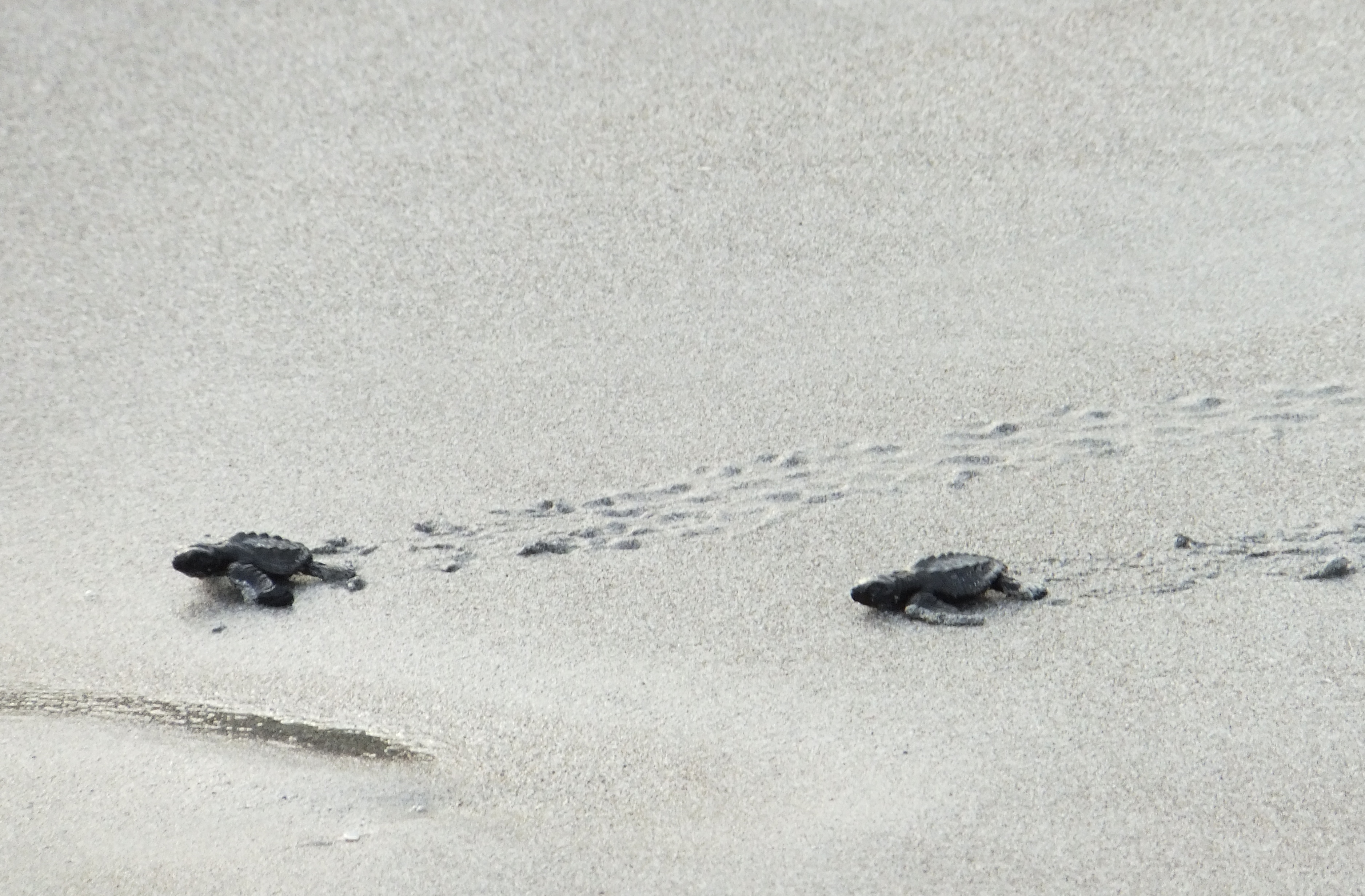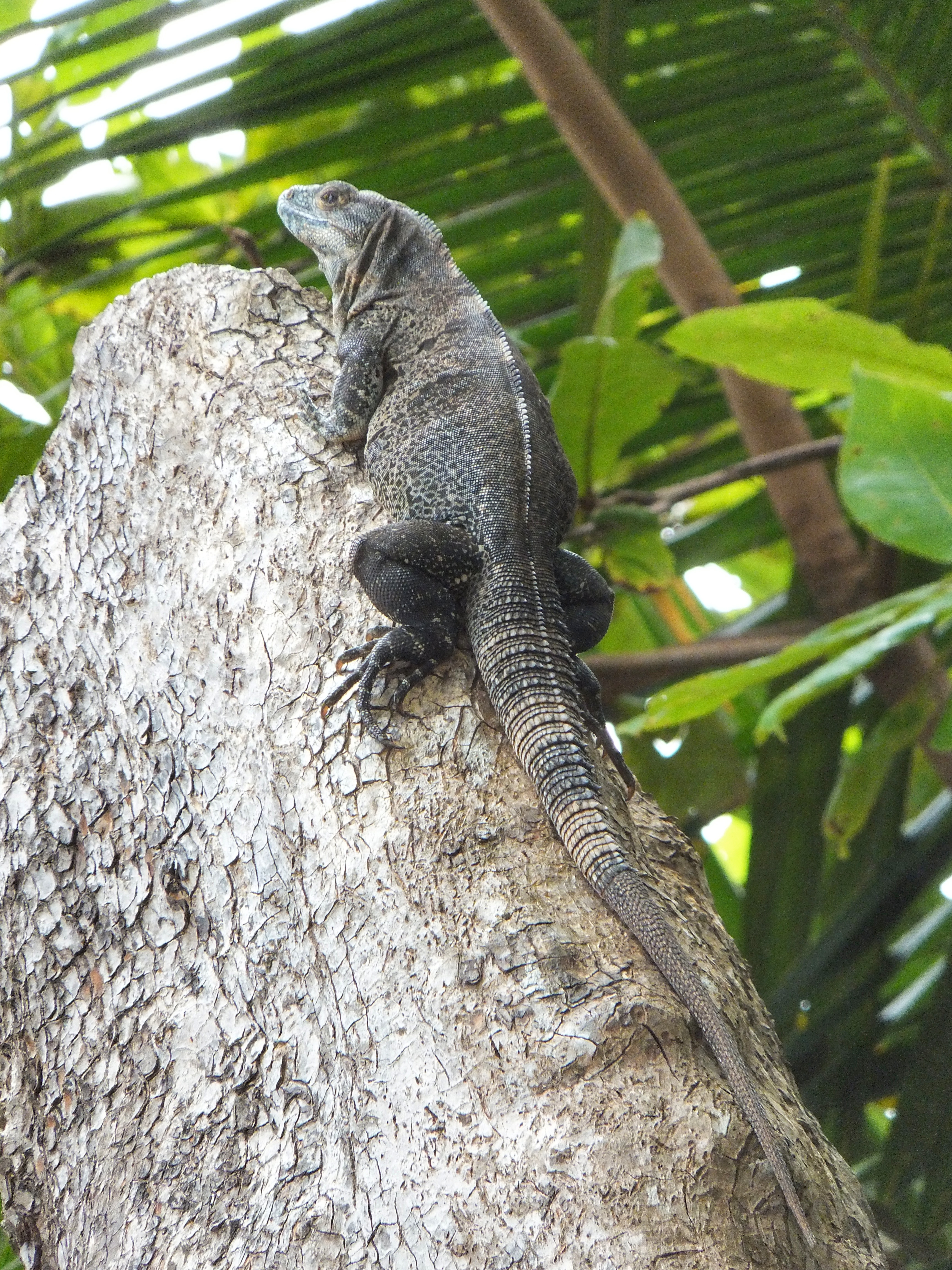 Wir ließen es heute ruhig angehen und fuhren erst um 14:00 Uhr nach Montezuma. Dort ließen wir den Wagen stehen und spazierten auf dem breiten Sandstrand Playa de Montezuma nach Norden. Nach einer Weile fanden wir ein paar Liegen, setzen uns und schauten einer Familie beim Toben in den Wellen zu. Dann endeckten wir eine Hängematte und legten uns dort hinein. Kurze Zeit später kletterte ein Leguan an dem Baum neben uns herunter und begann dann die Blätter von den Pflanzen neben unserer Hängematte zu essen. Wir blieben ganz ruhig und schauten ihm eine Weile zu. Als er satt und auf den Baum zurückgeklettert war gingen wir weiter. Immer in Strandnähe durchquerten wir einen Teil eines Nationalparks. Der Trail war auch mit unseren Flip-Flops kein Problem. Am nächsten Strand waren zahlreiche Steinfiguren aufgebaut und auf den Felsen hatten sich zahlreiche Pelikane niedergelassen. Wieder ging es durch den Park bis zum nächsten Strand. Es war schon spät geworden und die Sonne ging bald unter. Da wir nicht im Dunklen den Weg zurückgehen wollten, gingen wir nicht mehr weiter. Unser Ziel war eigentlich der Playa Grande, an dem wir mit etwas Glück hätten Schildkröten sehen können. Wir kehrten um. Als wir wieder am Playa de Montezuma ankamen, entdeckten wir eine größere Menschenansammlung. Wir gingen dorthin und kaum dass wir ankamen, krabbelten auch schon die ersten Babyschildkröten in Richtung Meer. Hier gibt es eine Schutzstation und wir hatten das Glück, frisch geschlüpfte Lederschildkröten auf ihren ersten Schritten sehen zu können. Als alle Schildkröten im Wasser waren löste sich die Versammlung auf und auch wir gingen nach Montezuma zurück, wo wir uns in einem Grillrestaurant einen großen Red Snapper und zwei Pina Coladas bestellten. Leider verunglückte die Zubereitung des Fischs: Erst war er innen noch roh und beim zweiten Versuch war er einfach nur trocken. Schade um den Fisch. Zum Ausgleich bot uns die Besitzerin des Restaurants zwei weitere Cocktails an (und natürlich mussten wir auch die Fisch nicht voll bezahlen). Ihr Mann – ein Franzose – brachte uns dann noch eine von ihm zubereite Spezialität, eine Leberpatée, die ganz ausgezeichnet war. Wir unterhielten uns noch ein Weilchen mit der Besitzerin, bevor wir uns auf den Heimweg machten.
