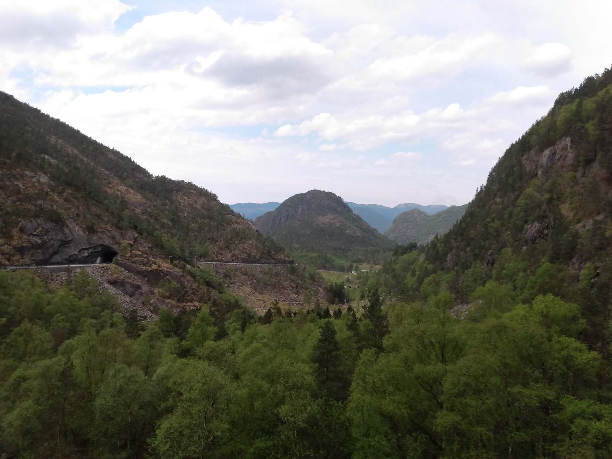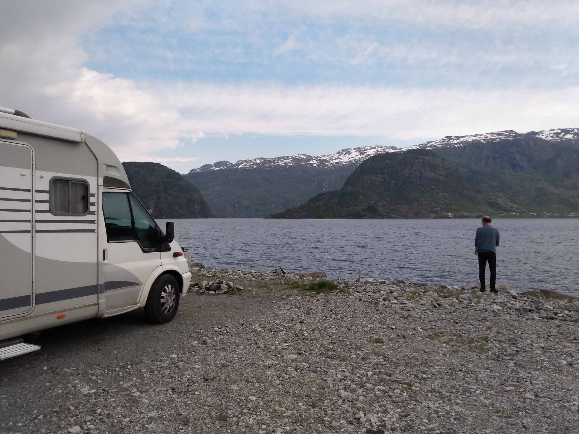 Nachdem wir ausgeschlafen, einen Spaziergang gemacht und gefrühstückt hatten, fuhren wir der Landschaftsroute Ryfylke folgend auf der N13 in Richtung Norden. Hier wechselten sich Kulturlandschaft, Fjorde und Berge ab. Von Hjelmeland nach Nesvik nahmen wir die Fähre, die gerade auf uns gewartet hatte. Kaum waren wir auf der Fähre, schlossen sich hinter uns die Tore und es ging los. Völlig geräuschlos und ohne jede Vibration brachte sie uns von Brennstoffzellen angetrieben in 13 Minuten über den Boknafjorden. Wir folgten weiter der N13 am Fjord entlang. Weiter ging es über Erfjord und Sand zur Suldalsporten, wo sich ein kleiner See zwischen zwei Bergen hindurchzuzwängen scheint. Kurz danach fanden wir bei Solheimsvik ein hübsches Plätzchen direkt am Wasser, wo wir uns neben ein weiteres Wohnmobil aus Deutschland stellten. Hier machten wir es uns gemütlich, spielten und bereiteten unser Abendessen zu. Schade nur, dass sich dann ein weiteres Wohnmobil direkt dazwischen quetschen musste. Es blieb aber noch Platz für ein Handtuch, auf dem Berta ihr Abendessen bekam. Zu blöd nur, dass die Dazwischenquetscher auch einen Hund hatten und zudem noch direkt bei Berta anhielten, um sich darüber lustig zu machen, wie sie sichtlich aufgeregt ihr Essen verteidigte. Aufessen durfte sie dann ungestört im Wohnmobil. Nachdem auch wir gegessen hatten, entschieden wir uns, einen anderen Schlafplatz aufzusuchen und fuhren ein Stück die Straße zurück, die wir gekommen waren und dann in die Berge. Nach 12 km fanden wir einen asphaltierten Platz neben der kleinen Straße, an dem sogar ein Müllcontainer stand. Hier waren wir wieder alleine und ungestört. In der Nacht haben wir sehr schlecht geschlafen. Uns machte beiden der Magen Probleme. So blieben wir auch am nächsten Tag an diesem Platz, um uns ein wenig zu erholen.