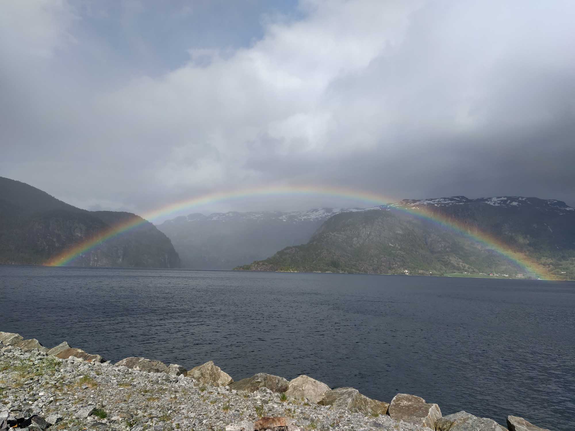 Zum richtig Weiterfahren hatten wir noch keine Lust. Aber ein wenig Abwechslung wollten wir auch. Also versuchten wir es noch einmal auf dem Platz am See. Diesmal stellten wir uns so ans Wasser, dass uns niemand stören würde und genossen die herrliche Aussicht auf den See mit den dahinterliegenden schneebedeckten Bergen. Auch wenn Norwegen vielleicht nicht unser Lieblingsland werden wird, aber irgendwie ist es manchmal auch richtig schön hier.