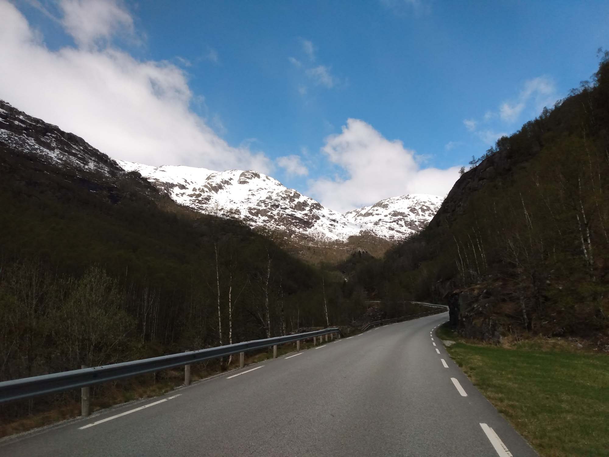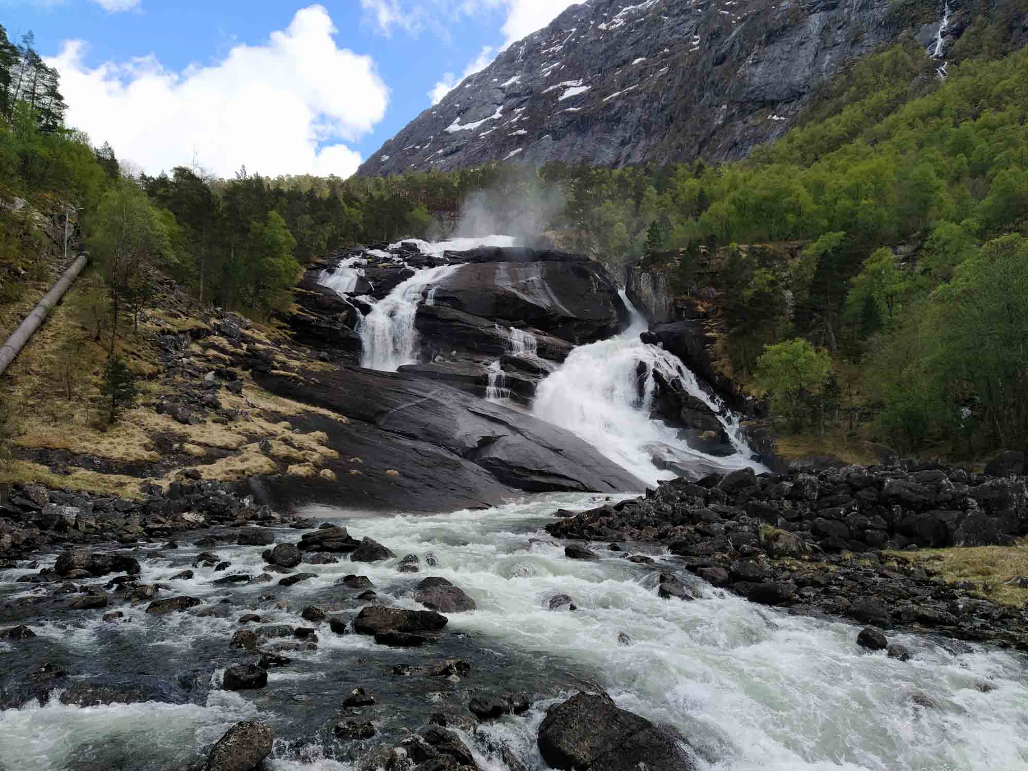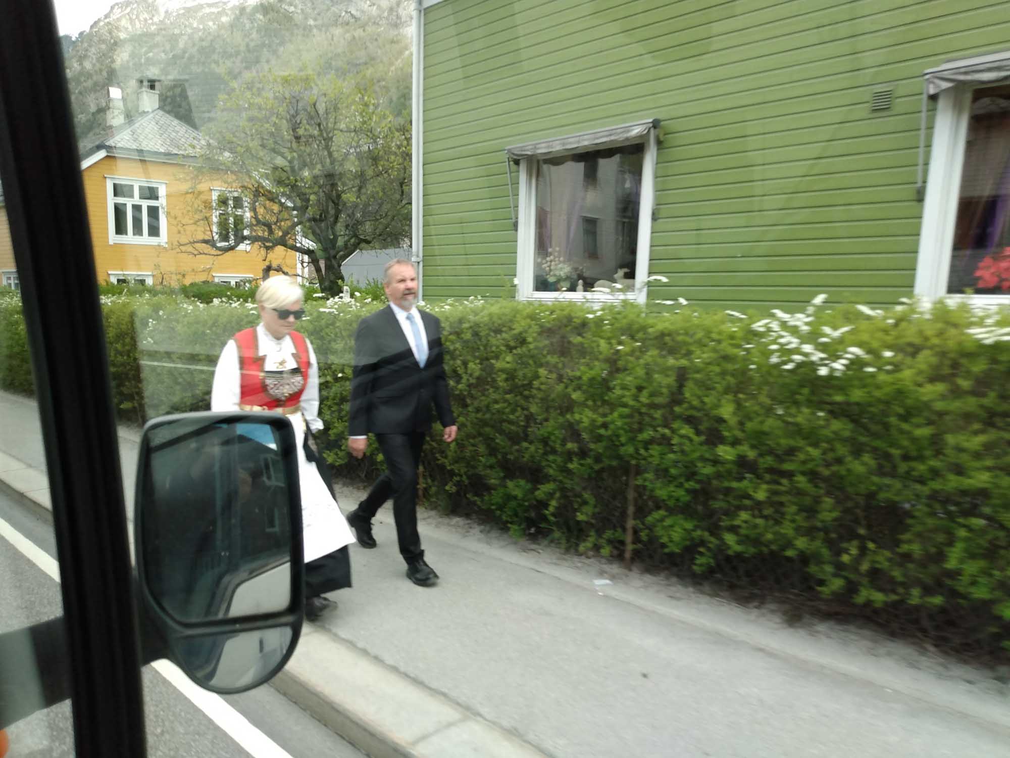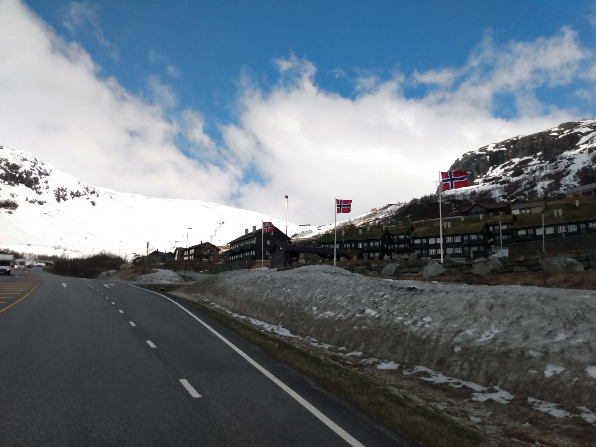 Die Sonne lachte mal wieder. Nachdem wir Berta noch einmal eine Runde über den Platz am Wasser geführt und gefrühstückt haben, fuhren wir weiter der Landschaftsroute Ryfylke folgend bis zum See Raldalsvatnet. Diesen bekamen wir nur kurz zu sehen, weil die Straße entlang des Sees die meiste Zeit durch einen Tunnel führte. Danach folgten wir der E13 nach Nordwesten und kamen immer höher, bis wir uns plötzlich mittem im Schnee in einem Skigebiet wiederfanden. Die Saison war vorbei und die Lifte standen. Aber es wäre immer noch reichlich Schnee für eine Abfahrt da gewesen. Danach ging es schnell wieder abwärts. Am Wasserfall Låtefossen machten wir einen Halt für Fotos und einen Drohnenflug. Das Tal war sehr eng und der Wasserfall ziemlich hoch. Kein Wunder, dass der kleine Parkplatz direkt an der Straße lag. Wir fuhren weiter und erreichten bei Odda einen Seitenarm des Hardangerfjords. Da heute Nationalfeiertag war, scheiterte der Versuch eines Einkaufs kläglich. Alles aber auch wirklich alles war geschlossen. Stattdessen sahen wir viele Norweger, die in Nationaltracht herumliefen. Sie versammelten sich an verschiedenen Plätzen in dem kleinen Ort, um dem Festumzug zuzusehen. Auch wir mussten einen Moment anhalten, um den Musikern und dem nachfolgenden Tross zuzusehen. Danach folgten wir dem Wasser bis nach Kirsavik. Hier fuhren wir ein kleines Stück in das Landesinnere und wanderten von dort zum nächsten Wasserfall, dem Tveitafossen. Wir hätten auch noch 3 weitere Wasserfälle erwandern können, aber das war uns denn doch zu weit. Anschließend ging es mit der Fähre nach Utne, einem kleinen sehr hübschen weißen Dorf, das wir uns aber lediglich im Vorbeifahren ansahen. Weiter ging es jetzt am Hardangerfjord entlang auf einer kleinen einspurigen Straße bis kurz hinter Jondal, wo wir morgen die Fähre nehmen würden. Den Stellplatz, den wir uns ausgesucht hatten, erreichten wir leider nicht. 150 m vor dem Parkplatz war ein Schild, dass auf eine private Mautstraße hinwies. Bezahlen konnte man nur mit Bargeld. Und das hatten wir nicht, da in Norwegen ansonsten alles mit Karte bezahlt wird. Aber es fand es sich ein Parkplatz entlang der wenig befahrenen Straße, der uns für eine Nacht völlig genügte.