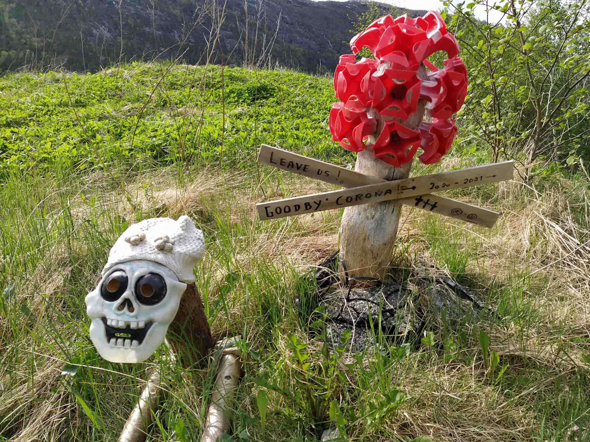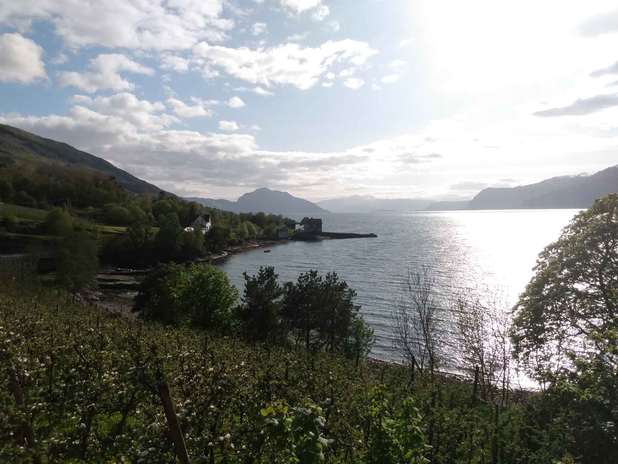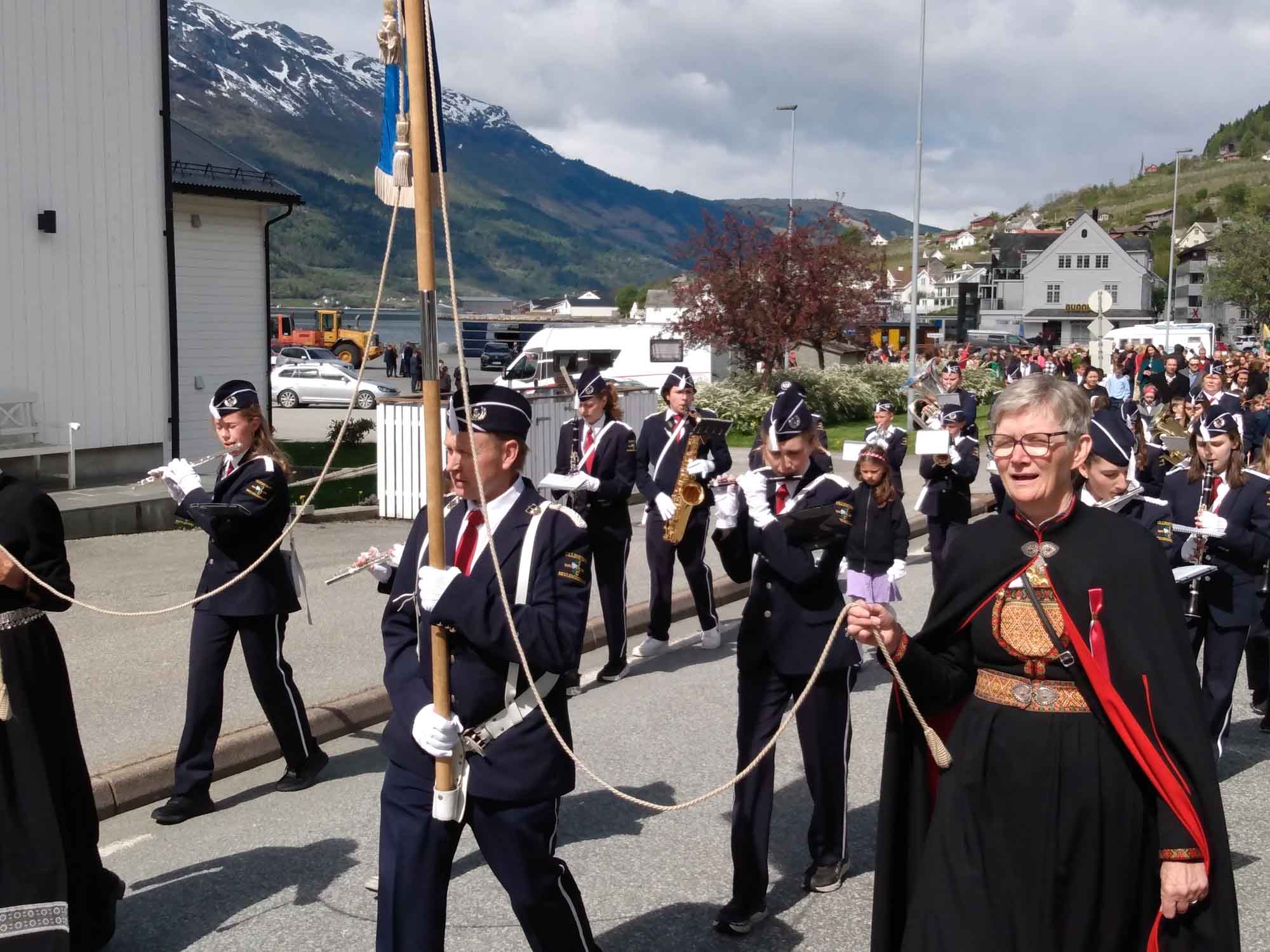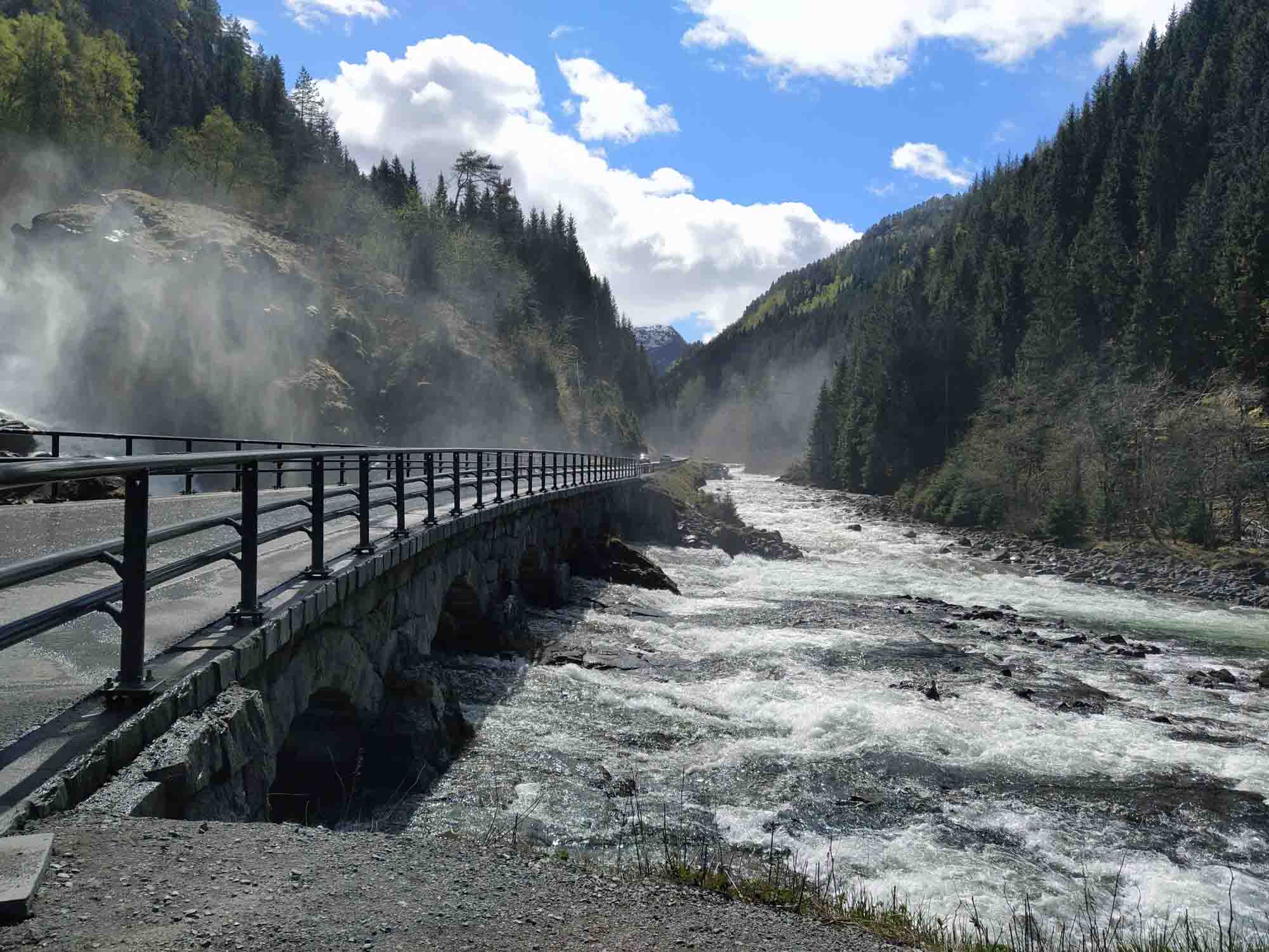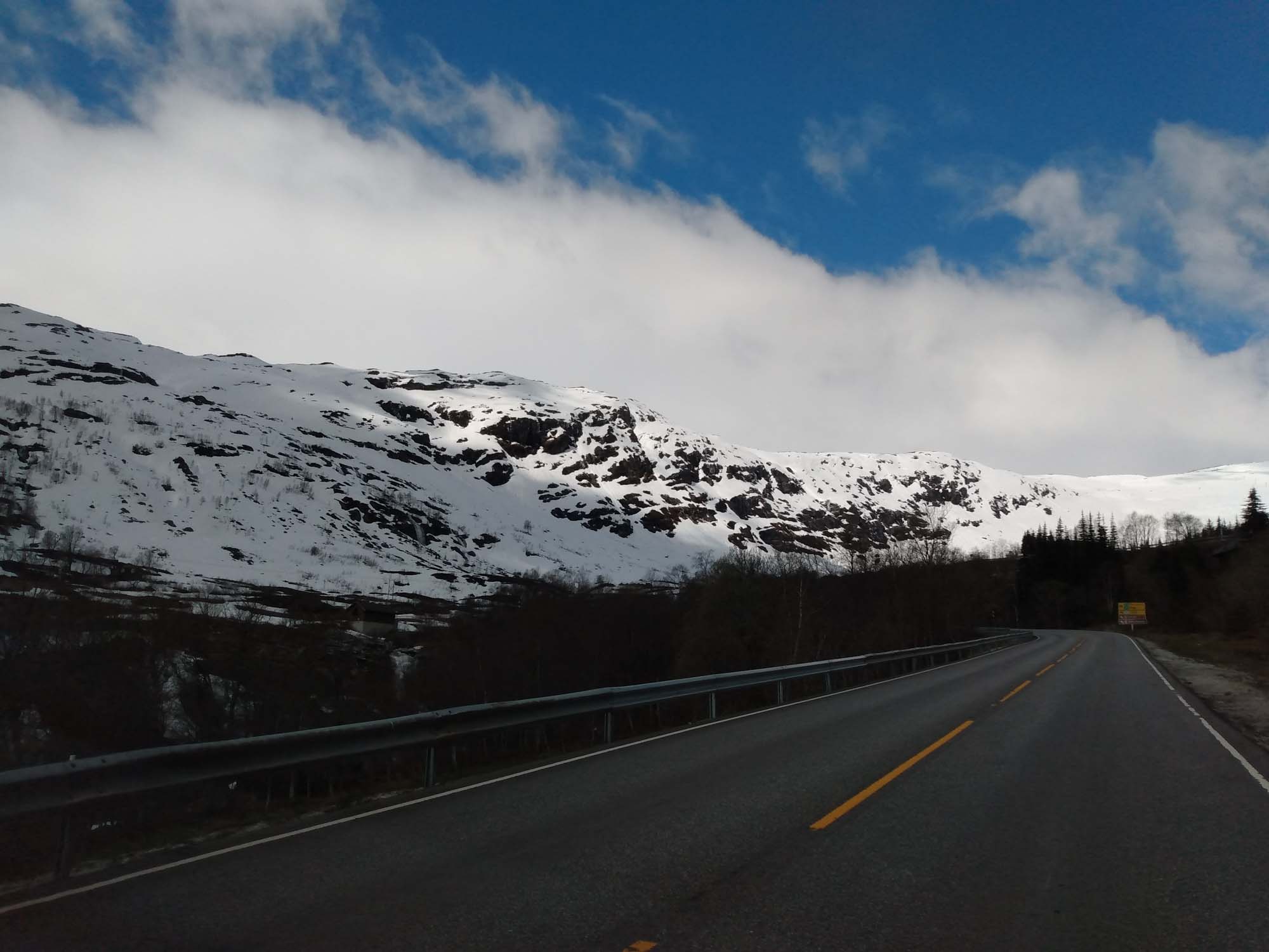 Die Sonne lachte mal wieder. Nachdem wir Berta noch einmal eine Runde über den Platz am Wasser geführt und gefrühstückt haben, fuhren wir weiter der Landschaftsroute Ryfylke folgend bis zum See Raldalsvatnet. Diesen bekamen wir nur kurz zu sehen, weil die Straße entlang des Sees die meiste Zeit durch einen Tunnel führte. Danach folgten wir der E13 nach Nordwesten und kamen immer höher, bis wir uns plötzlich mittem im Schnee in einem Skigebiet wiederfanden. Die Saison war vorbei und die Lifte standen. Aber es wäre immer noch reichlich Schnee für eine Abfahrt da gewesen. Danach ging es schnell wieder abwärts. Am Wasserfall Låtefossen machten wir einen Halt für Fotos und einen Drohnenflug. Das Tal war sehr eng und der Wasserfall ziemlich hoch. Kein Wunder, dass der kleine Parkplatz direkt an der Straße lag. Wir fuhren weiter und erreichten bei Odda einen Seitenarm des Hardangerfjords. Da heute Nationalfeiertag war, scheiterte der Versuch eines Einkaufs kläglich. Alles aber auch wirklich alles war geschlossen. Stattdessen sahen wir viele Norweger, die in Nationaltracht herumliefen. Sie versammelten sich an verschiedenen Plätzen in dem kleinen Ort, um dem Festumzug zuzusehen. Auch wir mussten einen Moment anhalten, um den Musikern und dem nachfolgenden Tross zuzusehen. Danach folgten wir dem Wasser bis nach Kirsavik. Hier fuhren wir ein kleines Stück in das Landesinnere und wanderten von dort zum nächsten Wasserfall, dem Tveitafossen. Wir hätten auch noch 3 weitere Wasserfälle erwandern können, aber das war uns denn doch zu weit. Anschließend ging es mit der Fähre nach Utne, einem kleinen sehr hübschen weißen Dorf, das wir uns aber lediglich im Vorbeifahren ansahen. Weiter ging es jetzt am Hardangerfjord entlang auf einer kleinen einspurigen Straße bis kurz hinter Jondal, wo wir morgen die Fähre nehmen würden. Den Stellplatz, den wir uns ausgesucht hatten, erreichten wir leider nicht. 150 m vor dem Parkplatz war ein Schild, dass auf eine private Mautstraße hinwies. Bezahlen konnte man nur mit Bargeld. Und das hatten wir nicht, da in Norwegen ansonsten alles mit Karte bezahlt wird. Aber es fand es sich ein Parkplatz entlang der wenig befahrenen Straße, der uns für eine Nacht völlig genügte.