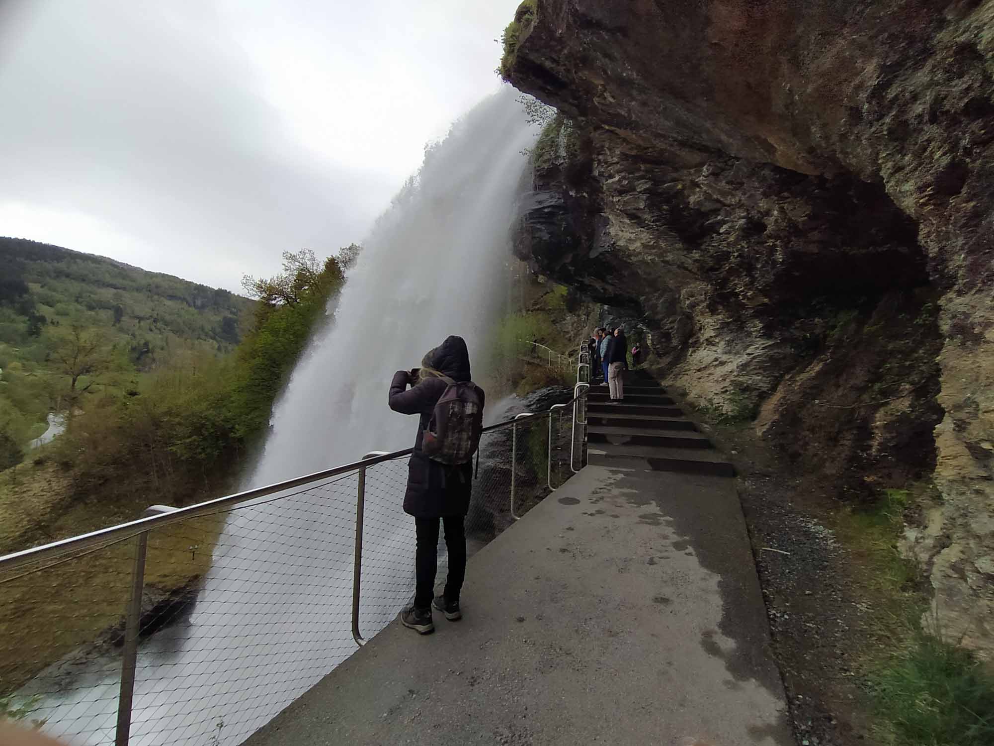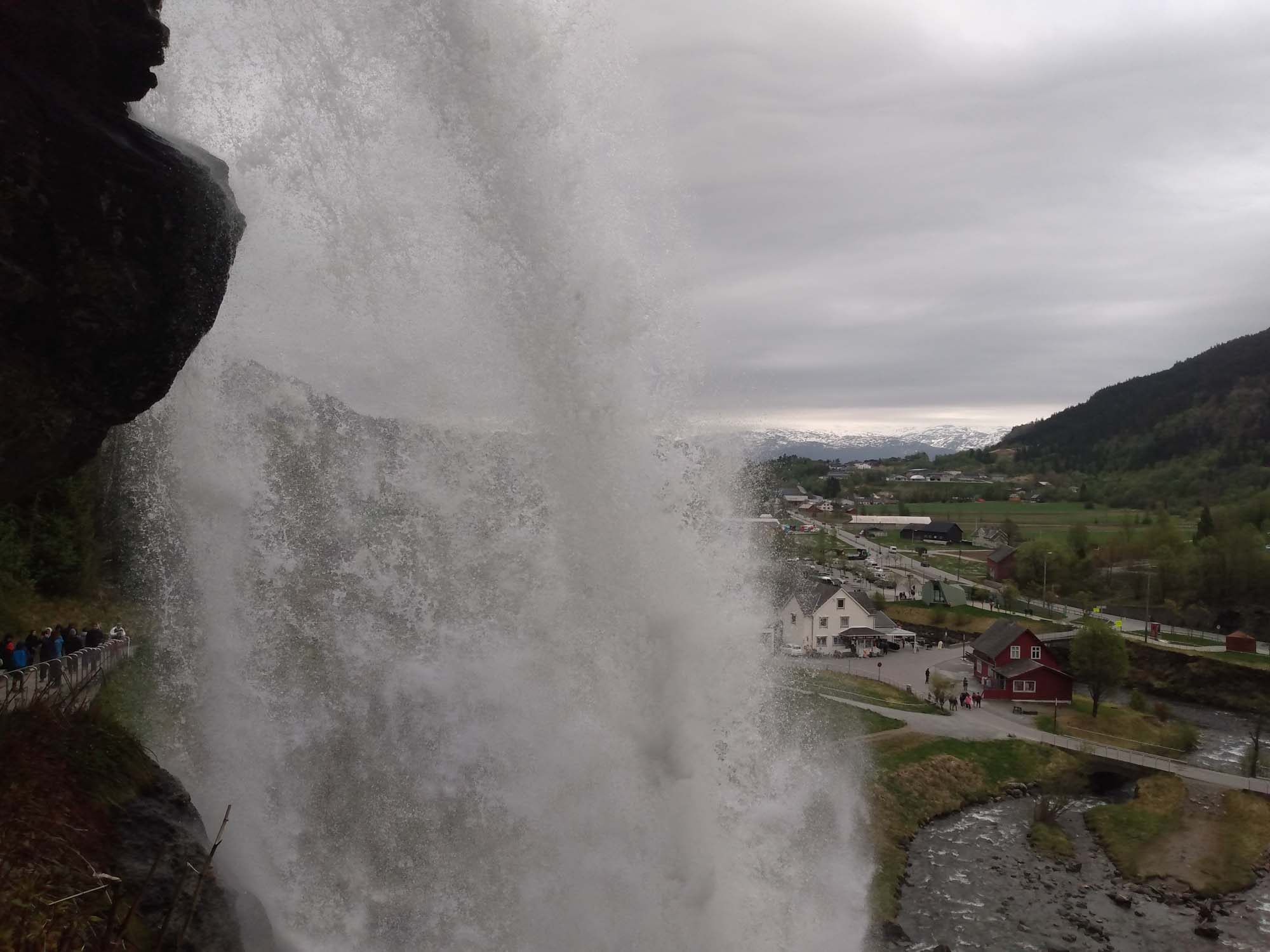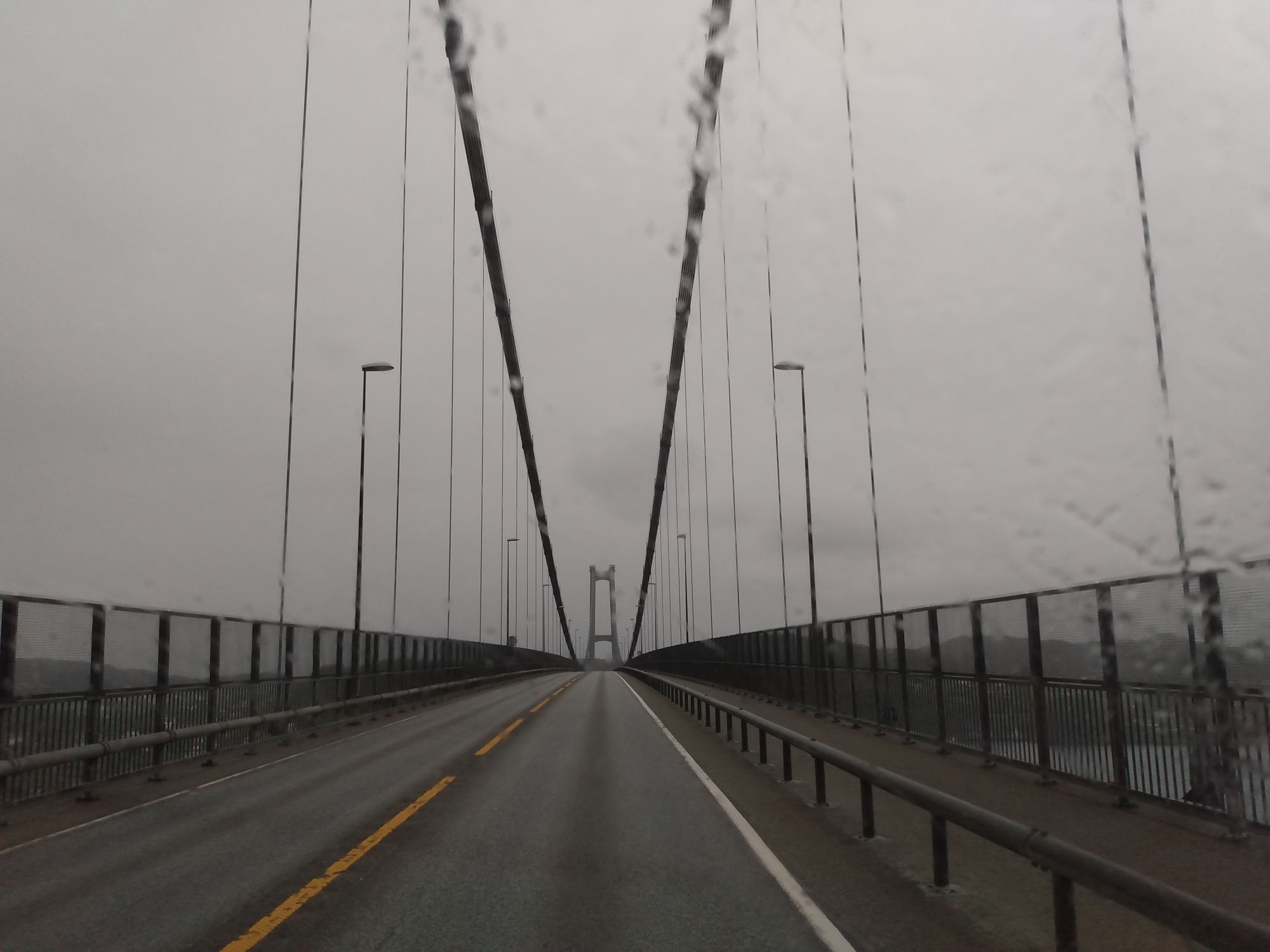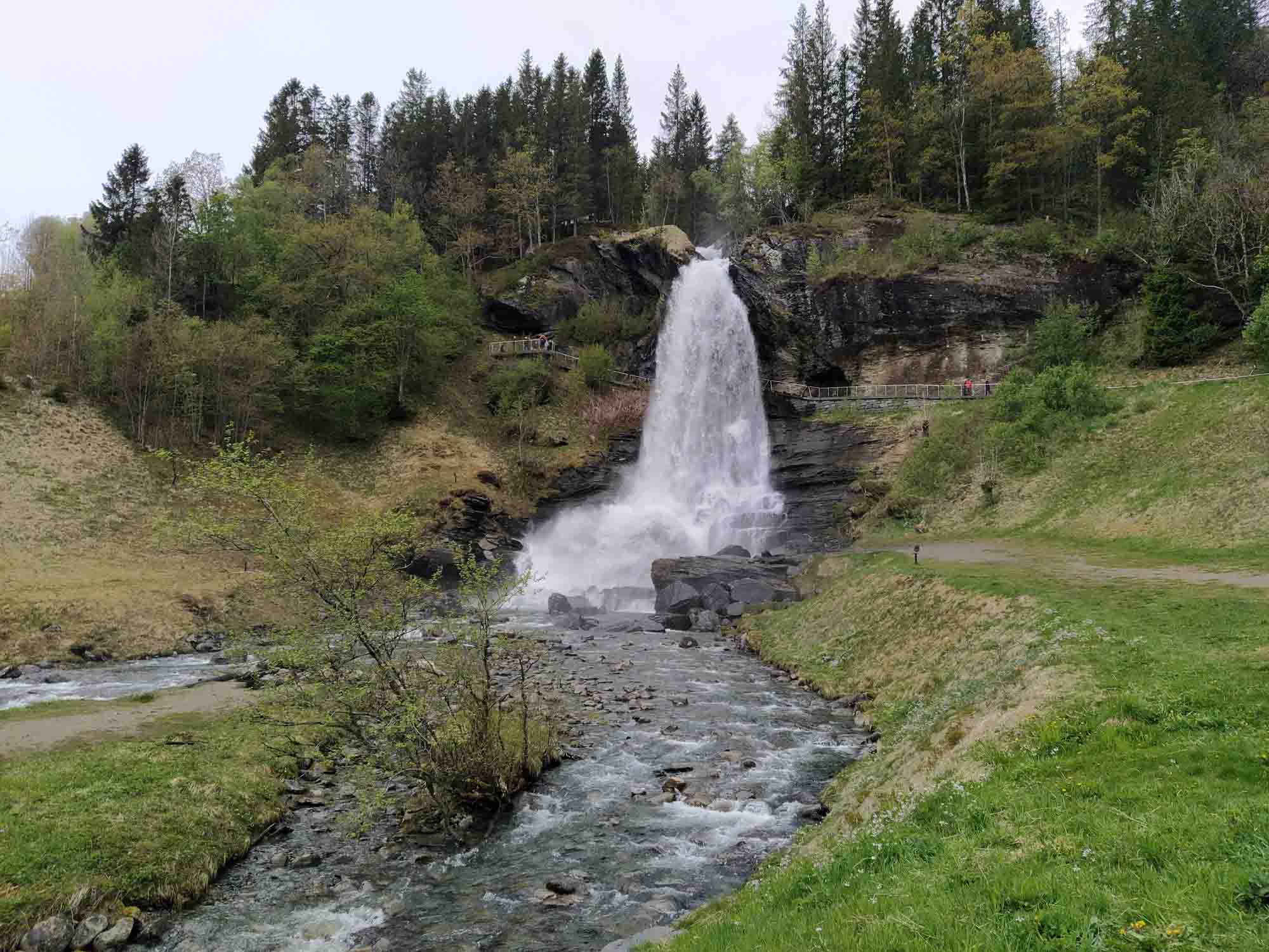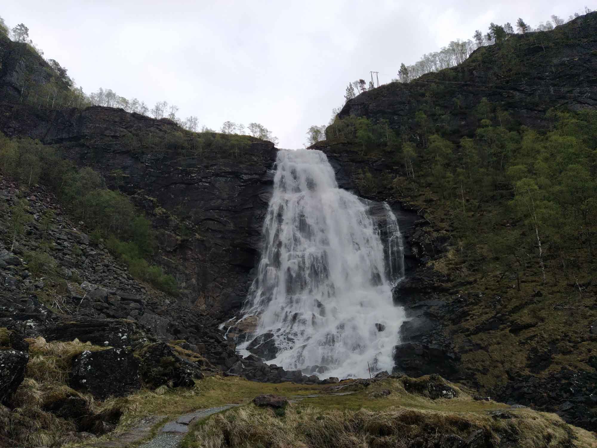 Der Spaziergang führte uns heute ein Stück die Straße entlang, an der wir standen. Es gab schlicht keine Wege irgendwohin. Dann fuhren wir nach Jondal und nahmen die Fähre nach Tørvykbygd. In Norheimsund verließen wir die Landschaftsroute Hardanger nach Westen und machten noch einen Halt am Steindalsfossen, einem Wasserfall unter dem man hindurchgehen kann. Danach ging es durch die malerische Landschaft Vestlands, südlich an Bergen vorbei über eine große Brücke nach Askøy, einer Bergen vorgelagerten Insel. Dort fanden wir einen großen Parkplatz, von dem aus man zu mehreren Badestellen gehen konnte und stellten uns an die hinterste Ecke. Dann machten wir noch einen kleinen Spaziergang zu einer der Badestellen. Berta konnte endlich mal wieder frei laufen und genoss sichtlich das Laufen über die Wiese und den Sand an dem kleinen Strand.