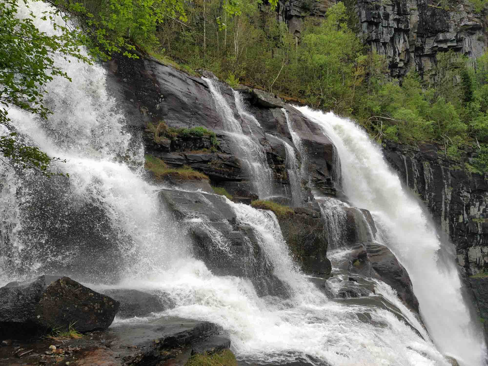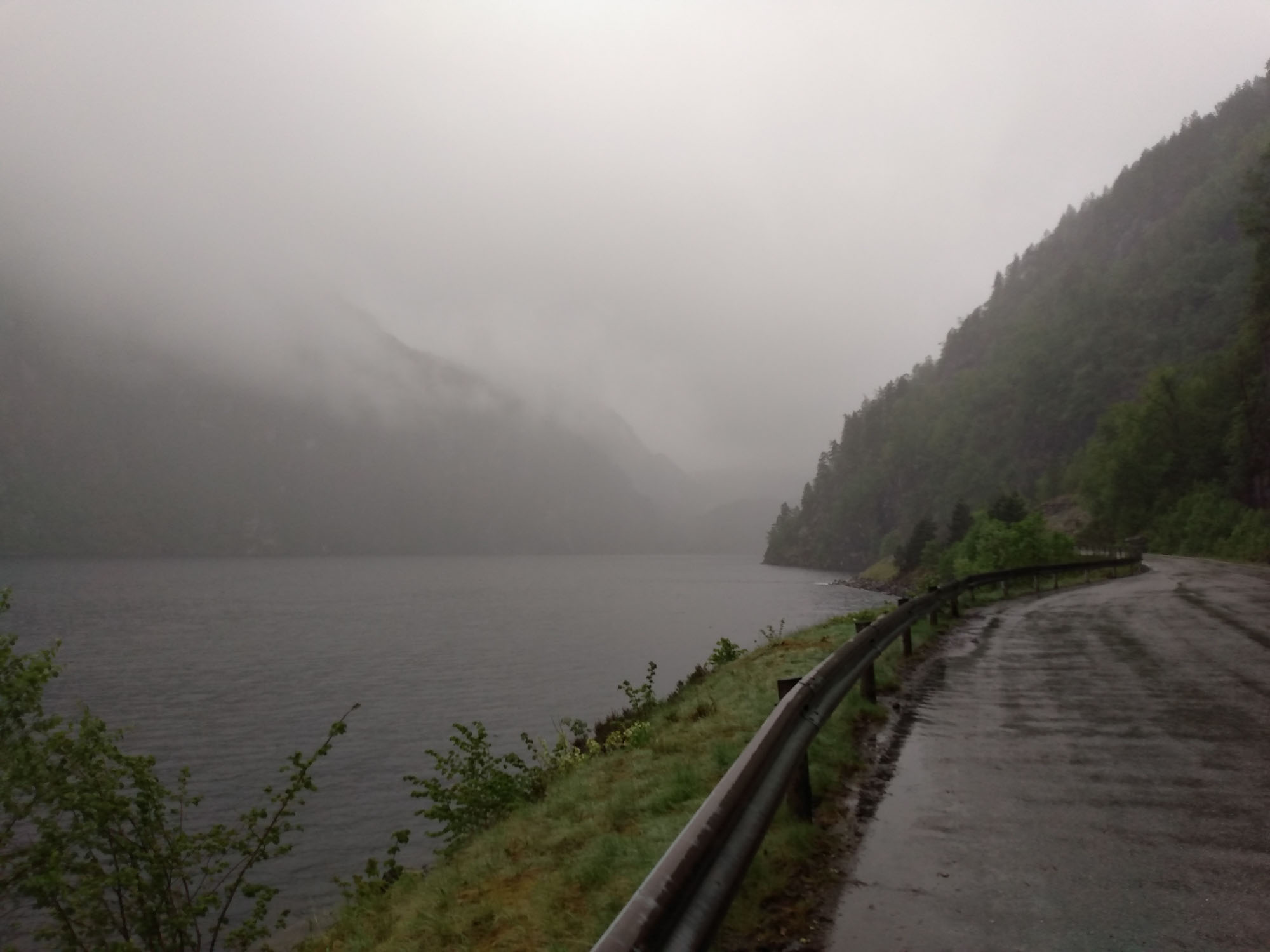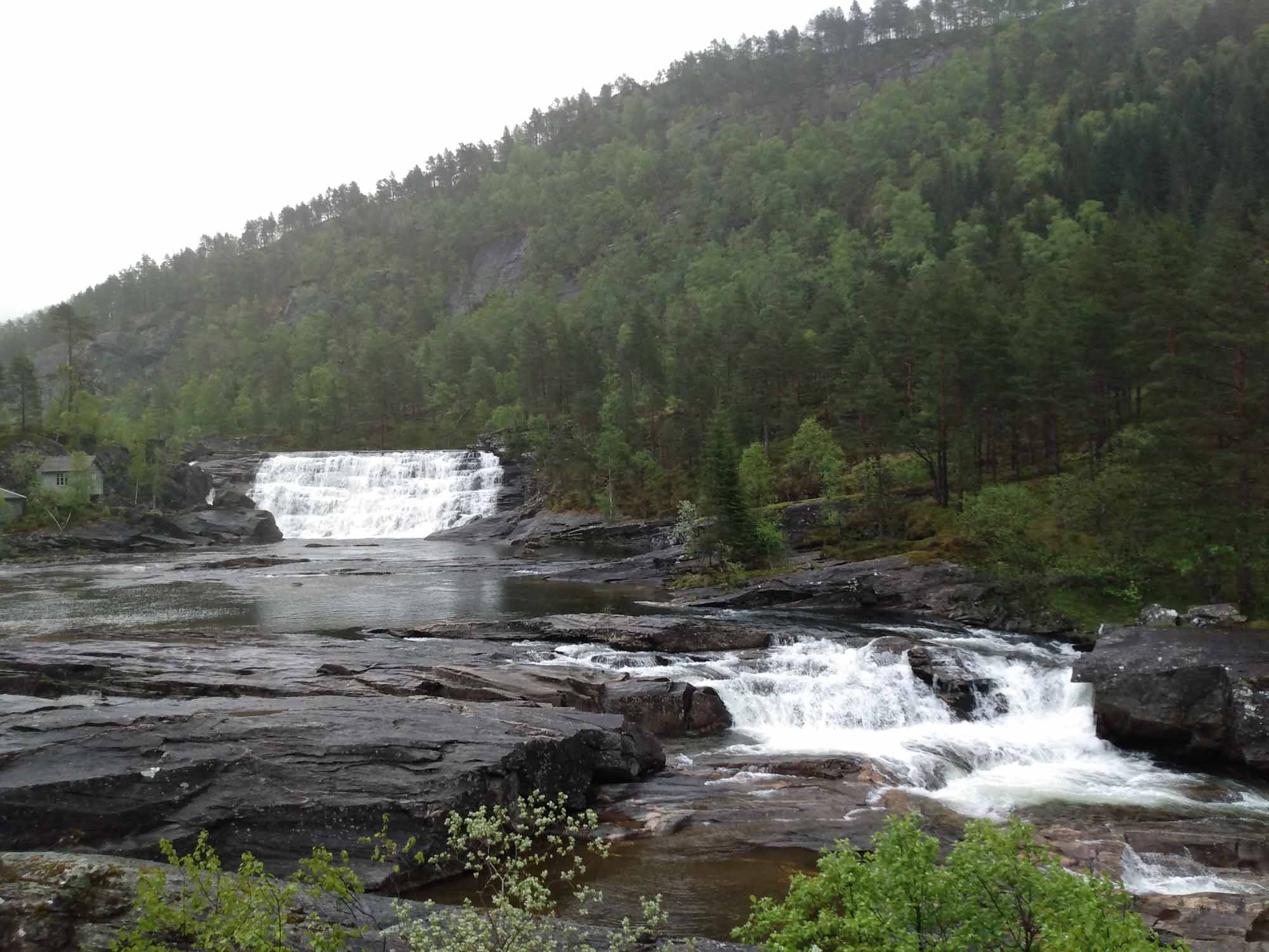 In der Nacht hatte es wie erwartet geregnet. Aber als wir dann losfuhren, legte er sich und bei der Fahrt entlang des Osterfjords erst über die E39 und dann über die kleine 569 bis nach Mo strahlte sie wunderbar vom Himmel herunter. Recht hatten wir allerdings mit Bergen. Dort regnete es heute tatsächlich. Gut, dass wir gestern dort waren. In Mo kamen wir zufällig an einer Entsorgungsstation vorbei, die es in Norwegen angenehm häufig gibt. So ließen wir altes Wasser ab und füllten unseren Wassertank mit frischem Quellwasser aus den Bergen. Danach folgte wieder einmal ein Tunnel durch den schneebedeckten Berg und dann bogen wir auf die noch kleinere 5410 ab und folgten dem Fluß Ekso ostwärts bergauf. Diesmal ging es über einen Pass, wo wir uns wieder mittem im Schnee befanden. Schließlich erreichten wir wieder die gut ausgebaute E16 und folgten ihr bis nach Vossvangen, wo wir unsere Gasflasche füllten. Nach einem Halt beim Wasserfall Skjervefossen fuhren wir zu unsem nächsten Stellplatz bei Ulvik, inmitten eines Skilanglaufgebietes. Dort machten wir noch einen kleinen Spaziergang, bevor wir uns von der langen - weil sehr langsamen - Fahrt auf den kleinen Straßen erholten.