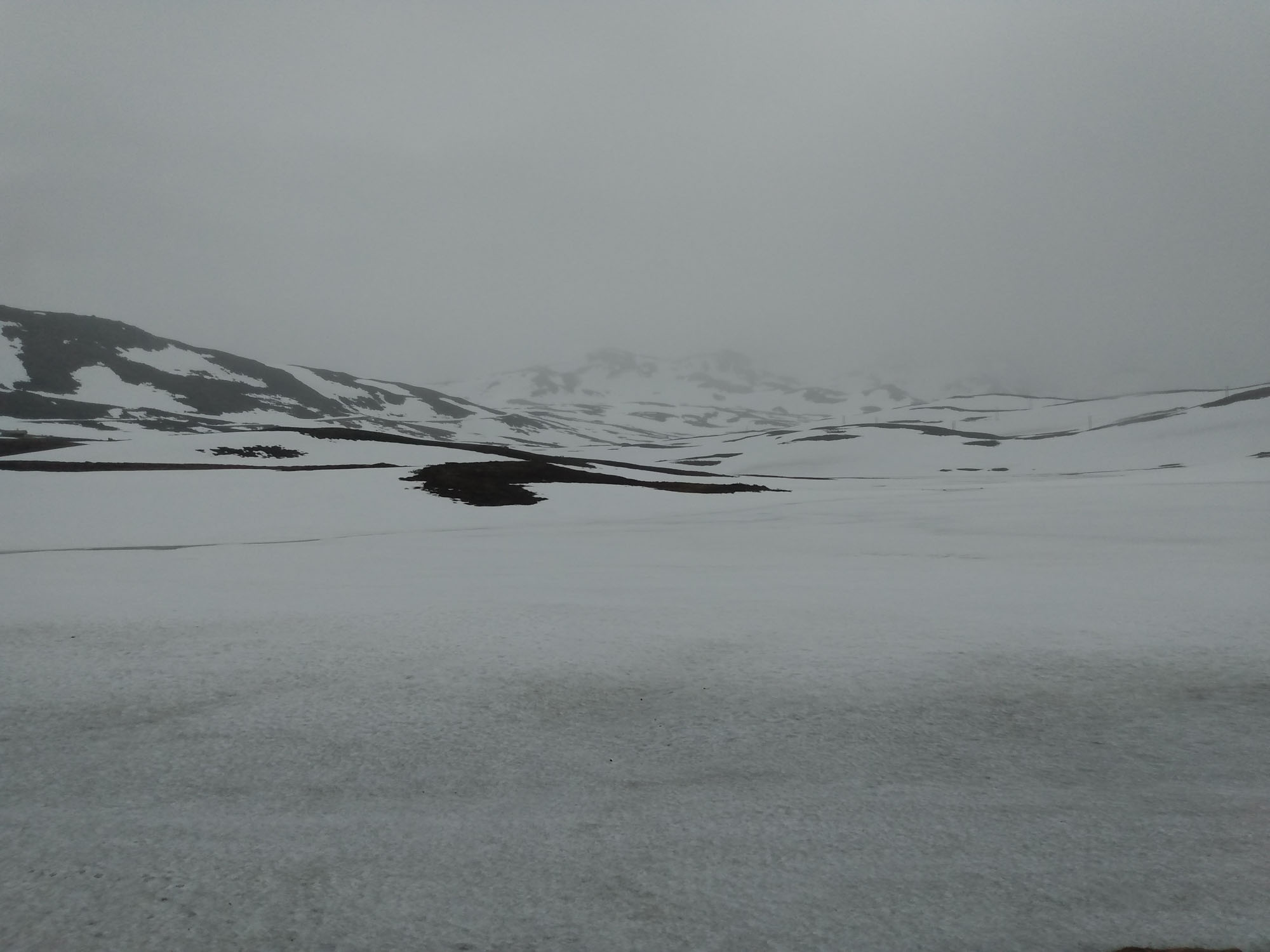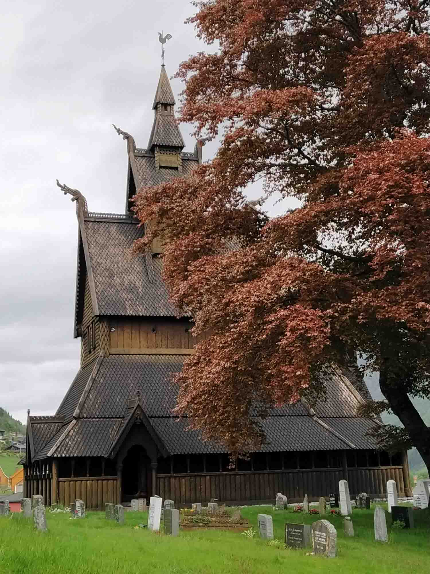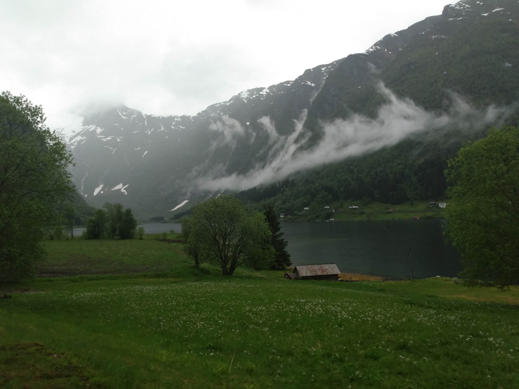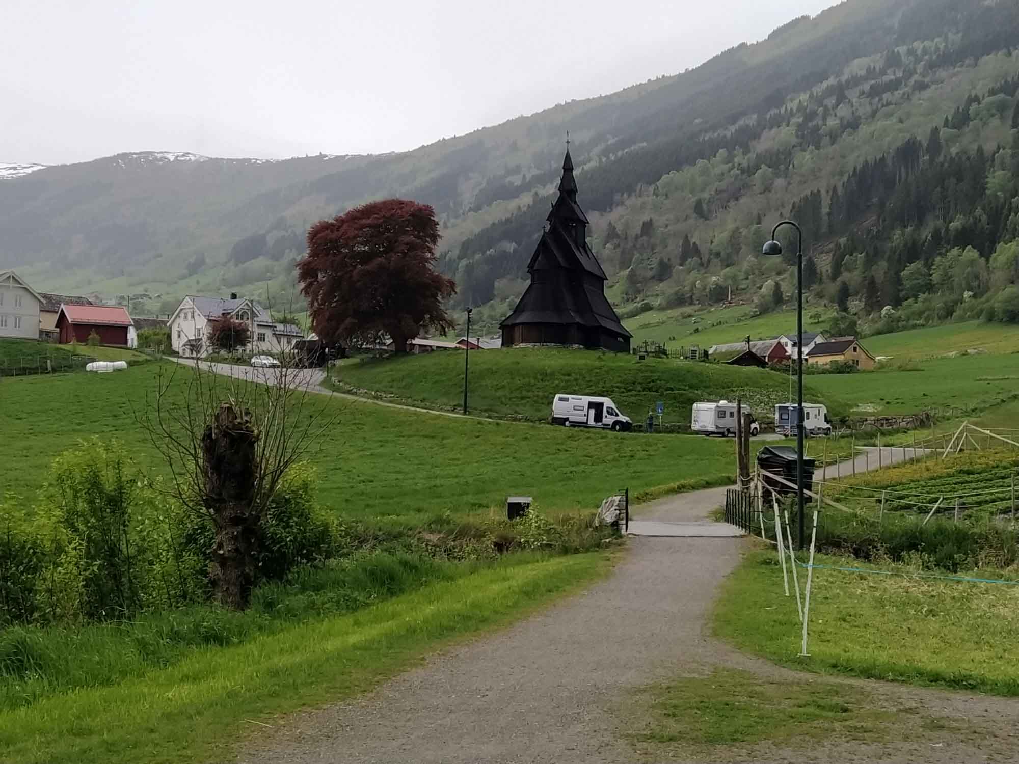 An der Straße war zum Glück kein Verkehr so daß wir trotz der schrägen Lage ruhig geschlafen haben. Nach einem ausgedehnten Spaziergang entlang der Straße und über einen Wanderweg am Fluß entlang, setzte dann Regen ein, der uns auch für den Rest des Tages begleiten sollte. Wir folgten der E 16 nach Westen und machten Halt bei der Stalheim Panorama Terasse. Die Terasse gehört zu einem Hotel und man hat von dort einen schönen Blick über das Tal. Noch spektakulärer wäre die Abfahrt über die alte Straße gewesen, die als Einbahnstraße in engen Serpentinen den Berg hinabführt. Diese ist jedoch wegen Bauarbeiten bis 2024 gesperrt. So lange wollten wir nicht warten und fuhren weiter bis wir kurz von Vossvangen auf die 13 nach Norden abbogen. Nach kurzer Zeit ging es wieder auf die schneebedeckte Hochgebirgslandschaft. Oben legten wir eine kleine Pause ein. Berta genoss es sichtlich ein wenig durch den Nieselregen und den Starkwind zu rennen. Wir fanden es etwas weniger gemütlich und fuhren lieber wieder herunter. Bei Vikøyri erreichten wir wieder den Sognefjord, dessen Seitenarme wir gestern bereits gesehen hatten. Hier bogen wir zu einer Stabkirche aus dem Jahr 1130 ab, sahen sie uns aus der Luft und bei einem kleinen Spaziergang im Nieselregen von außen an. Danach fuhren wir der 13 weiter folgend nach Vangsnes, um die Fähre nach Dragsvik zu nehmen. Auch diese Fähre war wieder voll elektrisch. Völlig geräusch- und vibrationslos glitten wir über den Fjord auf die andere Seite nach Hella. Dort mussten wir kurz von der Fähre herunterfahren, wenden und in die andere Richtung wieder auffahren. Dann ging es weiter nach Dragsvik, wo wir als erste die Fähre verließen und zunächste der 55 folgend nach Balestrand fuhren. Aufgrund des Regens verzichteten wir auf die sicherlich sehr schöne Wanderung, die man von hier machen kann. Wir fuhren stattdessen durch den kleinen Urlaubsort und suchten mehr oder weniger vergeblich nach dem Strand, der in unserem geliebten Reiseführer beschrieben war. Dabei fanden wir eine Entsorgungsstation, was auch ziemlich praktisch war. Danach fuhren wir wieder zurück auf der 55, diesmal in Richtung Norden immer entlang des Fjords, um bei Vetlefjorden auf eine einspurige Straße abzubiegen, die weiter am Wasser entlang führte. Dort fanden wir direkt neben einem Wasserfall einen Platz mit einem wunderbaren Blick auf den Fjord an dem wir uns sofort wohl fühlten.