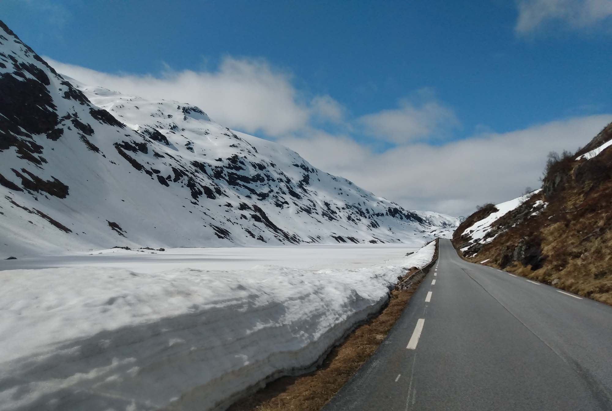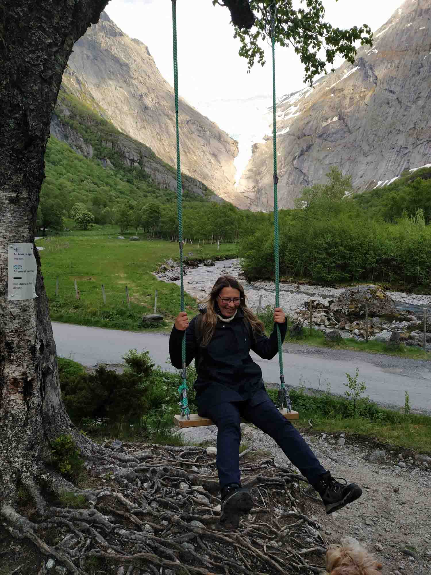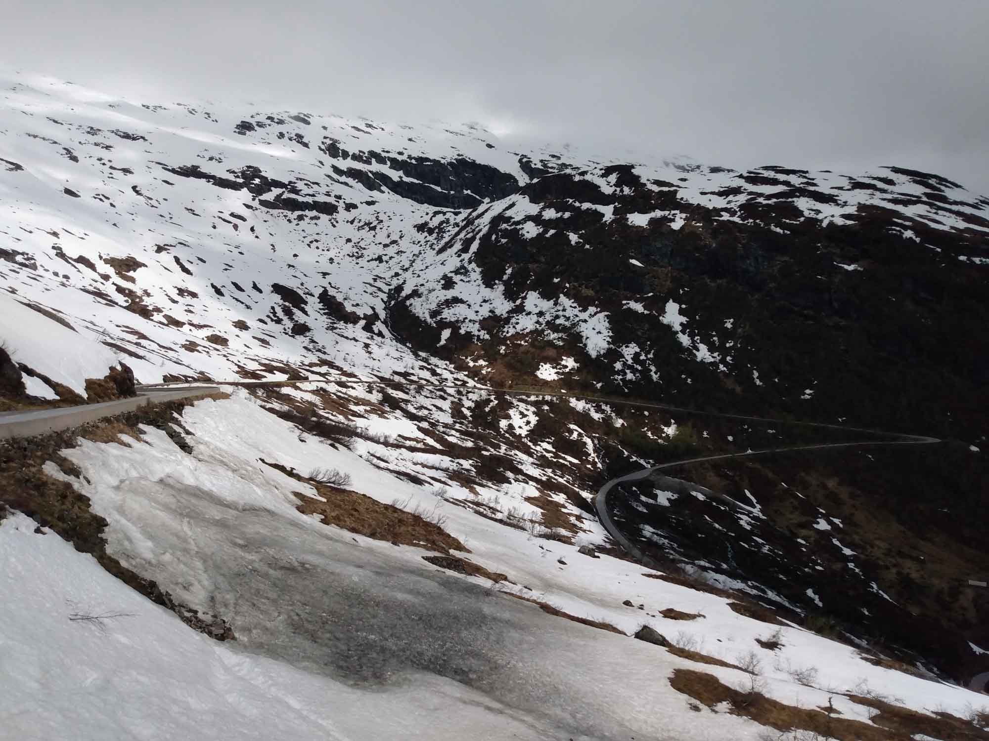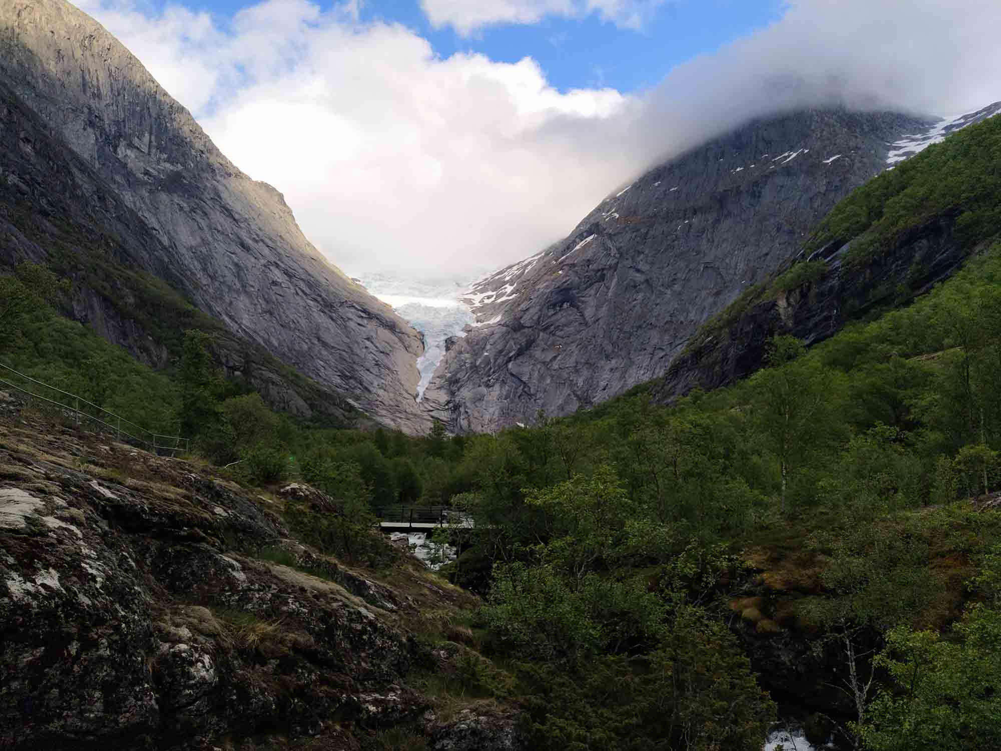 Während unseres morgentlichen Spaziergangs standen die Wolken tief über dem Fjord, an dem wir standen. Aber immerhin hatte es aufgehört zu regnen. Die Wettervorhersage versprach erst wieder für Donnerstag besseres Wetter. Und das wollten wir für eine Wanderung am Briksdalsbreen nutzen. Sollten wir besser hier bleiben? Aber der gestrige Tag war ziemlich ungemütlich und auf einen weiteren Schlechtwettertag im Wohnmobil hatten wir keine Lust. Also fuhren wir trotz der Ungewissheit, oder besser Gewissheit, dass wir unterwegs in den Bergen kein angenehm warmes Plätzchen finden würden, los. Und schnell war klar, dass es wieder kalt werden würde. Am ersten Aussichtspunkt, dem Gaularfjellet lag schon wieder sehr viel Schnee. Von dort aus ging es jedoch bald wieder ins Tal, die Sonne schien und so genossen wir einen sonnigen Spaziergang am Likeholefossen und standen auf der hübschen kleinen Brücke über dem Wasserfall. Mit vielen kleinen Zwischenstopps und nach einer angenehm entspannten Fahrt, hatten wir dann überraschenderweise gegen Abend das Ende das Tals erreicht, von dem aus die Wanderung zum Briksdalsgletscher losging. Obwohl es bereits 18 Uhr war, entschieden wir uns angesichts des tollen Wetters (und der miesen Prognose für morgen) dafür, die einstündige Wanderung zum Gletscher noch zu machen. Obwohl es gar nicht so weit war, war der Anstieg ziemlich steil und wir kamen ganz schön ins Schwitzen. Aber der Anblick der schmalen Gletscherzunger und der anschließende Drohnenflug wie auch der wunderschöne Spaziergang entschädigten uns über alle Maßen. Der Weg zurück bergab war dann wieder sehr entspannt und auch anschließend brauchten wir nicht lange, um den Picknickplatz anzufahren, den wir bereits auf der Hinfahrt gesehen hatten, um uns dort für die Nacht einzurichten.
