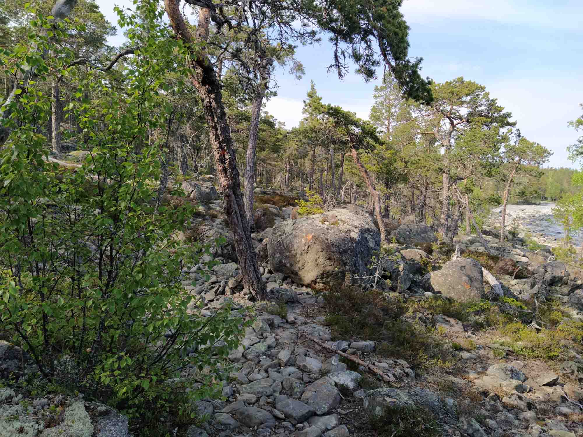 Bei unserem Morgenspaziergang kam uns ein Mann und eine Frau entgegen, die ebenfalls ihre Hunde spazieren führten. Natürlich liefen ihre Hunde ebenfalls frei. Wir unterhielten uns ein Weilchen und am Ende fragte der Mann, ob es uns stören würde, wenn sie an unserem Wohnmobil vorbeilaufen würden, was wir natürlich verneinten. Schon verrückt, wie unglaublich umsichtig und gastfreundlich Schweden sein können, selbst dann, wenn man einfach nur auf einem Picknickplatz übernachtet hat. Danach fuhren wir weiter, bis wir bei Sundsvall die Ostsee erreichten. Zu einer Besichtigung hatten wir wieder einmal keine Lust und fuhren stattdessen die Ostseeküste entlang nach Norden. Die Küste hatte nichts von den schönen langen Sandstränden, die wir aus Deutschland und Polen kennen. Hier sah es beinahe aus, wie die schwedische Schärenlandschaft mit großen Heidebewachsenen Granitblöcken. Irgendwann bogen wir nach rechts auf eine der Inseln ab und fanden einen schönen Platz, von dem aus wir zum Küstenwanderweg herunterlaufen konnten, der am Wasser entlang führte. Typisch Schwedisch über Stock und Stein aber wunderbar in der Natur.