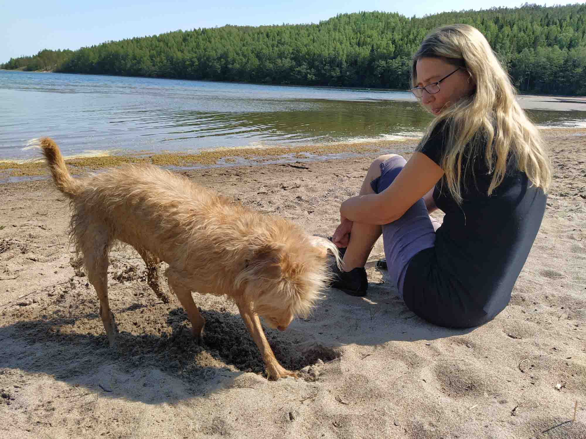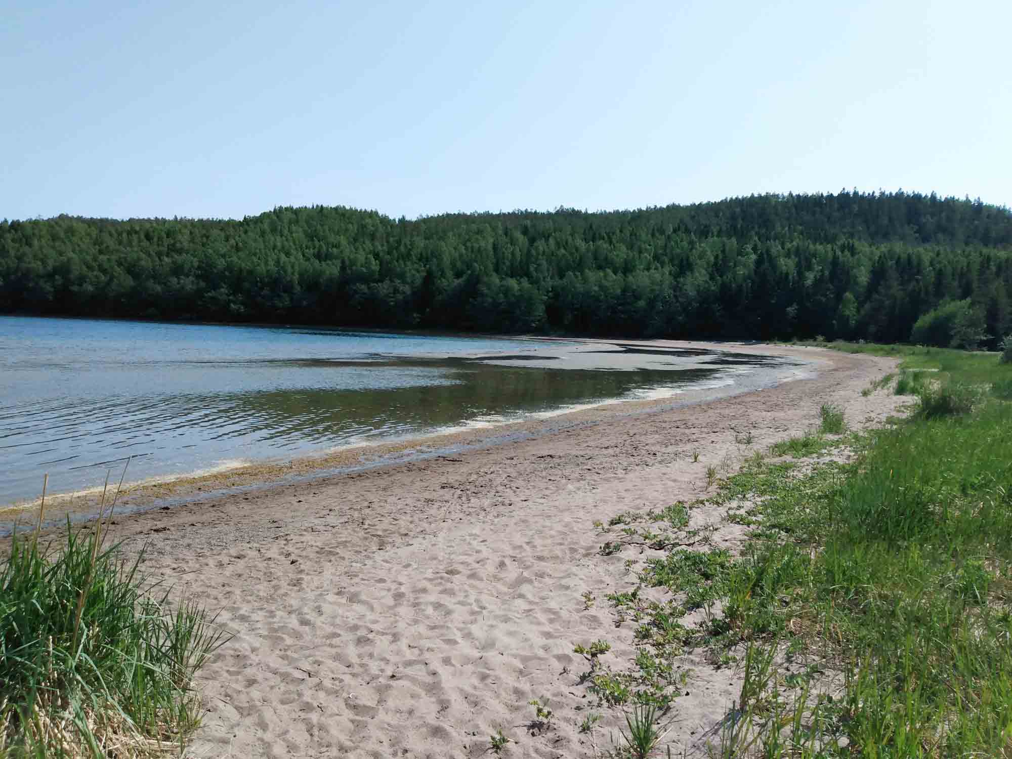 Der Platz war schön, da wir ihn aber leider mit zwei anderen Campern teilen mussten, entschieden wir uns nach einer erneuten kleinen Wanderung auf dem Küstenwanderweg dazu, weiterzufahren. Unser Ziel war der Nationalpark Skuleskogen, der über einen Küstenwald und schöne Sandstrände verfügen sollte. Der Park hat drei Eingänge: einen im Süden, einen im Westen und einen im Norden. Für unsere Wanderung entschieden wir uns für den südlichen Eingang, den wir nach 20 km Schotterpistenfahrt erreichten. Hier war ein weitläufiger Parkplatz auf dem etliche Wohnmobile dicht an dicht parkten. Vermutlich, weil hier die Übernachtung sogar offiziell gestattet ist. Wir fanden noch eine Lücke für uns und gingen den Weg hinab bis zum eigentlichen Parkeingang. Dort nahmen wir Vorschriftsmäßig Berta an die Leine und liefen durch den grünen Küstenwald bis wir den ersten kleinen Strand erreichten. Dort ließen wir Berta ein wenig laufen, bevor wir noch ein wenig weiter wanderten. Aber so richtig hat uns dieser Park nicht begeistert. Vielleicht war es einfach zu warm. Oder wir hatten uns die Strände idyllischer vorgestellt oder den Wald grüner. Vielleicht lag es aber auch an die vielen Ameisen, die emsig versuchten, unsere Beine heraufzukrabbeln. Sie schienen größenwahnsinnig geworden zu sein. Jedenfalls versuchten sie ihr Bestes, uns mit ihren kleinen Beisserchen zu schnappen und zu ihrem Bau zu schleppen. Bevor es ihnen gelang, machten wir uns wieder auf den Rückweg, verließen die vielen Wohnmobile auf dem Parkplatz und fuhren weiter nordwärts, bis wir uns bei Oversjäla vor einem Wanderweg in den Wald stellten. Dort packten wir das erste Mal auf dieser Reise unseren Grill aus und zauberten uns leckere Hähnchenschenkel mit unserem geliebten Kräuterbaguette.
