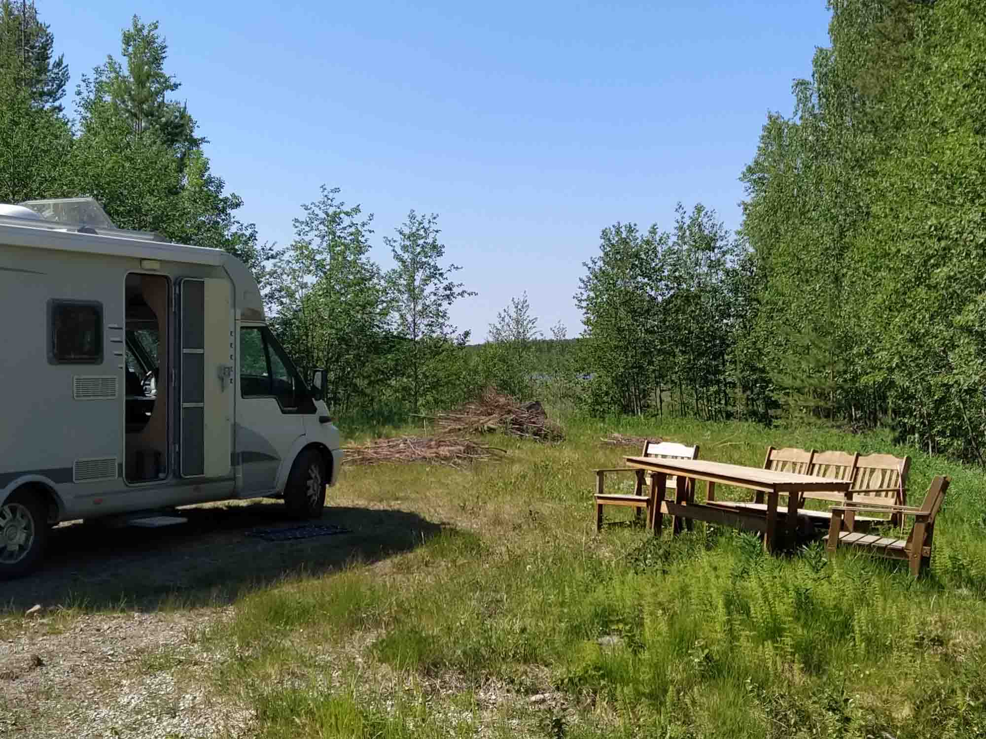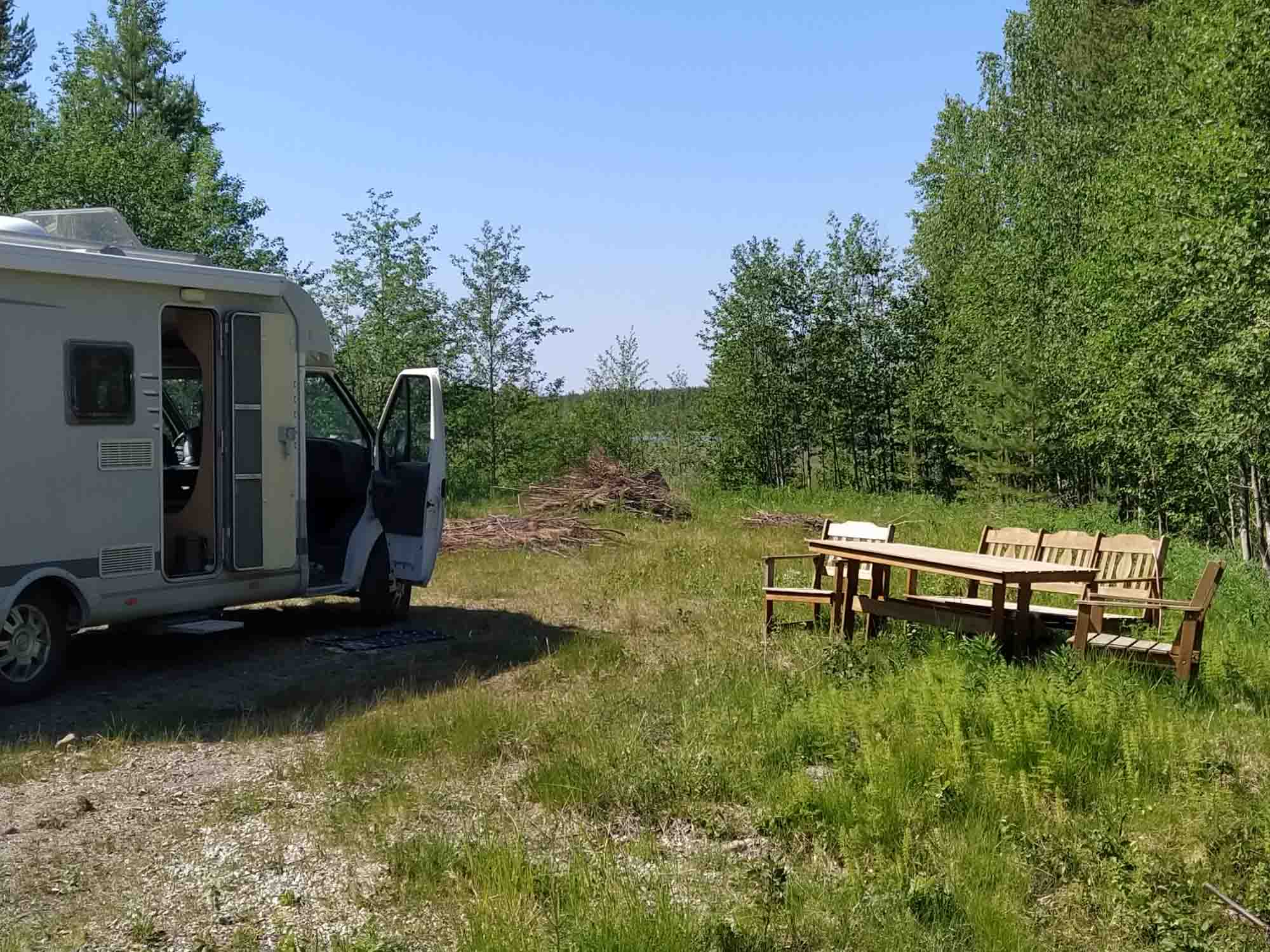 Das Summen der Mücken begrüßte uns bereits morgens beim Aufstehen. Zum Glück hatten wir ein Mückennetz für das Gesicht dabei. Es muss bestimmt merkwürdig ausgesehen haben, wir wir in voller Montour mit Baseballmütze und darüberhängendem schwarzen Moskitonetz versuchten, einen halbwegs ungestörten Spaziergang zu machen. Um das Netzt herum surrte der Schwarm aber stechen konnten sie so zumindest im Gesicht nicht mehr. Berta hatte diesen Schutz nicht und war froh, als wir wieder zurück waren. An draußen sitzen war trotz der Hitze nicht zu denken. Also nochmal die Montour an, um die Markiese einzufahren sowie Tisch und Stühle einzuräumen. Dann fuhren wir weiter, auf der Suche nach einem Platz, der weniger mückenverseucht ist. Nach 20 Minuten entdeckten wir an der Schotterstraße, die wir gerade entlangfuhren einen Platz, an der ein Picknicktisch stand. Dort breiteten wir für Berta ihre Decke aus und erholten uns ein wenig ohne sofort aufgefressen zu werden. Danach ging es weiter gen Norden, bis wir beim Naturreservat Mårdselforsen ankamen. Für einen Spaziergang durch das Reservat war es schon zu spät aber wir gingen trotzdem noch an der Straße entlang, die parallel zum Fluß verlief. Dabei entdeckten wir den absolut idealen Platz, der jedoch bereits mit einem Wohnmobil besetzt war. Kurz dahinter war noch ein weiterer Platz, der immerhin noch besser war, als der unweit der Hauptstraße, auf dem wir erstmal gehalten hatten. Beim Umparken fragten wir den anderen Wohnmobilisten, wann er denn weiterfahren würde. Und wie es der Zufall wollte, war das bereits morgen. Also verabredeten wir uns für morgen früh, so dass wir dann seinen Platz bekommen würden. Nachdem wir noch einmal gerillt haben, konnten wir zweifach glücklich einschlafen: Erstens, weil wir morgen einen tollen Platz bekommen würden und zweitens, weil es hier nur sehr wenige Mücken gab.