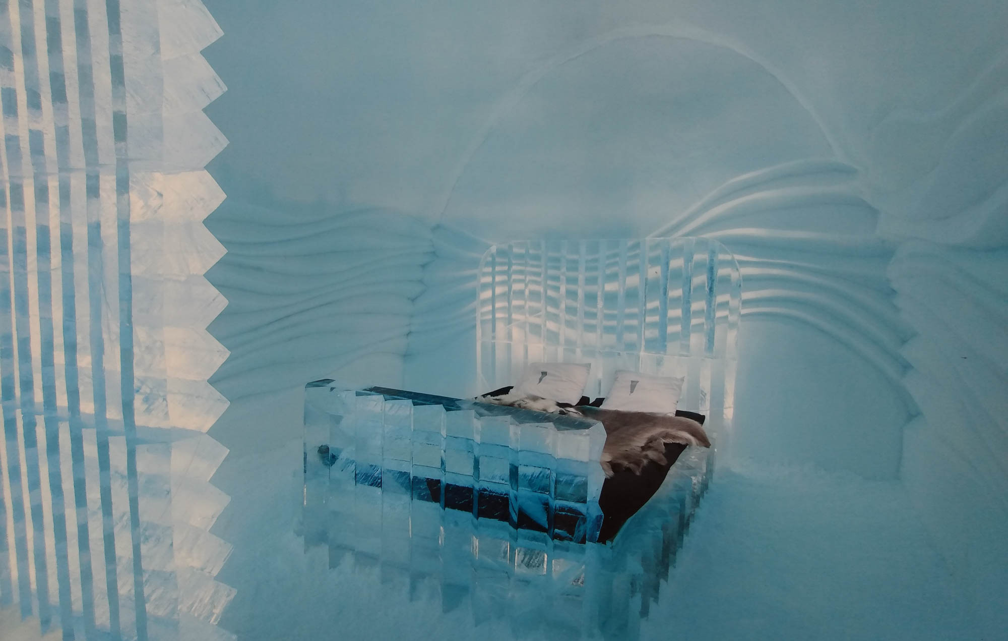 Die Nacht war herrlich ruhig. Trotzdem wachten wir früh auf und machten unseren Morgenspaziergang bereits um 7:30 Uhr im weiterläufigen Arreal am Seeufer entlang. Berta kletterte eifrig über die glatten Felsen und hatte ihren Spaß. Wir ließen uns ausgiebig Zeit und fuhren erst um 11 Uhr weiter. Aber nacht lange. Unsere erste Pause machten wir am See Soutujärvi. Danach ging es bis kurz vor Kiruna. Der von uns avisierte Stellplatz war jedoch bereits völlig überfüllt, so dass wir einfach ein wenig ins Hinterland fuhren. Dabei kamen wir zufällig beim berühmten Eishotel vorbei, in dem man die Nacht in einem Zimmer aus Eis verbringen kann. Sogar das Bett ist tiefgekühlt. Ein Stückchen weiter fanden wir am See Jukkasjarvi eine kleine Badestelle mit Parkmöglichkeit wo es sogar fast keine Mücken gab.