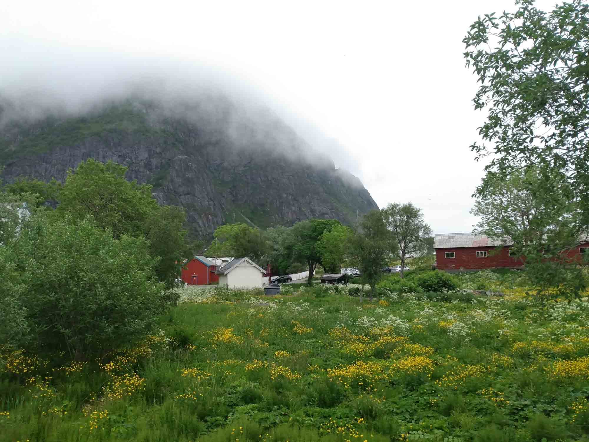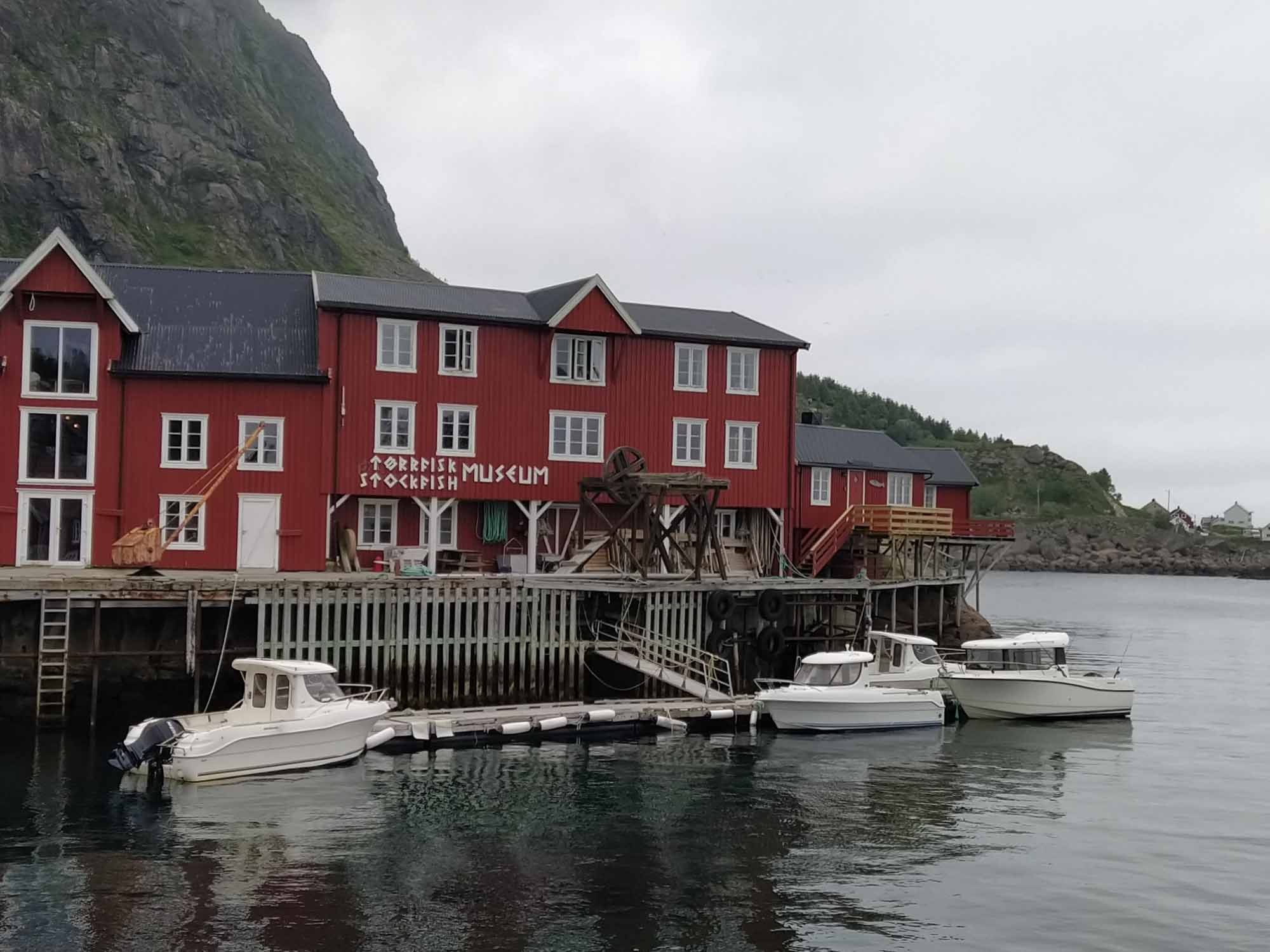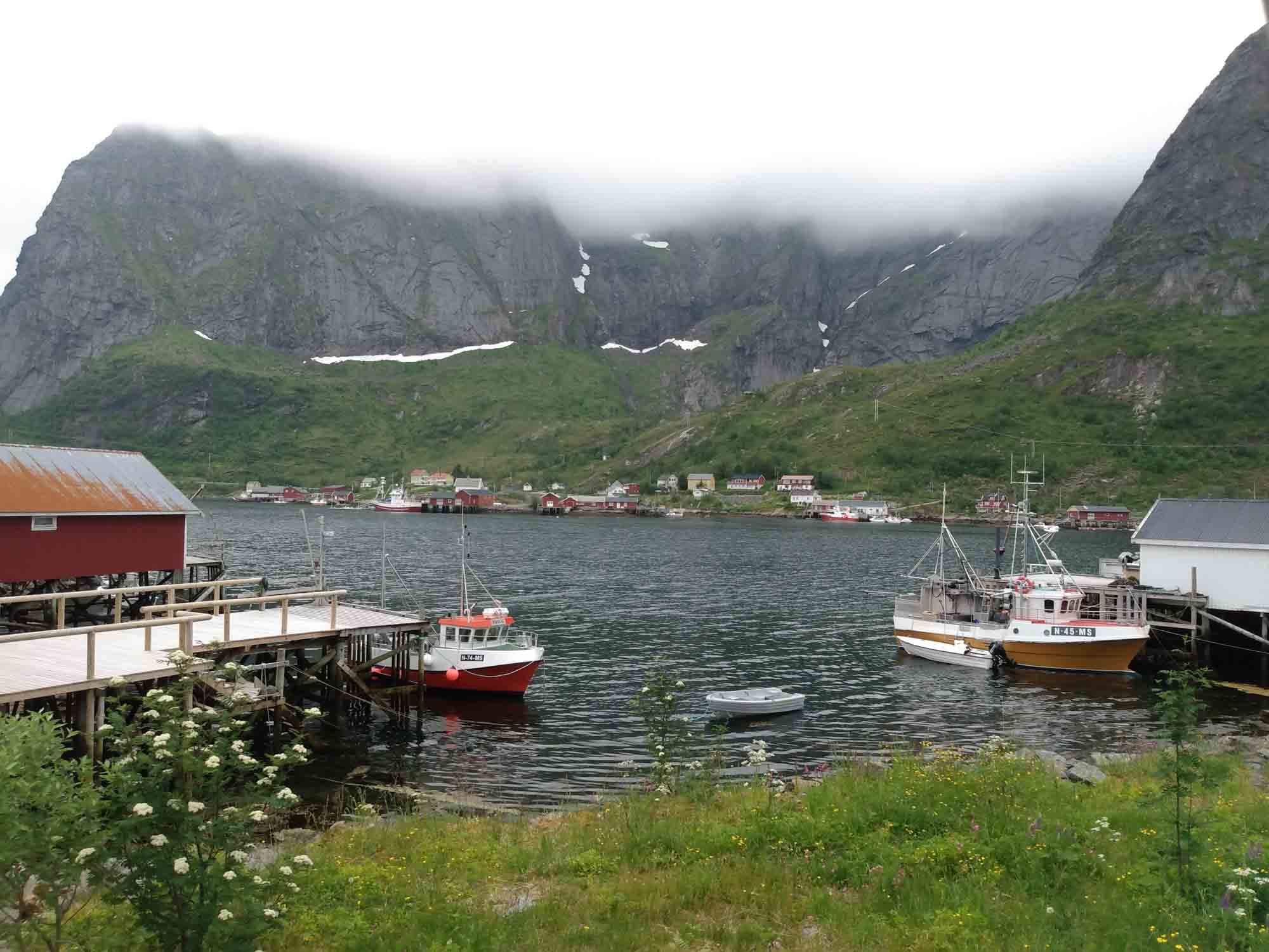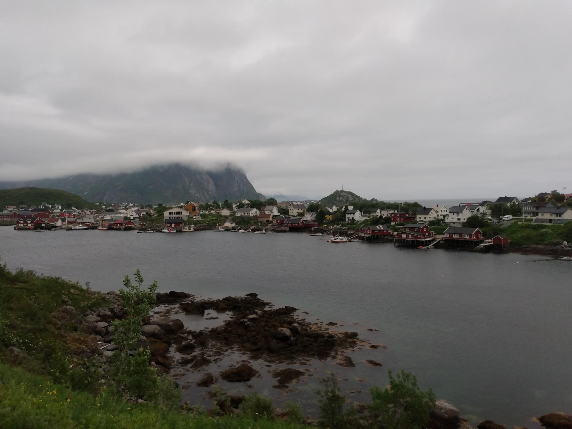 Die Wolken hängen tief in den Bergen des Fjords, an dem wir übernachtet hatten. Gut, dass wir den Tag gestern für den Strand genutzt haben. Nach dem Spaziergang fuhren wir bereits um 9:30 Uhr los. Als erstes hatten wir eine kleine Wanderung zum Strand von Kvalvika geplant. Als wir allerdings den kleinen Wanderparkplatz erreichtet, war dieser bereits zweireihig gefüllt mit Wohnmobilen und Campervans. Selbst entlang der kleinen Straße war jede Ausweichbucht mit einem Camper besetzt. Entsprechend weit mussten wir fahren, um irgendeine Wendemöglichkeit zu finden. Kein Wunder, dass selbst an Einfahrten zu den Häusern immer wieder "No Camping" Schilder zu finden waren. Uns blieb nichts anderes übrig, als weiter zu fahren. Die Landschaft wirkte mit den tief hängenden Wolken völlig anders als gestern bei blauem Himmel. Dies war auch die perfekte Ausrede, die 1900 Stufen auf den 666 m hohen Reinebringen nicht hochzuwandern. Am leichten Muskelkater, der uns von der letzten Treppenbesteigung noch erhalten geblieben war, lag es ganz bestimmt nicht. Über viele kleine Brüken ging es weiter an Moskenes vorbei zum letzten Ort der Lofoten Å. Dort ergatterten wir den letzten Parkplatz für ei Wohnmobil und spazierten nach Lands End und durch das kleine Dorf. Dabei kamen wir am Fischereimuseum und am Stockfischmuseum vorbei. Danach fuhren wir immer an der Küste entlang nach Solvaer zurück, wo wir die Fähre nach Skutvik nehmen wollten. Je weiter wir Svolvar kamen, umso mehr klarte der Himmel auf. Als wir gegen 16:45 Uhr am Fähranleger ankamen strahlte dann wieder auch schon wieder die Sonne. Die Fähre hatten wir knapp verpasst, sie hatte eine halbe Stunde vorher abgelegt. Also reihten wir uns hinten an die Reihe der wartendenden Fahrzeuge an. Die nächste Fähre sollte um 20:45 Uhr abgehen. Also hatten wir ausreichend Zeit für ein gemütliches Abendbrot und ein paar Spielchen am Fähranleger. Die Fähre kam leicht verspätet, nahm die Fahrzeuge nach Skrova auf und legte dann wieder ab. Jetzt hatten wir auch den Fahrplan verstanden. Die Fähre machte nicht etwa einen Zwischenstopp auf Skrova, sondern fuhr beide Stationen abwechselnd an. Wir mussten also noch weitere zwei Stunden auf unsere Abfahrt warten. Gegen 22:40 Uhr ging es dann tatsächlich los. Während der zweistündigen Überfahrt durften wir nicht im Fahrzeug bleiben, was aber dank kostenlosen und sehr gutem WLan, sowie de fantastischen Aussicht auf die hinter den Lofoten stehende Mitternachtssonne gar kein Problem war. In Skutvik angekommen fuhren wir im Schein der tiefstehenden Mitternachtssonne durch eine sanfte von Nebelschwaden durchzogene mystische Landschaft. Inmitten des Nebels entdeckten wir auf einer Wieser sogar einen Elch. Schließlich entdeckten wir um 1 Uhr morgens auf einer kleinen Nebenstraße eine versteckten kleinen Platz, auf dem wir uns kurzerhand stellten. Dann machten wir die Vorhänge zu und stellten die Nacht an.