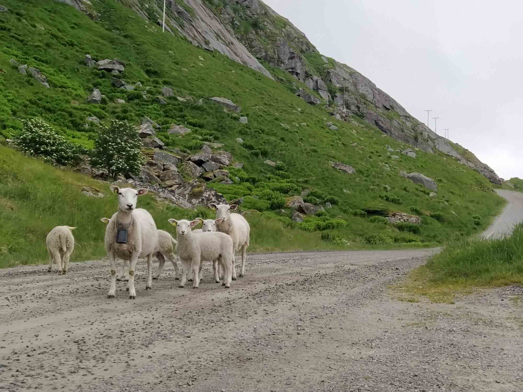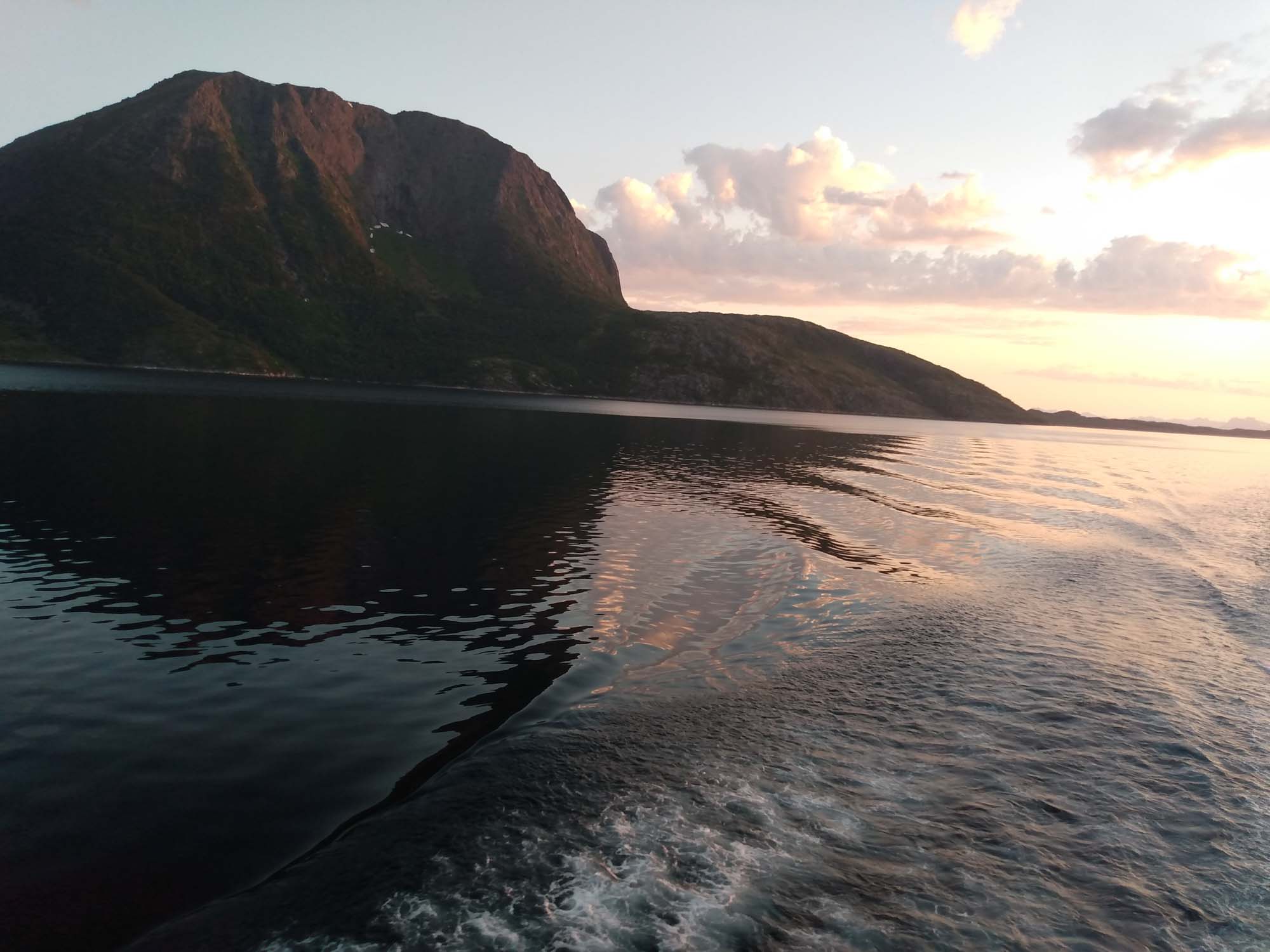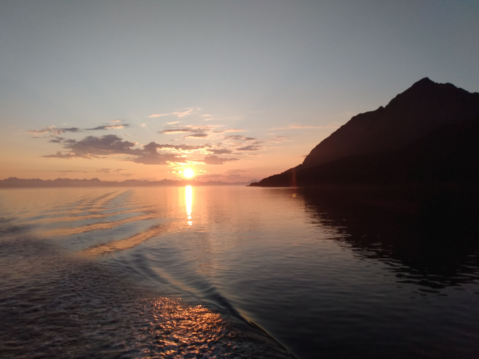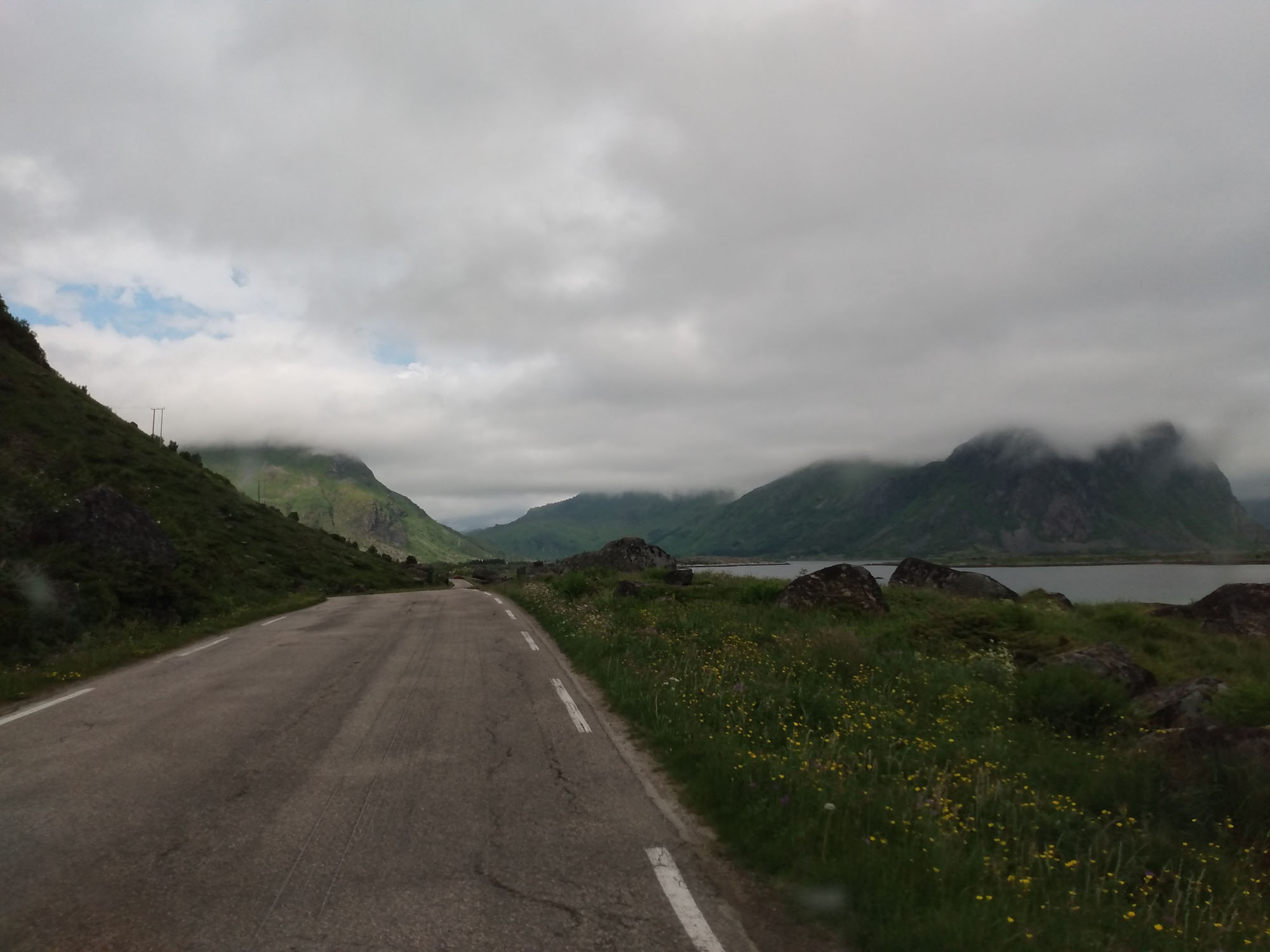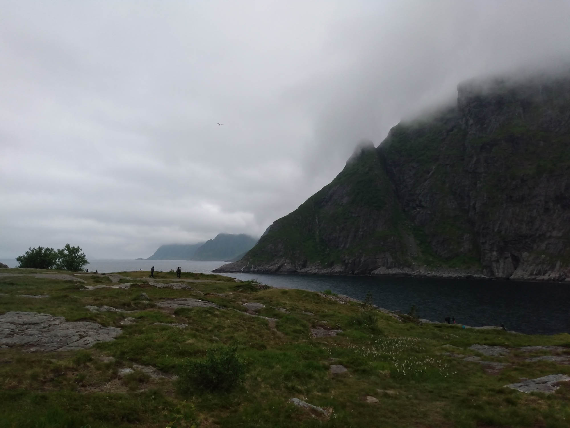 Die Wolken hängen tief in den Bergen des Fjords, an dem wir übernachtet hatten. Gut, dass wir den Tag gestern für den Strand genutzt haben. Nach dem Spaziergang fuhren wir bereits um 9:30 Uhr los. Als erstes hatten wir eine kleine Wanderung zum Strand von Kvalvika geplant. Als wir allerdings den kleinen Wanderparkplatz erreichtet, war dieser bereits zweireihig gefüllt mit Wohnmobilen und Campervans. Selbst entlang der kleinen Straße war jede Ausweichbucht mit einem Camper besetzt. Entsprechend weit mussten wir fahren, um irgendeine Wendemöglichkeit zu finden. Kein Wunder, dass selbst an Einfahrten zu den Häusern immer wieder "No Camping" Schilder zu finden waren. Uns blieb nichts anderes übrig, als weiter zu fahren. Die Landschaft wirkte mit den tief hängenden Wolken völlig anders als gestern bei blauem Himmel. Dies war auch die perfekte Ausrede, die 1900 Stufen auf den 666 m hohen Reinebringen nicht hochzuwandern. Am leichten Muskelkater, der uns von der letzten Treppenbesteigung noch erhalten geblieben war, lag es ganz bestimmt nicht. Über viele kleine Brüken ging es weiter an Moskenes vorbei zum letzten Ort der Lofoten Å. Dort ergatterten wir den letzten Parkplatz für ei Wohnmobil und spazierten nach Lands End und durch das kleine Dorf. Dabei kamen wir am Fischereimuseum und am Stockfischmuseum vorbei. Danach fuhren wir immer an der Küste entlang nach Solvaer zurück, wo wir die Fähre nach Skutvik nehmen wollten. Je weiter wir Svolvar kamen, umso mehr klarte der Himmel auf. Als wir gegen 16:45 Uhr am Fähranleger ankamen strahlte dann wieder auch schon wieder die Sonne. Die Fähre hatten wir knapp verpasst, sie hatte eine halbe Stunde vorher abgelegt. Also reihten wir uns hinten an die Reihe der wartendenden Fahrzeuge an. Die nächste Fähre sollte um 20:45 Uhr abgehen. Also hatten wir ausreichend Zeit für ein gemütliches Abendbrot und ein paar Spielchen am Fähranleger. Die Fähre kam leicht verspätet, nahm die Fahrzeuge nach Skrova auf und legte dann wieder ab. Jetzt hatten wir auch den Fahrplan verstanden. Die Fähre machte nicht etwa einen Zwischenstopp auf Skrova, sondern fuhr beide Stationen abwechselnd an. Wir mussten also noch weitere zwei Stunden auf unsere Abfahrt warten. Gegen 22:40 Uhr ging es dann tatsächlich los. Während der zweistündigen Überfahrt durften wir nicht im Fahrzeug bleiben, was aber dank kostenlosen und sehr gutem WLan, sowie de fantastischen Aussicht auf die hinter den Lofoten stehende Mitternachtssonne gar kein Problem war. In Skutvik angekommen fuhren wir im Schein der tiefstehenden Mitternachtssonne durch eine sanfte von Nebelschwaden durchzogene mystische Landschaft. Inmitten des Nebels entdeckten wir auf einer Wieser sogar einen Elch. Schließlich entdeckten wir um 1 Uhr morgens auf einer kleinen Nebenstraße eine versteckten kleinen Platz, auf dem wir uns kurzerhand stellten. Dann machten wir die Vorhänge zu und stellten die Nacht an.