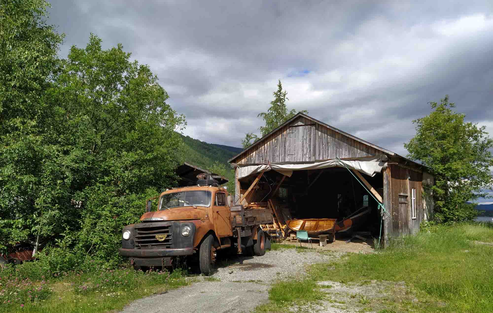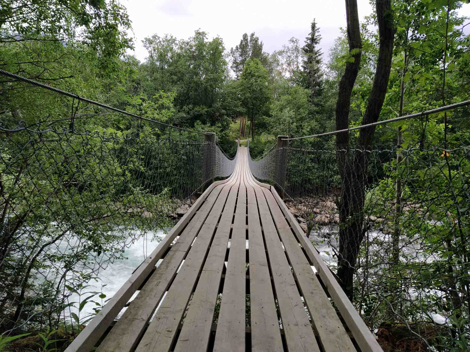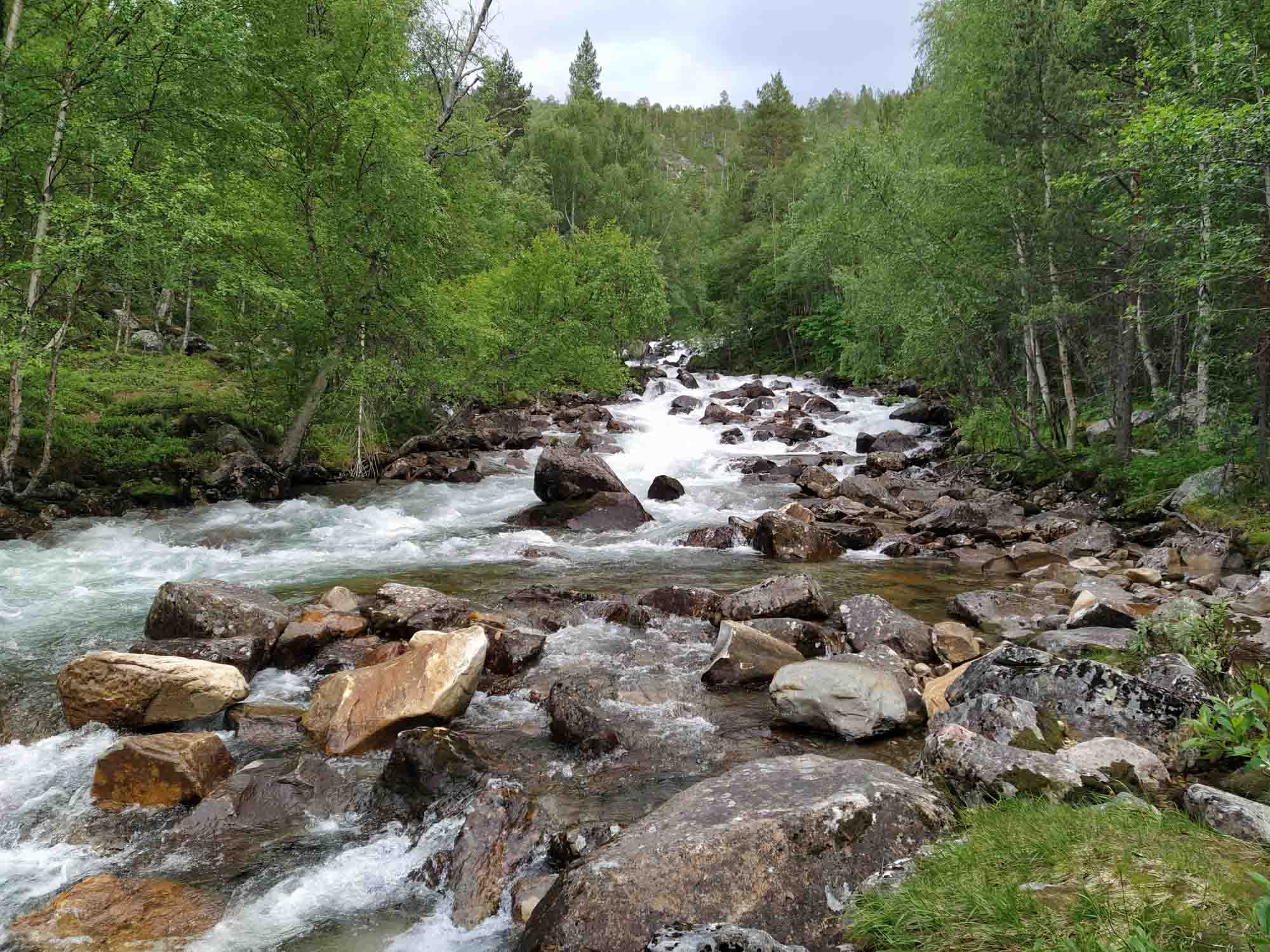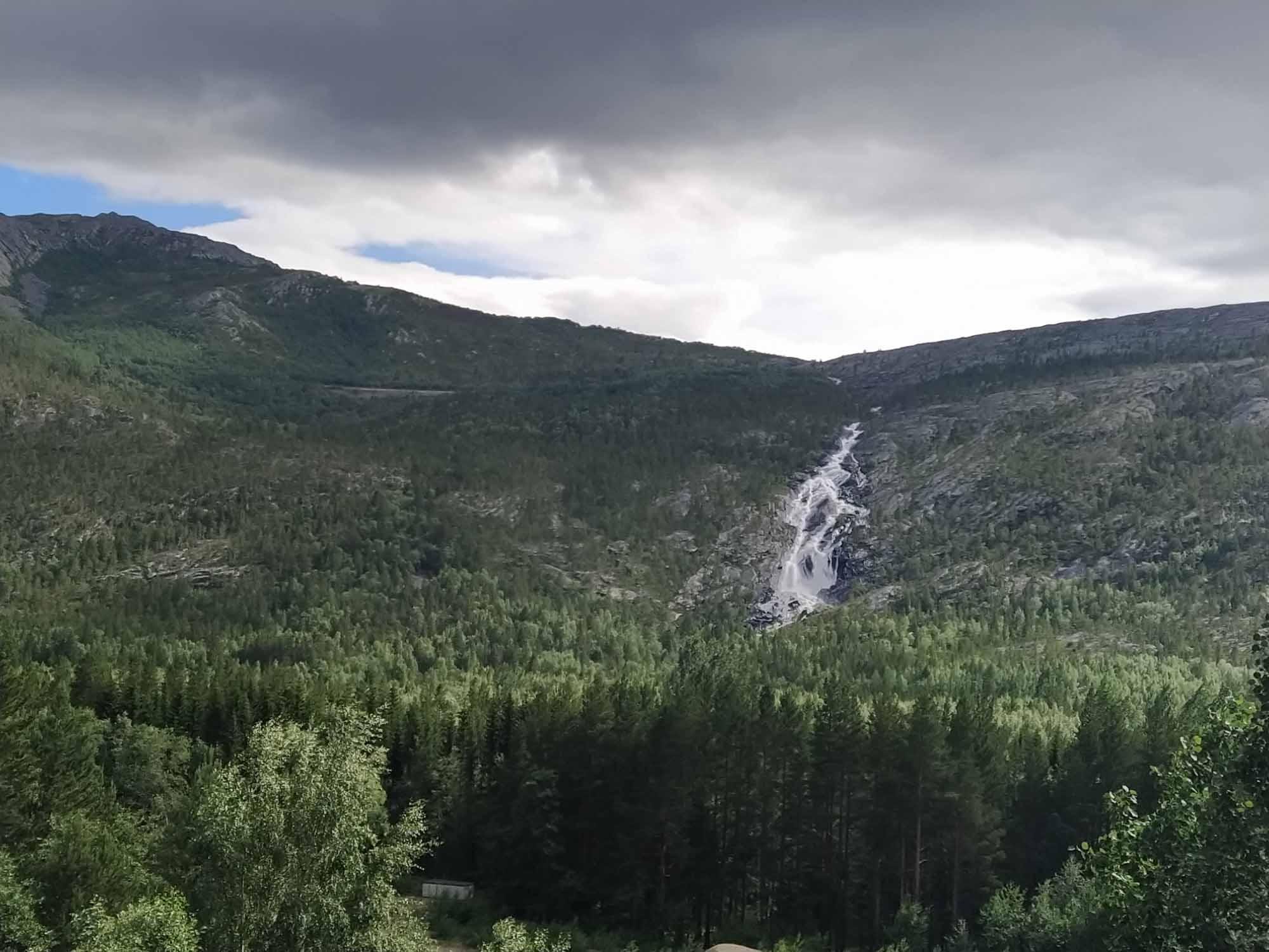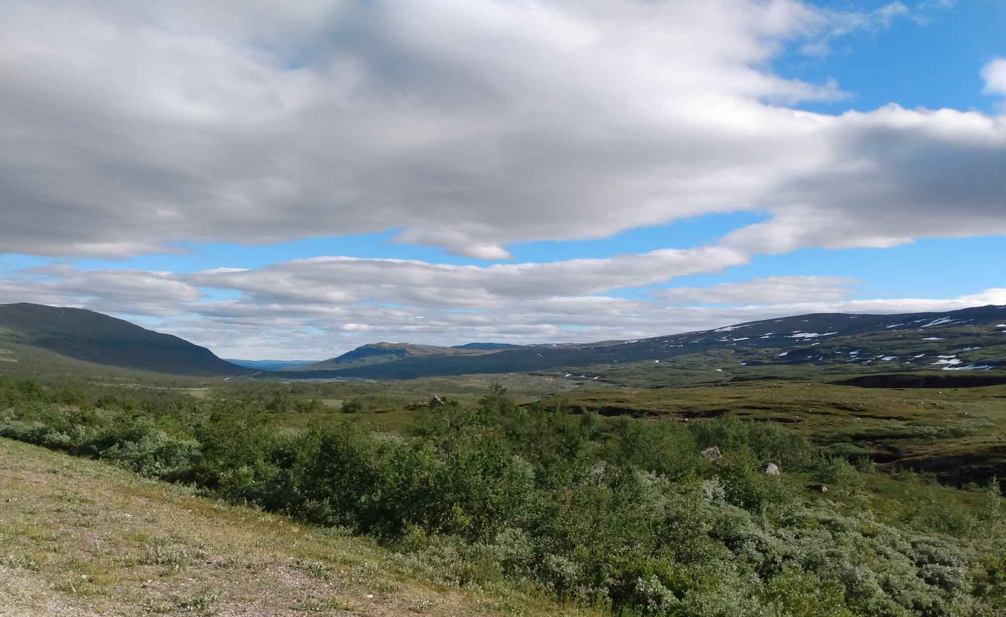 Wir wurden von der Müllabfuhr geweckt, die die Mülleimer auf dem Picknickplatz leerten, an dem wir standen. Als dann auch noch die Reinigungskräfte kamen, die sich um die Toiletten kümmerten, war die Nacht endgültig vorbei. Der Spaziergang war heute ein Klettergang über die Felsen am Ufer des Fjords entlang bis zur Brücke und zurück. Selbst für Berta war die Granitbrocken sehr glatt und wir rutschten abwechselnd darauf aus. Dann ging es weiter. Leider hatte Berta bei der ersten Fahrt wieder große Angst und auch das Füttern während der Fahrt half nicht weiter. Nachdem wir in Rognan einkaufen und noch einmal mit ihr Spazieren waren, ging es ihr besser und wir konnten die weitere Fahrt entlang der E6 nach Süden genießen. Unser Zeil war der Nationalpark Saltfjellet-Svartisen wo wir eine 5 km lange Rundwanderung am Kjemåfossen vorbei machten. Der Weg war einfach und Berta blieb diesmal an der Leine. Das war auch gut, denn bereits nach den ersten 100 m lief ein Elch über den Weg und über die angrenzende Wiese bevor er wieder im Wald verschwand. Die erste Hängebrücke mochte Berta nicht überqueren. Vermutlich wusste sie bereits, dass wir uns eigentlich nur den darunter brausenden Fluß ansehen wollten. Die zweite, entlang des Weges, ging sie dann aber auf eigenden vier Pfoten hinüber. Nach dem Spaziergang bogen wir ab und fuhren in Richtung der Reichsgrenze. Es war erstaunlich, wie schnell sich die Landschaft veränderte, als wir wieder in Schweden waren. Wir waren erst durch einen Tunnel und dann durch ein enges Tal entlang eines Baches den Berg hinauf gefahren. Dann kam der Pass und die Grenze. Und danach öffnete sich das Land und wir bestaunten eine zwar hügelige aber weithin übersehbare Fläche mit Wiesen, Wald und Seen und vor allem keinerlei Zivilisation. So brauchten wir auch nicht mehr lange, bis wir einen größeren Parkplatz zwischen der Straße und einem großen See fanden den wir in der Nacht mit vier weiteren Wohnmobilen teilten. Es gab auch keine Mülleimer, so dass wir nicht beführchten mussten, morgens wieder zu früh aus den Federn geholt zu werden.