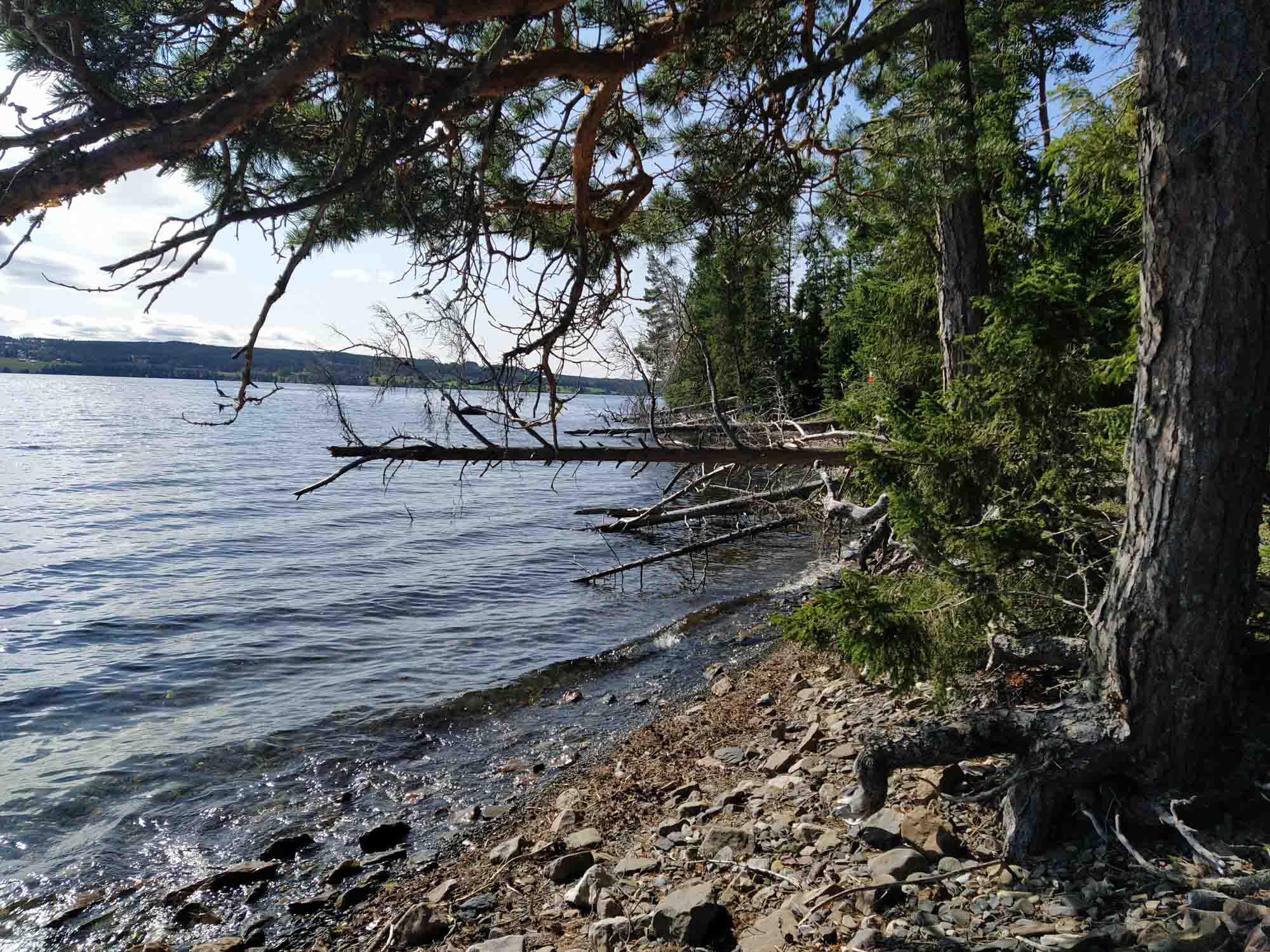 Dies Sonne schien endlich wieder richtig und der Himmel war strahlend blau. Genau richtig für eine morgendliche Wanderung. Rings um das Sperrgebiet gab es einen 7 km langen Weg, der immer entlang des Ufers führte. Wie in Schweden üblich die meiste Zeit über die Wurzeln der Bäume, die bis zum schmalen Kiessrand herunter reichten. Es gab aber auch einige Stege und Brücken. Allerdings immer an einem Holzzaun entlang, hinter dem alle 10 m ein Schild prankte, dass das Betreten des Gebiets dahinter verboten und extrem gefährlich sei. Als wir wieder zurück waren, war es bereits halb zwölf. Eine Stunde später hatten wir gefrühstückt und wir fuhren los. Den ersten Halt machten wir nach 30 Minuten auf einem Parkplatz an der Straße mit Blick auf einen Ausläufer des Starsjön, den großen meerähnlichen See bei Östersund. Danach ging es mit einer kurzen Unterbrechung zum Benzin und Wasser tanken kurz vor dem Ziel weiter bis zu eimem Angelplatz bei Åsarna, den wir uns ausgesucht hatten, um hier das Wochenende zu verbringen. Zum Glück stand hier noch niemand und wir hatten den Platz für uns. Dachten wir zumindenst. Kaum 5 Minuten später kam ein Campervan aus Deutschland und stellte sich fast direkt neben uns. Offensichtlich hatten sie jedoch einen ähnlichen Gedanken wie wir gehabt denn weitere 5 Minuten später waren sie schon wieder weg. Wir machten es uns gemütlich und heizten den Grill an, auf den wir uns schon so lange gefreut hatten. Dabei stellten wir fest, dass unsere Gasflasche mittlerweile fast leer war. In Schweden ist die Versorgung mit Gas, zumindest, wenn man eine Flasche befüllen lassen will, ziemlich schlecht. Im Norden noch schlechter als im Süden. Auf dem gesamten Weg von Norwegen, bis nach Östersund gab es keine einzige Gasstation und die nächste, die auf unserem Weg liegt, ist in Fallun. Bis dahin werden wir noch mindestens zwei Wochen brauchen. Gut, dass wir eine weitere Flasche dabei haben. Bis auf ein gelegentliches Auto, das einmal um unseren Platz herum- und dann unverrichteter Dinge wieder wegfuhr, blieben wir bis zum Schlafengehen allein. Als es soweit war, fing es langsam an zu Regnen und wir schliefen beim Tröpfeln des Regens auf unser Dach ein, das das leise Geräusch der Stromschnellen des Flusses neben uns übertönte.