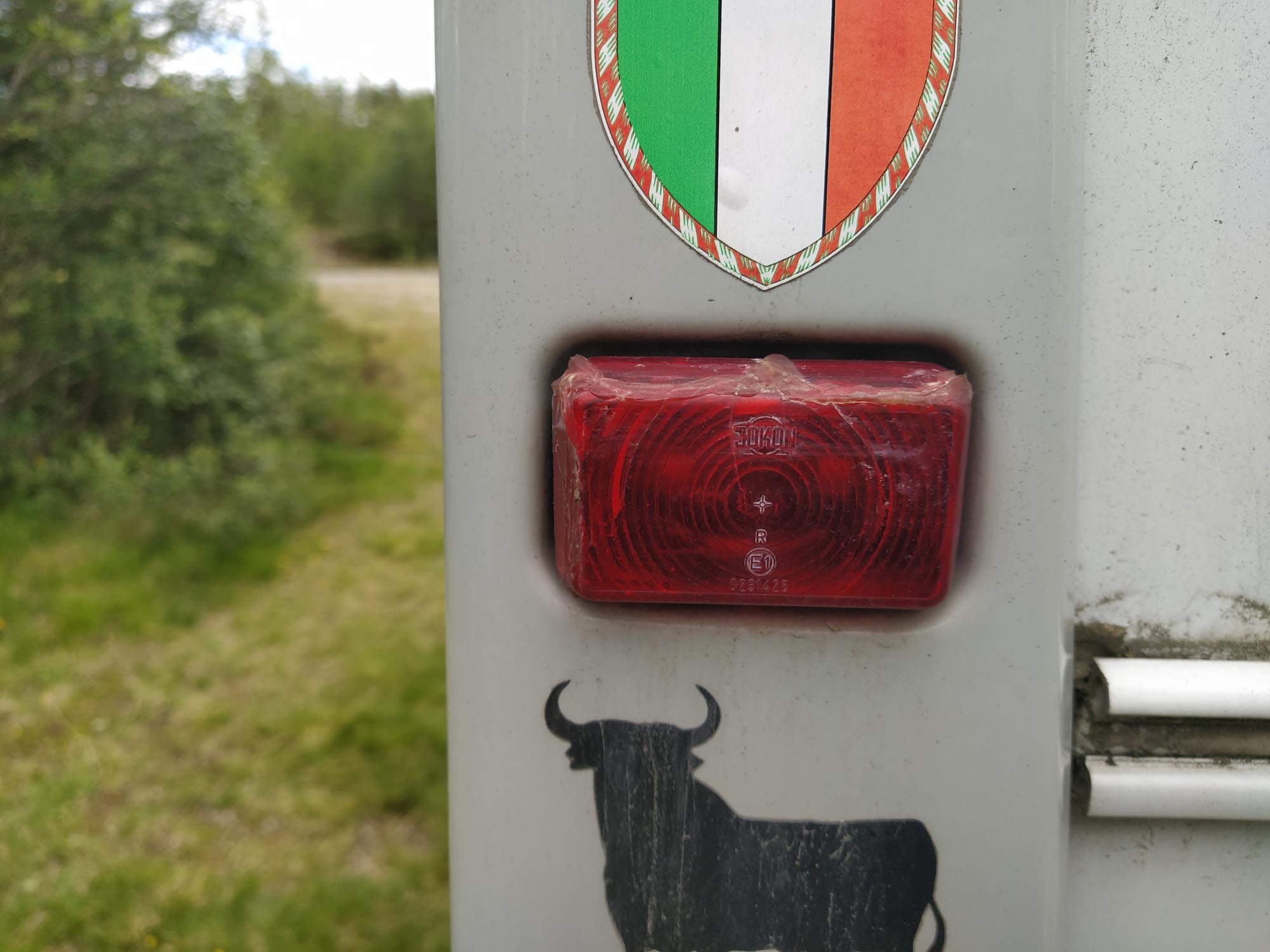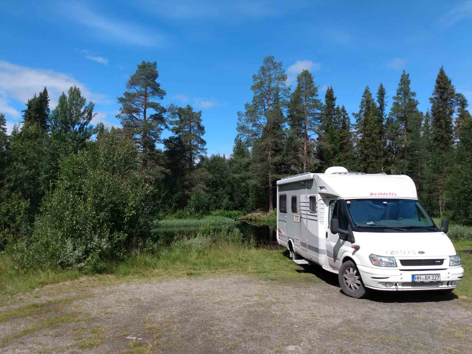 Als wir morgens aufwachten, regnete es gerade fürchterlich. Also blieben wir noch etwas länger liegen. Gegen 11:30 Uhr hatte es aufgehört und wir konnten mit unserem ersten Spaziergang beginnen. Da es schon so spät war und es an unserem nächsten Ziel, dem Wasserfall bei Fulufjället, den ganzen Tag regnen würde, entschieden wir uns einfach hier zu bleiben. Bis auf einen gelegentlichen Schauer blieb es sonnig, aber aber trotzdem zu kühl, um draußen zu sitzen. Wir nutzten den Tag für die Reparatur unseres Brems- und Rückfahrlichts. Dabei stellten wir außerdem fest, das die Abdeckung der oberen Rückleuchte fehlte. Das konnten wir nicht reparieren und klebten es als Regenschutz ab. Hin und wieder hielt ein Auto, die Leute angelten kurz und verschwanden dann wieder. Gefangen hatte keiner etwas. Es wäre auch ein großer Zufall gewesen, hätte sich ein Fisch in diesen eher an einen Dorftümpel erinnernden See verirrt, anstatt im naheliegenden Fluß in der Strömung zu schwimmen.