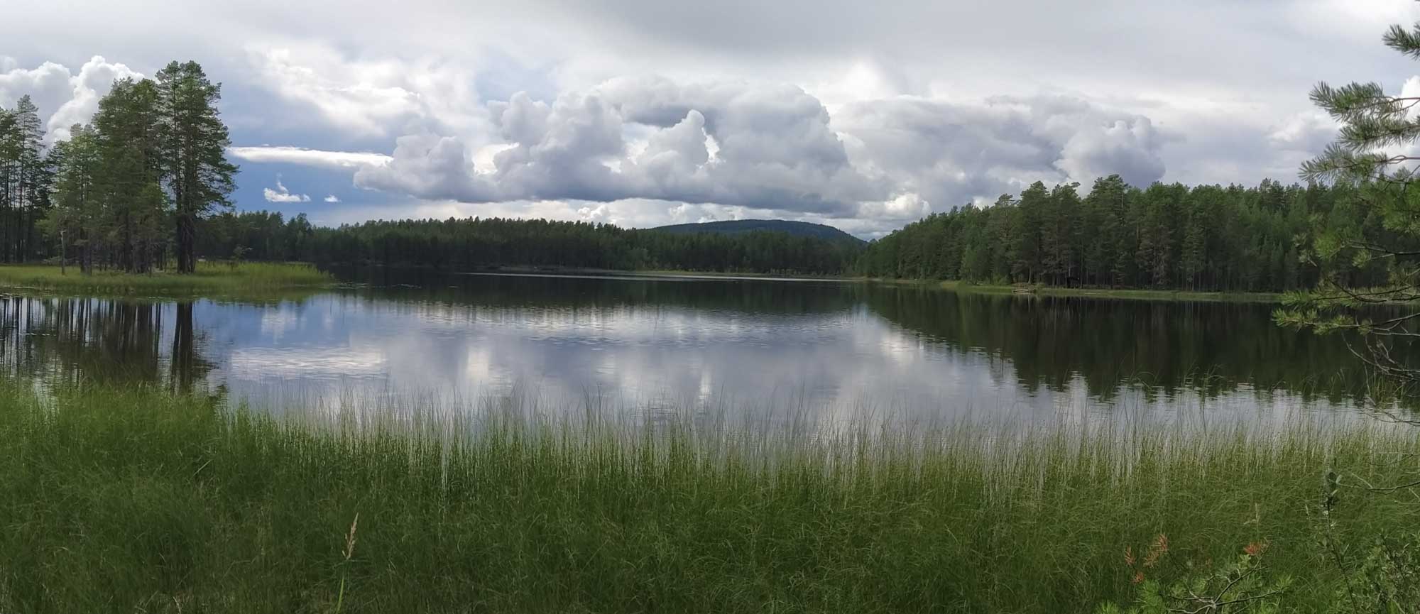 Den Morgenspaziergang bekamen wir gerade noch so hin. Dann kam auch schon wieder der Regen. Wir wussten aber, dass er nur ein wenig weiter südlicher aufhören würde. Also fuhren wir los, tankten zwischendurch ein wenig Wasser und fanden nur 50 km weiter einen wunderschönen Platz am See Ätjärnen, den wir noch von unserer letzten Reise kannten. Nun aber mit Hund bekamen wir ihn völlig neu zu sehen. Nachdem der Abfluss wieder auseinandergenommen und gereinigt war und eine letzte Regendusche über uns hinweggezogen war, kam endlich die Sonne heraus und wir machen einen wunderschönen Spaziergang um den See herum. Entlang des Weges stand, wie eigentlich überall in Schweden, alles voller Blaubeerbüsche, die jetzt endlich reif waren. So hatten wir unterwegs regelmäßig eine kleine blaue süße Stärkung. Berta genoss es, frei vorwegzulaufen und wir genossen den herrlichen Sonnenschein und die wunderbare Stille am See.