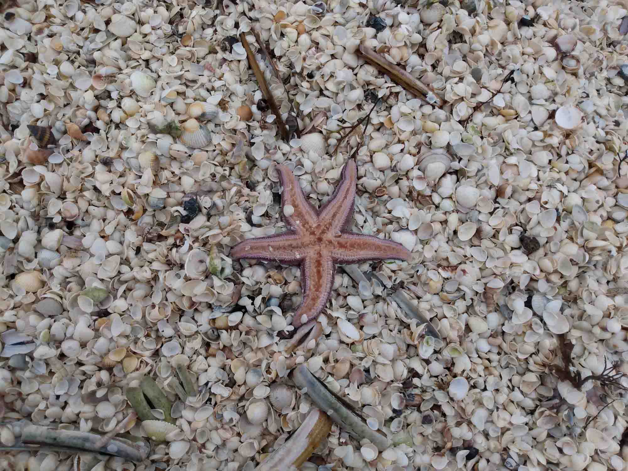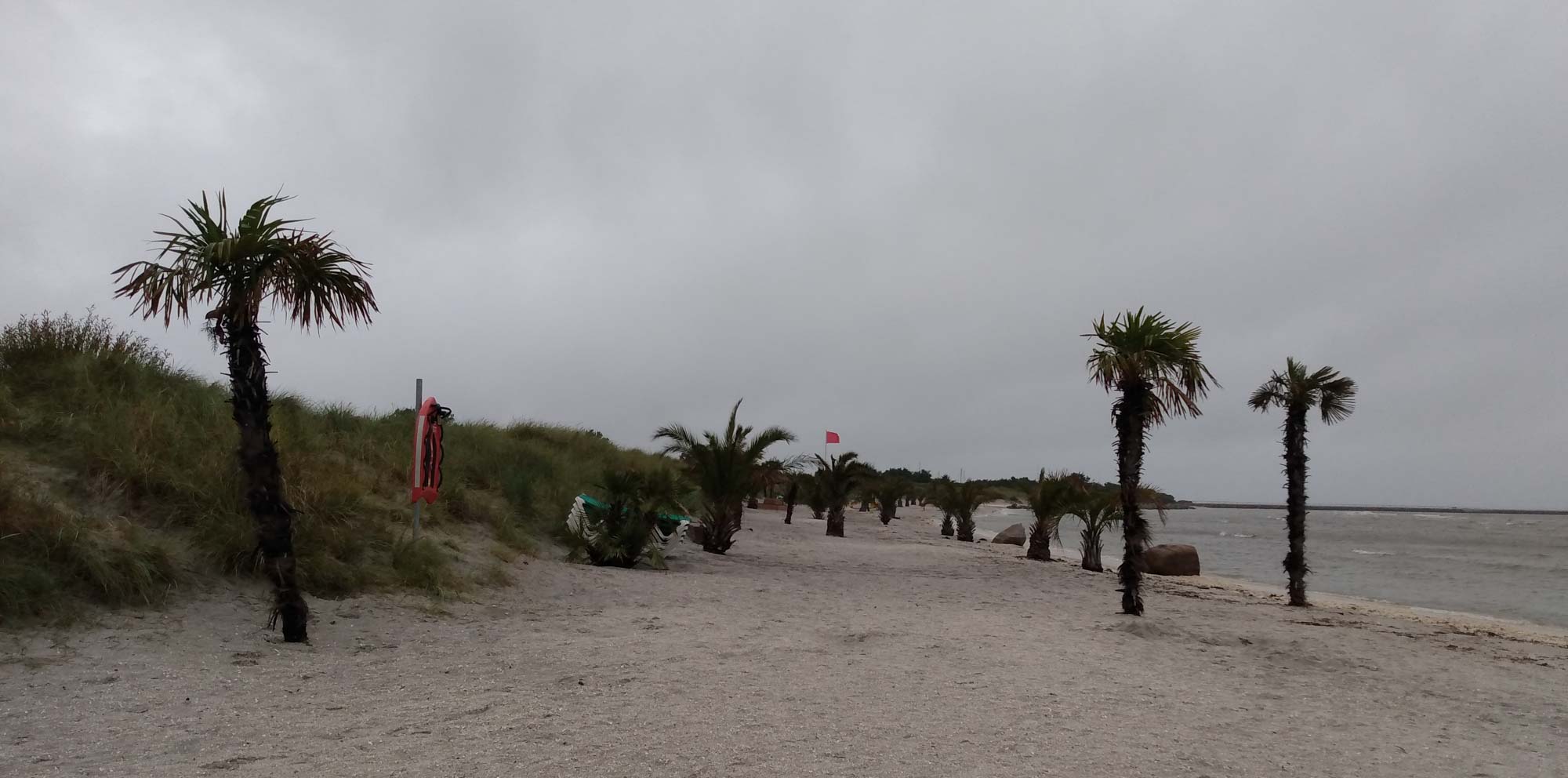 Wir hatten es auch heute nicht eilig, aufzustehen. Gegen 11:30 Uhr wollte Berta dann aber doch raus und wir machten eine Runde um den zweiten, größeren See. Der Himmel war vollständig bedeckt, aber immerhin regnete es nicht. Bei der Weiterfahrt hatten wir dann herrlichsten feinen Sprühregen aus einer vollkommen grauen Wolkendecke. Als erstes fuhren wir nach Sæby zum Einkaufen. Danach weiter nach Frederikshavn, am Fährhafen der Stena Line vorbei zum Palmenstrand nördlich der Stadt. Dort machten wir im Nieselregen einen kleinen Strandspaziergang und stellten uns vor, wie schön die Palmen, Muscheln und Seesterne wohl aussehen würden, wenn die Sonne schiene. Aber dann wäre es wohl nicht so leer gewesen. Ein kleines Stück weiter nördlich fanden wir dann einen Parkplatz direkt am Strand, an dem wir tatsächlich schon wieder alleine stehen konnten. Und wir hatten befürchtet, in Dänemark keine schönen Plätze finden zu können. Wir freuten uns schon auf den Strandspaziergang am nächsten Morgen.
