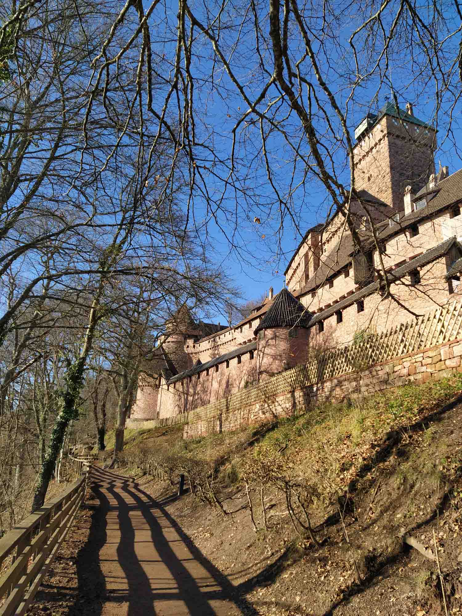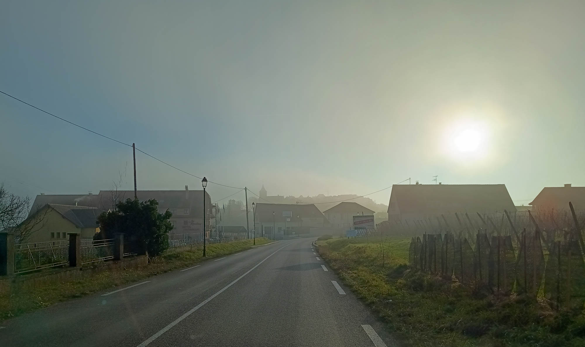 Morgens wurden wir von Schüssen geweckt. Solange wir im Bett waren, interessierte sich Berta dafür nicht. Aber als wir versuchten unseren Morgenspaziergang zu machen, hörten wir auch die Stimmen der Männer unweit unseres Nachtplatzes. Sie waren wohl etwas unterhalb zwischen den Weinreben auf Hasenjagt. Entsprechend kurz fiel der Spaziergang aus und wir fanden uns kurzerhand im Bett mit Berta kuschelnd wieder. Nach dem Frühstück fuhren wir die knapp 8 km bis zur Burg Haut-Königsburg hinauf und bekamen bei herrlichstem Sonnenschein einen tollen Blick auf den unter uns liegenden Nebel. Eigentlich kann man von hier nach links bis nach Straßburg und nach rechts bis nach Colberg sehen, die beide auf der den Vogesen vorgelagerten Ebene liegen. Aber alles unterhalb des Berges, auf dem wir standen blieb unter einem riesigen Meer aus Wolken verborgen. Der Spaziergang war herrlich und wir konnten einmal um die eindrucksvolle Burg herumgehen. Der Zutritt blieb uns jedoch verwehrt: Hunde waren mal wieder nicht willkommen. Am frühen Nachmittag machten wir uns auf die Weiterfahrt und tauchten bald in den Nebel ab. Die Landschaft wurde wunderbar gespenstisch und von der Sonne war nur noch ein heller Fleck zu sehen. Alles wirkte schemenhaft und irgendwie gedämpft. Unser nächstes Ziel war das Örtchen Keysersberg, das sehr hübsch sein soll. Vor allem offensichtlich an einem Sonntag zur Weihnachtszeit, wo es dort wahrscheinlich einen fantastisch gemütlichen Weihnachtsmarkt gibt. In Anbetracht der langen Autoschlange, die sich an der Anfahrt zu dem kleinen Ort versuchte und der Größe unseres Wohnmobils und der damit verbundenen Schwierigkeit, einen passenden Parkplatz zu finden, zogen wir es vor zu wenden und nach Colberg zu einem E. LeClerc zu fahren, unserem lange vermissten Supermarkt. Dort kauften wir nach herzenslust ein und freuten uns über das üppige Angebot an frischen Backwaren und natürlich der Fischtheke. Wir bekamen sogar einen Weinschlauch von unserem gerade leer gewordenen Lieblingswein. Als wir wieder herauskamen war es noch eine halbe Stunde bis zum Sonnenuntergang. Wir hatten uns 20 Minuten entfernt einen Übernachtungsplatz im Nationalpark ausgesucht und freuten uns gemeinsam mit Berta auf einen schönen Spaziergang bei Sonnenuntergang. Leider hatten wir unsere Planung nicht mit dem französischen Straßenbauamt abgestimmt. Das hatte nämlich leider die Straße, die an drei Burgen und unserem Übernachtungsplatz vorbeiführt für die Zeit vom 1.11. bis zum 31.3. gesperrt. Unseren Spaziergang machten wir trotzdem, sogar etwas länger als geplant bis in die Dunkelheit hinein, nachdem wir den Wagen unweit der Straßensperrung am Seitenstreifen abgestellt hatten. Danach mussten wir noch eine halbe Stunde weiter fahren bis wir zu unserem tatsächlichen Übernachtungsplatz kamen. Hierzu mussten wir noch eine steile schmale Straße überwinden und uns zwischen zwei Häusern hindurchquetschen. Zum Glück kam uns niemand entgegen und hoffentlich wird das morgen bei der Weiterfahrt auch so sein. Rückwärts möchten wir jedenfalls beide auf diesem schmalen Weg am Abhang nicht fahren. Dann bereiteten wir uns ein leckeres Abendbrot bestehend aus Fisch mit Bratkartoffeln zu und ließen es uns bei einen Becher Glühwein schmecken. So schön kann Frankreich sein.