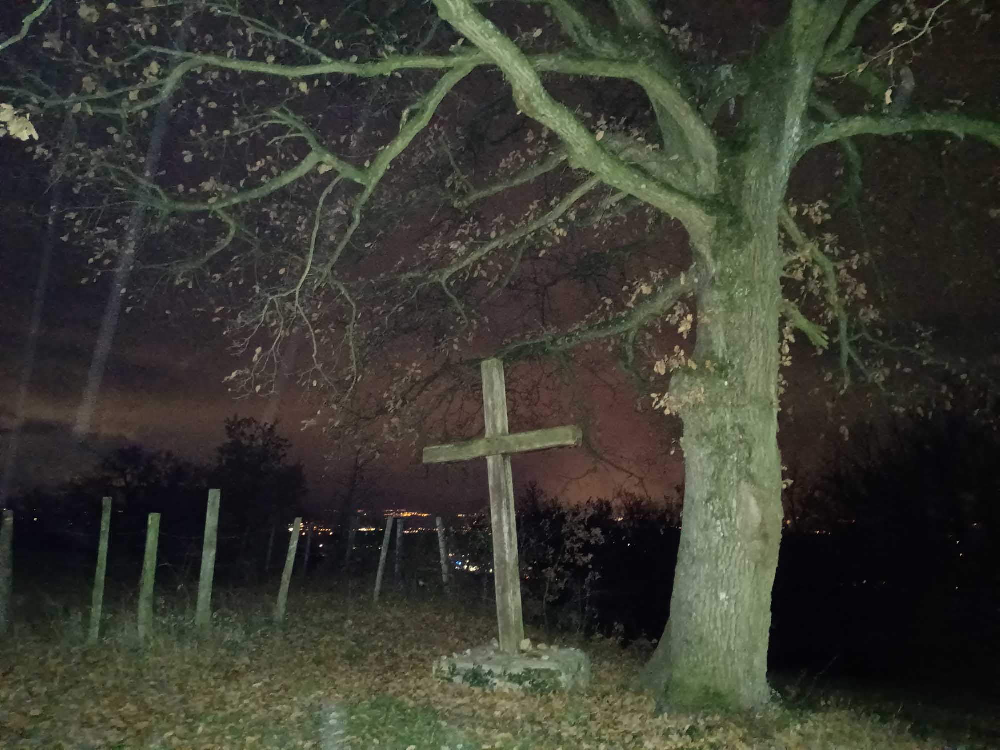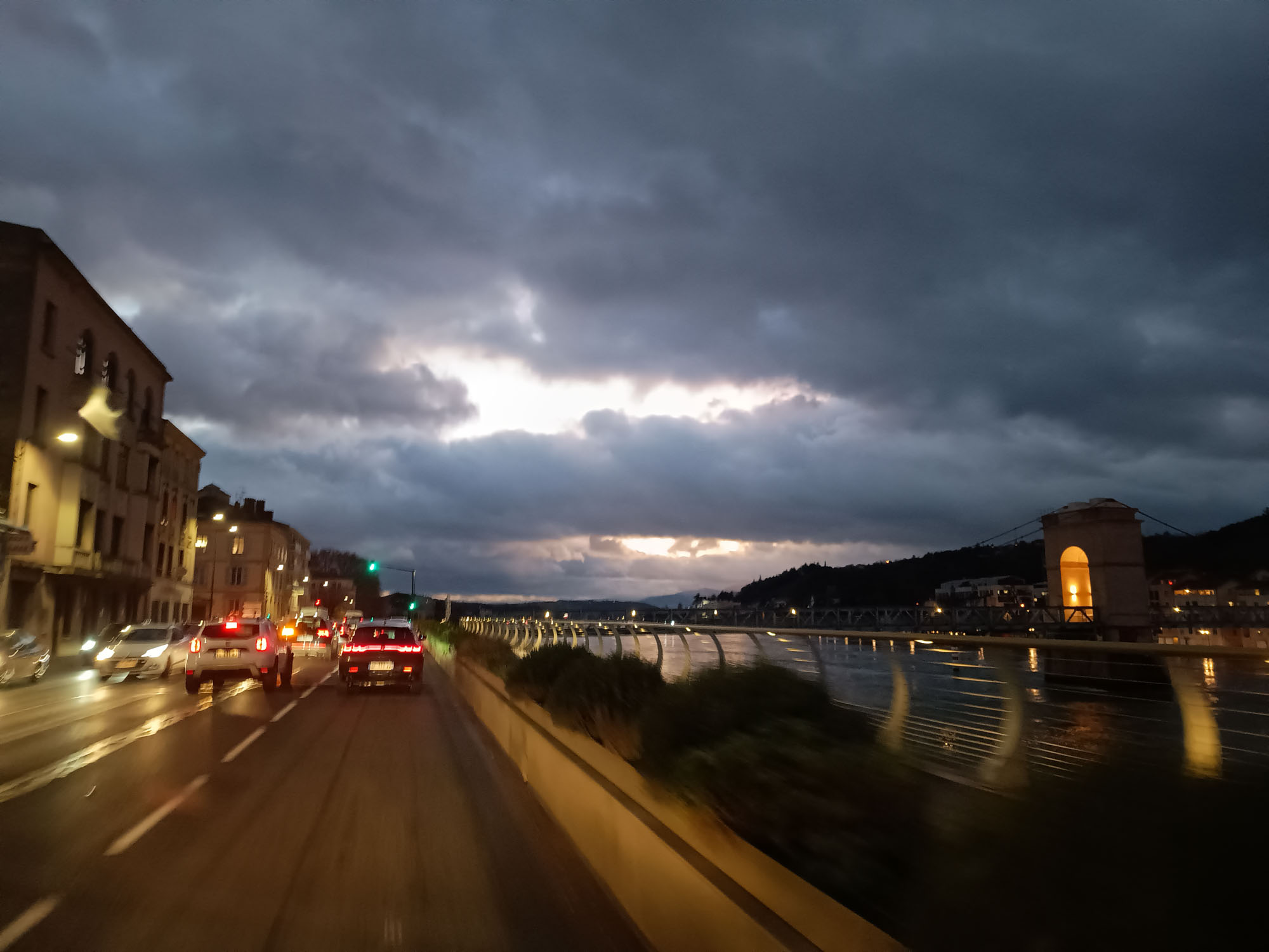 Der Tag begann eigentlich schon in der Nacht und das ziemlich unerfreulich. Als wir Abends fernsahen, ging plötzlich alles aus. Die Wohnraumbatterie hatte sich verabschiedet. Und das nach nur zwei Tagen stehen. Schnell stellten wir fest, dass eine der 4 Zellen eine deutlich niedrigere Spannung hatte als die anderen drei. Offensichtlich hat die Batterie durch den intensiven Gebrauch des stromfressenden Wasserkochers einen Schaden davongetragen. Und wir müssen jetzt mit deutlich weniger Kapazität zurechtkommen, als wir bisher hatten. Wenn wir Glück haben. Sollte es schlecht laufen, könnte die Batterie sogar ganz ausfallen. Wir veränderten noch die Abschaltspannung der Batterie und quetschten so noch ein paar Ampere heraus. Zumindest soviel, dass es beinahe für die ganze Nacht heizen gereicht hat. Als wir um 9:30 Uhr aufstanden, war auch dieses letzte Bisschen verbraucht und die Batterie war wieder aus. Nach dem Morgenspaziergang mussten wir daher den Wagen für 20 Minuten laufen lassen, um wieder ein wenig Energie zu tanken. Über die Solarpanels kommt im Winter bei bedecktem Himmel leider so gut wie nichts rein. Das war im Sommer in Schweden irgendwie anders. Aber nach 20 Minuten war zumindest soviel da, dass wir wieder Wasser für unseren Kaffee aus dem Wasserhahn bekamen. Danach machten wir einen ausgiebigen Spaziergang und dann ging es wieder los. Da Berta in den letzten Tagen wieder so viel Angst gehabt hat, wollten wir heute einiges anders machen. Wir hatten ihr aus einer Weidenrute und einer Decke eine kleine Höhle gebaut, um sie ein wenig von den vorbeihuschenden Autos und der Landschaft abzuschirmen. Aber irgendwie mochte sie das gar nicht und nach 10 Minuten bauten wir das schnell wieder ab. Obwohl sie anfangs noch ein wenig zitterte, beruhigte sie sich heute wieder und wir konnten ohne anzuhalten eine ganze Weile fahren. Unser erstes Ziel war ein E.LeClerc Supermarkt für unsere Feiertagseinkäufe im Westen von Lyon. Bis dort brauchten wir eine knappe Stunde, nur um dann festzustellen, dass der Parkplatz ein Parkhaus mit Höhenbeschränkung war. Also mussten wir zum nächsten Supermarkt in Vienne weiterfahren, der eine weitere Stunde entfernt war. Und Berta ging es gut. Die ganze Zeit hatte sie keine Angst mehr, legte sogar ihr Köpfchen ab. Zwar nicht in ihrem Körbchen sondern auf Michaels Hand. Aber immerhin. Nachdem wir alles eingekauft hatten, war es dann aber nicht mehr weit bis zu einem Platz auf einem Berg südlich der Stadt. Als wir dort ankamen war es schon wieder dunkel. Mit Taschenlampen bewaffnet machten wir trotzdem noch einen kleinen Spaziergang bevor wir uns das französische Abendbrot schmecken ließen: Baguette, Gänseleberpastete, Austern und einen leckeren allerdings Deutschen Wein. Die Batterie war auch wieder voll geladen und wir hofften, dass sie zumindest einen Fernsehabend durchhalten würde.