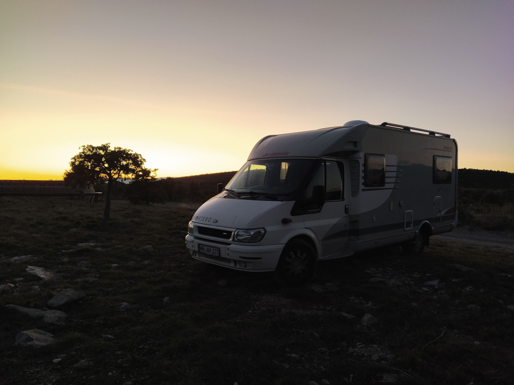 Der kleine Weg, an dem wir übernachtet hatten, hieß Weg zum Jäger. Das hätte uns zu denken geben können. Und tatsächlich kamen morgens zwei Jäger, parkten ihre Wagen etwas weiter unten am Weg und nach einiger Zeit waren Schüsse zu hören. Unsere erste Sorge galt jedoch unserer Batterie. Immerhin hatte sie die Nacht über durchgehalten und die Heizung war diesmal an geblieben. Zumindest ein Zeichen der Hoffnung. Der Spaziergang am Morgen war auch sehr schön. Die Jöger waren weit genug weg und wir genossen die herrliche Ruhe am Morgen. Bei der Weiterfahrt hatte Berta anfänglich wieder etwas Angst, die sich aber zum Glück bald legte. An einem Weingut legten wir eine kleine Pause ein und nutzten die Gelegenheit, etwas Wasser abzulassen. Kurze Zeit später konnten wir an einem Brunnen sogar unseren Trinkwasservorrat wieder auffüllen. Je weiter wir nach Süden kamen, umso mehr kam die Sonne heraus und so hielten wir noch einmal für einen Spaziergang an der Rhone entlang. Wie hatten wir uns nach der Sonne gesehnt. Und so genossen wir die Weiterfahrt durch die Berge der Ardèche in die wir kurz hinter Valence abgebogen sind. Die Straße schlängelte sich wunderschön durch die Berge. Diesmal erreichten wir unseren Stellplatz noch in der Dämmerung. Ein wunderschön einsam gelegener Ort inmitten der nach Thymian duftenden Berglandschaft der Ardèche. Dann machten wir noch einen ersten Erkundungsspaziergang, bevor wir uns ein fantastisches Abendbrot mit selbstgemachten Fischstäbchen und Bratkartoffeln zauberten. Was für ein fantastischer Abschluss für einen tollen Tag.
