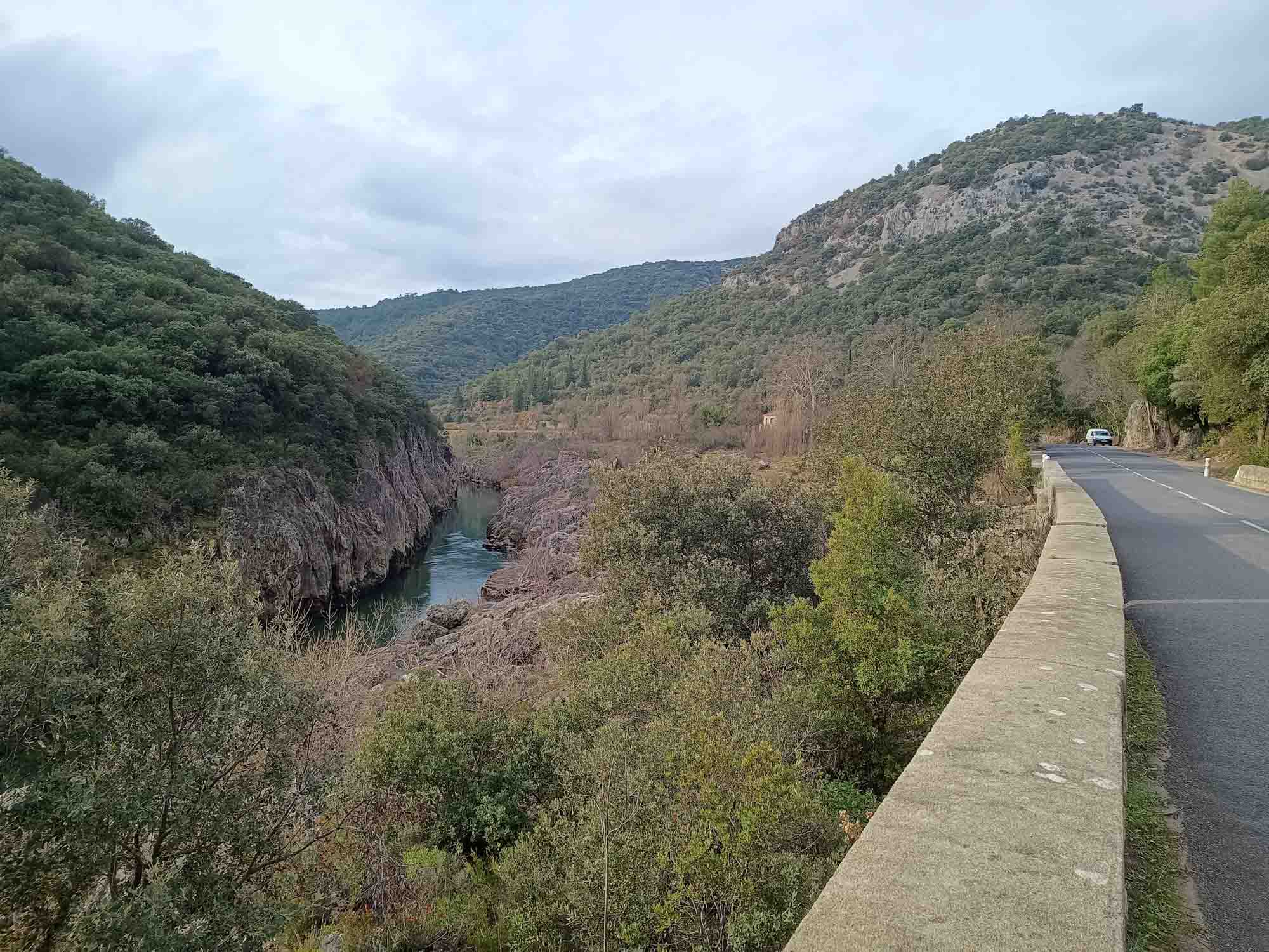 Auch heute hatten wir wieder eine längere Fahrt vor uns und standen erneut um 9 Uhr auf. Als erstes kletterten wir noch einmal am Flußufer des Hérault entlang und kamen diesmal bis zu einer Kanustation oberhalb des Wasserfalls, den wir gestern bereits gesehen hatten. Pünktlich um 11 Uhr fuhren wir weiter. Berta diesmal fast ohne Zittern und das blieb auch während der gesamten Fahrt so. Was für ein Glück. Nach etwa 20 Minuten erreichten wir mehr oder weniger zufällig eine beeindruckende Brücke, die über den Hérault führte und kurz danach war ein großer Parkplatz, der netterweise saisonbedingt kostenlos war. Kurzerhand entschlossen wir uns, gleich noch einen Spaziergang zu machen und wanderten zu der ziemlich alten Pont de Diablo, der Brücke des Teufels. Als wir auf der Brücke standen, bekamen wir flußaufwärts noch einen letzten Blick auf den sich dahinschlängelnden Canyon. Der nächste Teil der Strecke war eher langweilig. Rechts und links sich weit erstreckende Felder mit knorrigen alten Weinreben, an denen im nächsten Sommer die nächste Ernte für den hiesigen Corbière heranwachsen wird. Als wir uns Béziers näherten wurde die Landschaft zunehmend mediterraner. Die Zypressen vor den Häusern erinnerten ein wenig an Italien, die Häuser dagegen hätten auch in Spanien stehen können. Ebenso wie die riesigen Gewerbegebiete, die sich ewig entlang der Nationalstraße zu erstrecken schienen. Wir legeten noch einen weiteren Stopp für einen Spaziergang und eine kleine Stärkung ein, bevor wir uns auf die letzte Etappe des heutigen Tages machten. Nachdem wir auch an Narbonne vorbeigefahren waren, bekamen wir das erste Mal auf unserer Reise weit am Horizont das Mittelmeer zu sehen. Dann war es auch nicht mehr weit bis zu unserem Stellplatz. In Salses-le-Château fuhren wir von der Nationalstraße ab und fuhren auf einer kleinen einspurigen Straße in Richtung L'Étang de Salses, einer Lagune, die nordöstlich von Perpignan liegt. Als wir eine große, sehr alte Pinie und davor eine Parkmöglichkeit entdeckten war uns sofort klar, das dies unser Platz für die Nacht sein würde. Wir waren so früh angekommen, dass wir heute sogar noch vor Sonnenuntergang spazieren gehen konnten. So entdeckten wir auch gleich die Flamingos, die in den flachen Seen im Randbereich der Lagune herumstanden. Berta interessierte sich natürlich auch für sie, durfte aber nicht. Zum Abendbrot zauberten wir uns leckere Crèpes mit karamelisierten Äpfeln.