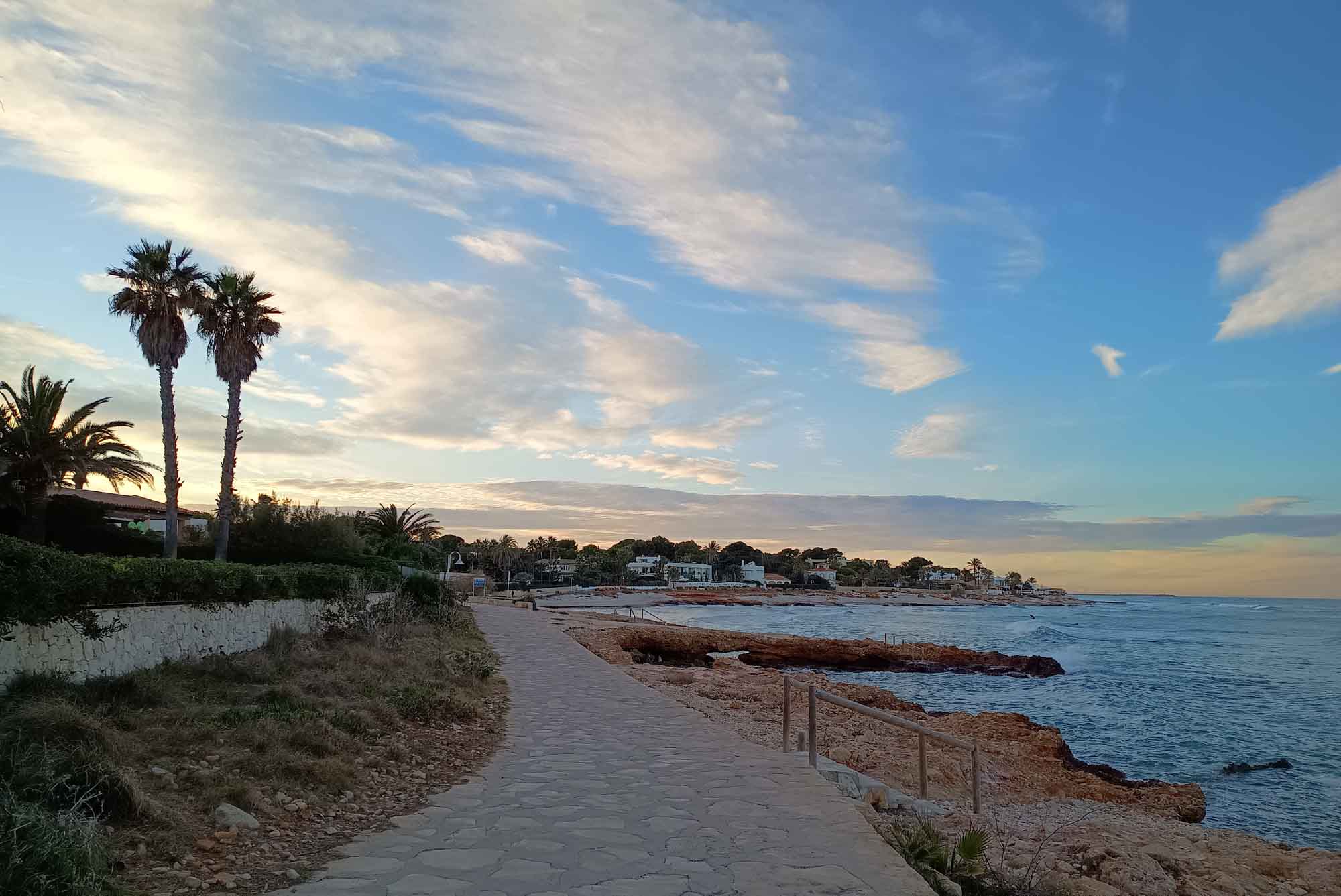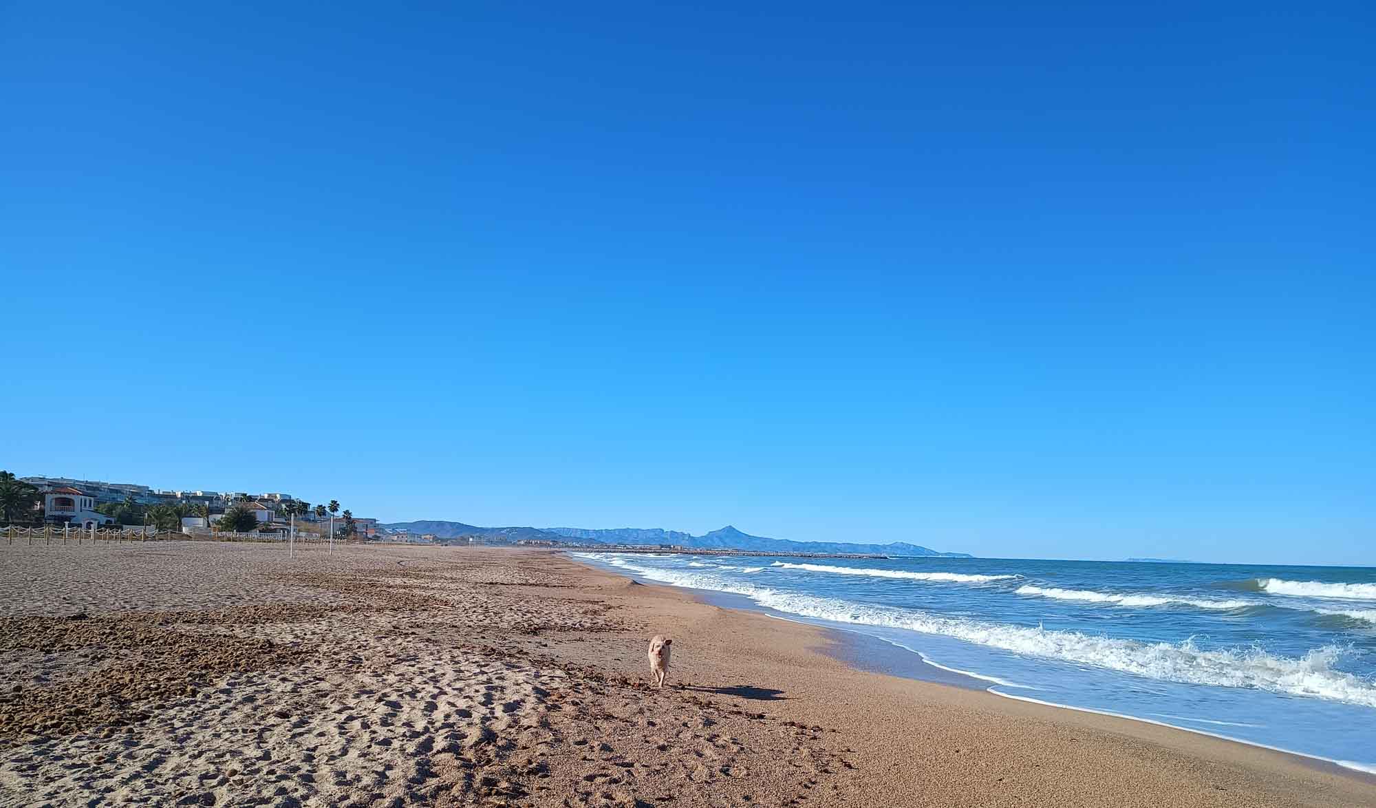 Die Nacht war wie erwartet ausgesprochen ruhig. Trotzdem wachten wir schon relativ früh auf. Aber die Sonne strahlte schon wieder vom wolkenlosen Himmel und so war der Spaziergang durch den Orangenhain wieder sehr angenehm. Als wir weiterfuhren, machten wir bereits nach 20 Minuten Halt, um ein paar Einkäufe zu erledigen. Berta wartete währenddessen im Auto. Der nächste Einkaufsladen war nur 5 Minuten entfernt und dort wiederholten wir die Prozedur. Nach weiteren 20 Minuten hielten wir erneut, diesmal um unsere Gasflasche wieder zu füllen. Inzwischen war es schon 14 Uhr geworden und wir sehnten uns alle nach einer Pause. Die fanden wir kurze Zeit später bei einem Spaziergang am Strand von Almadrava. Danach gab es noch einen Kaffee, bevor wir uns auf die letzte kurze Etappe des Tages machten. Immer der Küstenstraße folgend fuhren wir nach Dénia, das auf einem Cap östlich von Alicante liegt, an dem es sehenswerte Klippen geben soll. Heute bekamen wir ein paar von Ihnen nur aus der Ferne zu sehen, als wir unseren Abendspaziergang an der Promenade machten. Unterwegs begegneten wir einer Frau, die eine große Schaar freilebender Katzen fütterte, die auf einer halbhohen Mauer saßen. Wir nahmen Berta zwar an die Leine, hatten aber den Eindruck, dass es nicht notwendig gewesen wäre, so lieb ging sie an den fressenden Katzen vorbei nachdem wir uns, natürlich auf Spanisch, kurz mit der Frau unterhalten haben, die sich darüber freute, dass wir uns darüber freuten, dass sie die Katzen fütterte.