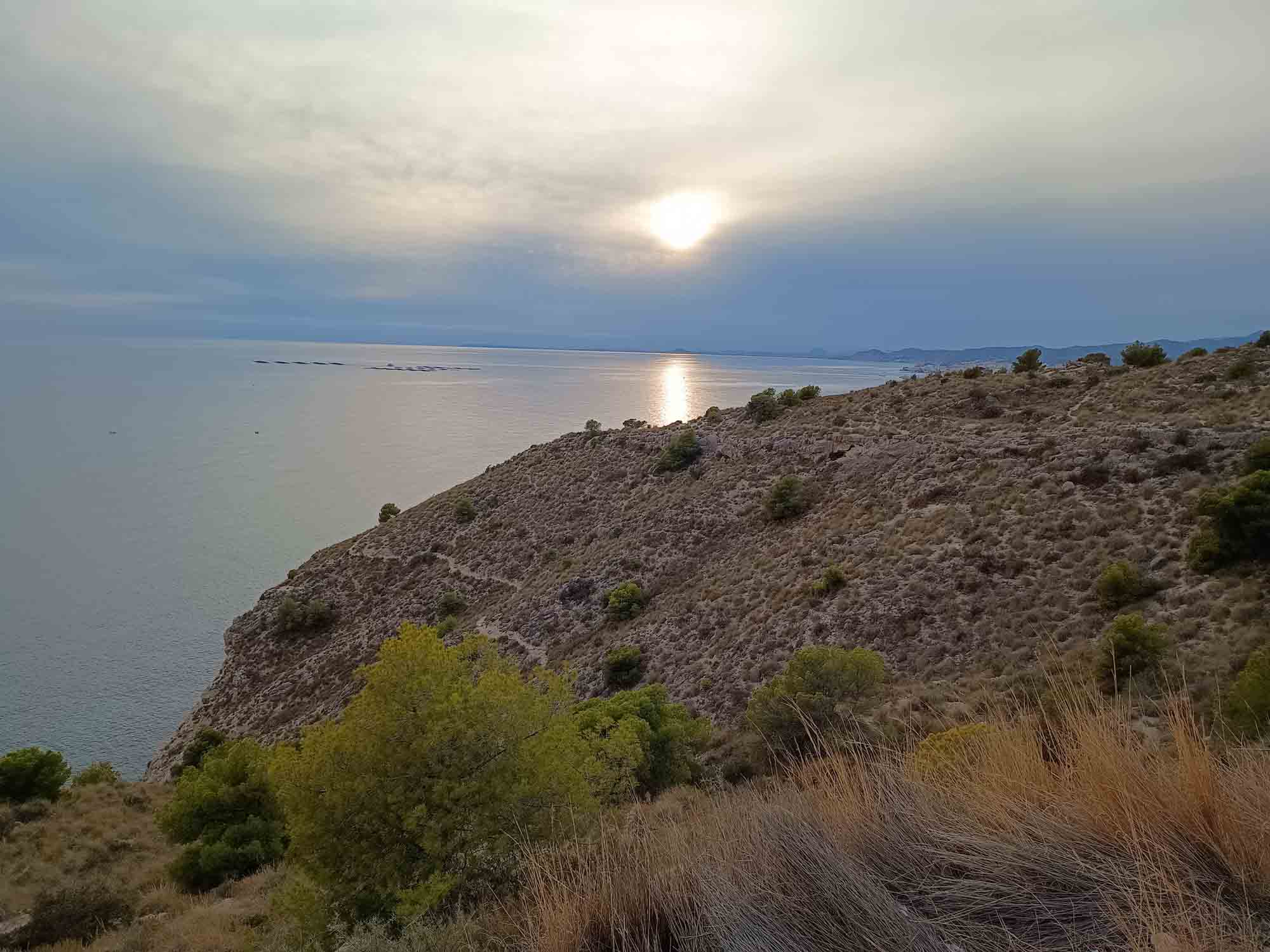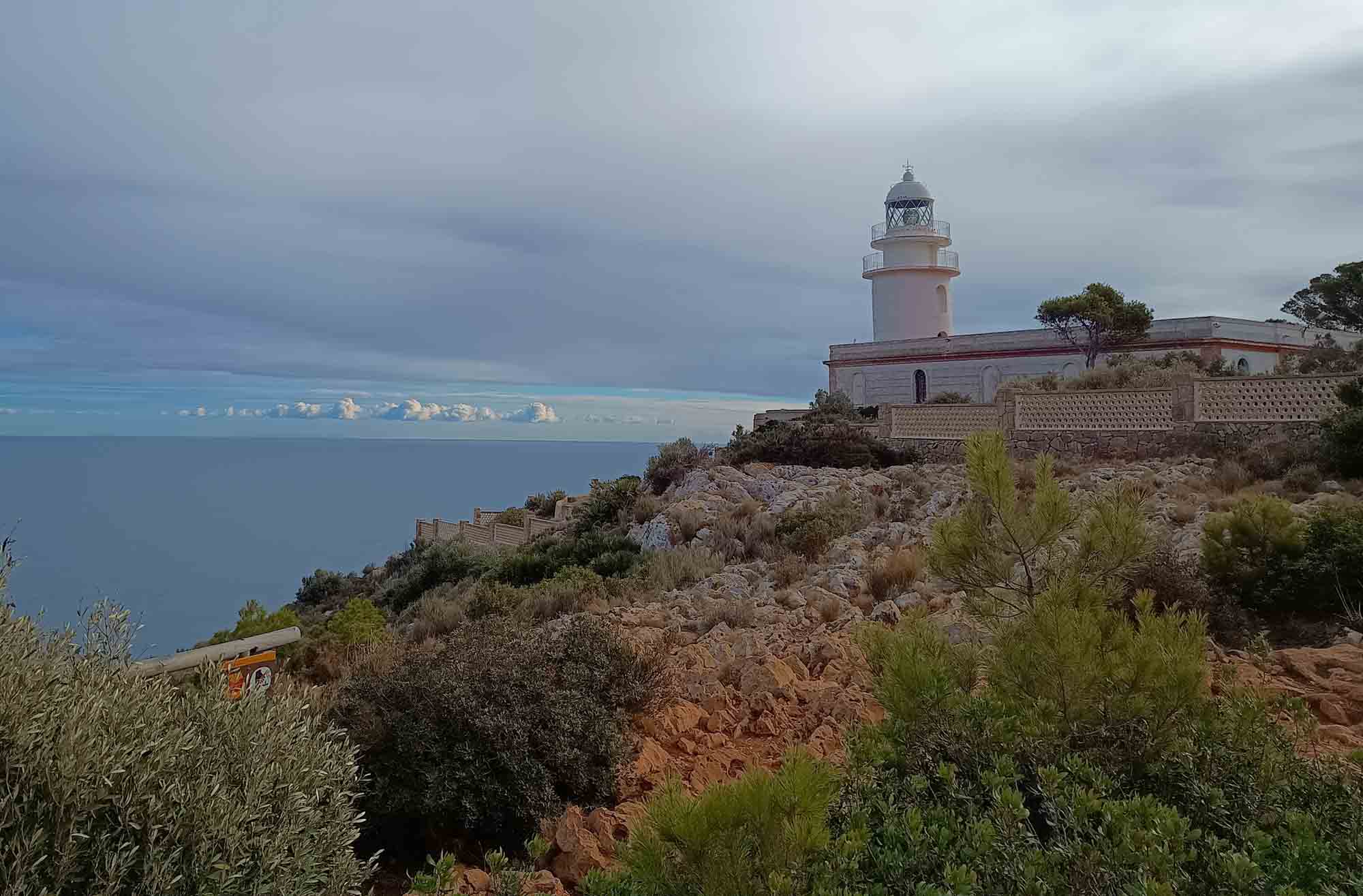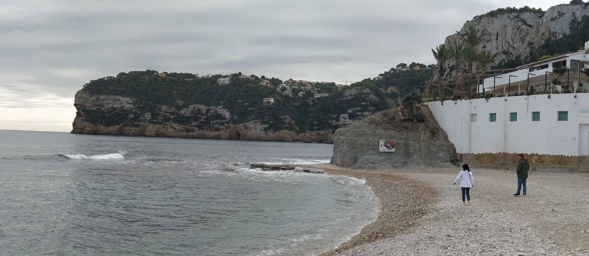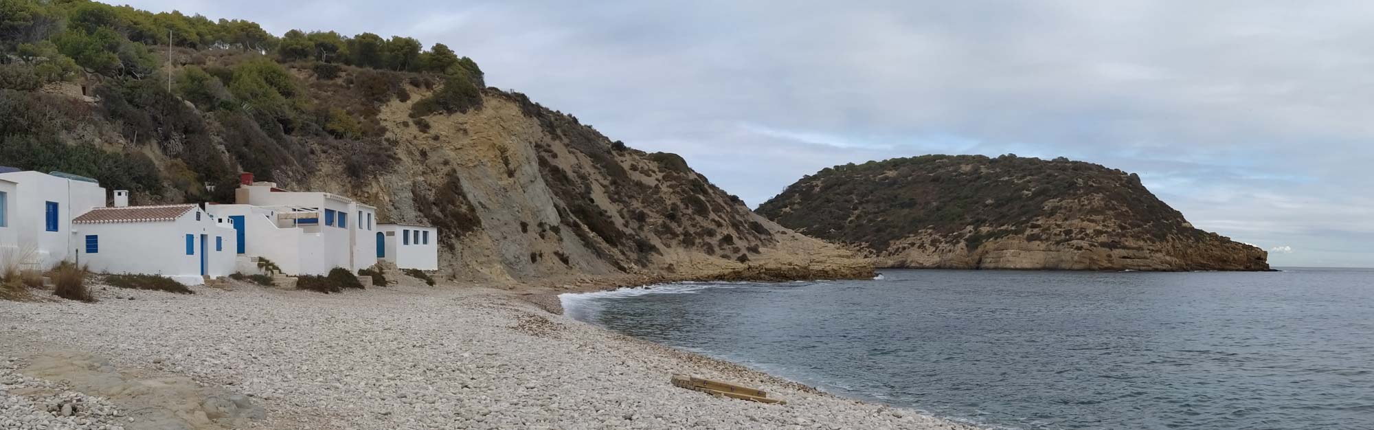 Der Morgenspaziergang führte uns noch einmal an die Küste. Unterwegs kamen wir mit Berta, natürlich wie immer ohne Leine laufend, an einer Katze vorbei, die an unserem Weg vor einer Mauer saß. Berta schaute zur Katze, schaute zu uns und lief anschließend in aller Ruhe an der Katze vorbei. Den Belohnungskeks hat sie sich redlich verdient. Der Himmel war leider bedeckt, so dass die Steilküste in der Ferne nicht so angeleuchtet war, wie wir uns das geschwünscht hatten. Ein Foto machten wir natürlich trotzdem. Unsere erste Fahrt des Tages führte uns zum knapp eine halbe Stunde entfernten Cap de Sant Antoni. Auf den Klippen steht hier ein Leuchtturm und eine kleine Radarantenne dreht sich im Kreis. Wir liefen ein wenig an der Kante der Klippen entlang und konnten sehr schön die große weite Bucht mit der Stadt Xàbia sehen. Auf der anderen Seite des Leuchtturms kletterten wir ein Stück die Klippen herunter, um eine besonderes hervorstehende Felsformation sehen zu können. Berta hielt dabei gehörig Abstand und beäugte unser Treiben am Rand. Wenn sie gewusst hätte, dass es auf dem ersten Stück nur sehr seicht abwärts ging, wäre sie vielleicht nicht so verhalten gewesen. Danach fuhren wir weiter und heute war Berta bereits bei der zweiten Fahrt des Tages nicht mehr ängstlich. Auf der Fahrt zum Leuchtturm hatte sie noch gezittert. Eine 3/4 Stunde später kamen wir auf einem kleinen Parkplatz mitten in einer Villengegend an. Ein Haus größer, moderner und schicker als das andere. Natürlich alle mit Blick auf das Meer und natürlich mit Pool. Wir konnten uns nicht entscheiden, welche es sein sollte und wanderten in der Zwischenzeit zum kleinen Kieselstrand mit den süssen kleinen weißen Häuschen herunter. Vom Strand aus konnte man eine vorgelagerte Insel entdecken, die im Sommer bestimmt ein beliebtes Ausflugsziel ist. Das Café am Strand war auch noch geschlossen. Also mussten wir wieder selbst kochen. Das machten wir aber erst unterwegs auf unserer nächste Etappe, die uns an der für uns überraschend großen Stadt Calp entlangführte, die uns mit ihren Hochhäusern, die bis an eine vorgelagerte Insel ragten, die aus einem einzigen 320 m hohen Felsen bestand. Das ganze erinnerte uns stark an Gibraltar. Danach verließen wir die landschaftlich schöne Strecke und kamen wieder auf eine breite Küstenstraße, die wieder durch viele langgezogene Ortschaften und Gewerbegebiete führte. Kurz vor unserem Ziel umfuhren wir noch Benidorm weiträumig und bekamen die vielen aneinandergereihten Hochhäuser nur aus der Ferne zu sehen. Kurz darauf verließen wir die Fast-Autobahn und waren nur knapp 6 km hinter Benidorm wieder mitten in der Wildnis auf einer abenteuerlichen einspurigen Straße, deren Asphalt rechts und links große Ausbuchtungen aufwies, unterwegs. Zum Glück kam uns bis zu unserem Übernachtungsplatz auf den Klippen niemand entgegen. Zum Ausweichen wäre nirgendwo Platz gewesen. Wir hatten Hunger und aßen erst noch etwas bevor wir im Dunkeln noch einmal zu einem kurzen Spaziergang aufbrachen. In der Zwischenzeit hatten sich noch zwei andere Wohnmobile zu uns gesellt. Eines, das aus Deutschland kam, etwas unterhalb. Der andere hatte sich kaum zwei Meter entfernt schräg hinter uns gestellt. Beim Losgehen tauschten wir ein paar Freundlichkeiten aus und beim Zurückkommen stellten wir fest, dass unser Vorurteil mal wieder voll ins Schwarze getroffen hatte. Es war natürlich ein Belgier. Denn, dass haben wir inzwischen auf vielen Wohnmobilreisen festgestellt: Belgier kuscheln gern, d.h. stellen sich häufig ausgesprochen dicht zu anderen dazu. Wir verzogen uns wieder nach drinnen, spielten noch ein wenig und dann fielen uns auch bald schon wieder die Äuglein zu.