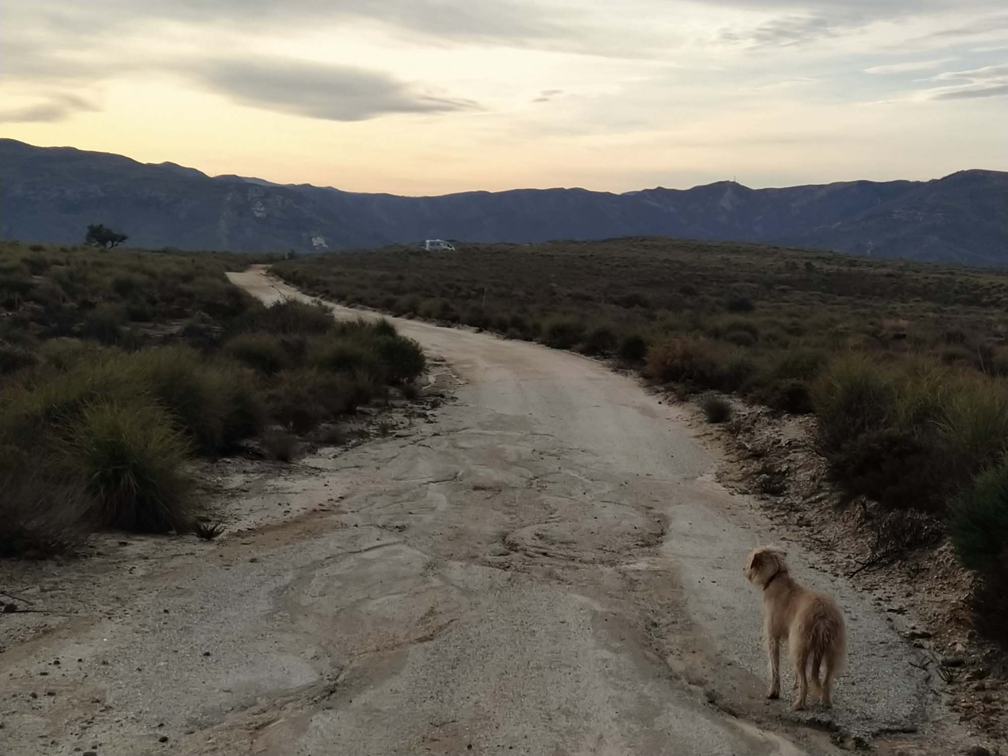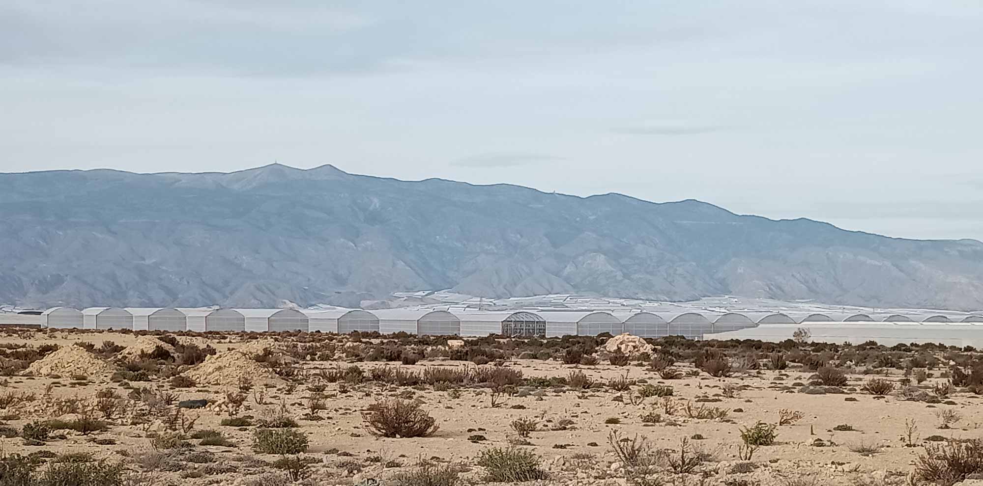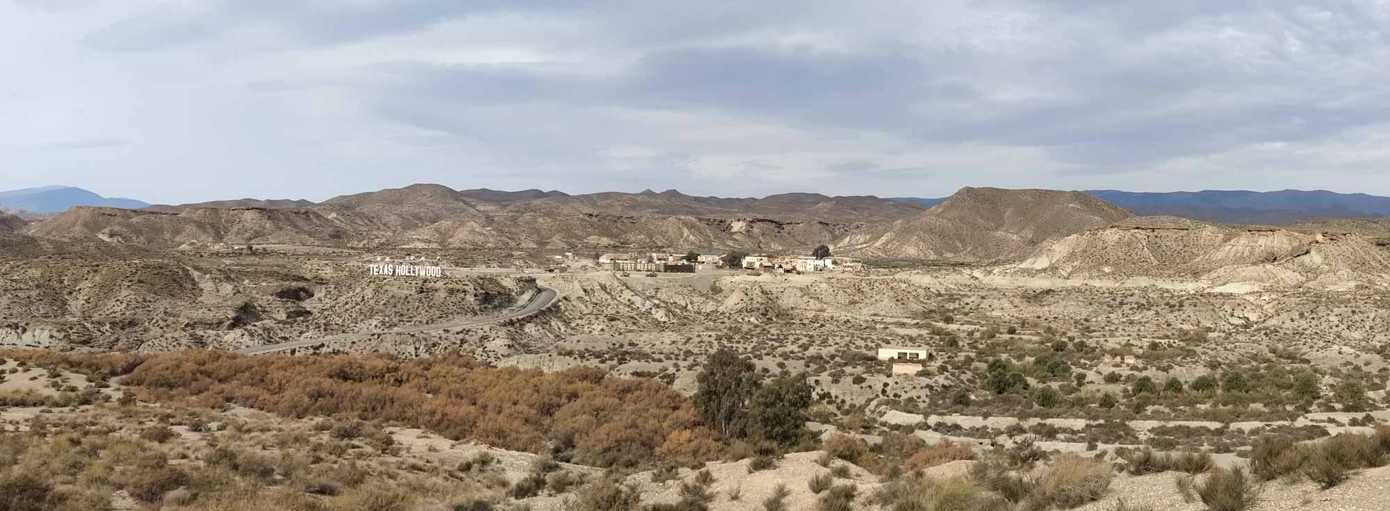 Nach dem Morgenspaziergang mussten wir uns mal wieder entscheiden, ob wir auf diesem wunderschönen, einsamen Platz bleiben wollten oder ob wir weiterfahren. Wenn es nach Berta gehen würde, wäre die Entscheidung einfach. Sie saß unweit des Autos in den Büschen, schaute und hoffte, dass wir hier bleiben würden. Morgen sollte es aber richtig warm und sonnig werden. Also müssten wir entweder einen tollen Tag als Fahrtag nutzen oder auch morgen noch hier bleiben. Allerdings wussten wir auch nicht, wie der nächste Platz aussehen würde. Wir hatten uns einen Übernachtungsplatz am Strand von El Ejido ausgesucht. Würden wir dort eine Stelle finden, wo wir den Sonntag schön am Wasser verbringen könnten? Allerdings gab es hier in der Einsamkeit der Steppe auch keinen Mülleimer und es hatte sich schon wieder einiges angehäuft. Das Wasser wurde auch schon wieder knapp und die Toilette war beinahe voll. Das gab letztendlich den Ausschlag. Wir sammelten eine unzufriedene Berta ein und fuhren los. Diesmal nahmen wir die Straße nordwärts, wo wir fast ebenerdig am Steinbruch vorbei zu einer Nationalstraße kamen. So einfach hätten wir also auch zu unserem Platz kommen können. Nach knapp 20 Minuten kamen wir bei einem Spielplatz an, wo sich Berta von ihrer ersten Fahrt etwas erholen und wir an einem Brunnen unseren Wassertank wieder füllen konnten. Danach ging es weiter durch die Wüste Tabernas bis zum Fort Bravo, einer Film-Westernstadt in deren Umgebung etliche Western wie z.B. "Spiel mir das Lied vom Tod" oder auch "Indiana Jones und der letzte Kreuzzug" gedreht wurden. Zufällig kamen wir bei einem kleinen Spaziergang just an der Felsformation vorbei, die wir sofort aus dem Film wiedererkannten. Danach machten wir kurz vor Almeria noch einen längeren Halt zum Einkaufen, Kaffee trinken und freies WLAN nutzen bevor wir hinter Almeria durch die riesigen Anlagen von Gewächshäusern fuhren. Kurz vor unserem Ziel konnten wir an einer Tankstelle noch unsere Toilette entleeren und waren so wieder für eine längere Pause vorbereitet. Der Platz am Strand von El Ejido erwies sich als annehmbar. Wir fanden etwas abseits von anderen Campern eine ruhige Stelle und bei unserem Abendspaziergang am Strand sahen wir noch ein tolles Ziel für unseren morgigen Nachmittagsspaziergang. Wir standen zufällig unmittelbar unter einer Festung, die wir bequem fußläufig würden erreichen können.
