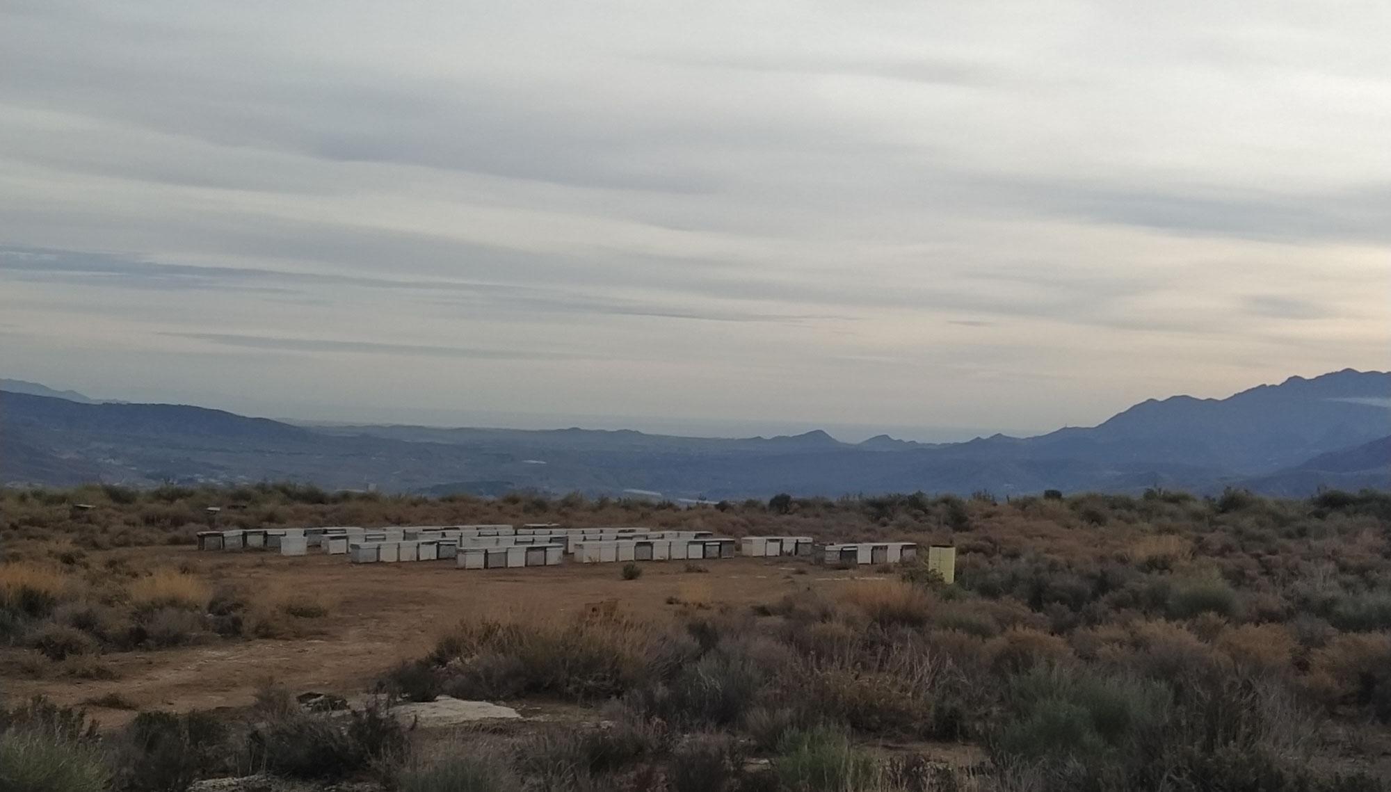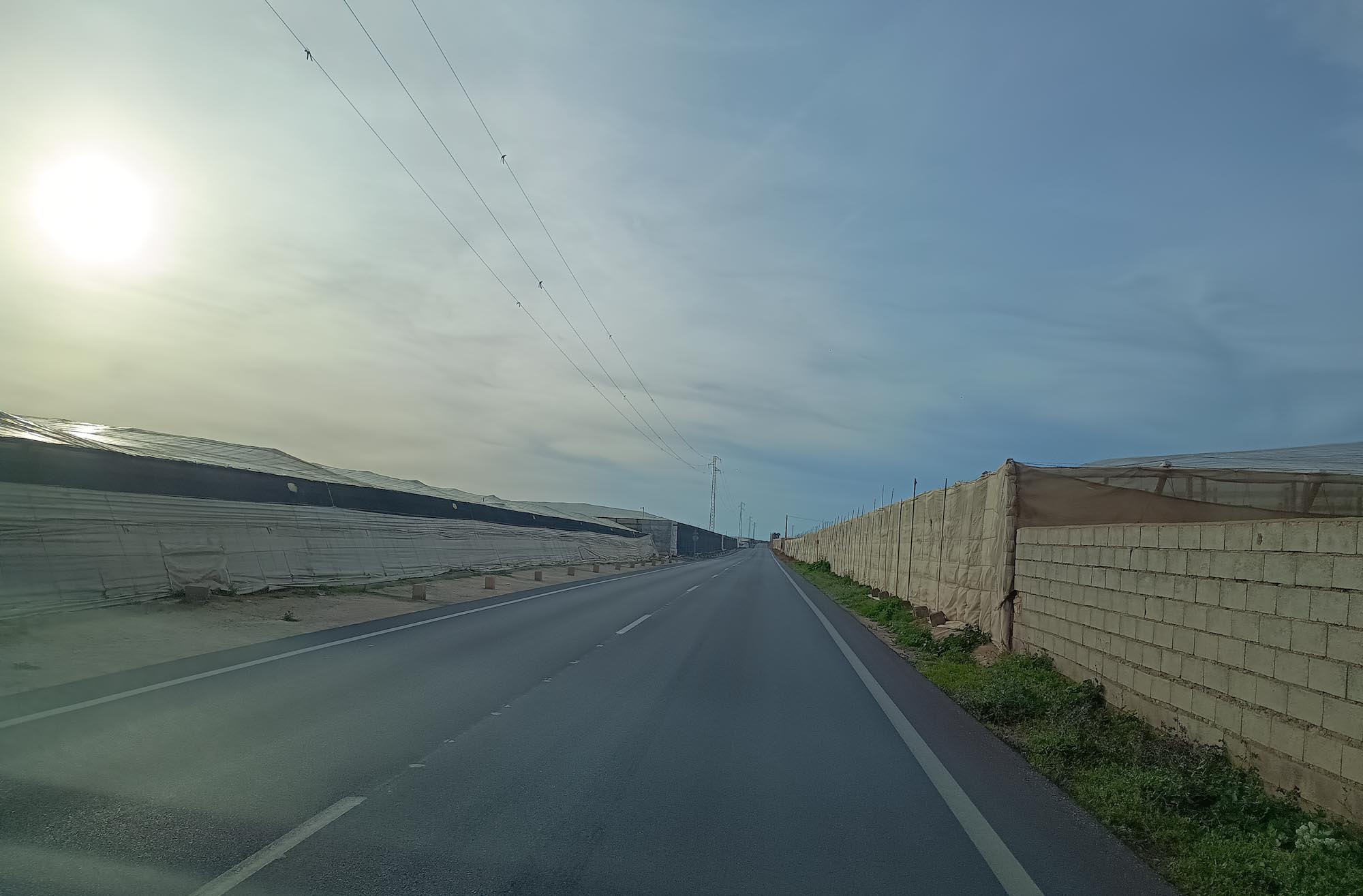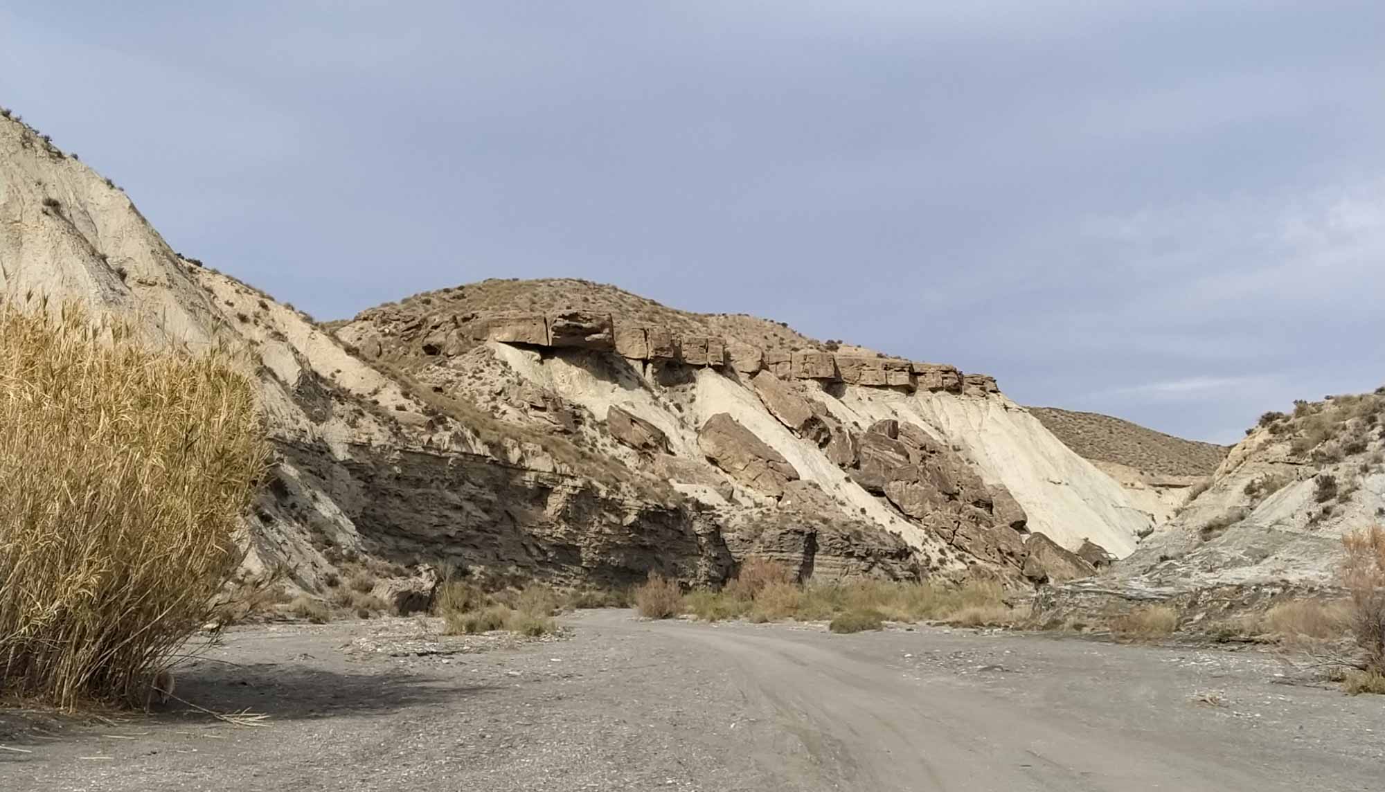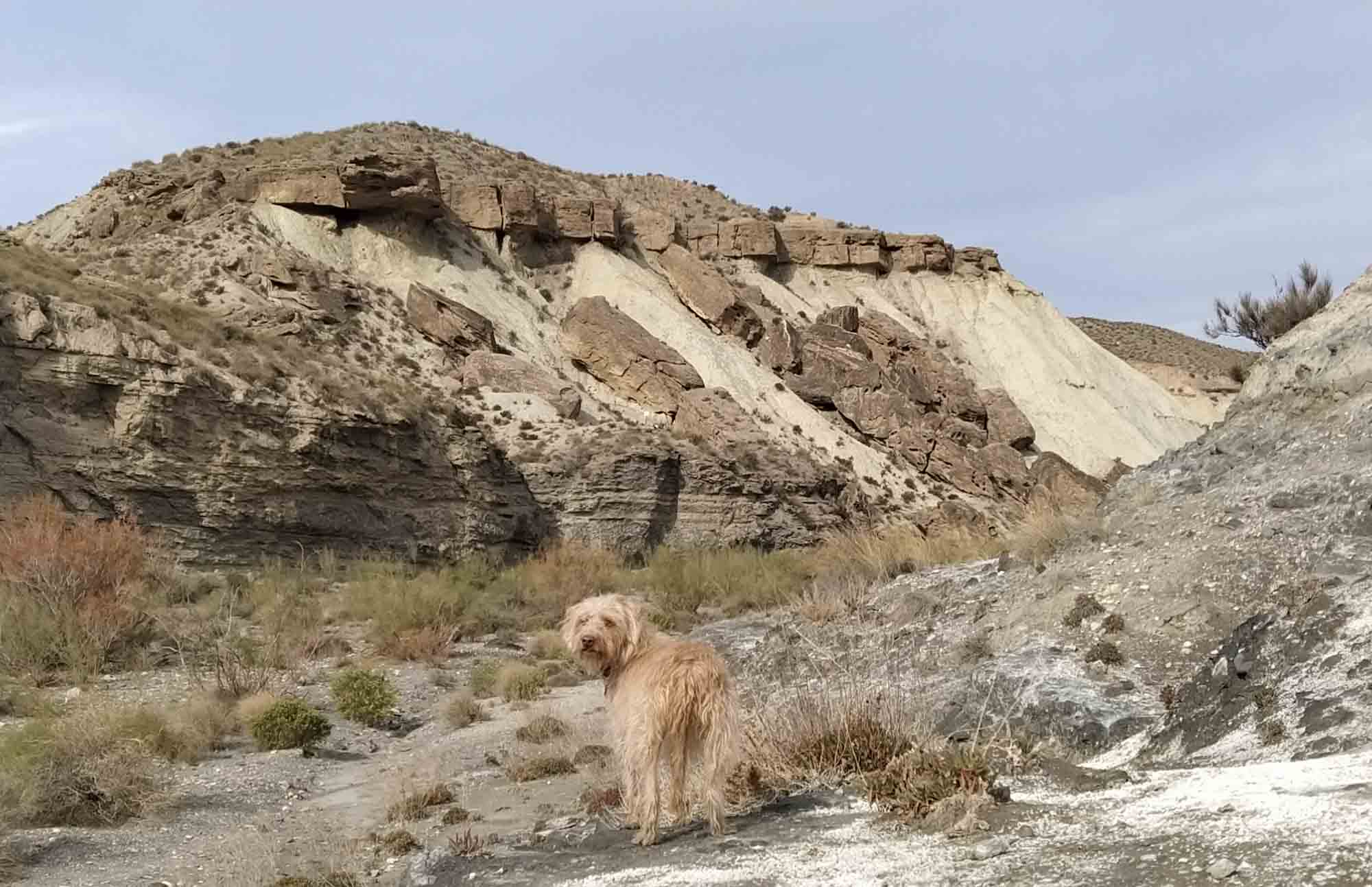 Nach dem Morgenspaziergang mussten wir uns mal wieder entscheiden, ob wir auf diesem wunderschönen, einsamen Platz bleiben wollten oder ob wir weiterfahren. Wenn es nach Berta gehen würde, wäre die Entscheidung einfach. Sie saß unweit des Autos in den Büschen, schaute und hoffte, dass wir hier bleiben würden. Morgen sollte es aber richtig warm und sonnig werden. Also müssten wir entweder einen tollen Tag als Fahrtag nutzen oder auch morgen noch hier bleiben. Allerdings wussten wir auch nicht, wie der nächste Platz aussehen würde. Wir hatten uns einen Übernachtungsplatz am Strand von El Ejido ausgesucht. Würden wir dort eine Stelle finden, wo wir den Sonntag schön am Wasser verbringen könnten? Allerdings gab es hier in der Einsamkeit der Steppe auch keinen Mülleimer und es hatte sich schon wieder einiges angehäuft. Das Wasser wurde auch schon wieder knapp und die Toilette war beinahe voll. Das gab letztendlich den Ausschlag. Wir sammelten eine unzufriedene Berta ein und fuhren los. Diesmal nahmen wir die Straße nordwärts, wo wir fast ebenerdig am Steinbruch vorbei zu einer Nationalstraße kamen. So einfach hätten wir also auch zu unserem Platz kommen können. Nach knapp 20 Minuten kamen wir bei einem Spielplatz an, wo sich Berta von ihrer ersten Fahrt etwas erholen und wir an einem Brunnen unseren Wassertank wieder füllen konnten. Danach ging es weiter durch die Wüste Tabernas bis zum Fort Bravo, einer Film-Westernstadt in deren Umgebung etliche Western wie z.B. "Spiel mir das Lied vom Tod" oder auch "Indiana Jones und der letzte Kreuzzug" gedreht wurden. Zufällig kamen wir bei einem kleinen Spaziergang just an der Felsformation vorbei, die wir sofort aus dem Film wiedererkannten. Danach machten wir kurz vor Almeria noch einen längeren Halt zum Einkaufen, Kaffee trinken und freies WLAN nutzen bevor wir hinter Almeria durch die riesigen Anlagen von Gewächshäusern fuhren. Kurz vor unserem Ziel konnten wir an einer Tankstelle noch unsere Toilette entleeren und waren so wieder für eine längere Pause vorbereitet. Der Platz am Strand von El Ejido erwies sich als annehmbar. Wir fanden etwas abseits von anderen Campern eine ruhige Stelle und bei unserem Abendspaziergang am Strand sahen wir noch ein tolles Ziel für unseren morgigen Nachmittagsspaziergang. Wir standen zufällig unmittelbar unter einer Festung, die wir bequem fußläufig würden erreichen können.