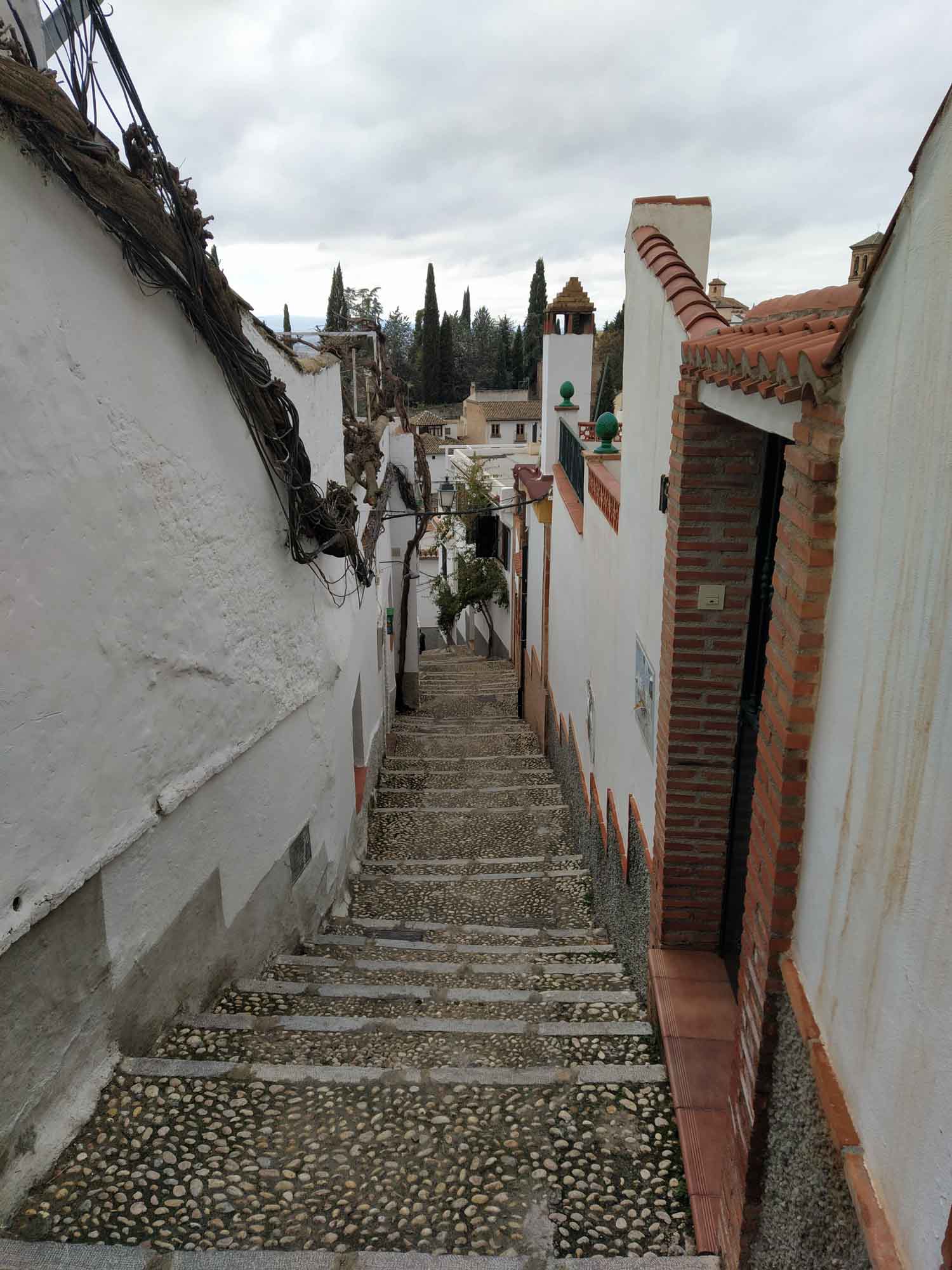 Es war sehr praktisch, unweit der Alhambra übernachtet zu haben. So konnten wir nach dem morgendlichen Spaziergang und Frühstück einfach zu Fuß in die Stadt hinunterlaufen. Dabei kamen wir natürlich an der Festung vorbei und konnten von außen bewundern, was wir vor zwei Jahren von innen gesehen hatten. Unser Weg führte uns als erstes in den Stadtteil Albacín, ein sehr alter und gemütlicher Teil der Stadt mit kleinen Häusern, engen Gassen und vielen vielen Treppen. Der Nachteil von Albacín war, das es auf einem Berg lag, auf den wir natürlich bis zum Aussichtspunkt San Miguel Alto hochlaufen mussten, um von dort einen tollen Blick auf die Alhambra und natürlich auf Albacín zu bekommen. Zurück nahmen wir den direkten Weg, der auf einem steilen Pfad quer durch die kleinen Behausungen der Zigeuner führte. Danach nahmen wir den Weg am Kanal entlang bis in die Altstadt von Granada wo wir, nachdem wir eine Palästinenserdemo durchquert hatten, bis zur Kathedrale gingen. Danach machten wir uns auf den Rückweg und waren 3 1/2 h später wieder bei unserem Wohnmobil, wo wir uns bei einem Kaffee und den unterwegs gekauften Teilchen stärkten. Nach einem kleinen aber nutzlosen Halt bei MediaMarkt (wir brauchten noch einen Satellitenstecker, den sie aber leider nicht hatten) fuhren wir nordwärts zu unserem avisierten Übernachtungsplatz. Dieser versprach sehr schön zu werden, war aber leider fast 80 km entfernt. Leider erwies sich die Strecke, die Google für uns ausgesucht hatte als nicht machbar. Erst standen wir mitten in einem kleinen eng verwinkelten Dorf in den Bergen und mussten einen Rückzieher machen und der 5 km zurückliegende ursprünglich von Google vorgeschlagene Weg war noch schlimmer. Erst führte er durch eine Furt, was noch kein Problem war, dann quer über ein Bahngleis, auf matschigem Weg durch eine Olivenplantage und dann auf einem ausgewaschenen Weg mit tiefen Furchen steil auf einen Berg. Als wir rechts und links wegen der eng stehenden Bäume nicht mehr ausweichen konnten, gaben wir auf und fuhren etwa 1 km auf diesem furchtbaren von Furchen durchzogenen Weg zurück bis wir im Matsch der Olivenplantage wenden konnten. Danach fuhren wir noch einmal 10 km die Straße zurück, die wir gekommen waren, um dann die Autobahn zu nehmen. Auf der rechten Seite sahen wir die Berge vorbeiziehen, an denen wir eben noch gescheitert waren. Etwa 1 1/2 h später als ursprünglich geplant kamen wir dann im Dunkeln auf unserem Platz an. Er war schön einsam und abgelegen inmitten von Feldern gelegen. Aber im Dunkeln beließen wir es auf dem lehmigen Boden bei einem eher kurzen Spaziergang. Wir machten es uns lieber drinnen gemütlich und erholten uns beim Abendessen und Spielen von den Aufregungen des Tages.