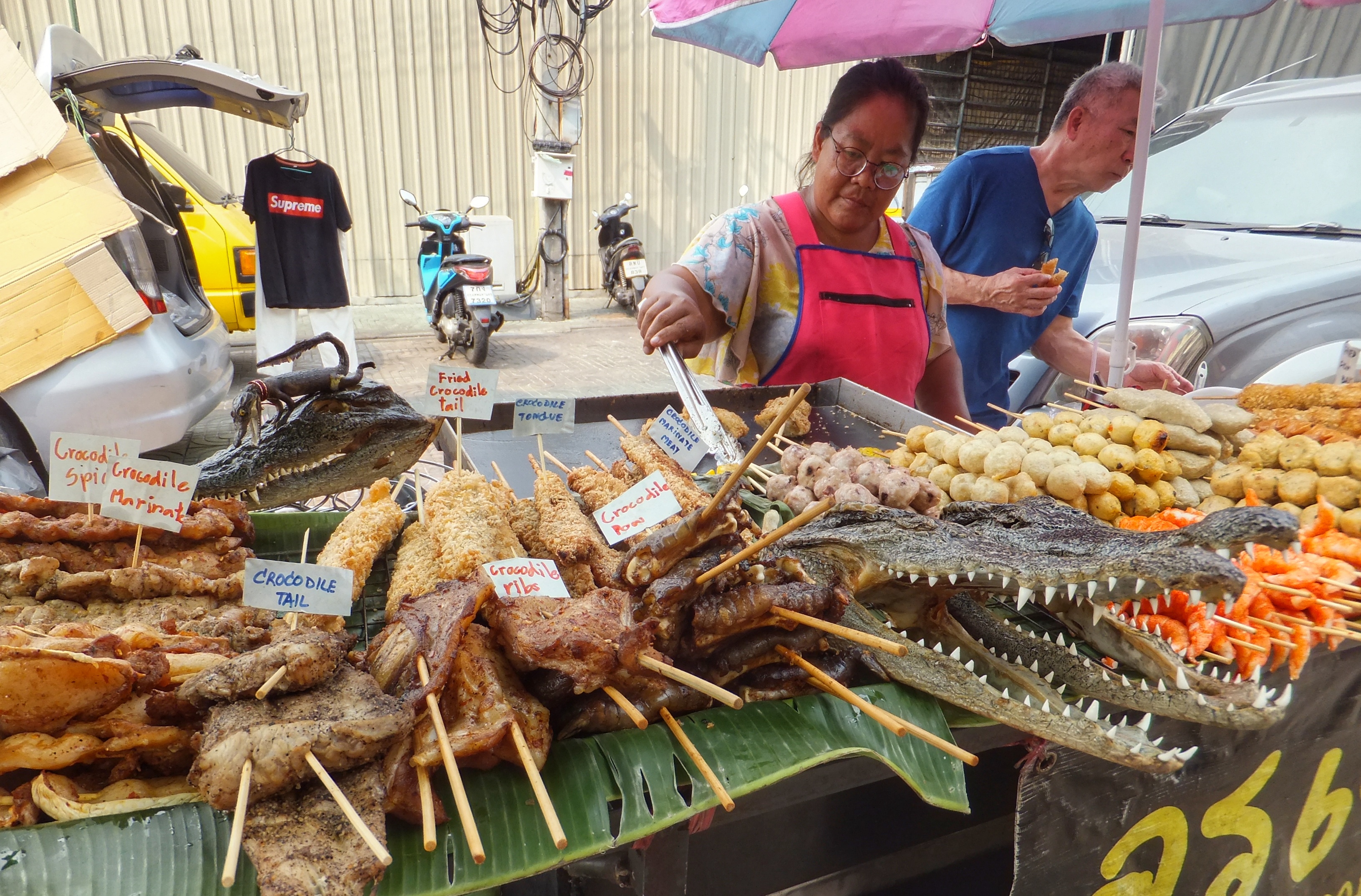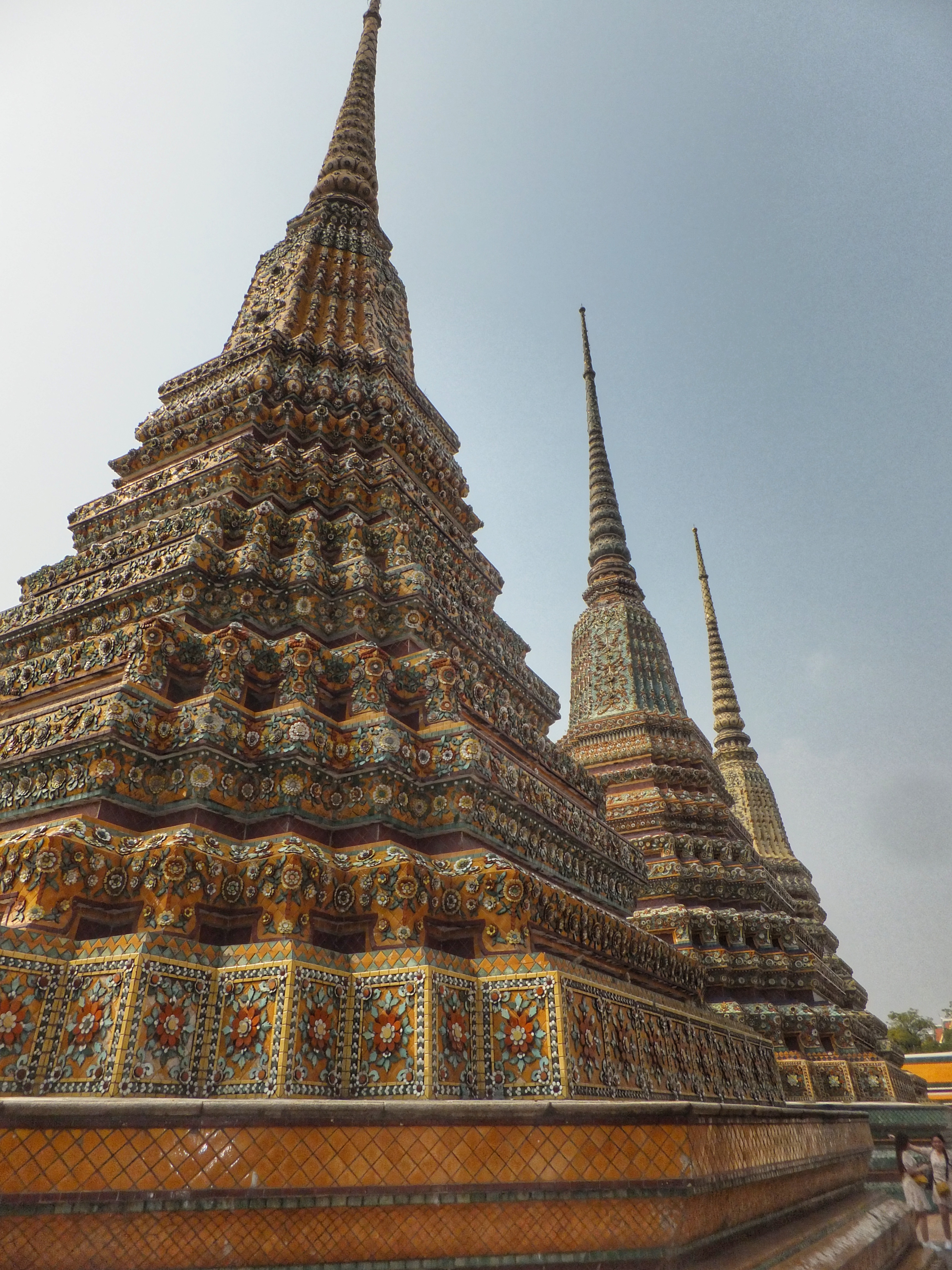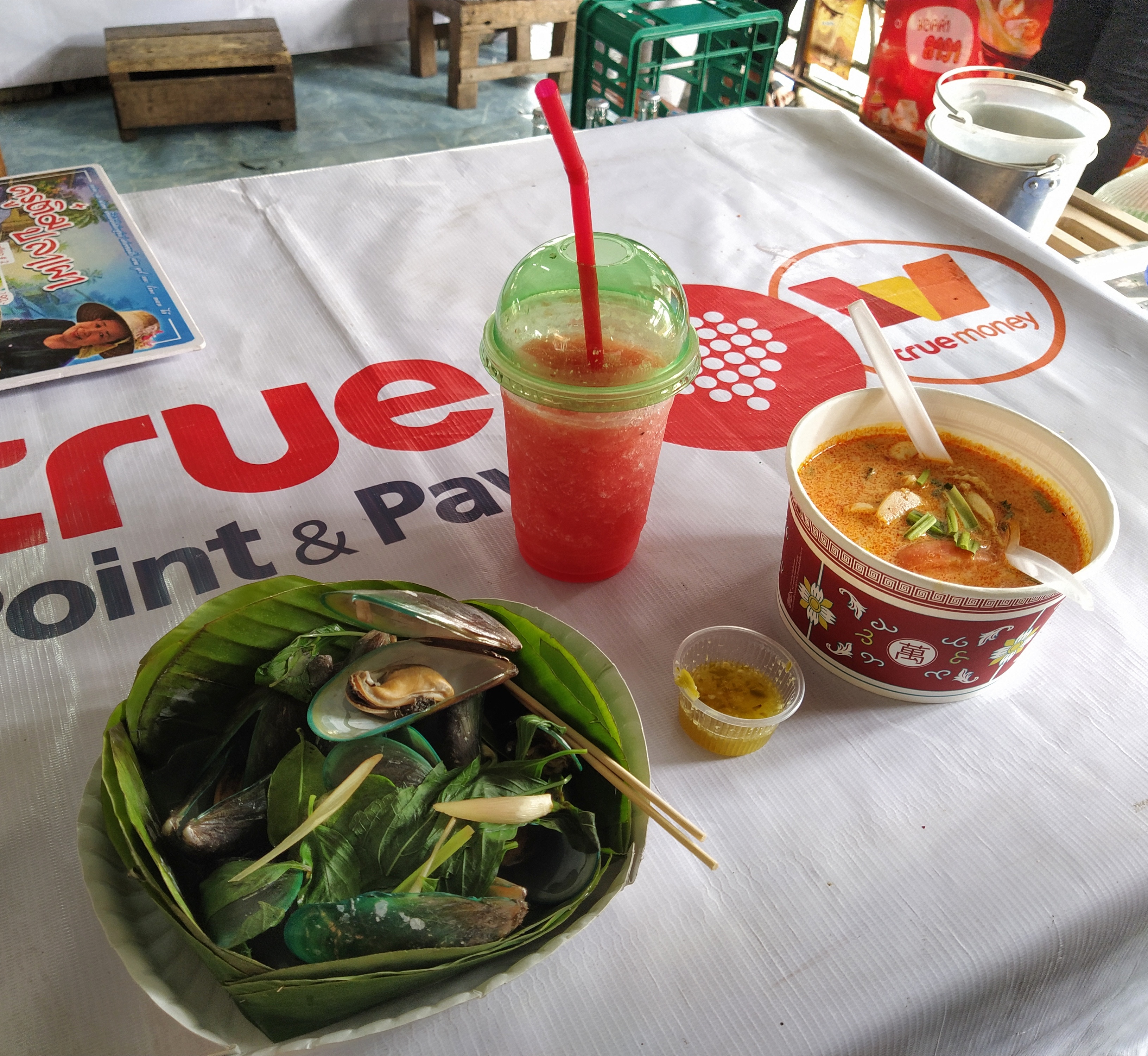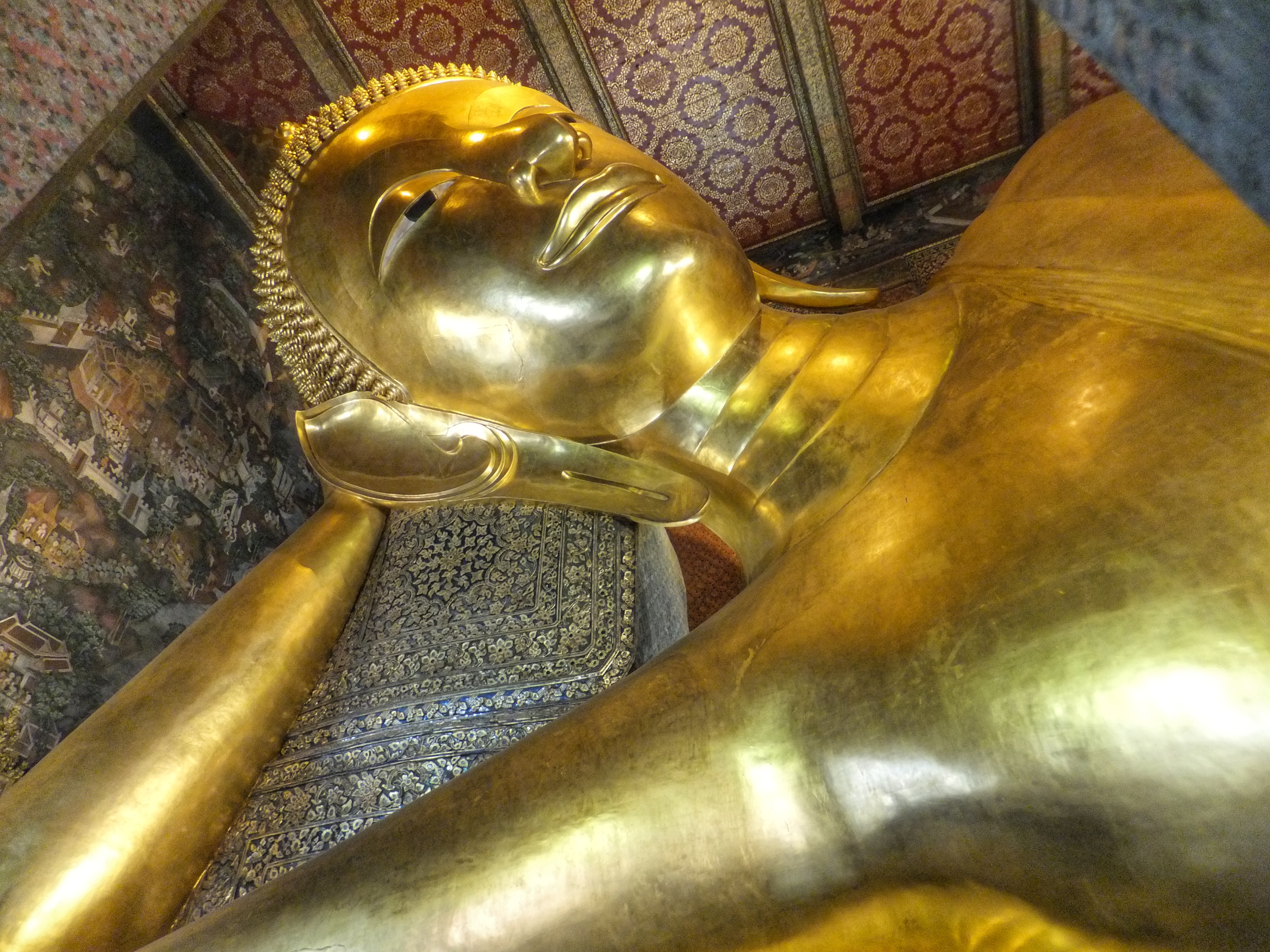 Nach einem gemütlichen Morgenkaffee im Hotel fuhren wir mit dem Taxi zu einem Floating Market in der Nähe. Wir schlenderten eine Weile an den zahlreichen Ständen vorbei und genossen die typischen Düfte und das bunte Treiben auf dem Markt. Auf den Booten wurde vor allem Essen zubereitet und auch wir genehmigten uns Muscheln und eine Suppe zum Mittagessen. Danach ging es auf einem Langboot zurück in die Stadt wo wir uns den liegenden Buddha im Wat Pho ansahen. Zum Glück durfte ich auch in kurzen Hosen hinein. Aneta legte sich ein Tuch über die Schultern. Damit war auch sie angemessen gekleidet. Der Tempel war durchaus sehenswert und die feinen Arbeiten an den Füßen des Buddhas besonders schön anzusehen. Danach gingen wir zu Fuß zu Kho San, einer stark touristisch angehauchten Straße, in der alles vertreten ist, was Thailand für Touris zu bieten hat: Massagen, Bier, gebackene Skorpione, Maden, Heuschrecken und Frösche, Süsses, Herzhaftes und laute Musik. Wir setzen uns und ließen das bunte Treiben bei einem großen kalten Bier an uns vorbeiziehen. Auch in der nächsten Straße war viel los und wir spazierten noch ein Weilchen einfach so durch die Menschenmassen bevor wir uns in der kleinen Gasse in der Nähe unseres Hotels zum Abendessen hinsetzten.