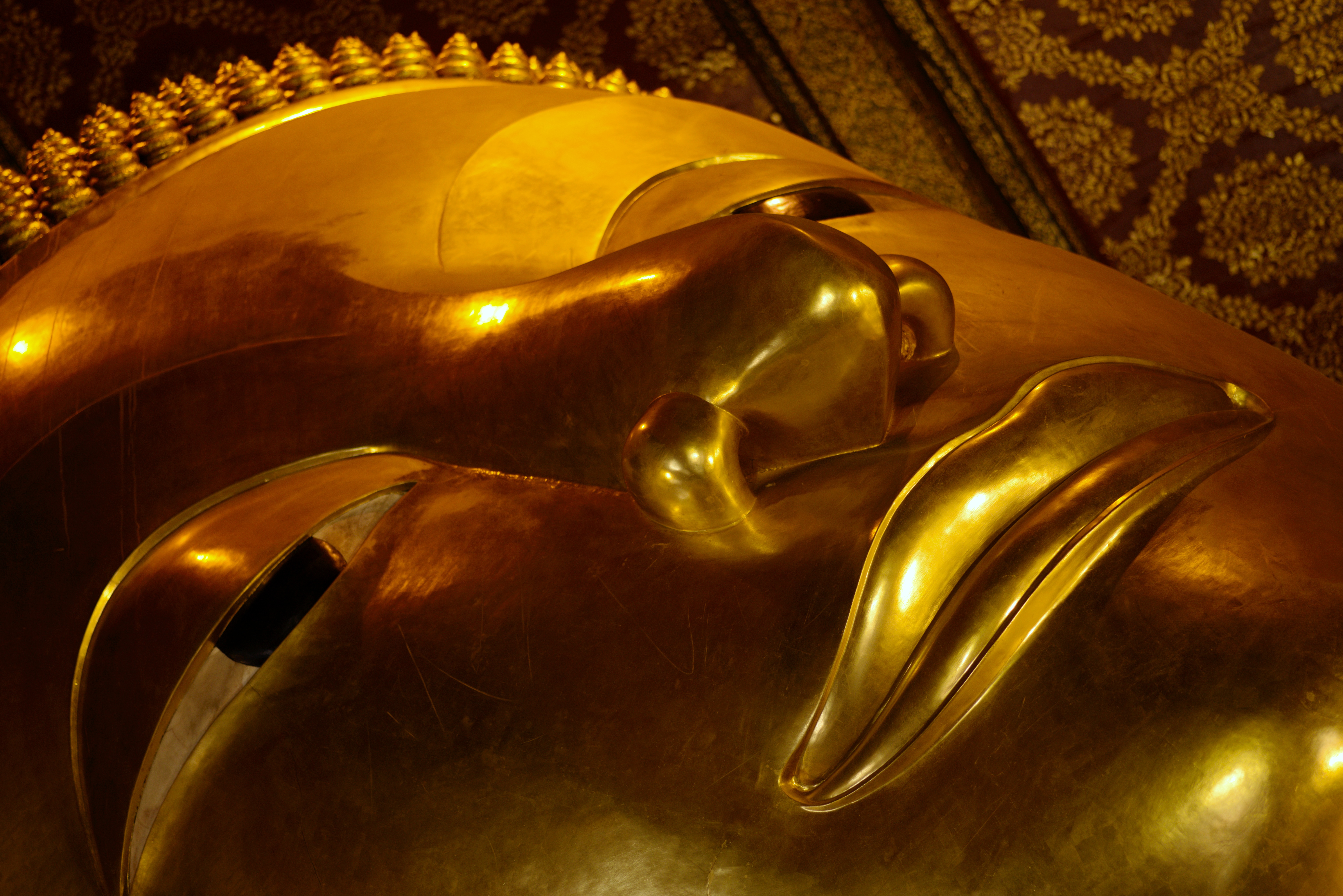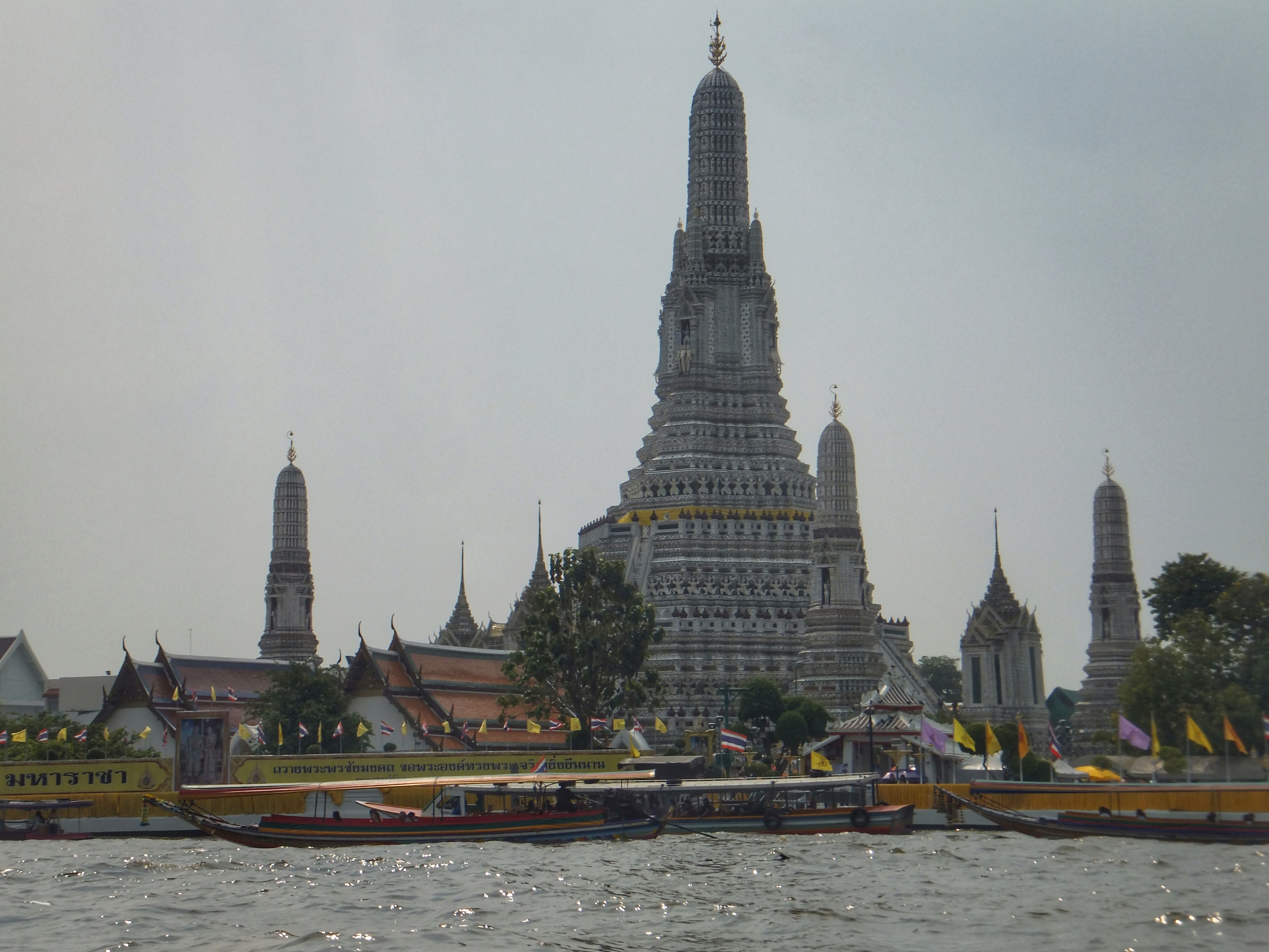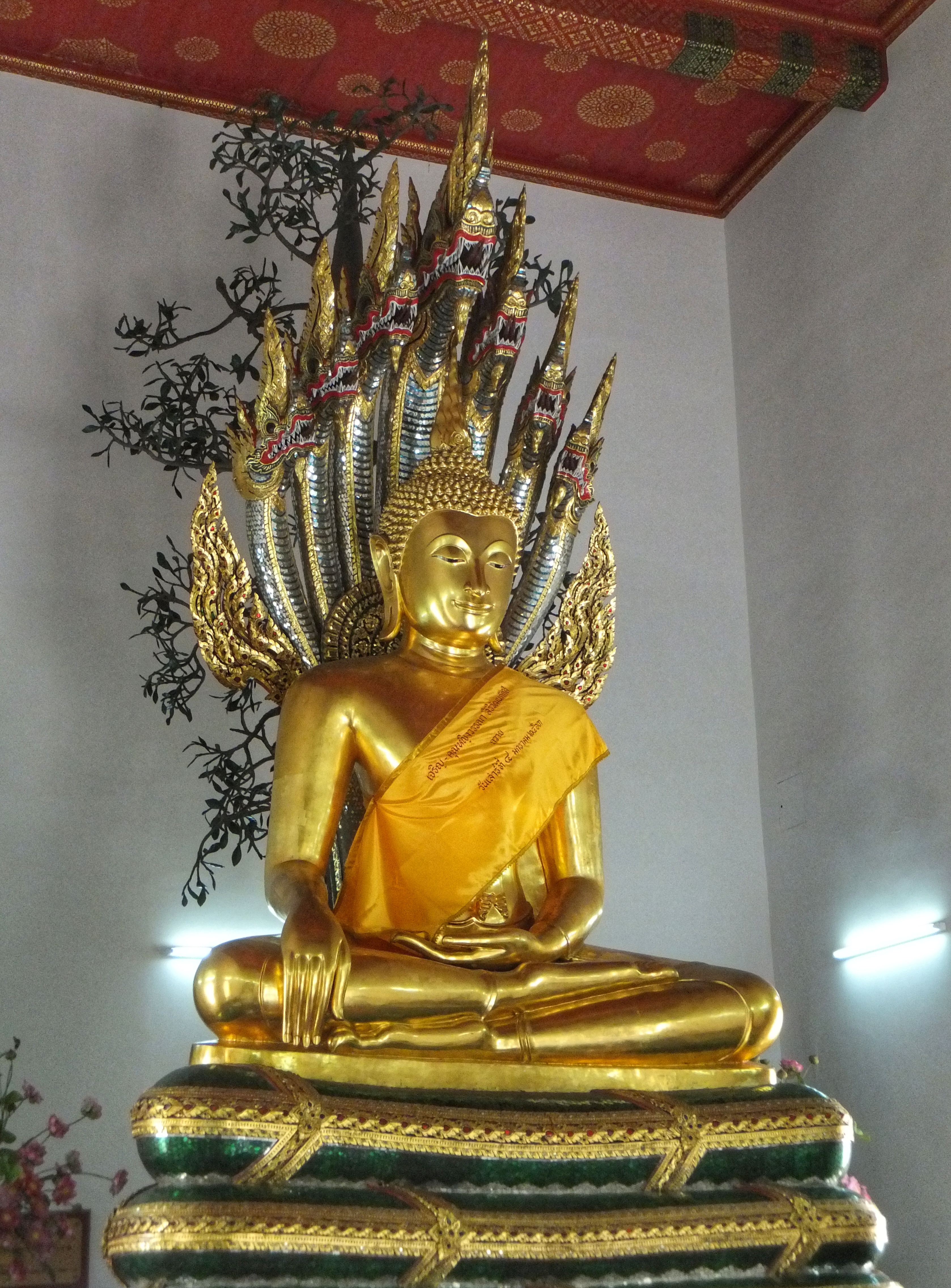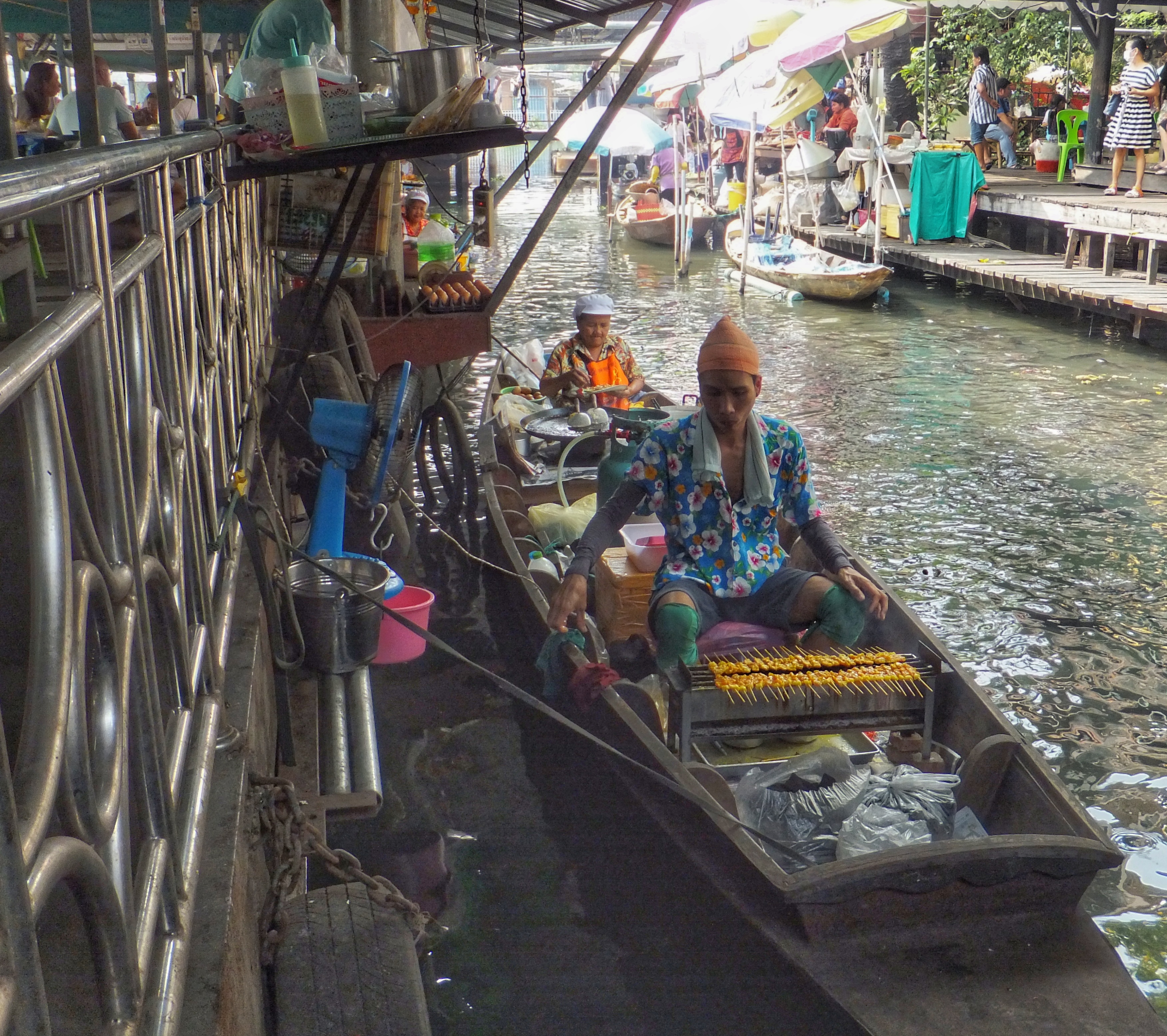 Nach einem gemütlichen Morgenkaffee im Hotel fuhren wir mit dem Taxi zu einem Floating Market in der Nähe. Wir schlenderten eine Weile an den zahlreichen Ständen vorbei und genossen die typischen Düfte und das bunte Treiben auf dem Markt. Auf den Booten wurde vor allem Essen zubereitet und auch wir genehmigten uns Muscheln und eine Suppe zum Mittagessen. Danach ging es auf einem Langboot zurück in die Stadt wo wir uns den liegenden Buddha im Wat Pho ansahen. Zum Glück durfte ich auch in kurzen Hosen hinein. Aneta legte sich ein Tuch über die Schultern. Damit war auch sie angemessen gekleidet. Der Tempel war durchaus sehenswert und die feinen Arbeiten an den Füßen des Buddhas besonders schön anzusehen. Danach gingen wir zu Fuß zu Kho San, einer stark touristisch angehauchten Straße, in der alles vertreten ist, was Thailand für Touris zu bieten hat: Massagen, Bier, gebackene Skorpione, Maden, Heuschrecken und Frösche, Süsses, Herzhaftes und laute Musik. Wir setzen uns und ließen das bunte Treiben bei einem großen kalten Bier an uns vorbeiziehen. Auch in der nächsten Straße war viel los und wir spazierten noch ein Weilchen einfach so durch die Menschenmassen bevor wir uns in der kleinen Gasse in der Nähe unseres Hotels zum Abendessen hinsetzten.
