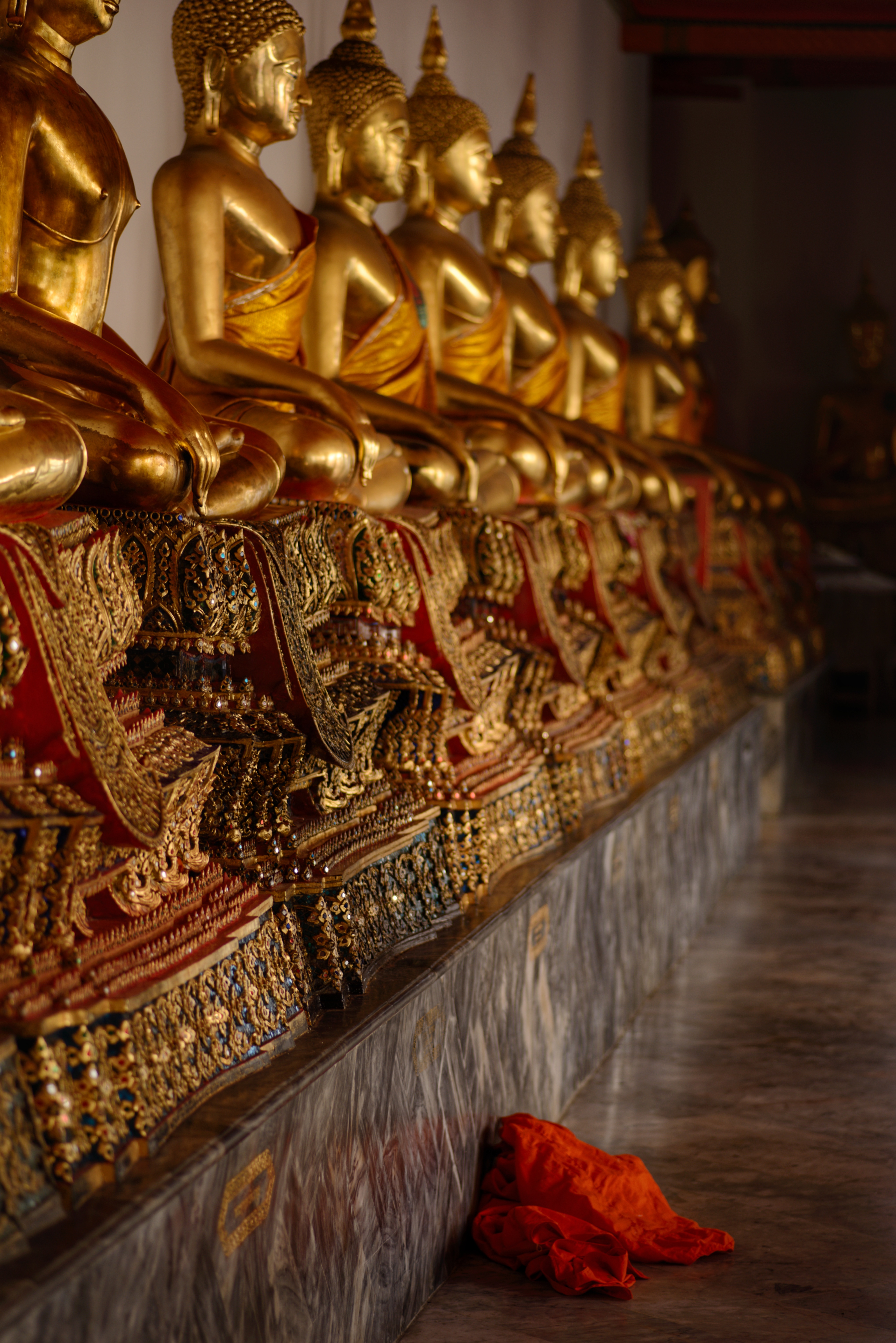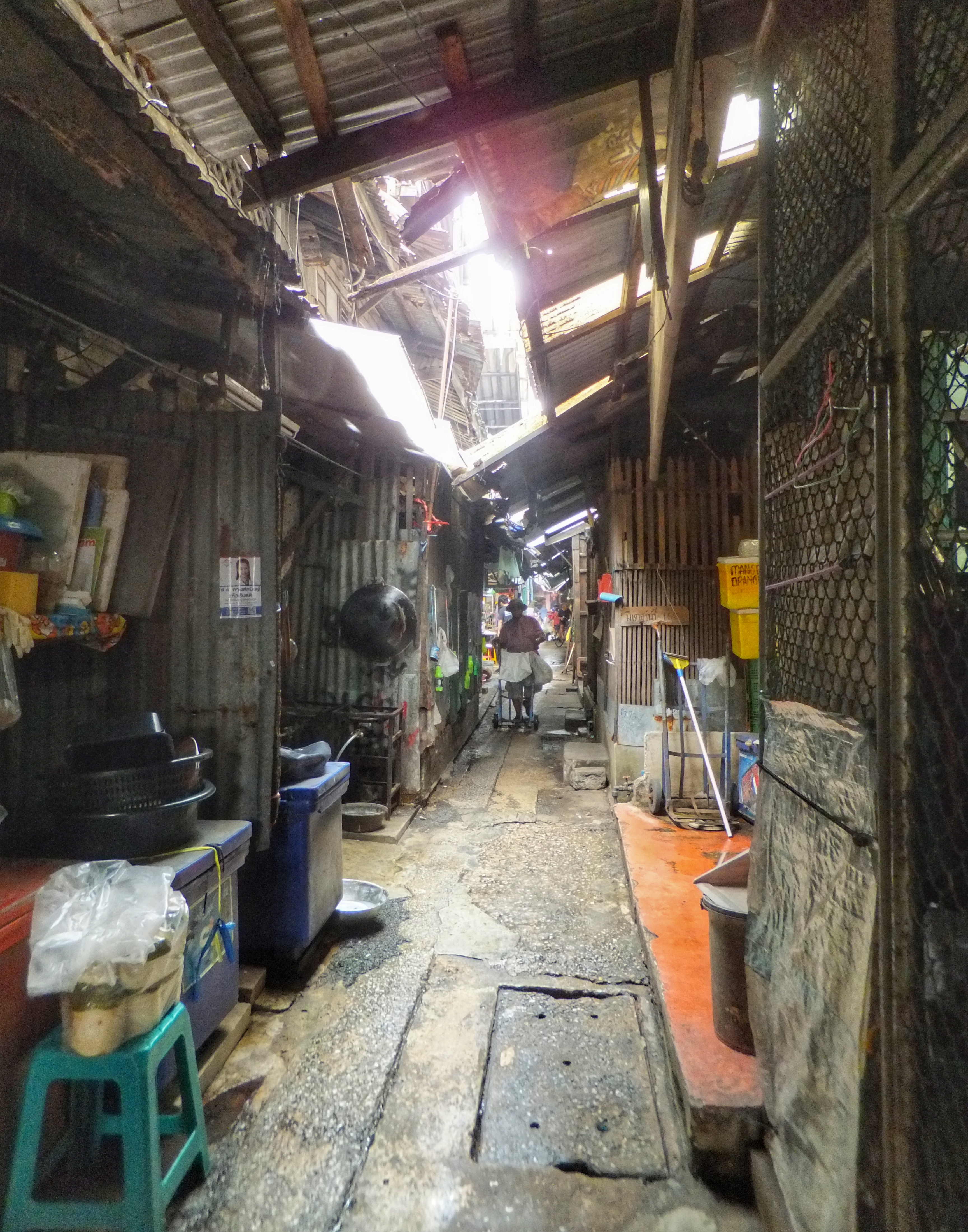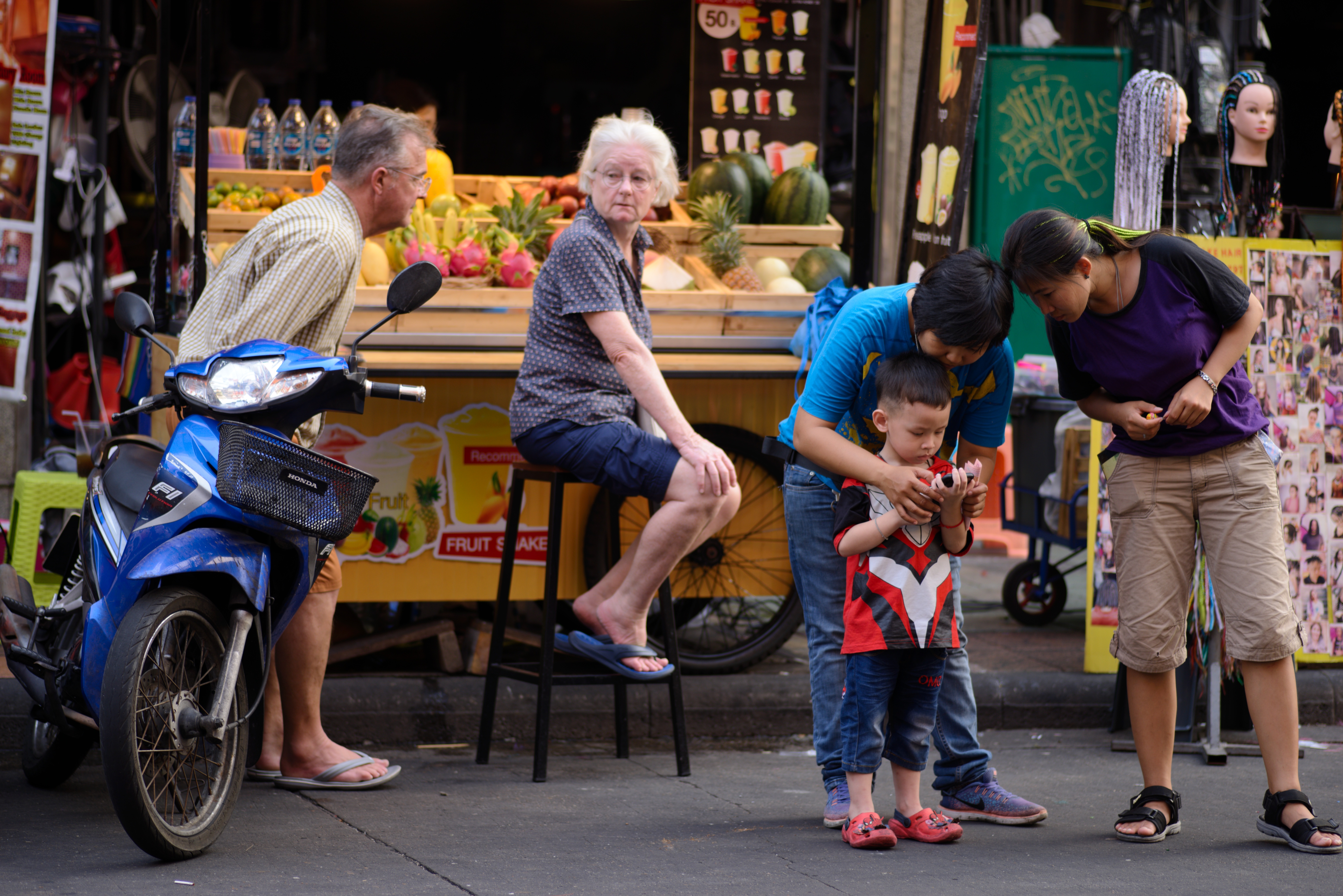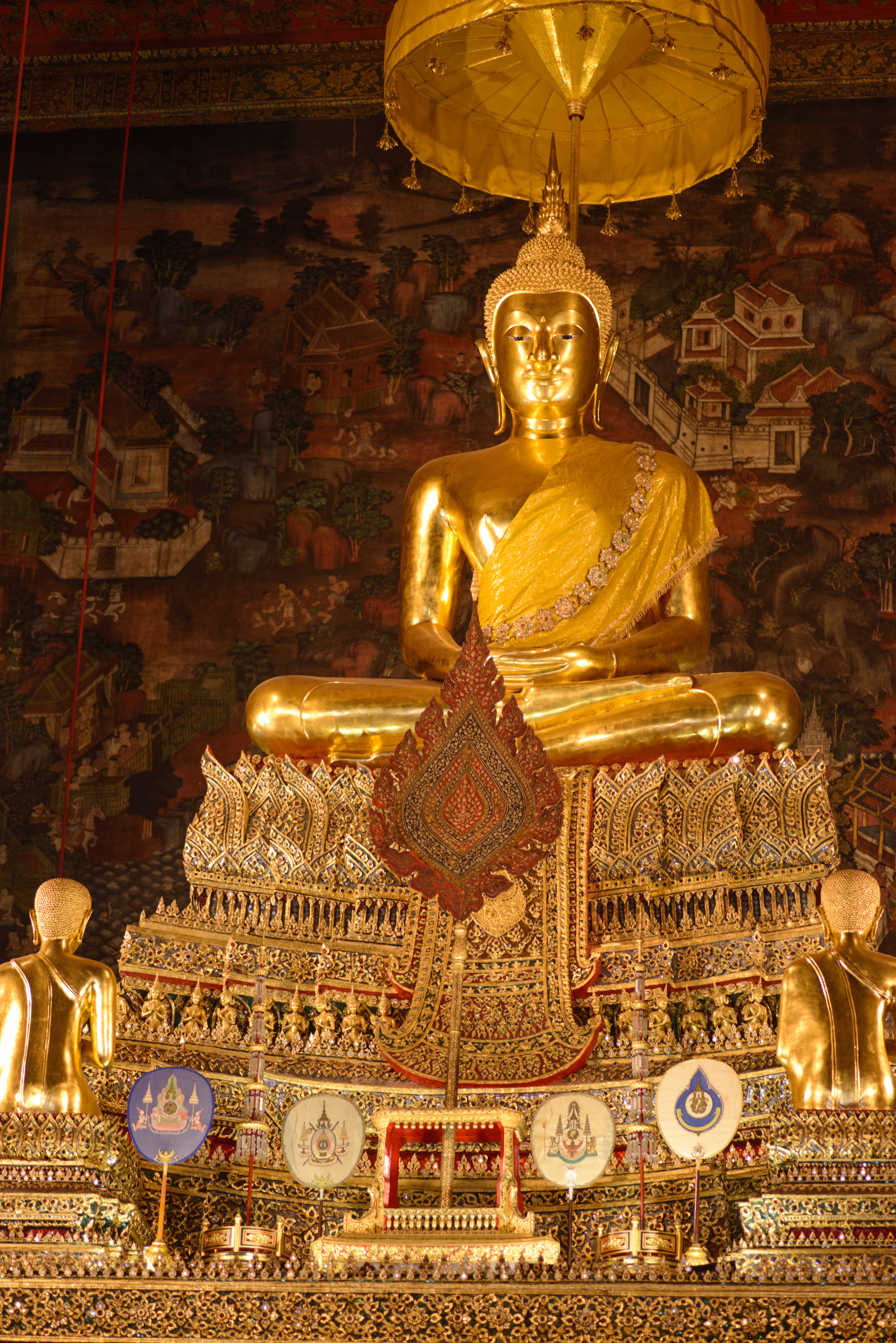 Nach einem gemütlichen Morgenkaffee im Hotel fuhren wir mit dem Taxi zu einem Floating Market in der Nähe. Wir schlenderten eine Weile an den zahlreichen Ständen vorbei und genossen die typischen Düfte und das bunte Treiben auf dem Markt. Auf den Booten wurde vor allem Essen zubereitet und auch wir genehmigten uns Muscheln und eine Suppe zum Mittagessen. Danach ging es auf einem Langboot zurück in die Stadt wo wir uns den liegenden Buddha im Wat Pho ansahen. Zum Glück durfte ich auch in kurzen Hosen hinein. Aneta legte sich ein Tuch über die Schultern. Damit war auch sie angemessen gekleidet. Der Tempel war durchaus sehenswert und die feinen Arbeiten an den Füßen des Buddhas besonders schön anzusehen. Danach gingen wir zu Fuß zu Kho San, einer stark touristisch angehauchten Straße, in der alles vertreten ist, was Thailand für Touris zu bieten hat: Massagen, Bier, gebackene Skorpione, Maden, Heuschrecken und Frösche, Süsses, Herzhaftes und laute Musik. Wir setzen uns und ließen das bunte Treiben bei einem großen kalten Bier an uns vorbeiziehen. Auch in der nächsten Straße war viel los und wir spazierten noch ein Weilchen einfach so durch die Menschenmassen bevor wir uns in der kleinen Gasse in der Nähe unseres Hotels zum Abendessen hinsetzten.