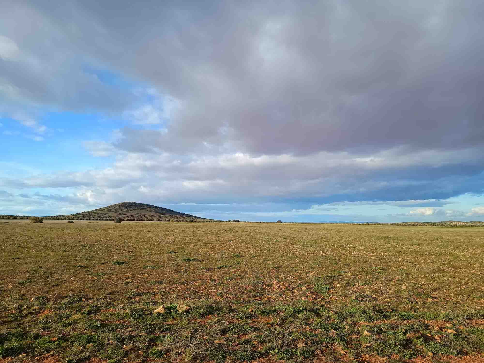 Eigentlich war für heute mal wieder Regen angesagt. Wie froh waren wir, als uns morgens stattdessen die Sonne begrüßte. Es gab zwar auch etliche Wolken, es war immer noch kalt und windig. Aber es blieb trocken. Zur Feier des Tages machten wir morgens gleich zwei Spaziergänge: Einen vor und einen nach dem Frühstück. Dann machten wir uns auf den Weg. Diesmal nahmen wir die befestigte Straße und nach knapp 40 Minuten kamen wir auf einem Friedhofsparkplatz im Naturpark von Raidera an. Von dort aus machten wir einen kurzen Spaziergang zum Cascada de Hundimiento. Der als Sehenswürdigkeit beschriebene Wasserfall war zu unserem Erstaunen deutlich kleiner als wir es erwartet hatten und auch den Spaziergang hätten wir uns in naturnaherer Umgebung vorgestellt. Dafür entschädigte uns das Castillo de Peñarroya, bei dem wir anschließend Halt machten. Es lag malerisch an einem kleinen Stausee unmittelbar an der Staumauer. Hier machten wir einen weiteren Spaziergang und anschließend eine länge Pause, da es hier freies WiFi gab. Danach ging es zum Einkaufen und Gas auffüllen nach Tornelloso. Von dort aus fuhren wir quer durch unglaublich plattes Land. Erst am Horizont zeigten sich ein paar Berge, auf die wir schnurgeradeaus zufuhren. Nicht ein einziger kleiner Hügel trübte die Sicht in irgendeiner Richtung und wir sahen das frische Gras auf den Äckern sprießen. Nach einem letzten Zwischenstopp in Puerto Lapice, wo wir Schwarz- und Grauwasser entsorgten holperten wir uns die letzten 7 km auf der vermutlich schlechtesten Straße, die möglich war zu unserem Ziel, der Zona Recreativa de Valdehierro. Dies war ein weitläufiger Picknickplatz an einer kleinen Ermita. Bei den vielen spitzen Steinen auf dem Weg hatten wir ziemlich Angst um unsere Reifen. Aber sie hielten und wir kamen tatsächlich unbeschadet, wenn auch etwas später als gedacht, an. Eine kleine Runde gönnten wir uns und Berta noch bevor wir uns ins Wohnmobil zum Abendessen zurückzogen.