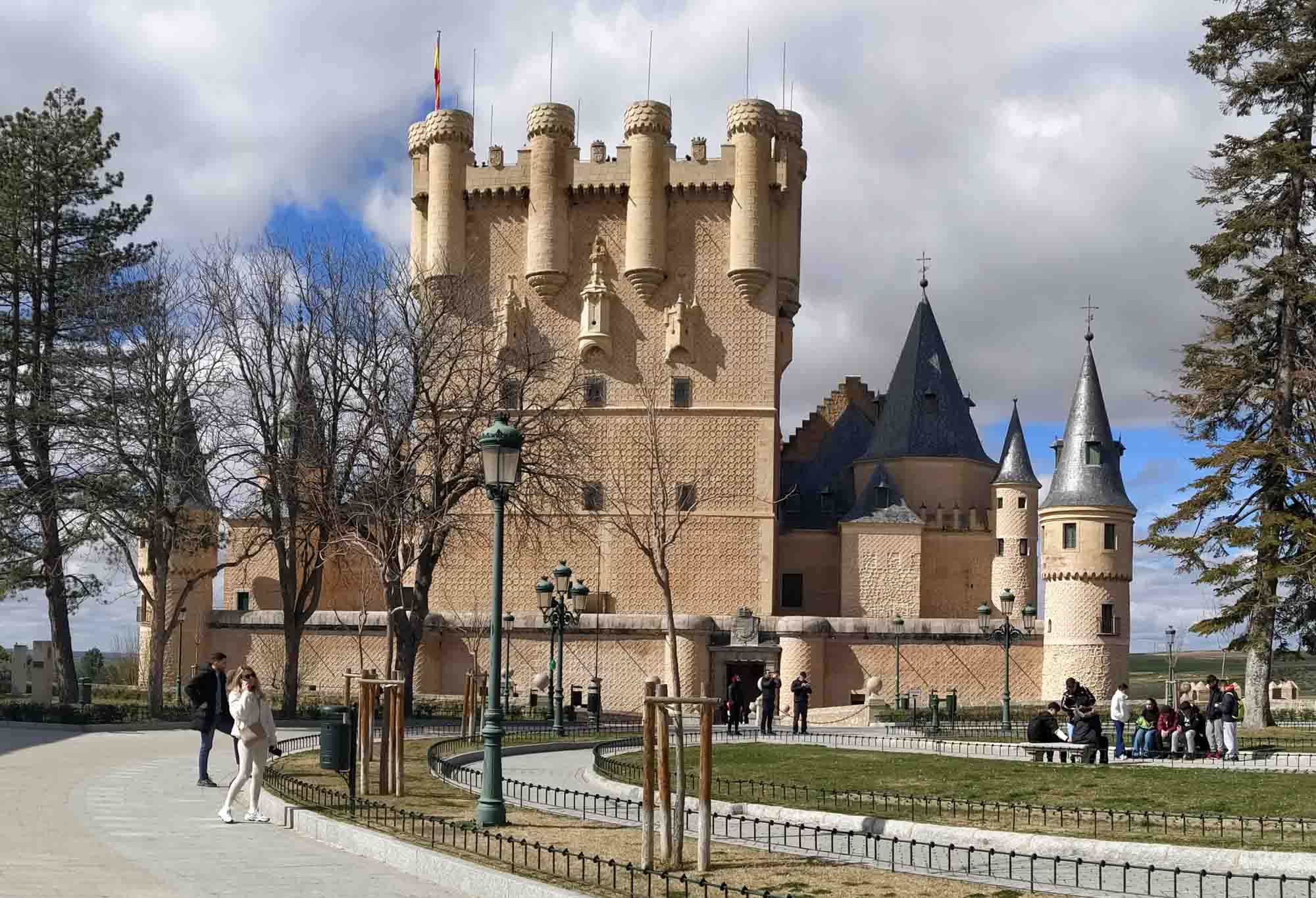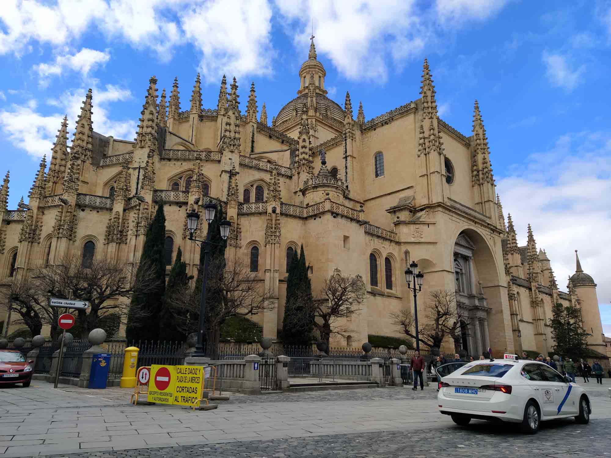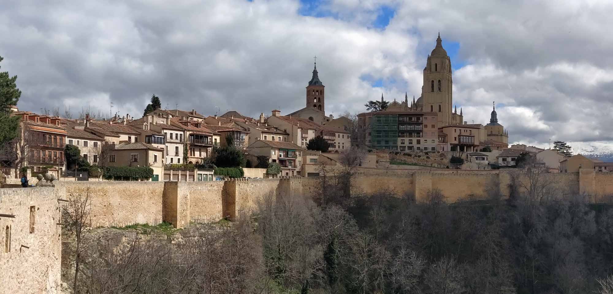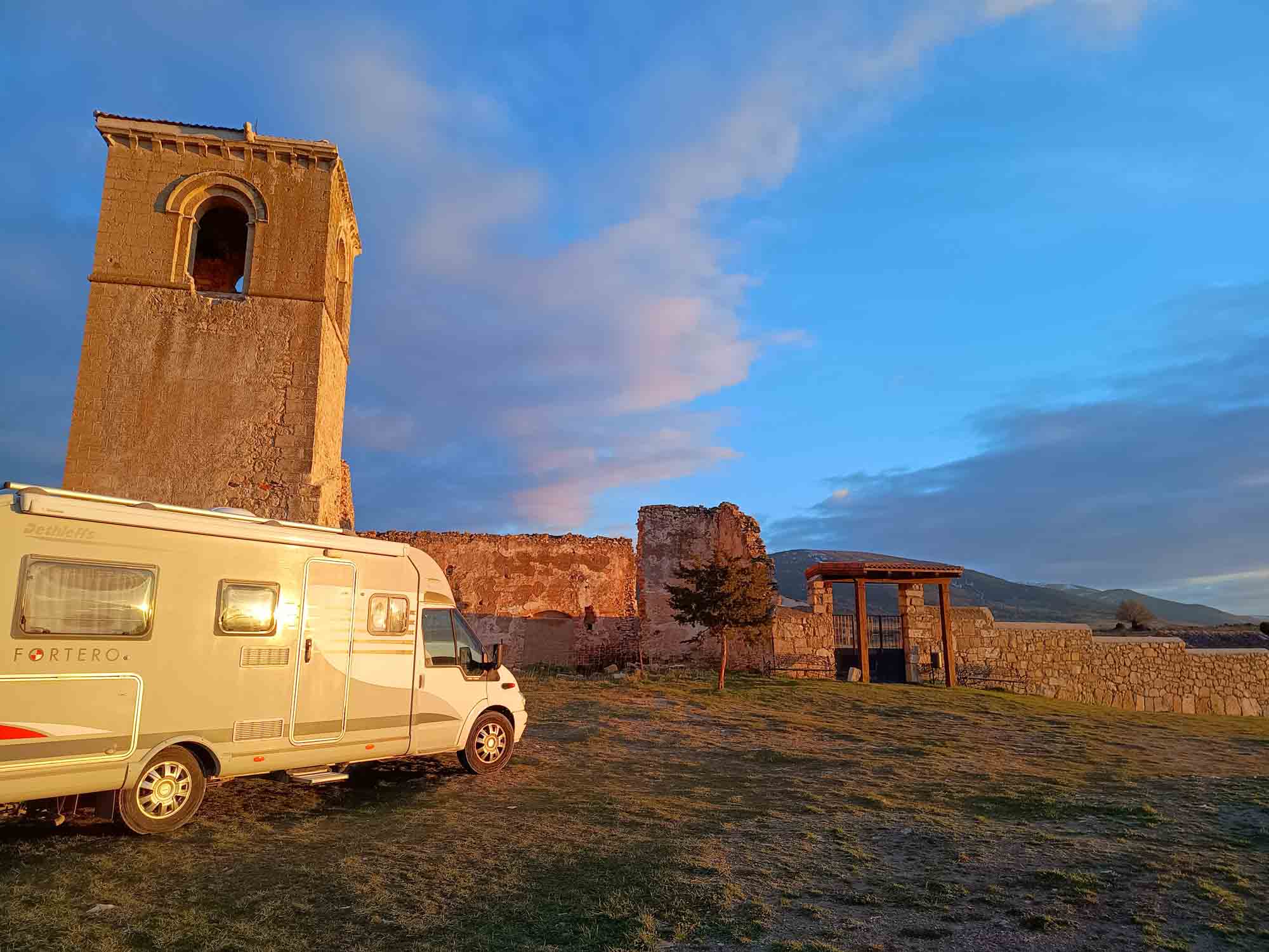 Für Berta war die Nacht schon um halb neun zu Ende. Eigentlich so gar nicht unsere Zeit. Aber was half es. Also angezogen und zumindest eine kleine Runde um die Sportanlage an der sich der niedliche kleine Wohnmobilstellplatz befand. Danach war sie wieder glücklich und legte sich gerne noch einem Moment zum Schlafen hin. Bei uns klappte das nicht ganz so gut und wir waren entsprechend früh unterwegs. Als erstes fuhren wir eine kleine Ermita an, die nur 10 Minuten entfernt war. Es war ein hübscher kleiner Platz aber für eine Übernachtung wäre er aufgrund der schrägen Parkmöglichkeiten völlig ungeeignet gewesen. Danach fuhren wir nach Segovia und machten eine ausführlicher Stadtbesichtigung. Die Altstadt hatte einiges zu bieten: Von einem Aquädukt aus der Römerzeit über eine große Kathedrale und eine Burg bis zu einer gut erhaltenen Stadtmauer rings um die Altstadt war alles da. Neben den üblichen Souvenierläden gab es auch etliche Geschäfte mit lokalen Spezialitäten, vor allem Fleisch und Wurst aber auch leckere Backwaren. Ein sehr schöner Ort, den wir eher zufällig entdeckt haben, uns aber sehr gut gefallen hat. Nachdem wir zurück und eine ausgiebige Kaffeepause gemacht hatten fuhren wir weiter nach San Ildefonso. Dort hielten wir direkt beim Königlichen Palast, eigentlich um dort durch die Garten- und Springbrunnenanlagen zu gehen. Der Wachmann am Eingang hatte leider etwas dagegen. Hunde waren im Park mal wieder nicht erlaubt. Also drehten wir um und fuhren das letzte kleine Stück bis zu einer verfallenen Kirche, der Iglesia de los Santos Justo y Pastor, die auf einem Hügel oberhalb des kleinen Örtchens La Mata liegt. Hier strahlte die Sonne bei herrlich blauem Himmel bis zum Sonnenuntergang, der den Himmel so wunderbar rot erstrahlen ließ.
